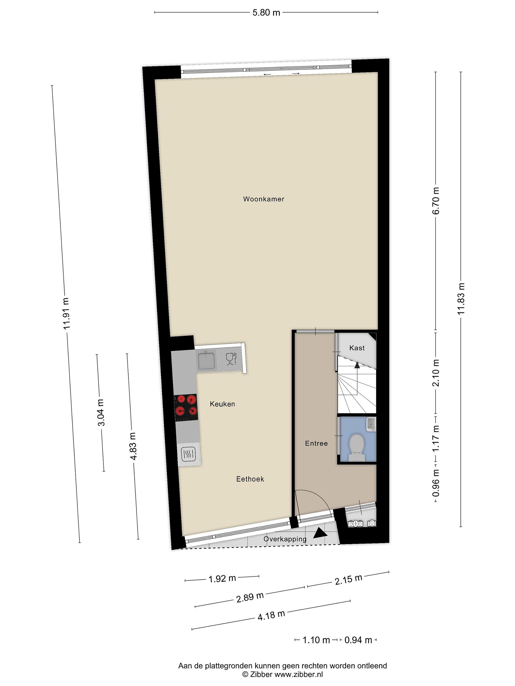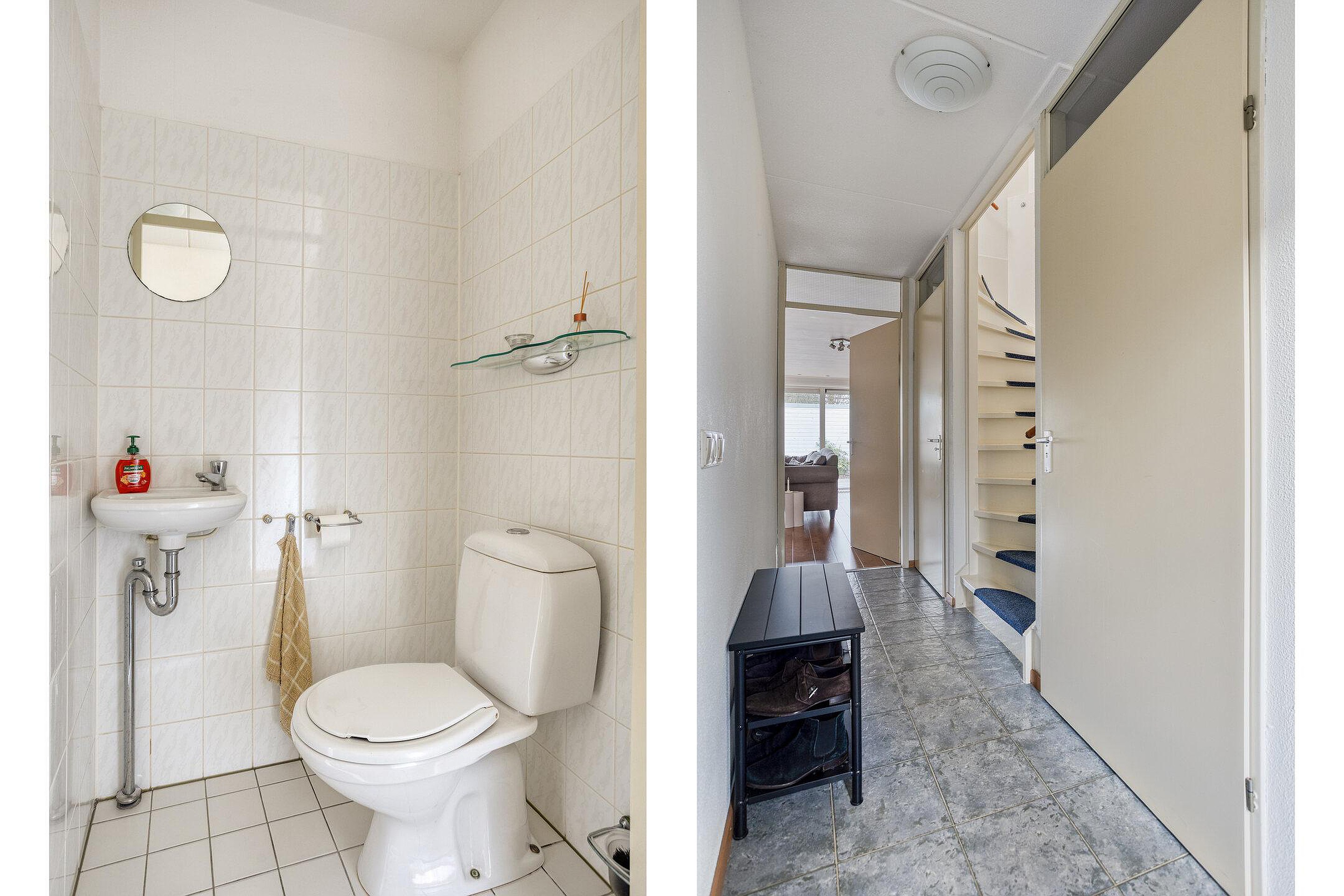 Het woongedeelte is aan de achterzijde van de woning gelegen waardoor er een prettig zicht is op de achtertuin. Middels een schuifpui is er toegang tot de achtertuin. Door deze grote raampartijen is er veel lichtinval in de woonkamer. De vloer van de woonkamer en de keuken is v.v. laminaat, de vloer van de hal en het toilet is v.v. tegels. Het toilet is grotendeels betegeld en v.v. een staand toilet en fonteintje. De wanden van de begane grond zijn afgewerkt met stucwerk en structuurverf. De plafonds zijn afgewerkt met stucwerk en structuurverf. De kozijnen zijn aluminium en van hout en v.v. isolerende beglazing.