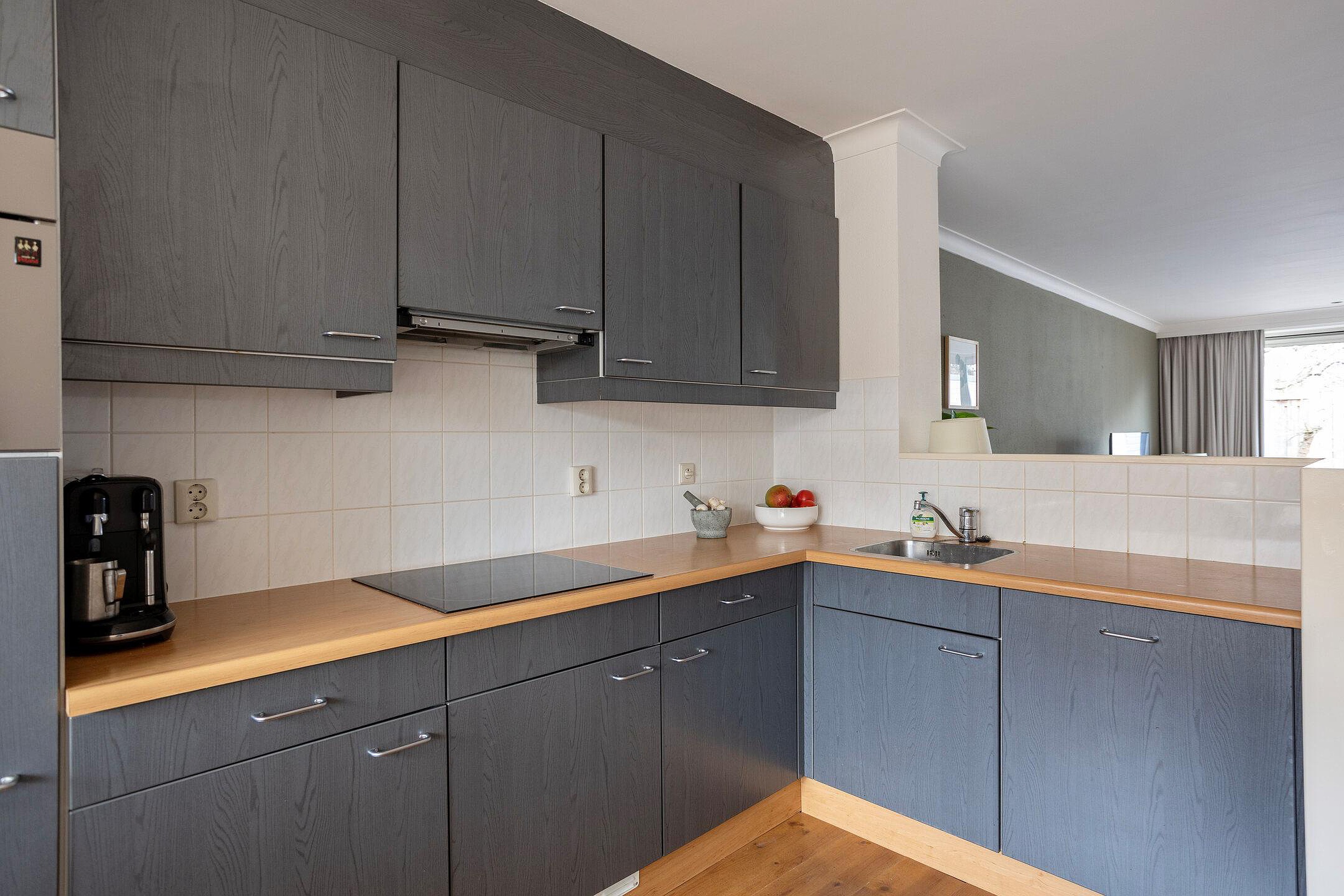 Vanuit de overdekte entree is er toegang tot de hal met meterkast, het toilet, de trapopgang (met trapkast) naar de eerste verdieping en de woonkamer met open keuken. De keuken, in L-vorm, is aan de voorzijde van de woning gelegen en is v.v. diverse kasten en lades, een kunststof werkblad met spoelbak en mengkraan, een inductiekookplaat, afzuigkap, combimagnetron, een koelkast en een vaatwasser.