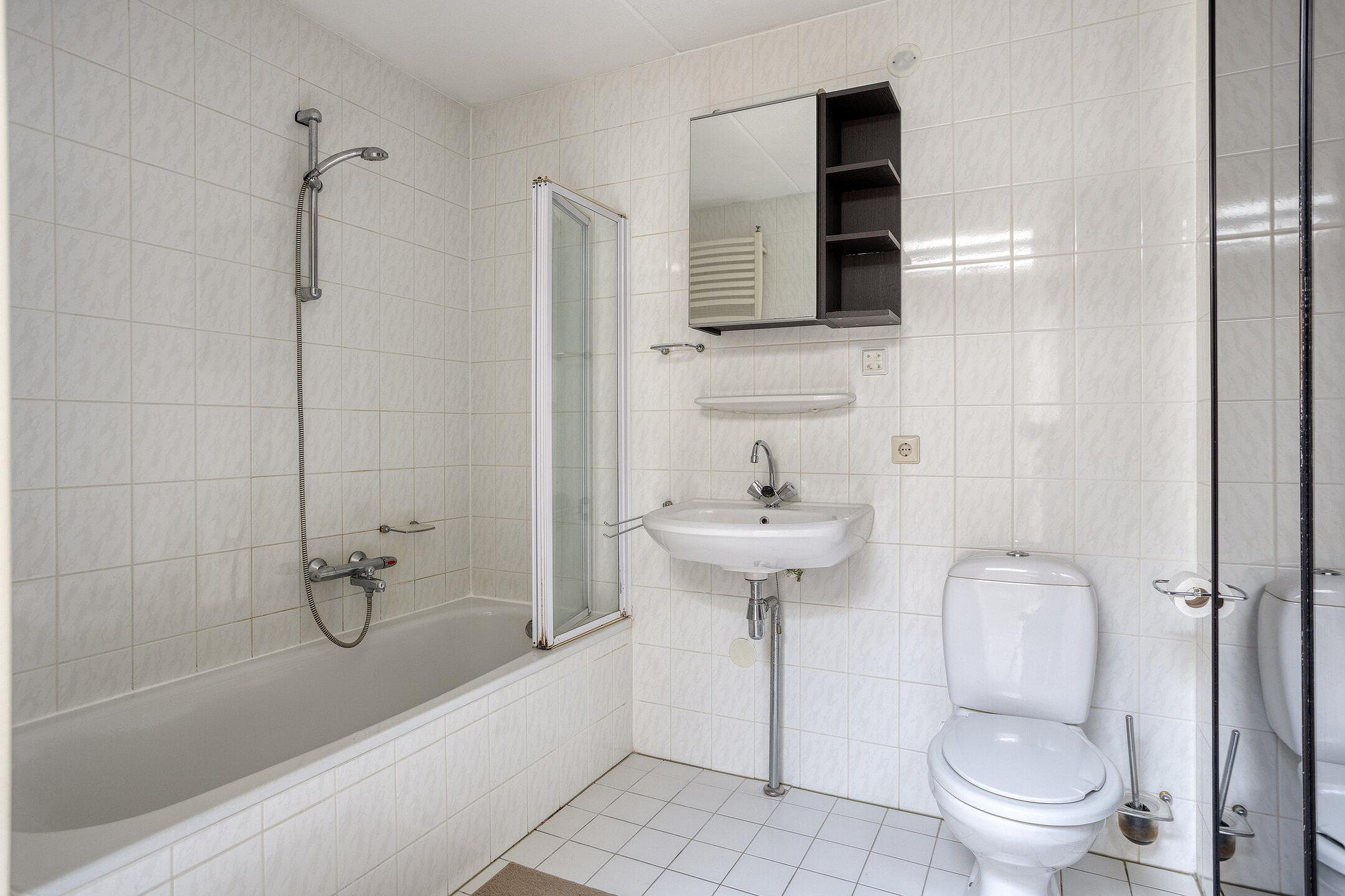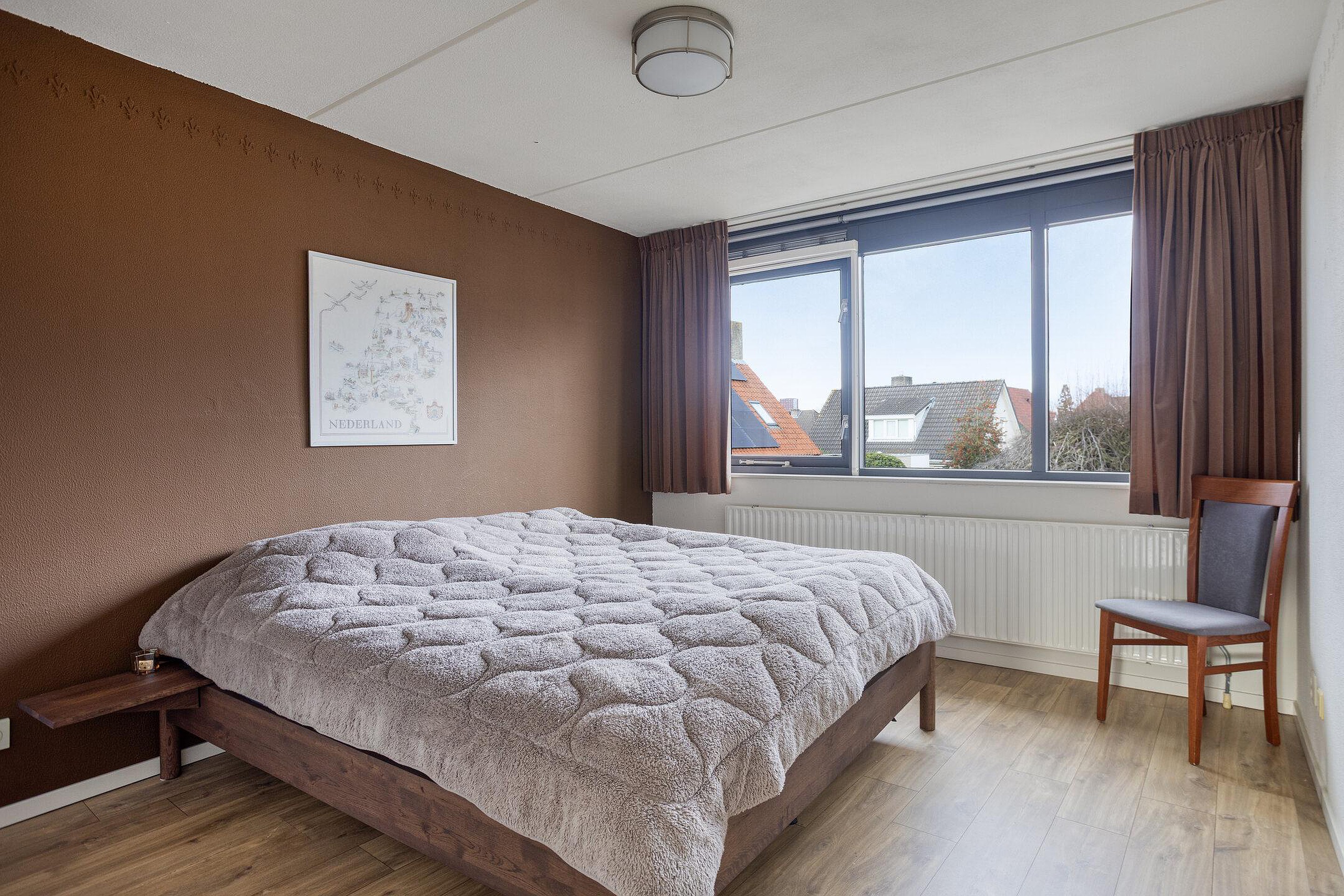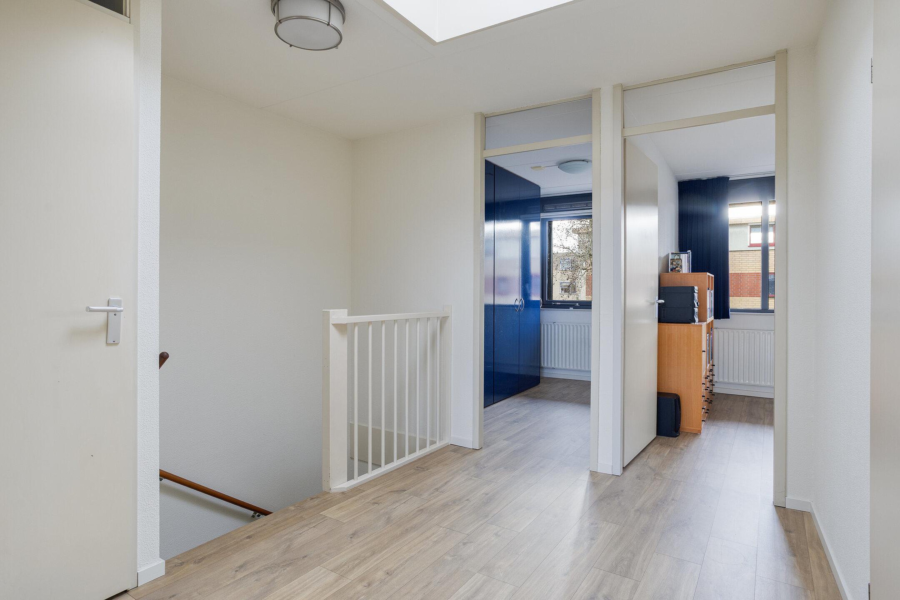 Vanuit de ruime overloop, met lichtkoepel, zijn 4 slaapkamers, de badkamer en een bergkast bereikbaar. De badkamer is geheel betegeld en v.v. een ligbad met douche, een wastafel, een staand toilet en een bergkast waarin de aansluiting voor de wasmachine en de cv-ketel gesitueerd zijn. De vloer van de overloop en de slaapkamers is afgewerkt met laminaat. De wanden zijn afgewerkt met stucwerk en structuurverf. De plafonds zijn afgewerkt met stucwerk en structuurverf. De kozijnen zijn van hout en v.v. isolerende beglazing en deze zijn v.v. horren.