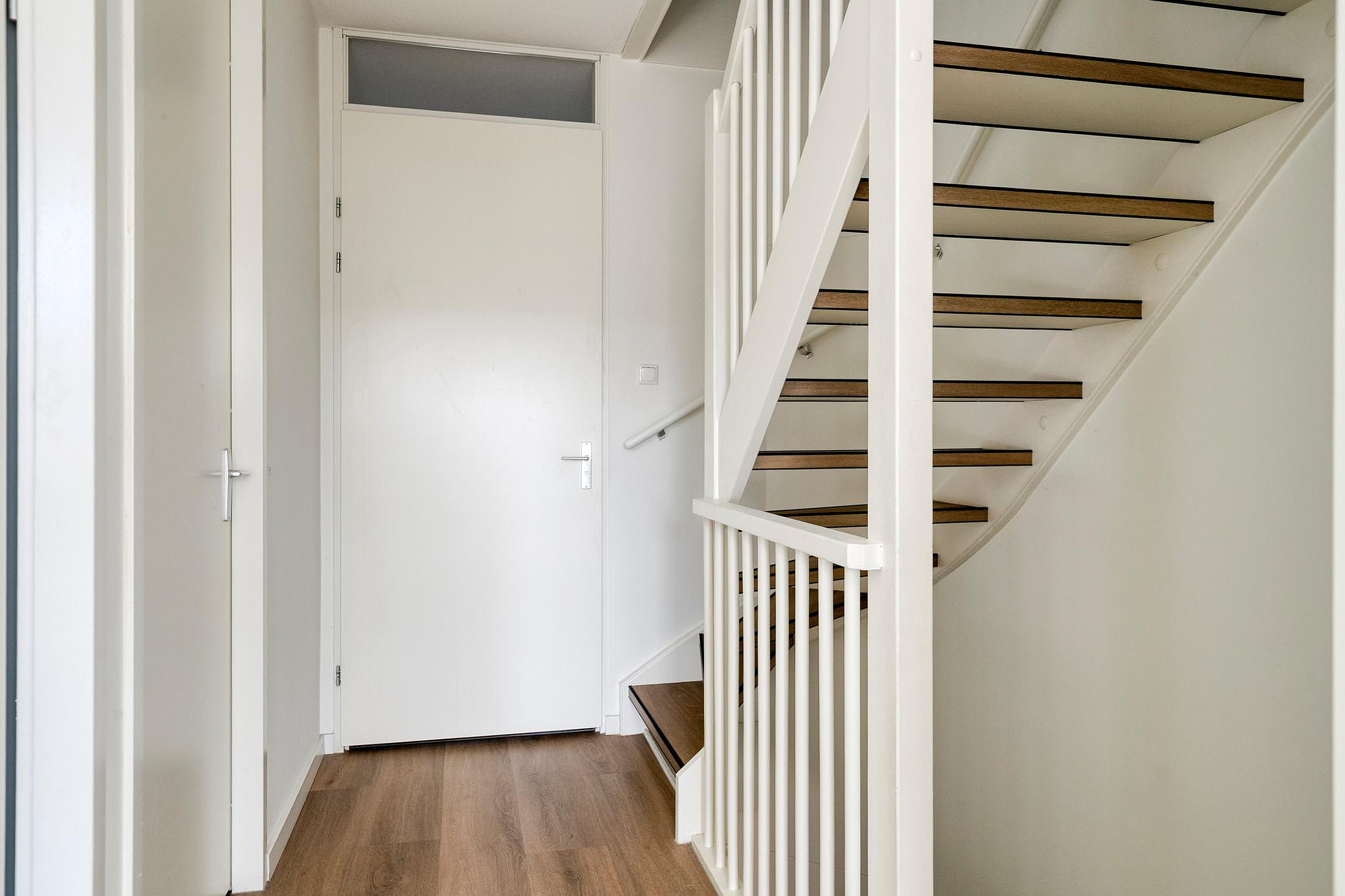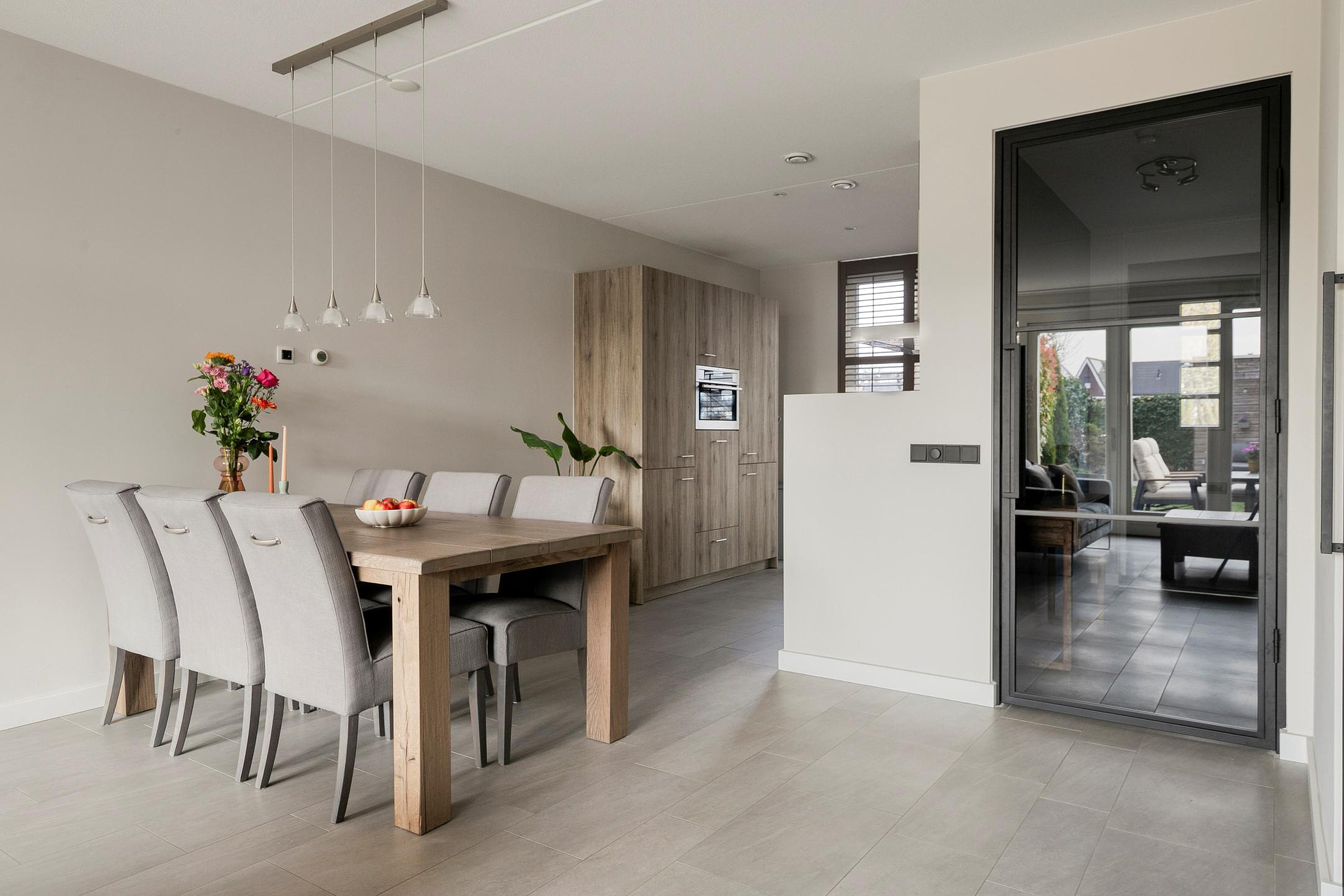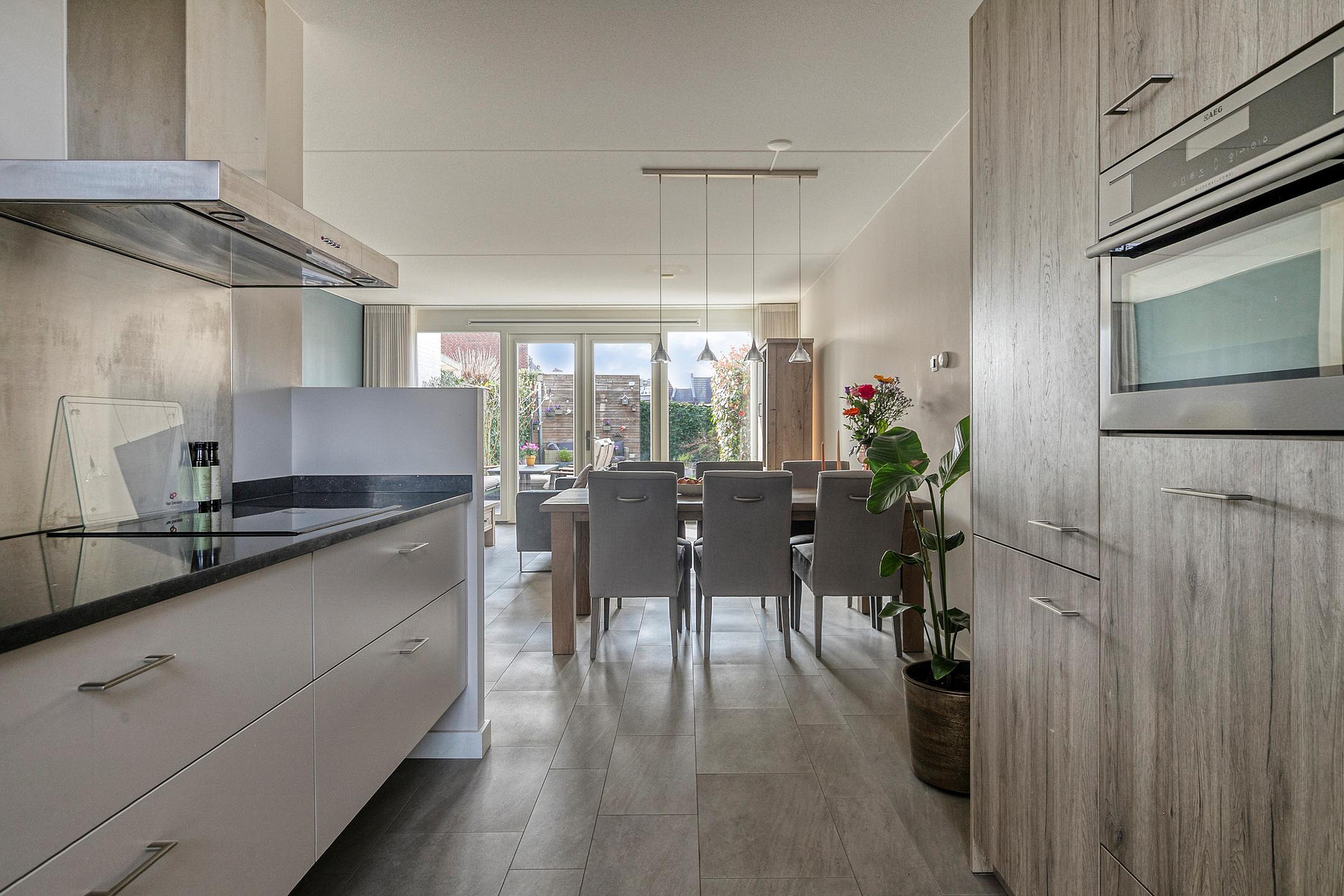 Vanuit de hal/entree met meterkast is er toegang tot het toilet, de trapopgang naar de eerste verdieping en de woonkamer met open keuken. De keuken is aan de voorzijde van de woning gelegen. De keuken in rechte opstelling is v.v. diverse kasten en lades, een granieten werkblad met spoelbak en mengkraan, een inductiekookplaat (Siemens), afzuigkap (Novy), combimagnetron (AEG), vaatwasser (Siemens), koelkast en vriezer. Het woongedeelte is aan de achterzijde van de woning gelegen wat zorgt voor een prettig zicht op de achtertuin. Middels openslaande tuindeuren is de achtertuin bereikbaar. In de woonkamer is een trapkast gesitueerd wat zorgt voor extra bergruimte. De begane grond is v.v. fraaie stalen binnendeuren. De vloer van de begane grond is v.v. tegels met vloerverwarming. De wanden zijn afgewerkt met stucwerk. De plafonds zijn afgewerkt met spuitwerk. De kozijnen zijn v.v. hout met HR++ glas en aan de achterzijde van de woning v.v. een screen. Het toilet is deels betegeld en v.v. een hangend toilet en fonteintje.
