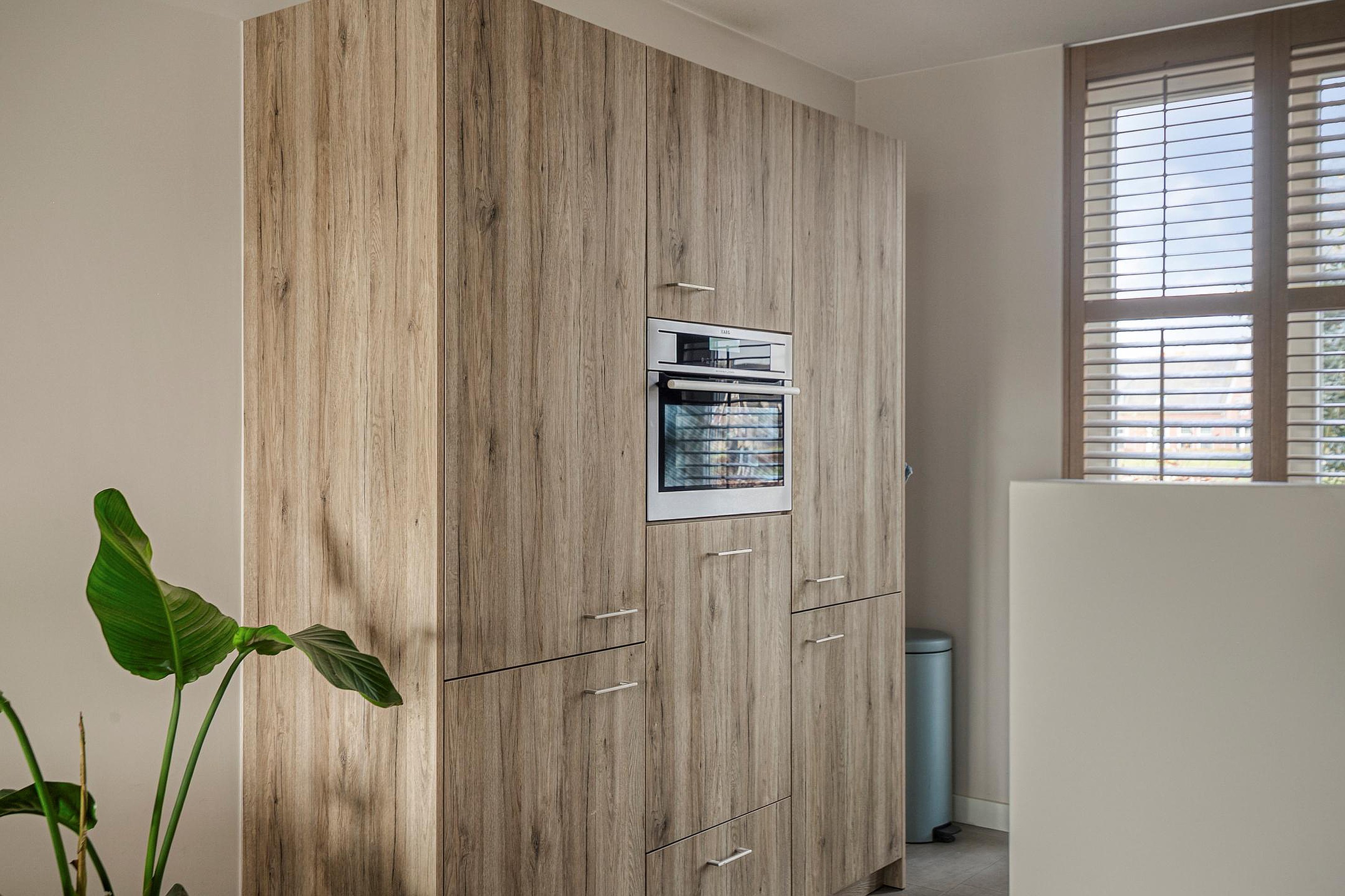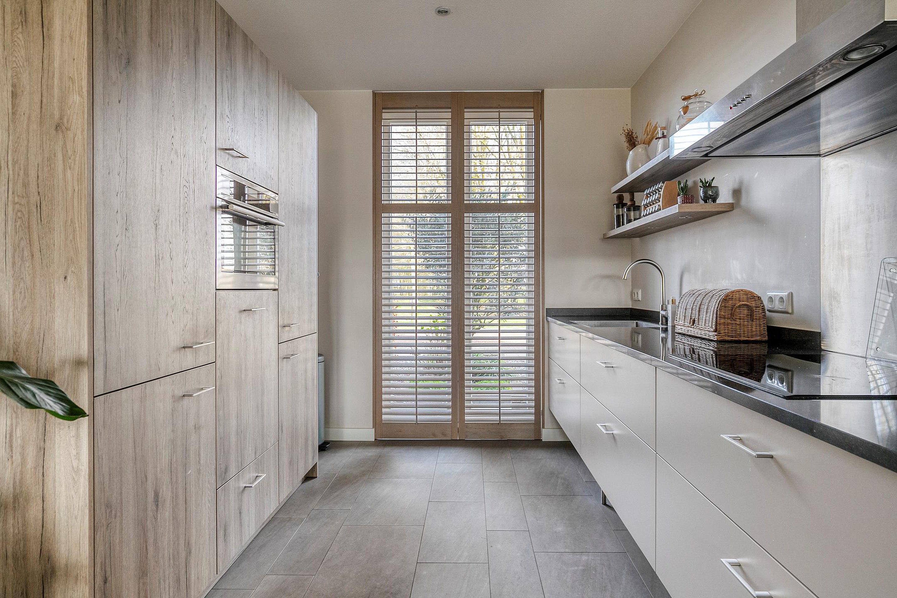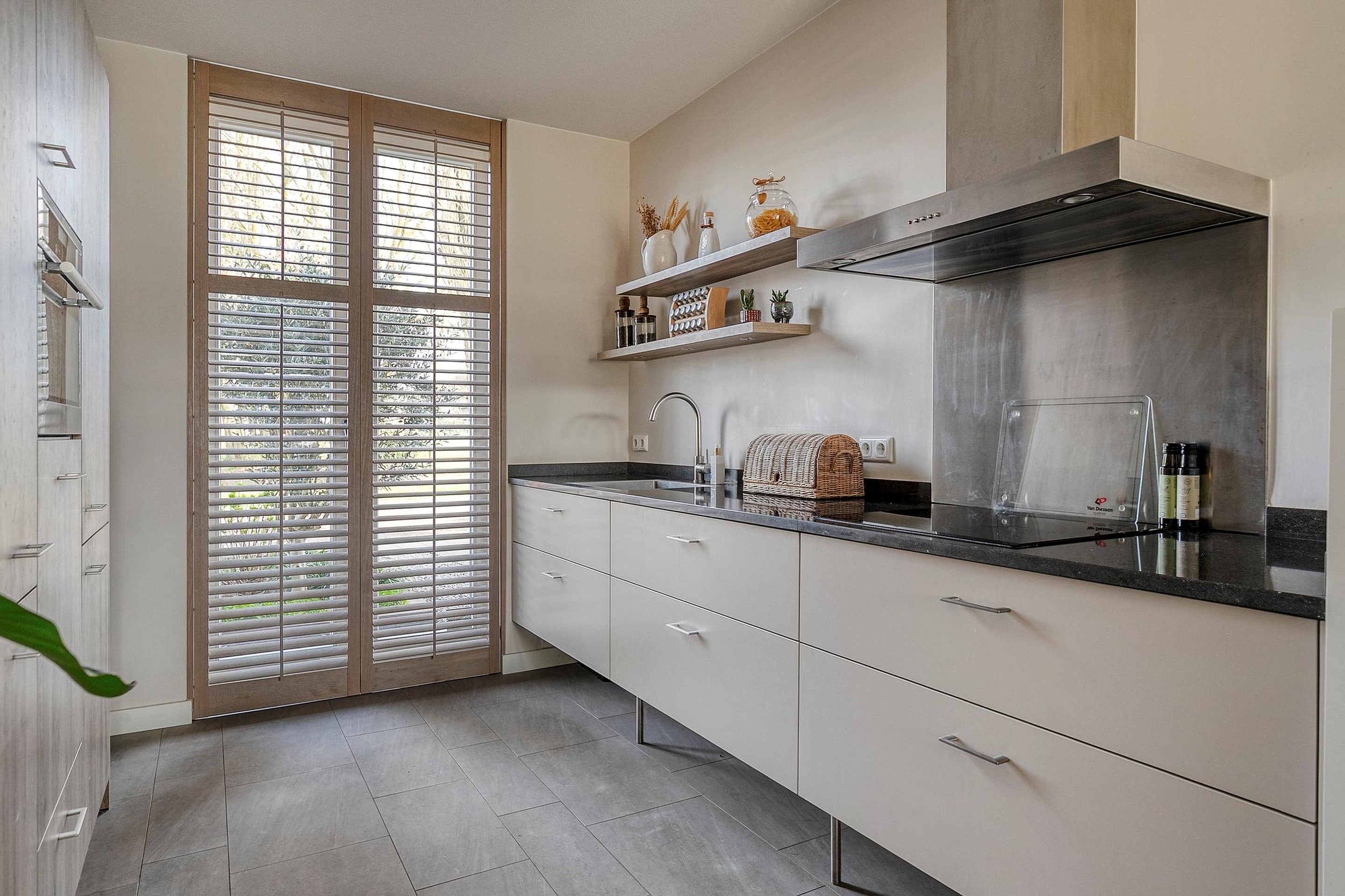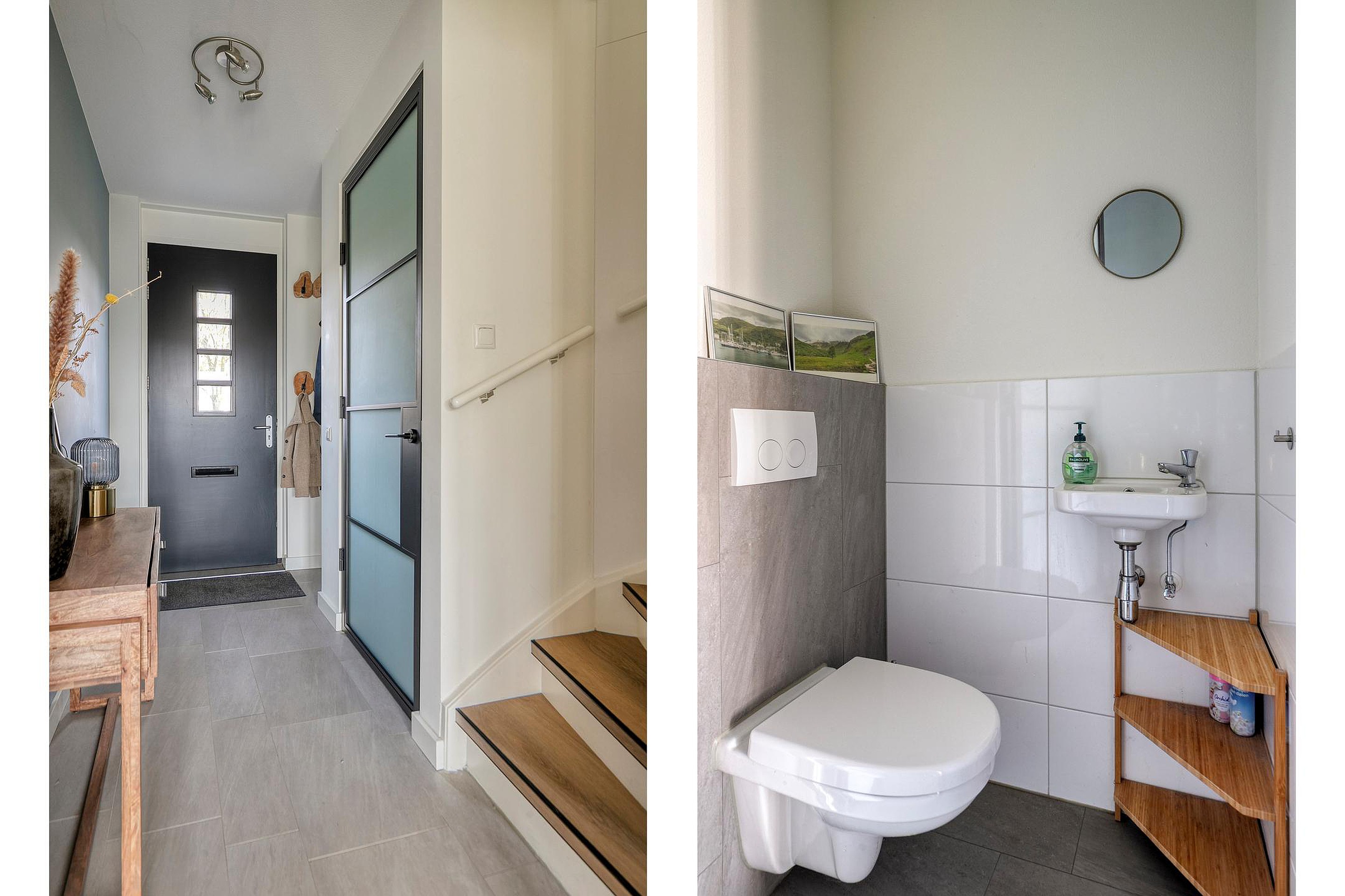 Vanuit de hal/entree met meterkast is er toegang tot het toilet, de trapopgang naar de eerste verdieping en de woonkamer met open keuken. De keuken is aan de voorzijde van de woning gelegen. De keuken in rechte opstelling is v.v. diverse kasten en lades, een granieten werkblad met spoelbak en mengkraan, een inductiekookplaat (Siemens), afzuigkap (Novy), combimagnetron (AEG), vaatwasser (Siemens), koelkast en vriezer. Het woongedeelte is aan de achterzijde van de woning gelegen wat zorgt voor een prettig zicht op de achtertuin. Middels openslaande tuindeuren is de achtertuin bereikbaar. In de woonkamer is een trapkast gesitueerd wat zorgt voor extra bergruimte. De begane grond is v.v. fraaie stalen binnendeuren. De vloer van de begane grond is v.v. tegels met vloerverwarming. De wanden zijn afgewerkt met stucwerk. De plafonds zijn afgewerkt met spuitwerk. De kozijnen zijn v.v. hout met HR++ glas en aan de achterzijde van de woning v.v. een screen. Het toilet is deels betegeld en v.v. een hangend toilet en fonteintje.