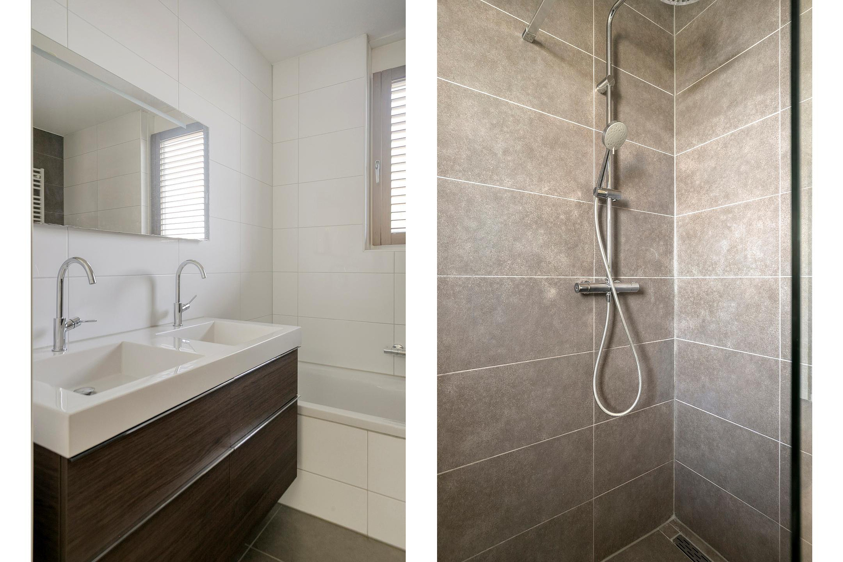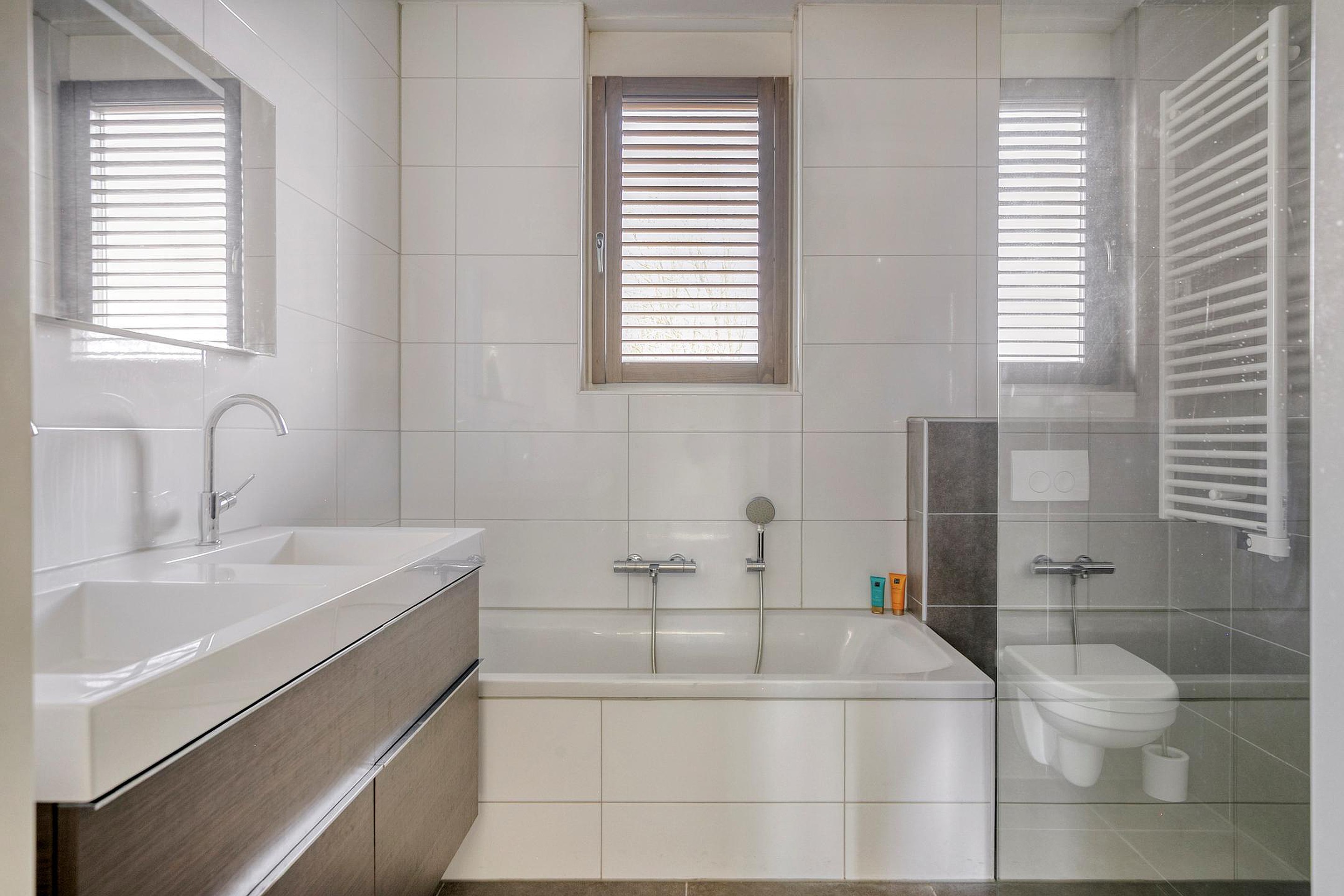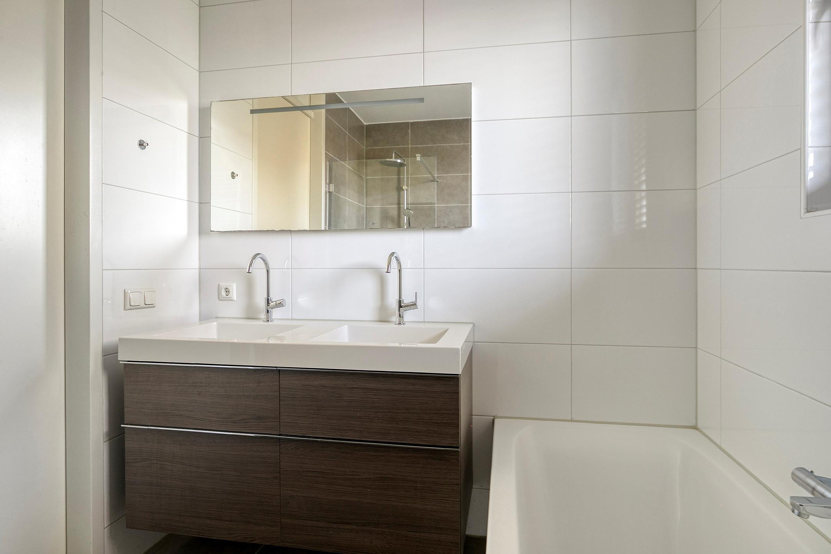 Vanuit de overloop zijn 3 slaapkamers, de badkamer en de trapopgang naar de tweede verdieping bereikbaar. De luxe badkamer is geheel betegeld en v.v. een ligbad, een dubbele wastafel met meubel, een hangend toilet, een inloopdouche en een designradiator. De vloer van de eerste verdieping is v.v. pvc met vloerverwarming. De wanden zijn afgewerkt met stucwerk. De plafonds zijn afgewerkt met spuitwerk. De kozijnen zijn van hout met HR++ glas en zijn v.v. rolluiken (m.u.v. het raam van de badkamer).