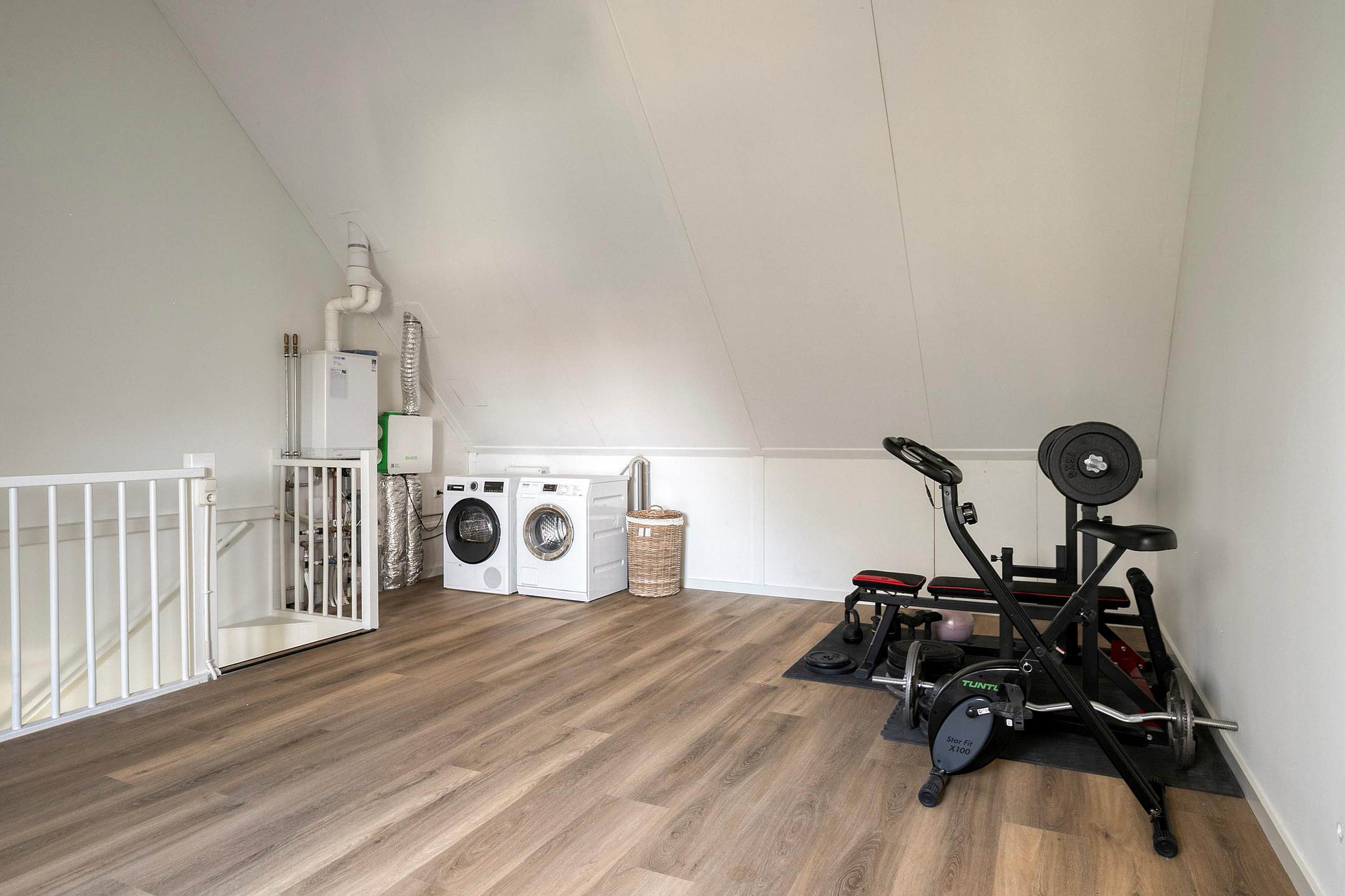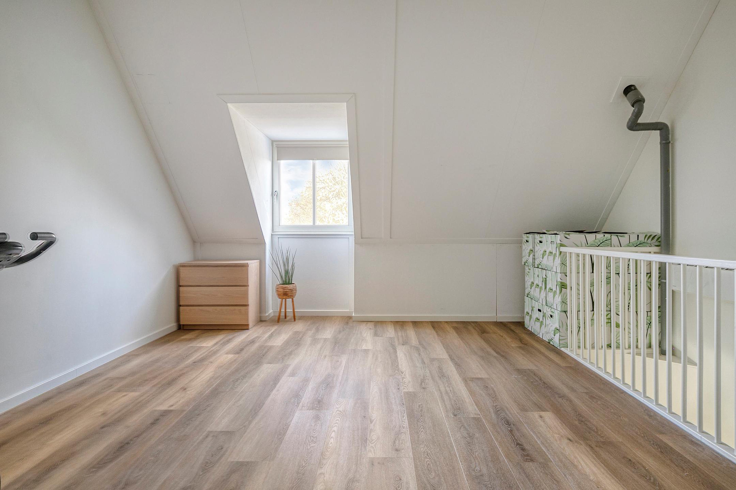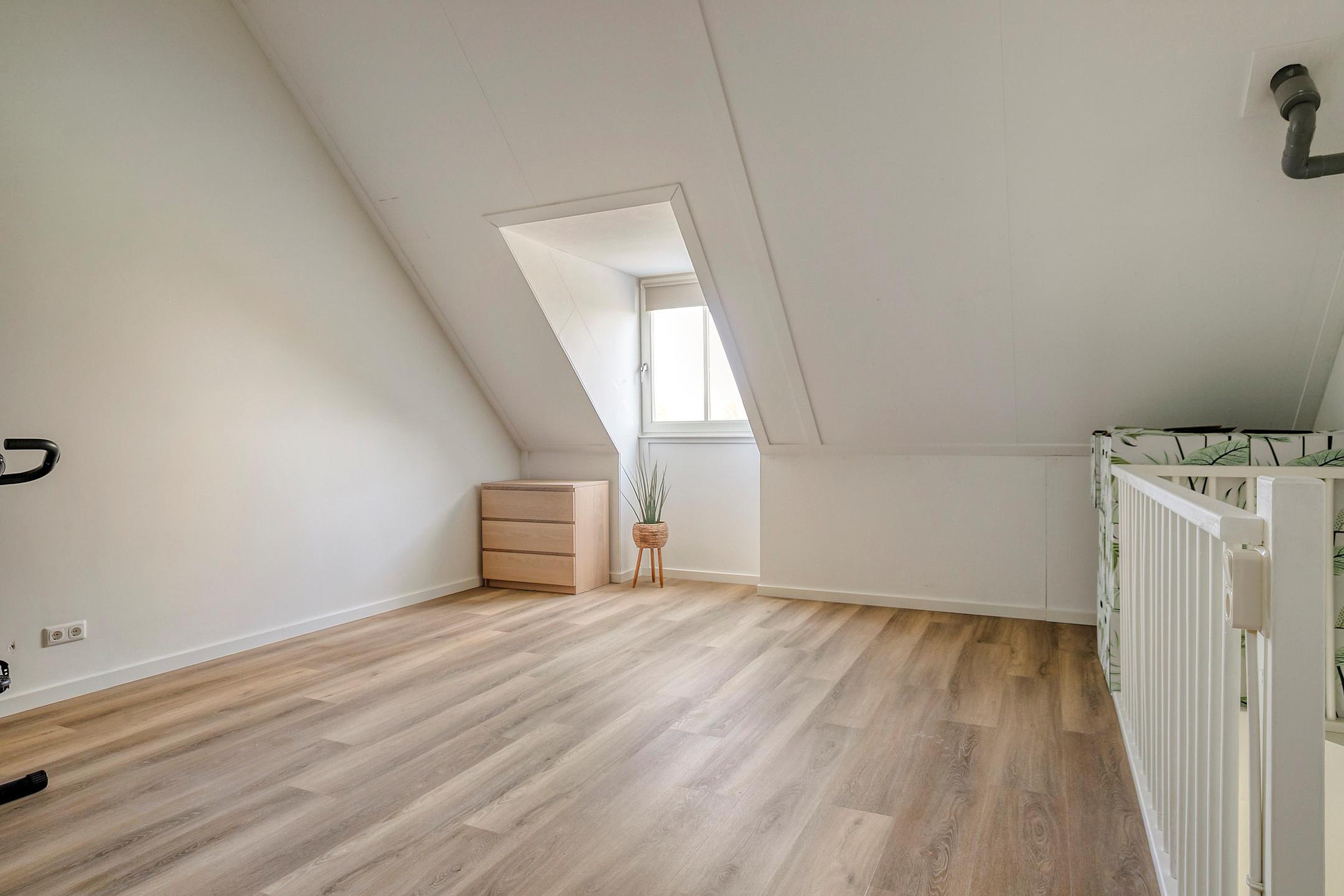 Middels een vaste trap is de ruime zolder bereikbaar welke te gebruiken is als 4e slaapkamer. Op deze zolder zijn de aansluiting voor de wasmachine en de cv-ketel gesitueerd. In het trapgat is airconditioning aanwezig. De vloer van deze verdieping is v.v. pvc met vloerverwarming. De wanden zijn afgewerkt met stucwerk. De plafonds zijn afgewerkt met structuurverf. De kozijnen zijn v.v. hout met HR++ glas. Aan de voorzijde van de woning is een dakkapel gesitueerd.