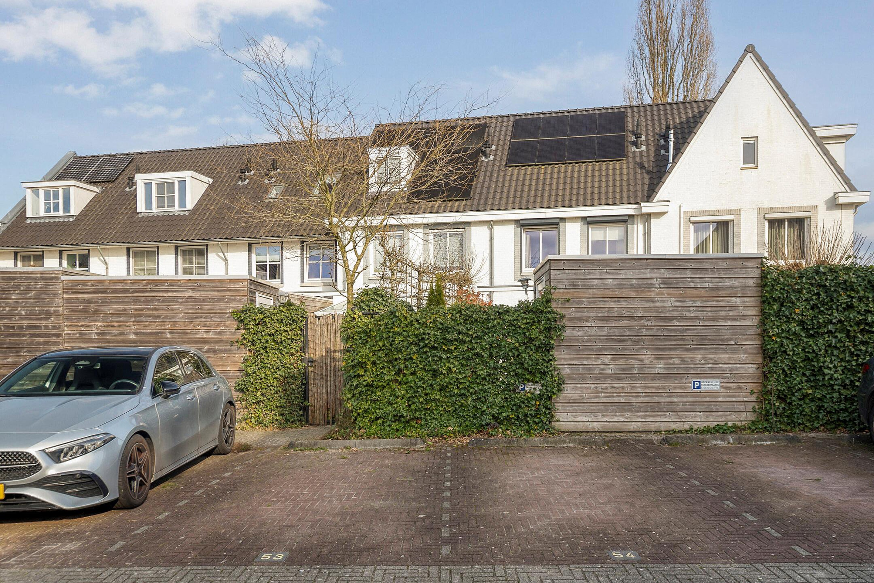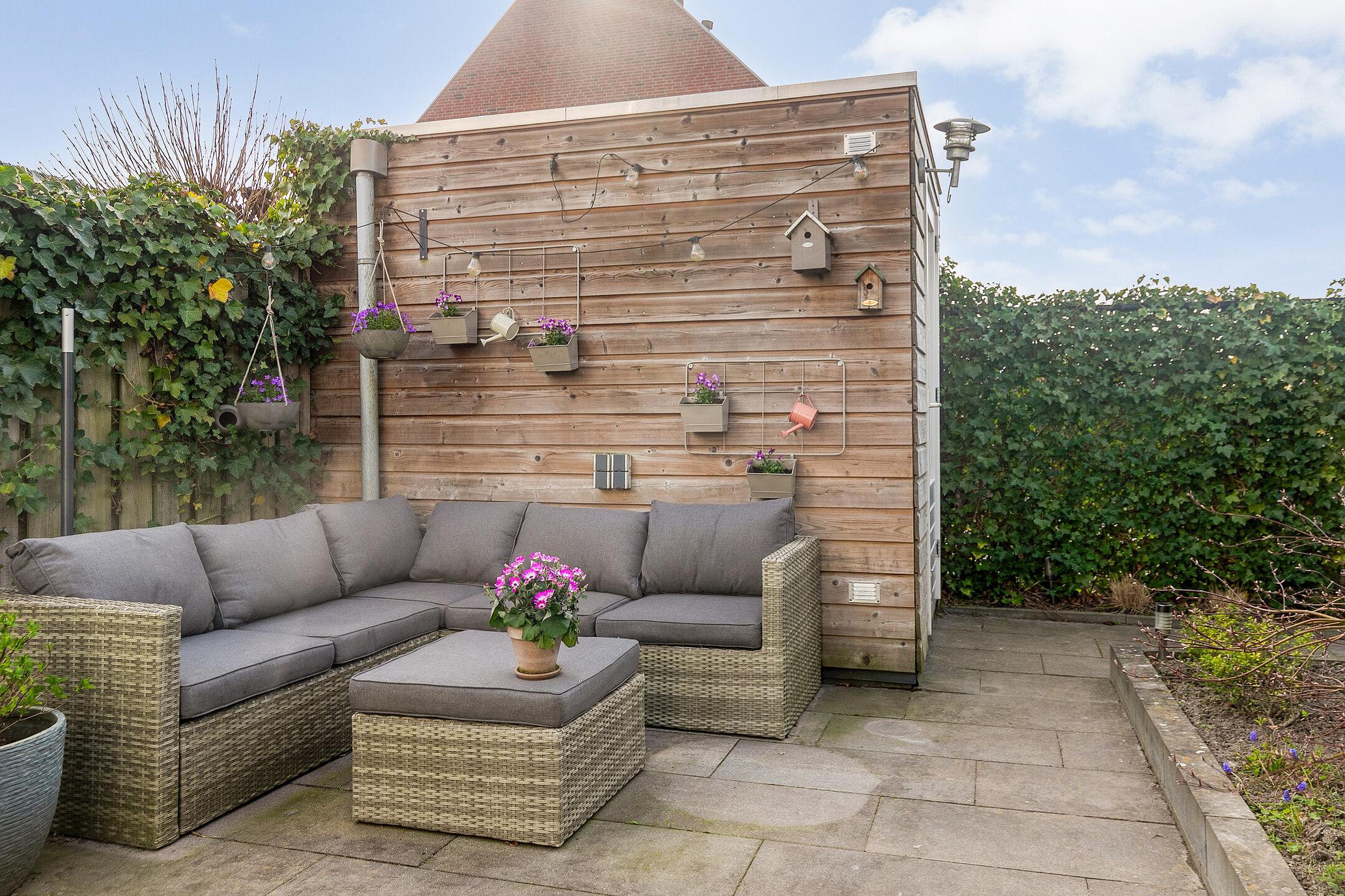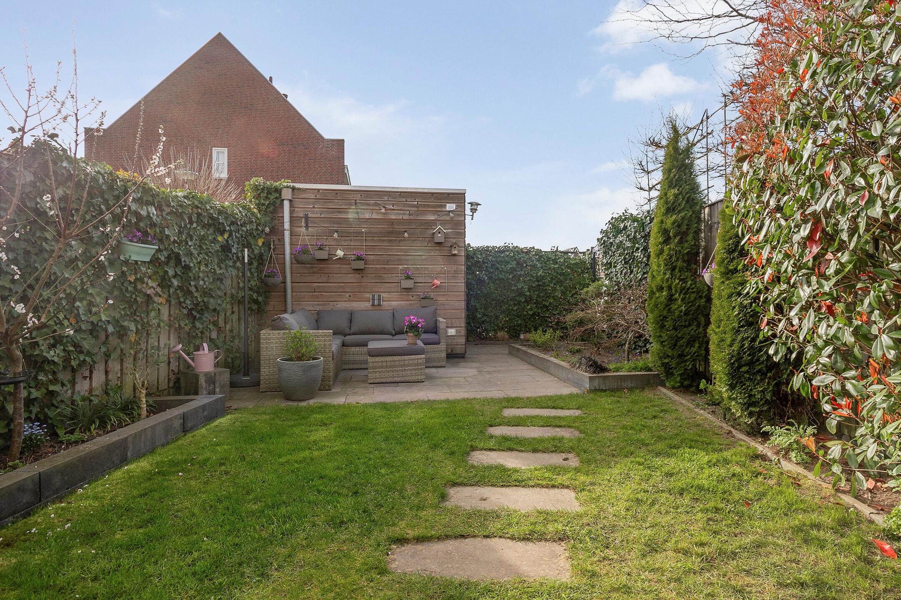 Deze woning beschikt over een voor-en achtertuin. De diepe achtertuin is gelegen op het westen en is aangelegd met sierbestrating, gazon, bloembakken en borders met vaste beplanting. Achter in de tuin is een houten berging aanwezig. De achtertuin is bereikbaar middels een achterom met poort vanuit het gezamenlijke parkeerterrein. Hier is een eigen parkeerplaats aanwezig. De voortuin is gelegen op het oosten en is aangelegd met sierbestrating, siergrind en bloembakken met vaste beplanting.