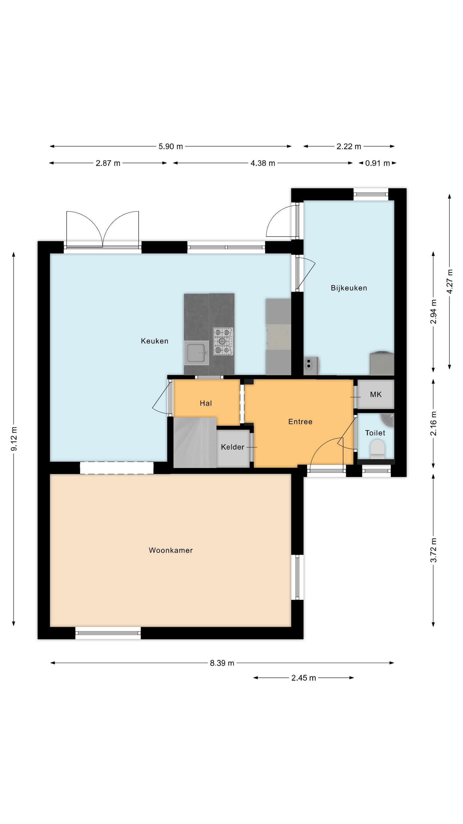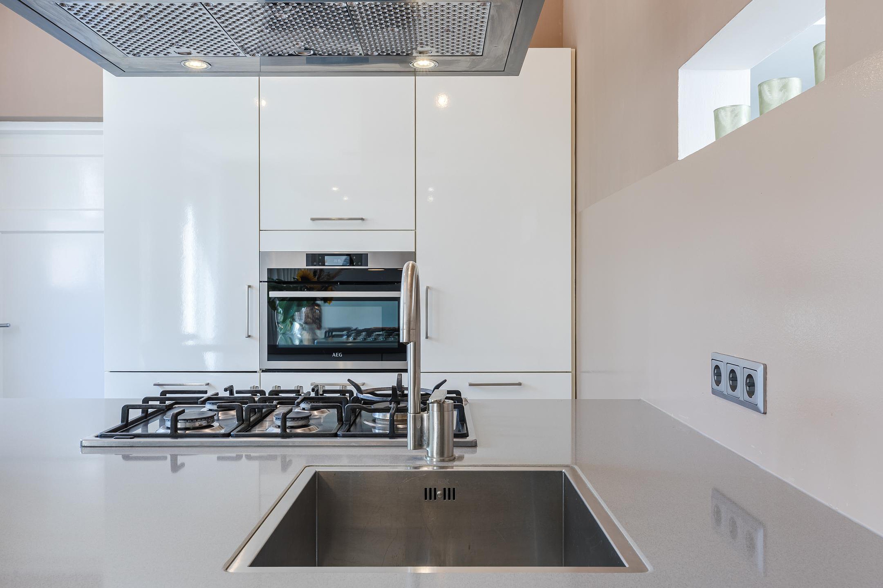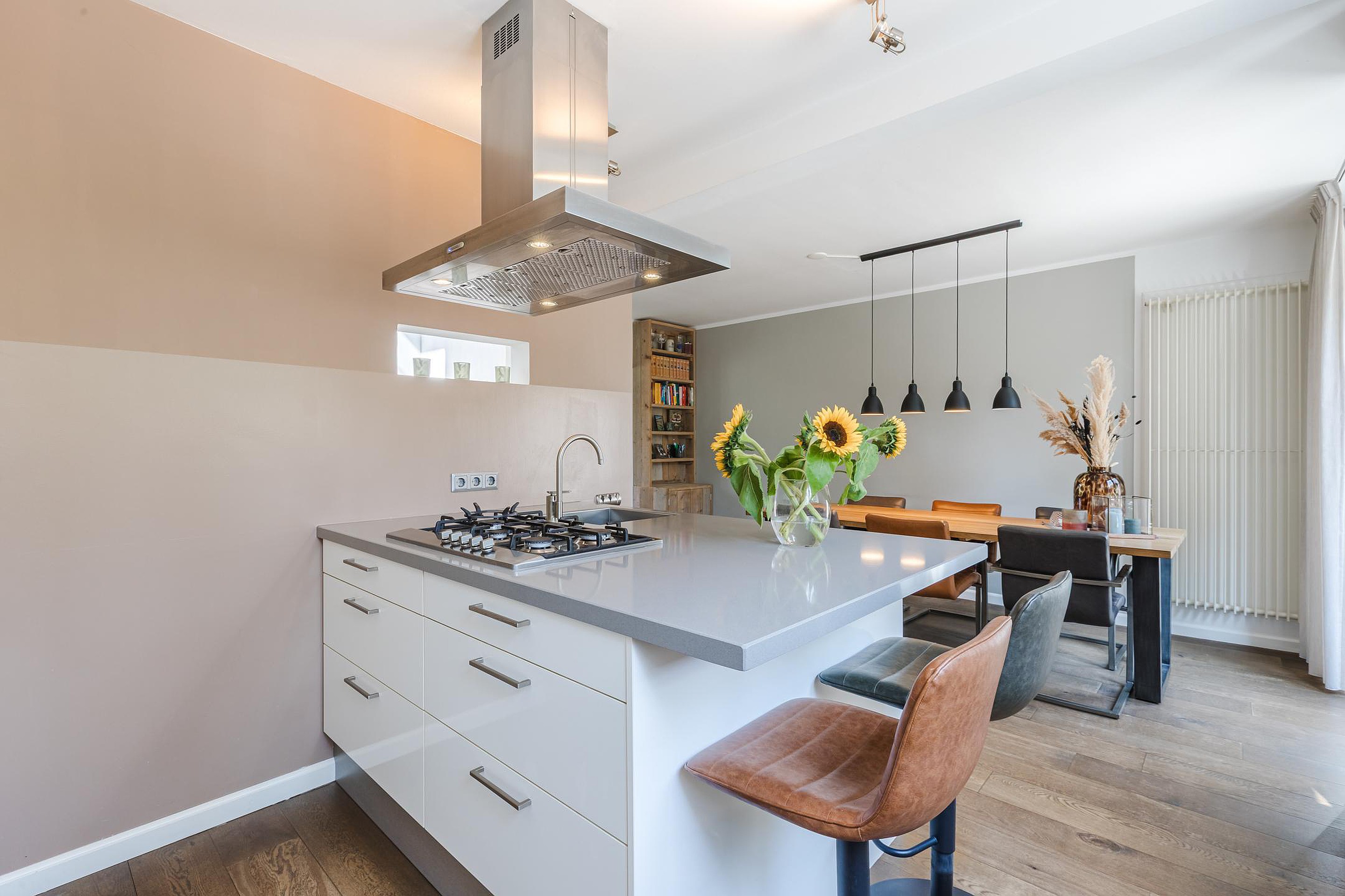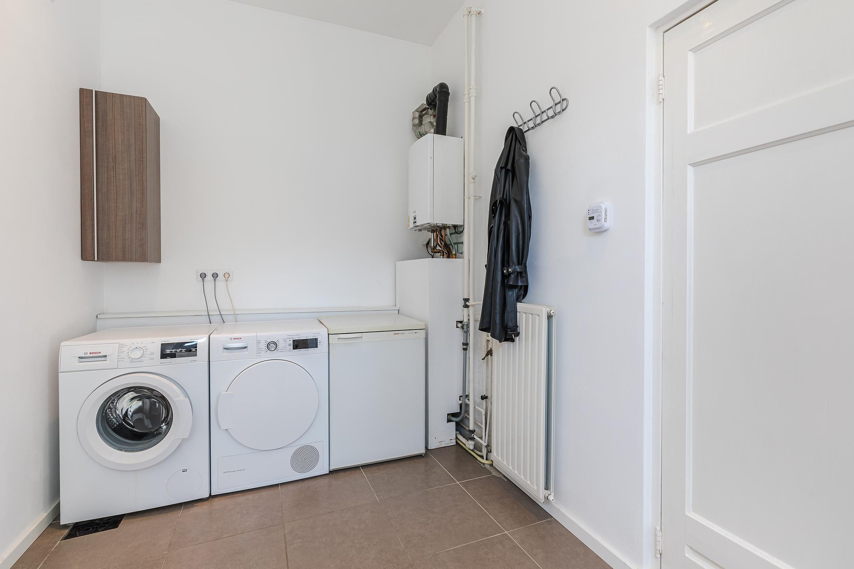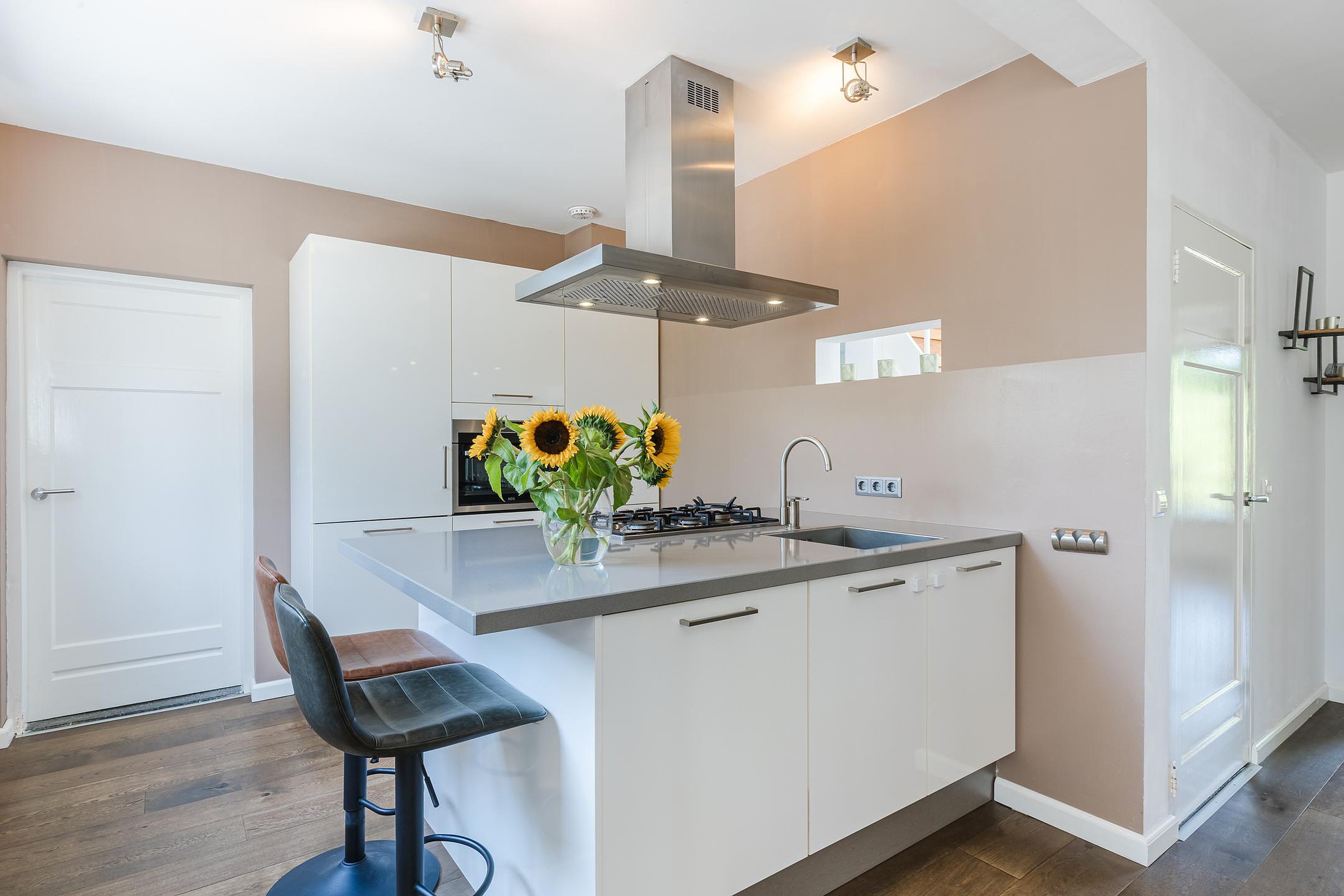 Middels een looppad langs de voortuin is de entree tot de woning te bereiken. De entree/ hal is voorzien van een tegelvloer en geeft toegang tot de toiletruimte, de meterkast, de trapopgang naar de 1e verdieping, de provisiekelder en de woonkamer. De deels betegelde toiletruimte is voorzien van een zwevend closet, fonteintje en een buitenraam. De U-vormige woonkamer (ca. 37,5m2) is voorzien van een lamelparketvloer. Aan de voorzijde is de ruime zithoek gerealiseerd met grote raampartijen welke zorgen voor veel natuurlijk lichtinval. Aan de achterzijde heeft de woonkamer openslaande deuren naar de tuin. De open keuken (ca.9m2) heeft een groot kook- en spoeleiland. De moderne keuken is ingericht met een 5-pitsgasfornuis, afzuigkap, combi-magnetron, koelkast en een vaatwasser. Middels een loopdeur is er toegang tot de bijkeuken. De grote bijkeuken (ca. 9,5m2) is voorzien van de witgoedaansluitingen, ruimte voor een extra diepvries en de combi CV-ketel. Vanuit de bijkeuken is er toegang tot de tuin.