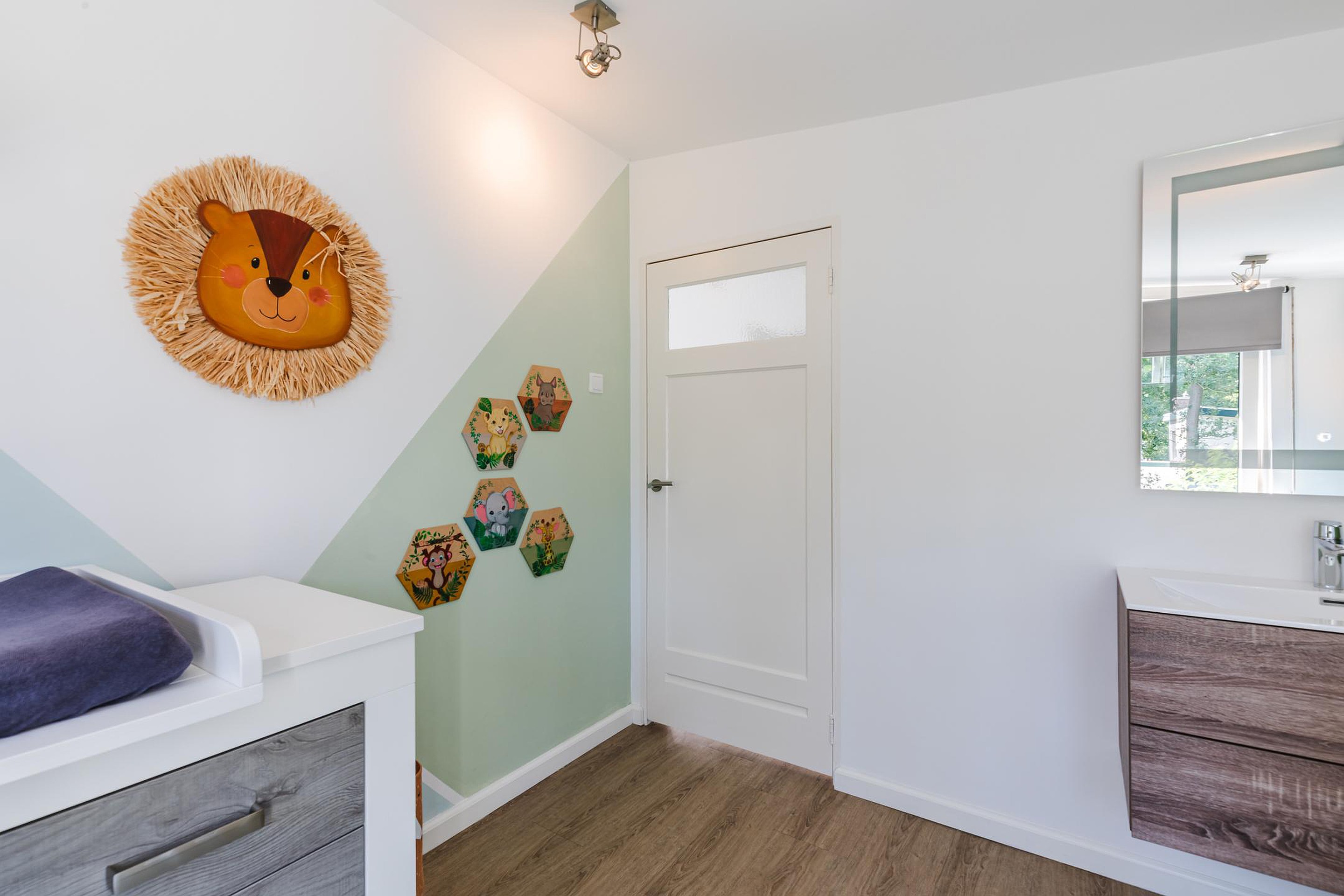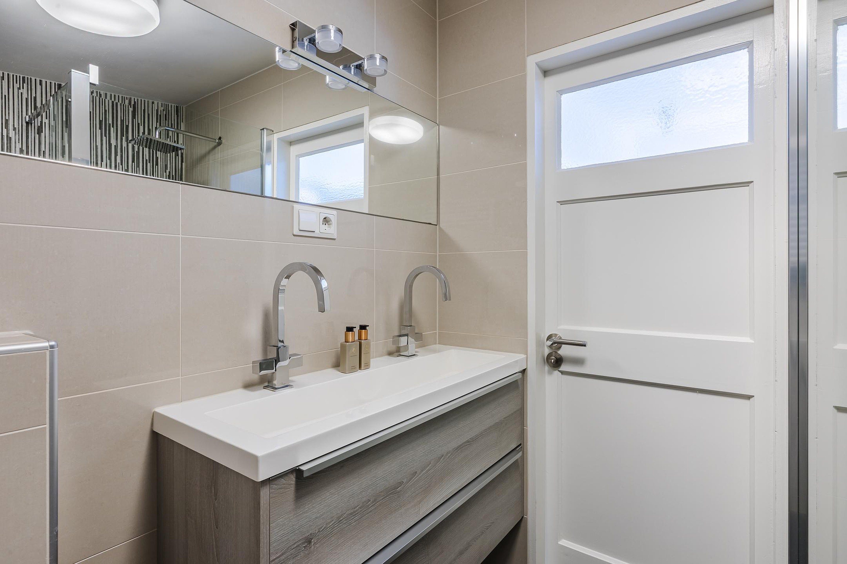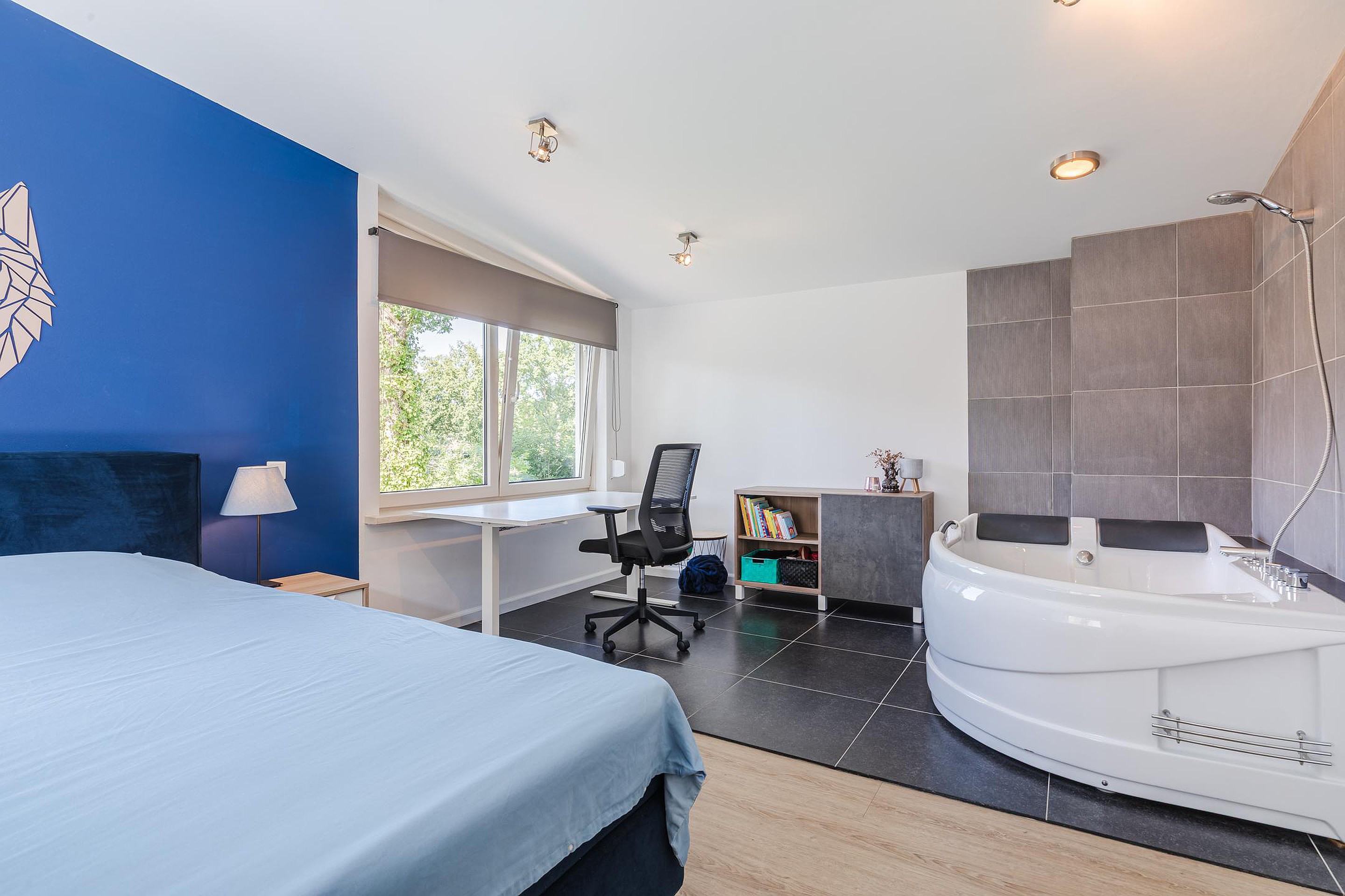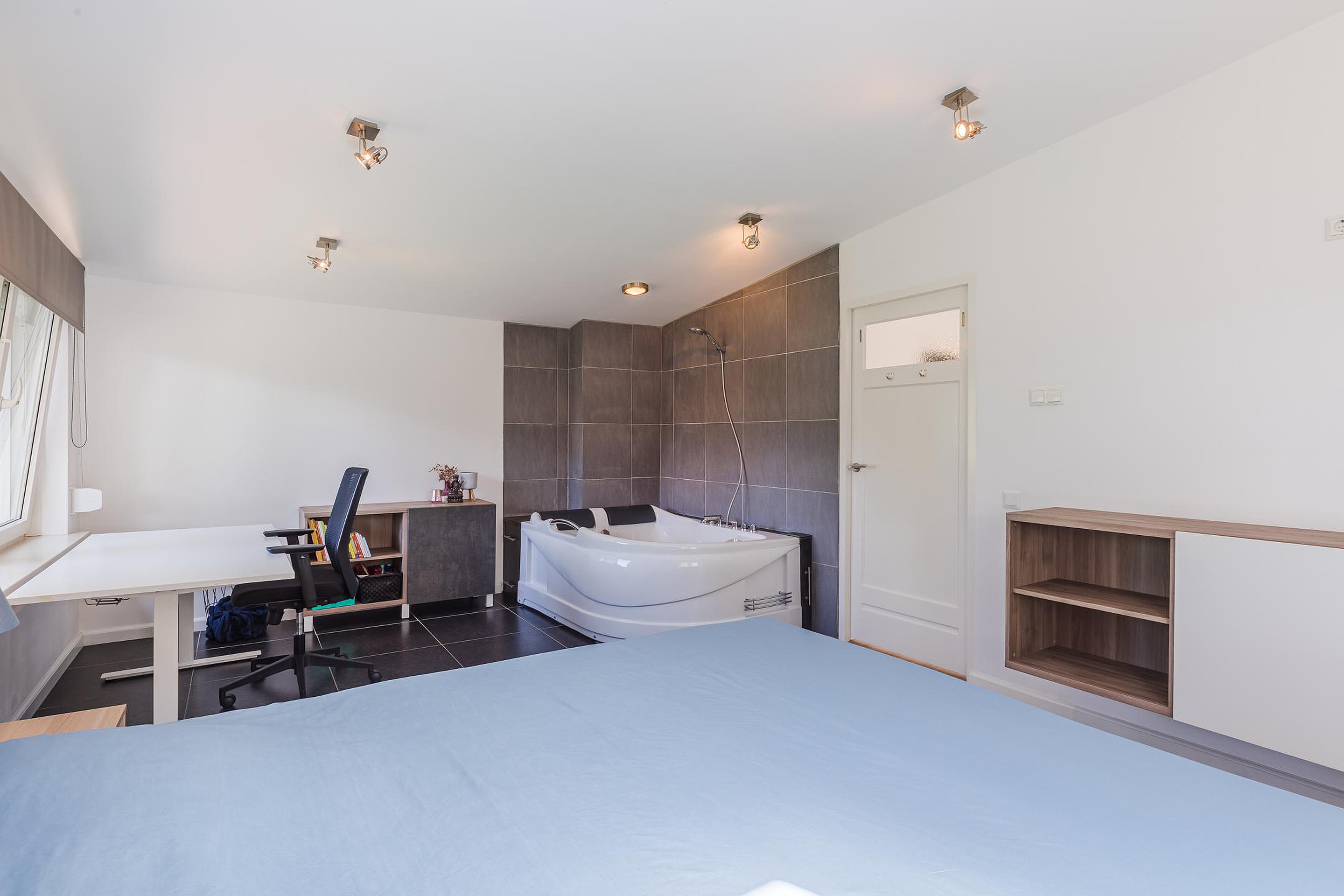 De overloop geeft toegang tot 3 ruime slaapkamers en de badkamer. De overloop en de slaapkamers zijn voorzien van een pvc-vloer. De slaapkamers zijn ca. 8,5m2, 8,5m2 en 22,5m2 groot. Eén slaapkamer is voorzien van een wastafel. De masterbedroom is deels voorzien van een tegelvloer. In de masterbedroom is een grote whirlpool gesitueerd. De geheel betegelde badkamer (2011) is ingericht met een inloopdouche, zwevend closet en een grote wastafel met meubel. De 1e verdieping is voorzien van rolluiken.