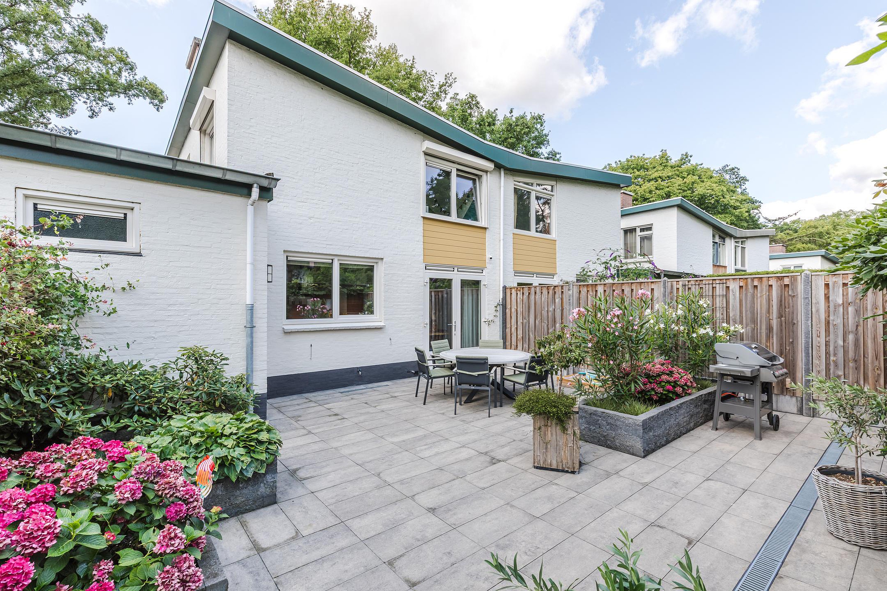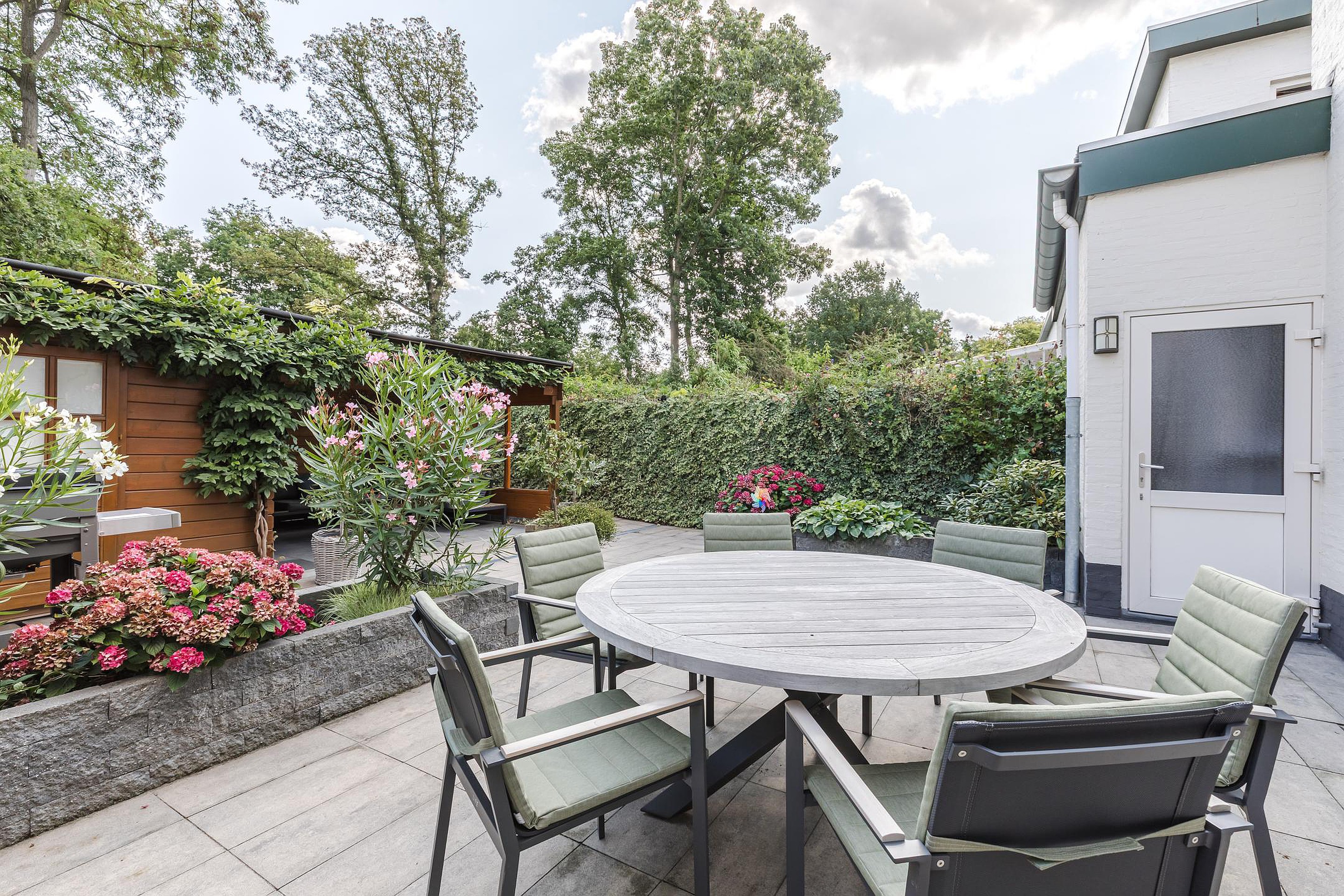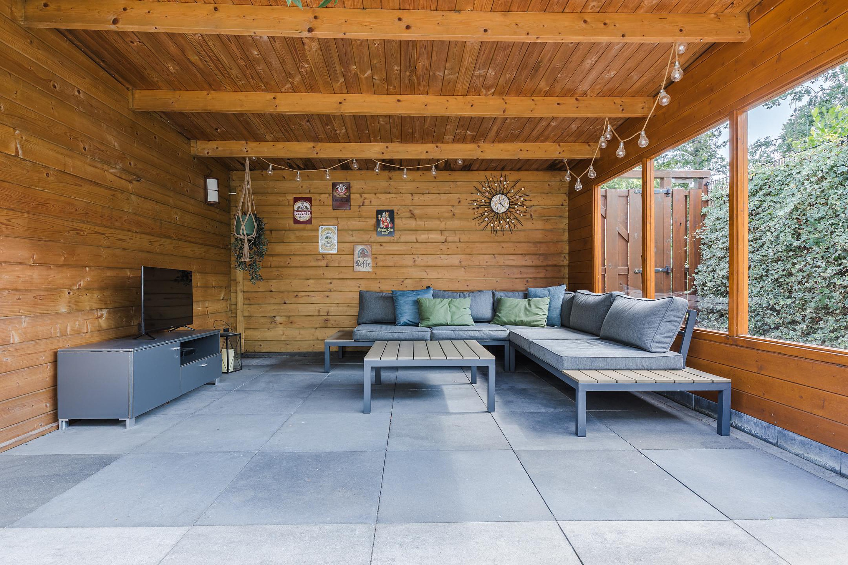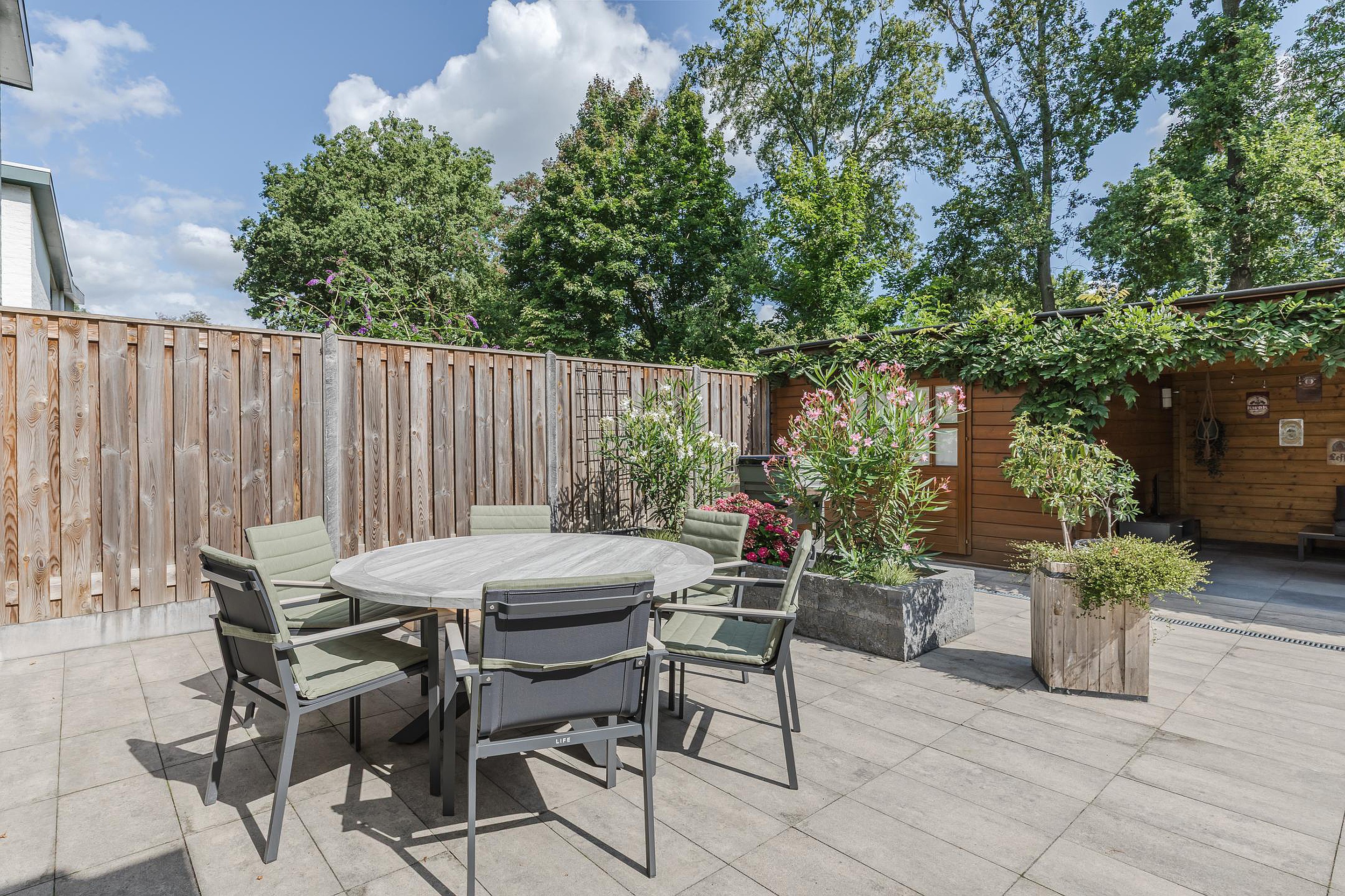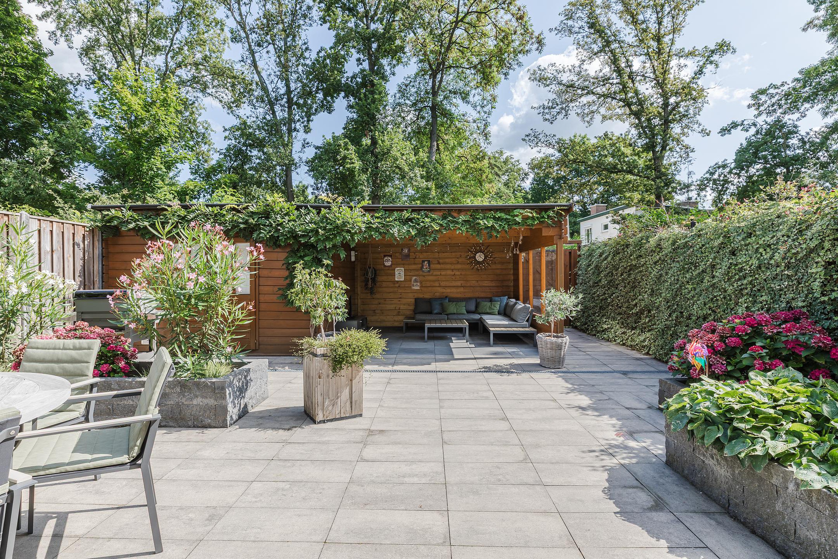 De achtertuin is aangelegd met een groot terras aan de woning, verschillende borders met beplanting en een groot tuinhuis met een overkapping. Het tuinhuis is ca. 11m2 en voorzien van elektra. De tuin is gelegen op het noordoosten is te bereiken middels een vrije achterom.
