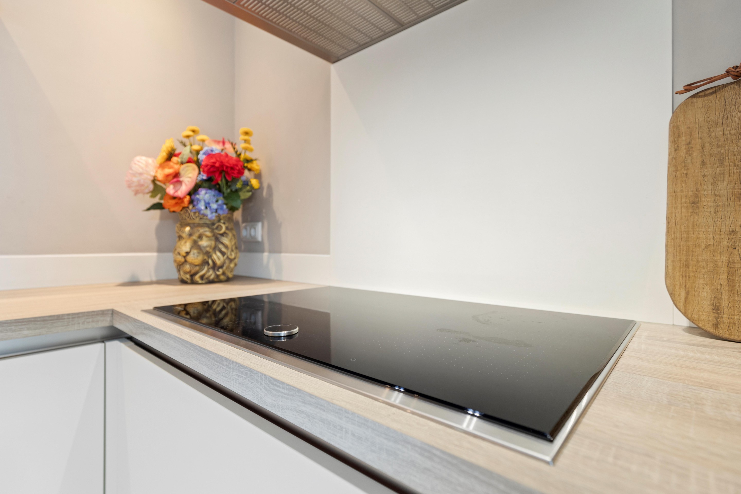 De lichte en ruime woonkamer (ca. 37 m2) beschikt over een speels ingedeelde zithoek met moderne cinema wall en elektrische haard. De open keuken (ca. 9 m2) is centraal gelegen en uitgevoerd in een moderne hoekopstelling met diverse inbouwapparatuur, waaronder een vaatwasser, 5-zone inductiekookplaat, combi oven/magnetron, koelkast en een koffiecorner in de vaste kastenwand.