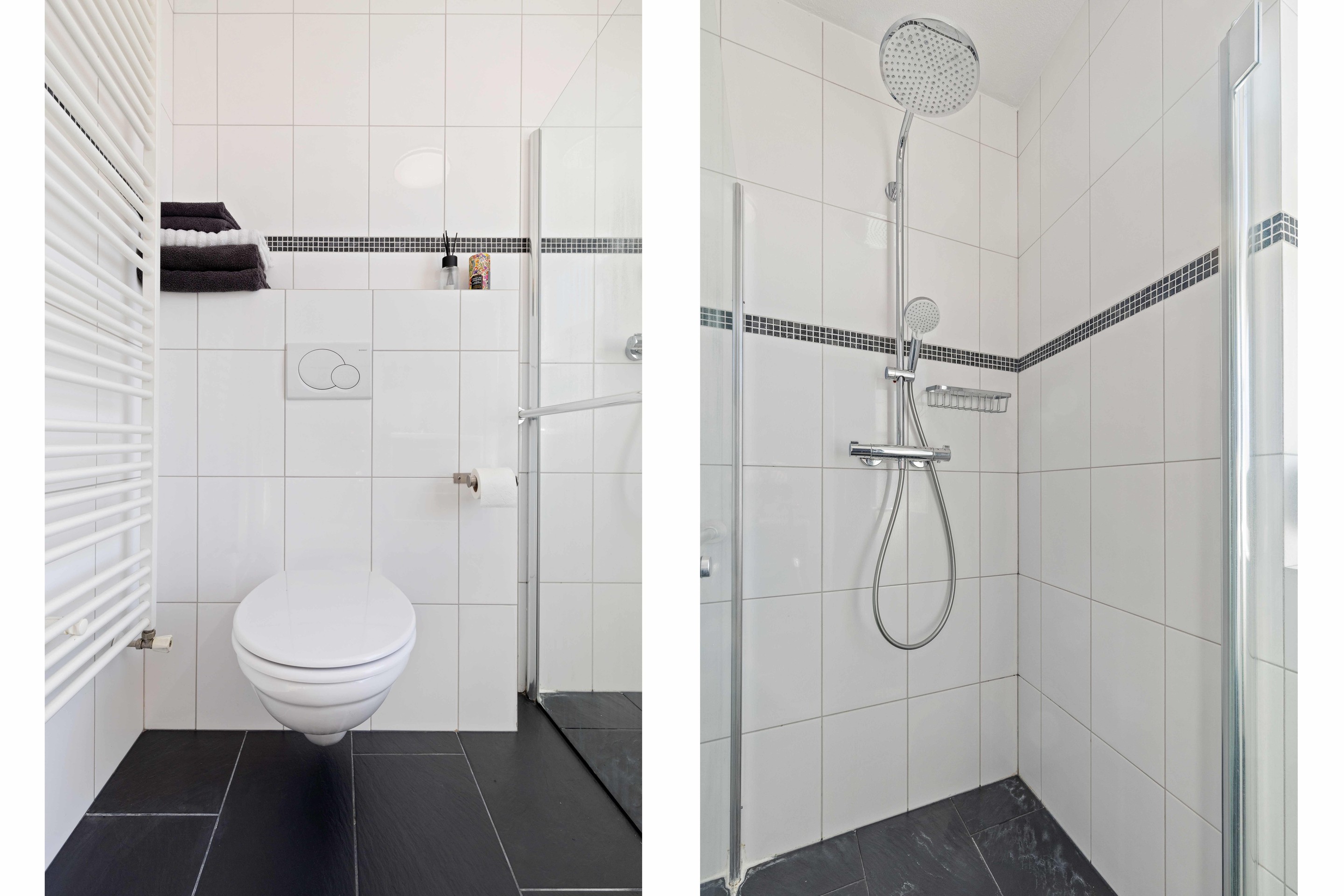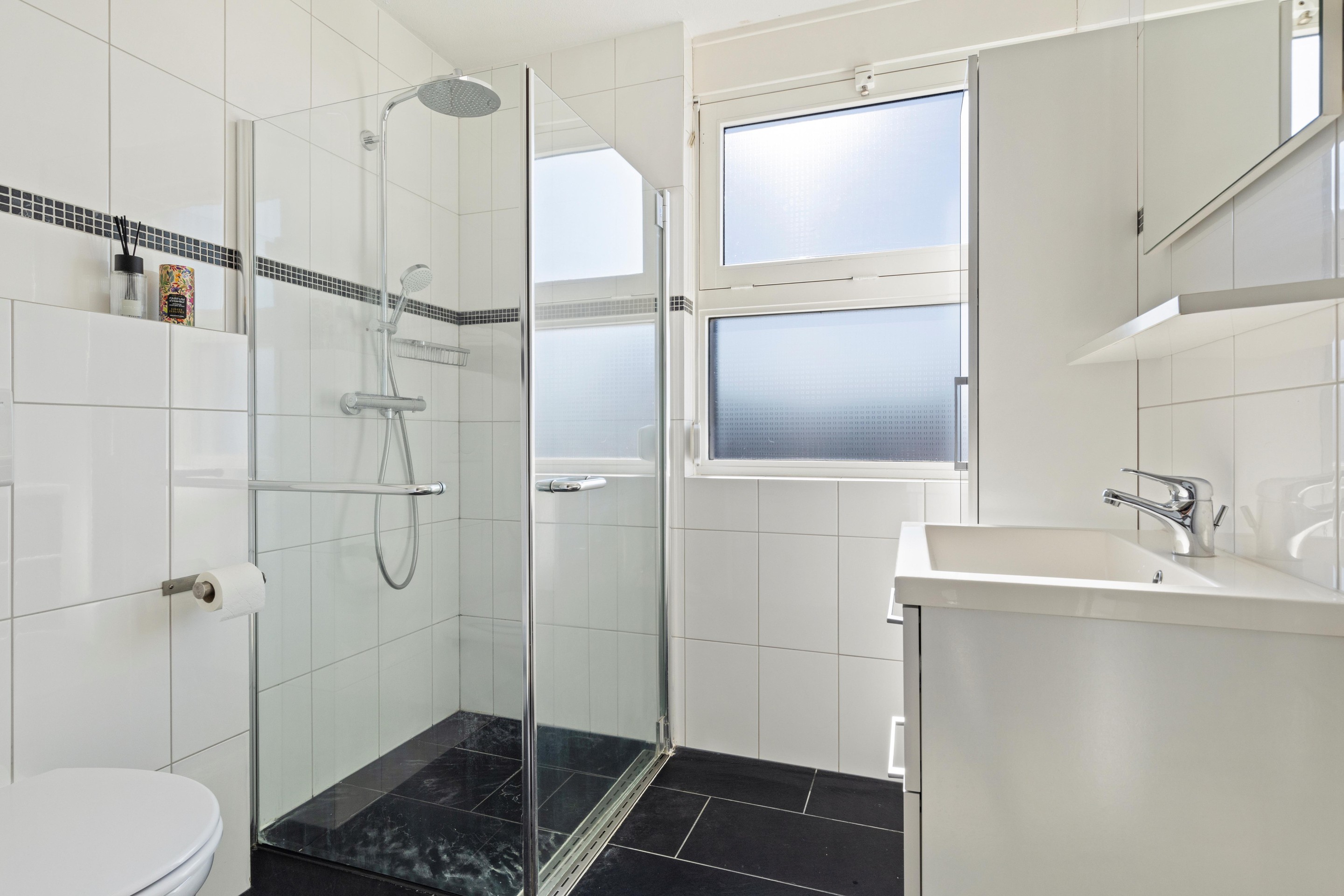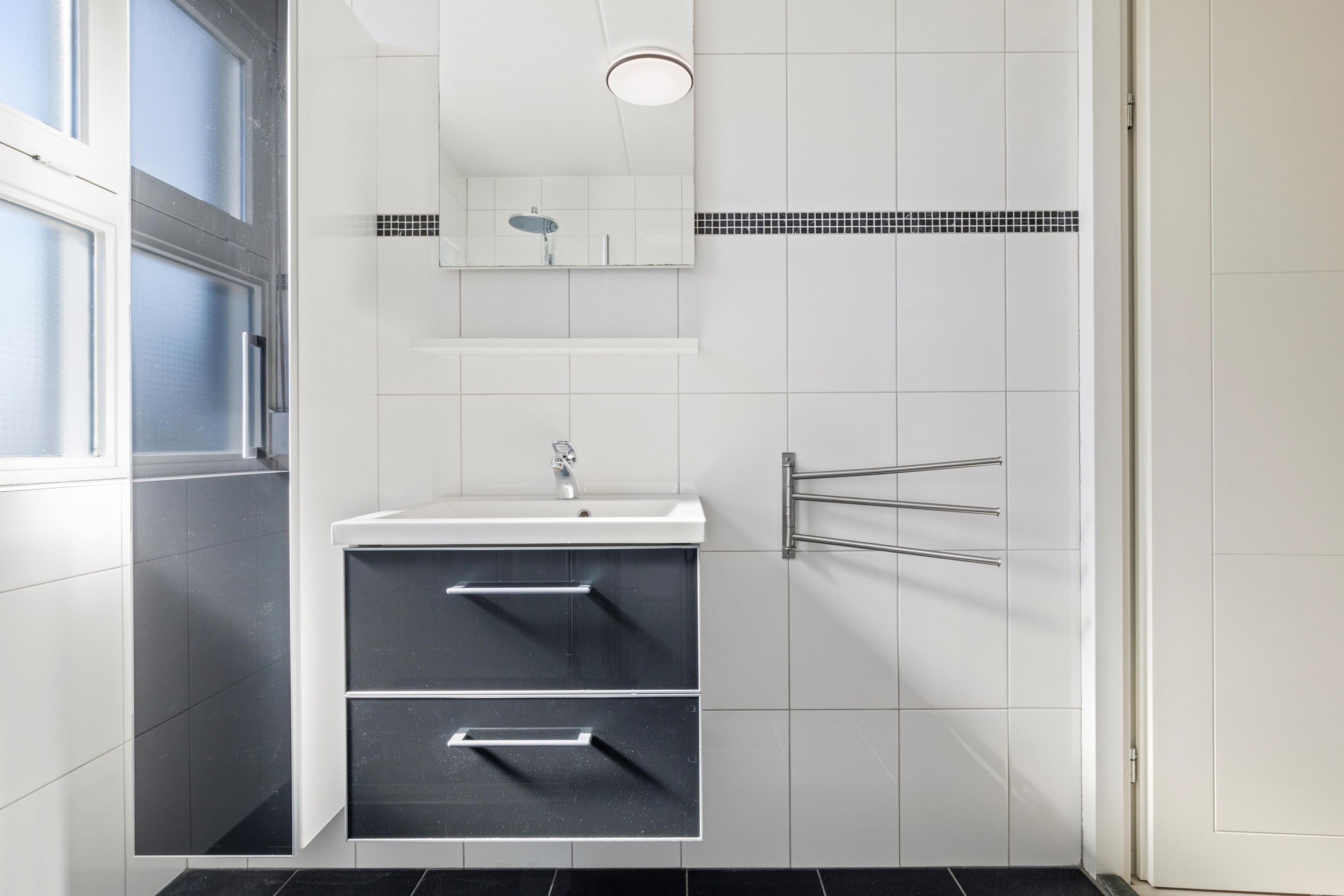 Overloop met toegang tot 3 ruime slaapkamers (ca. 8, 9 en 14 m2), allen voorzien van rolluiken. De moderne badkamer is compleet uitgerust met een inloopdouche, wastafelmeubel, zwevend toilet, designradiator en een raam voor natuurlijke ventilatie en daglicht en mechanische afzuiging.