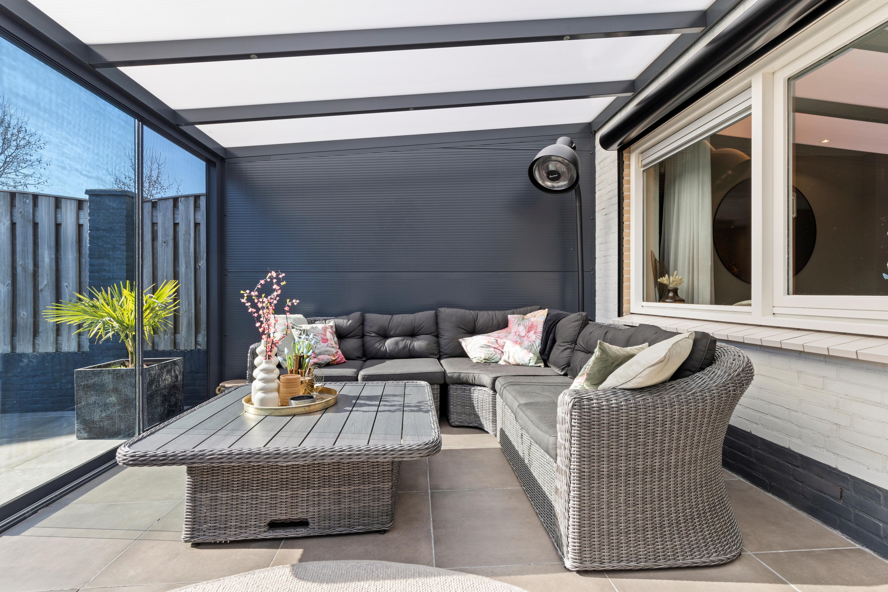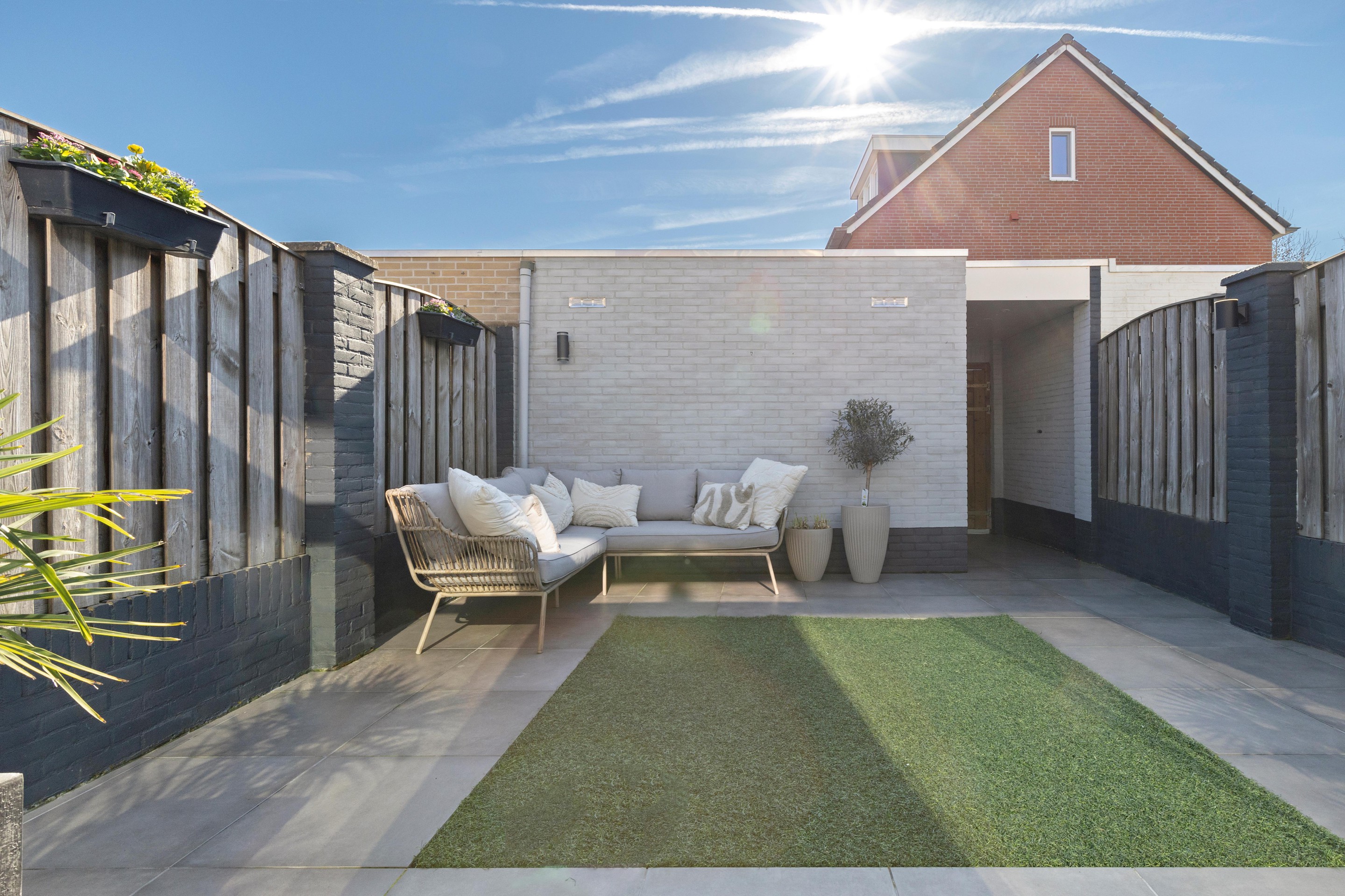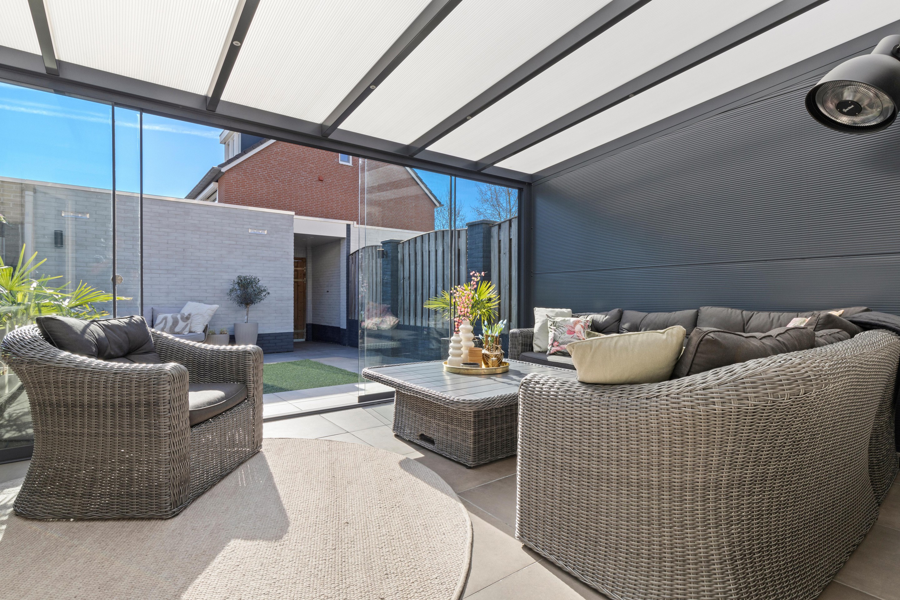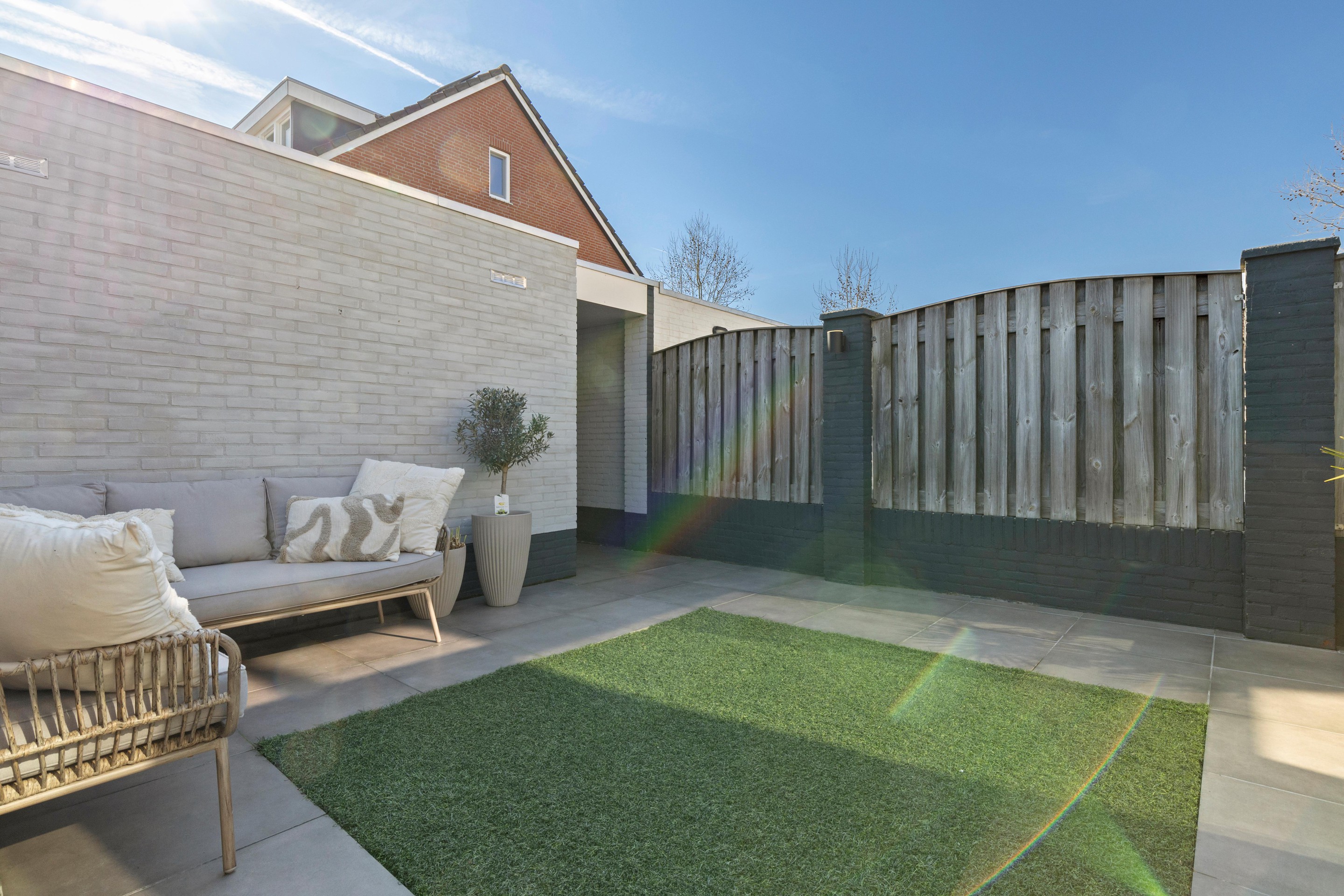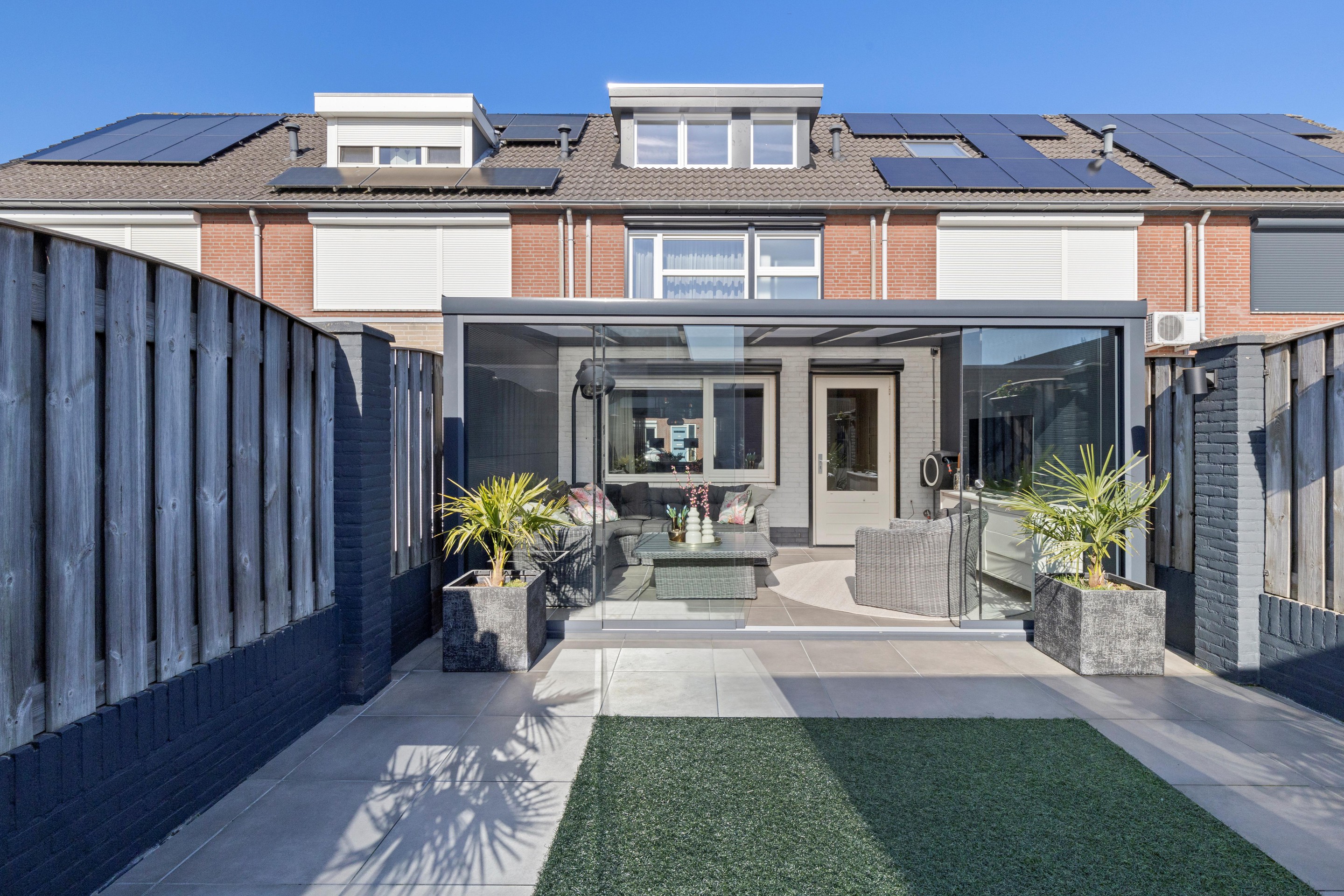 De in 2022 nieuw aangelegde achtertuin is onderhoudsvriendelijk en beschikt over een ruim terras met keramische tegels, kunstgazon en een afsluitbare overkapping/serre (ca. 16,5 m2), waardoor je het hele jaar door van buiten kunt genieten.