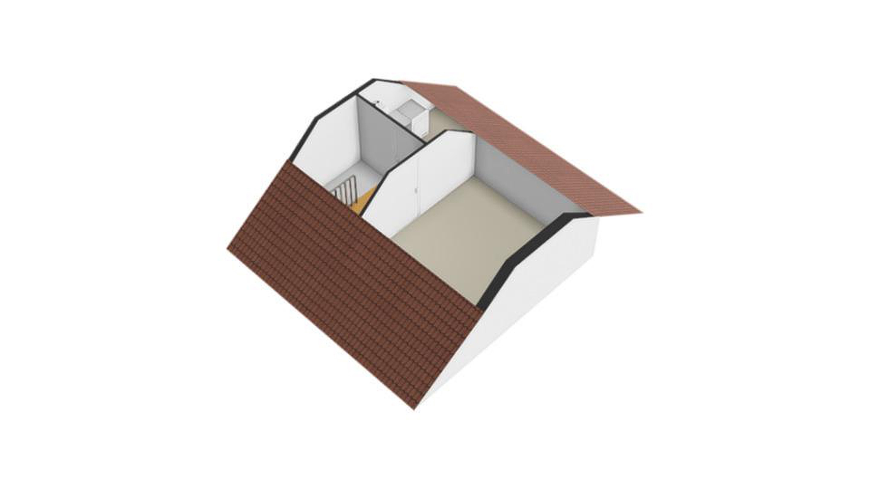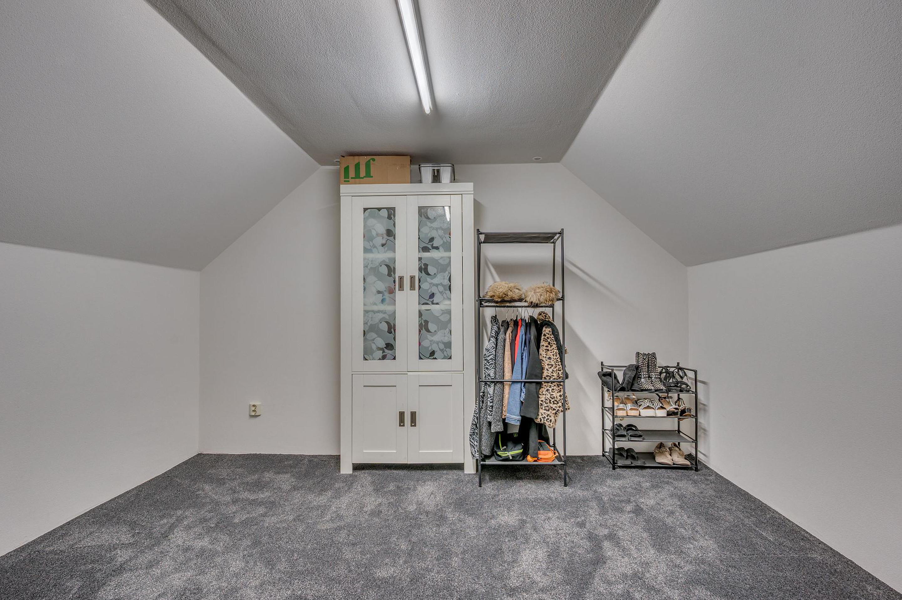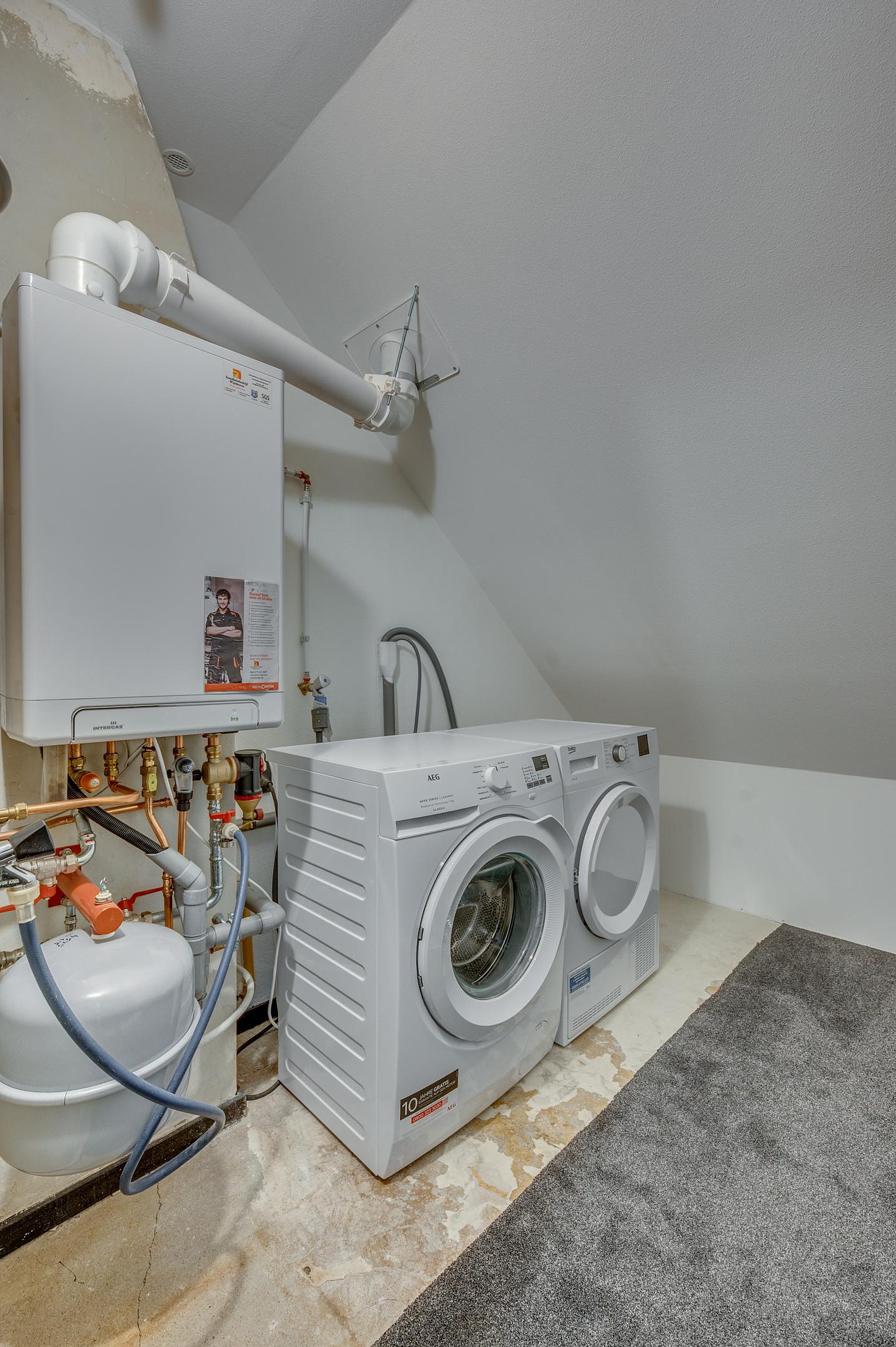 Via een vaste trap bereik je de tweede verdieping met wasruimte, bergruimte en een royale hobby- of werkruimte.