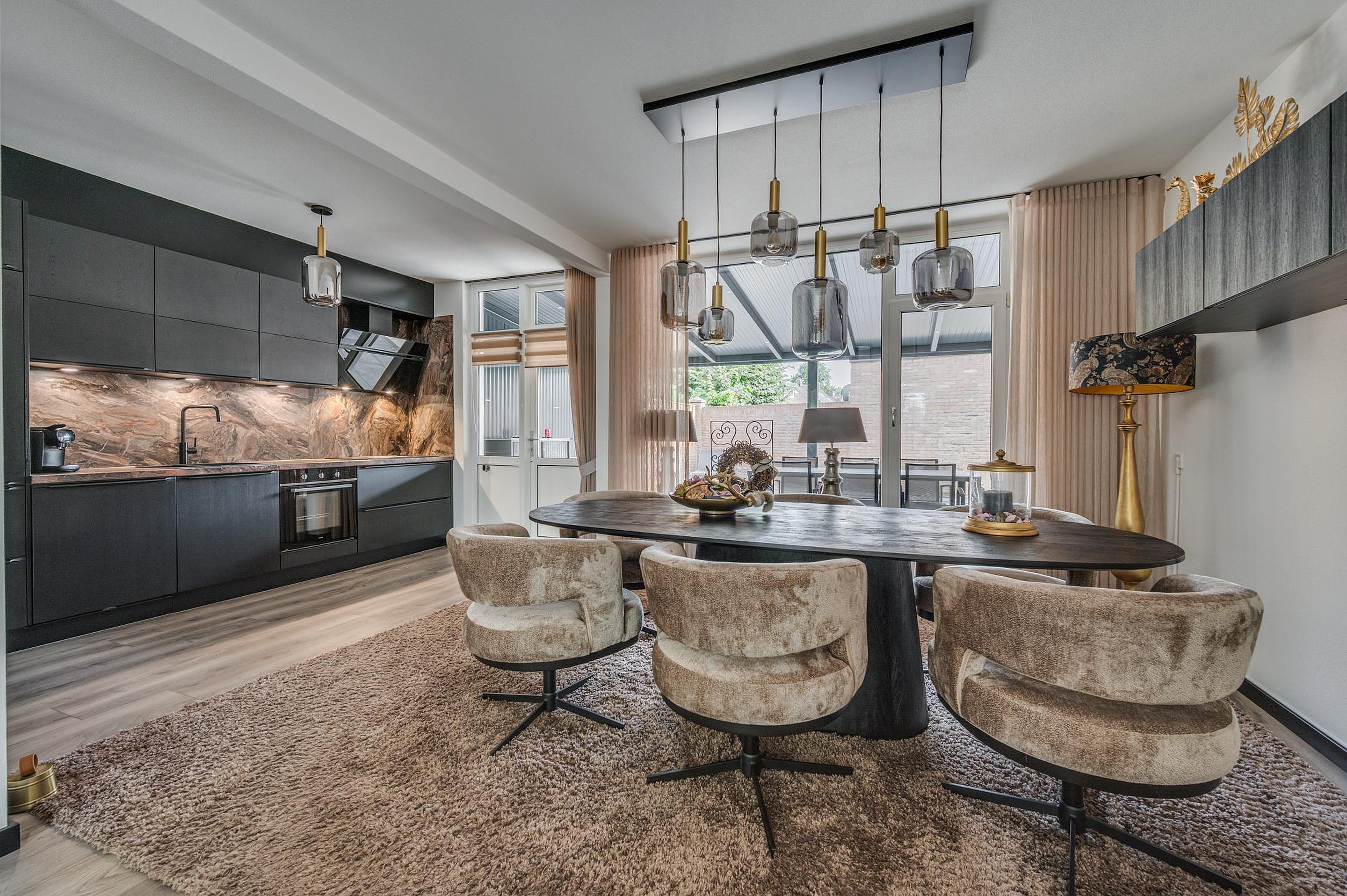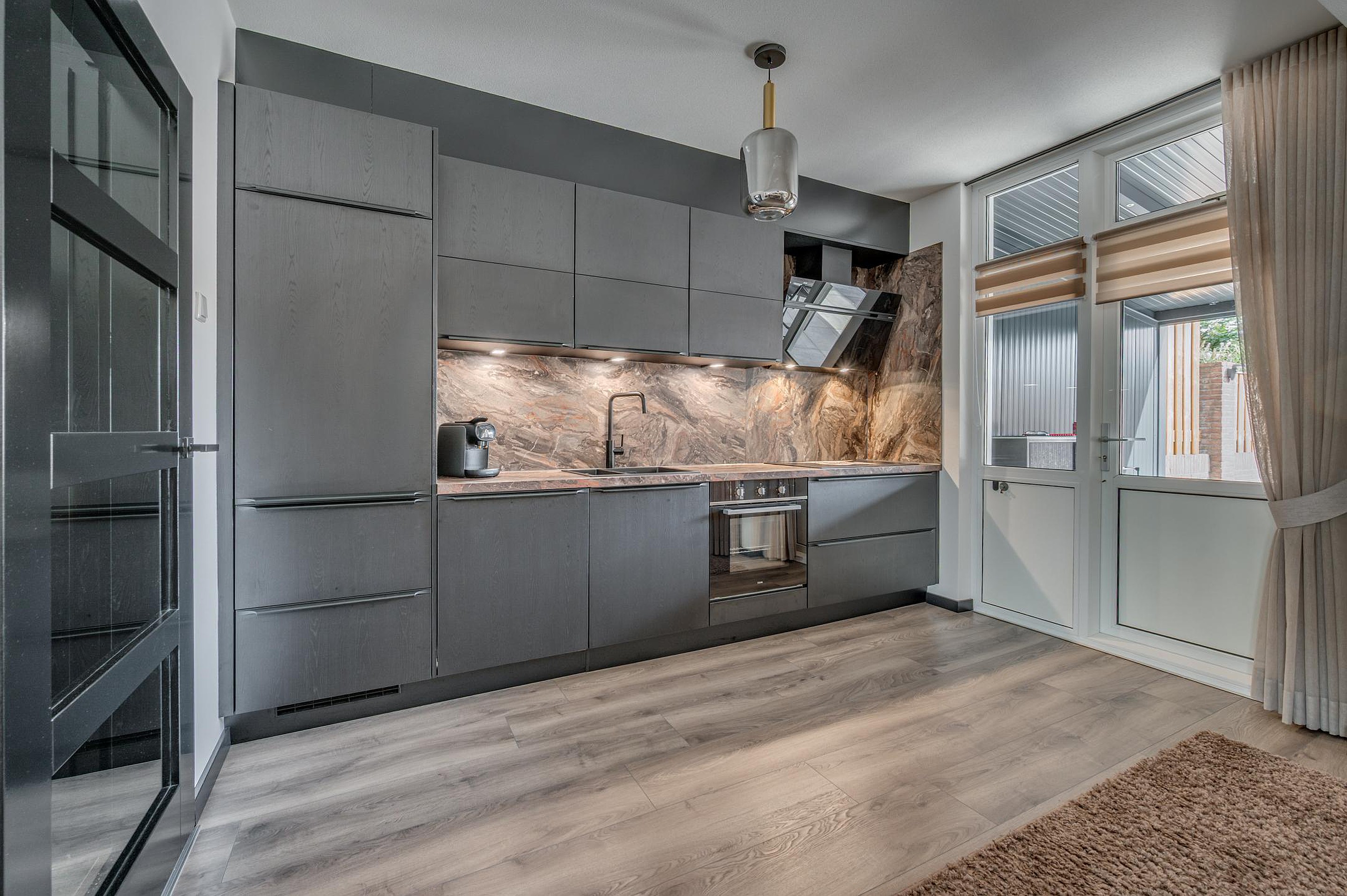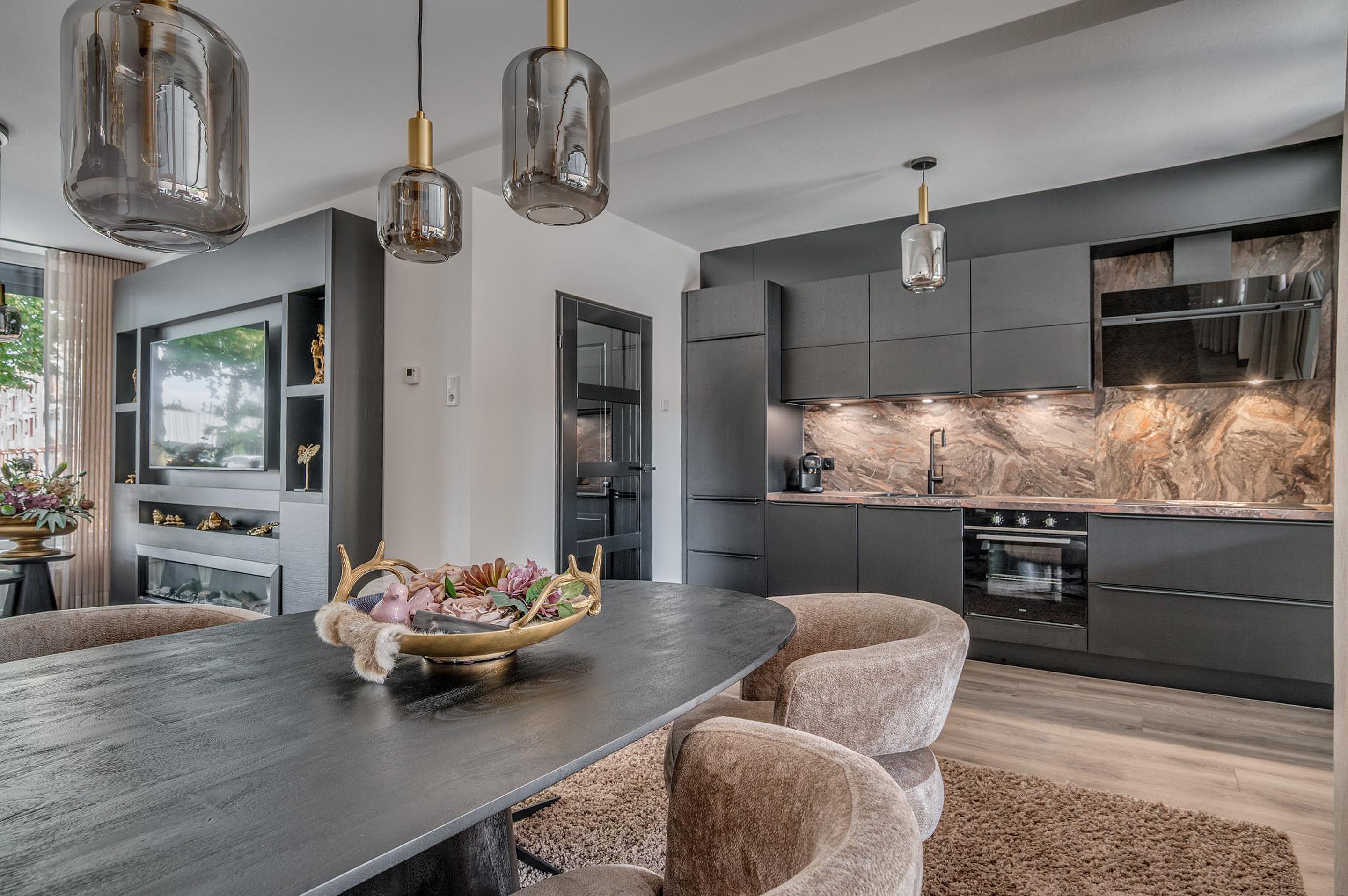 - Open keuken met luxe uitgevoerde inbouwcombinatie inclusief inbouwapparatuur: koelkast, inductie kookplaat, afzuigkap, vaatwasmachine en combi oven.