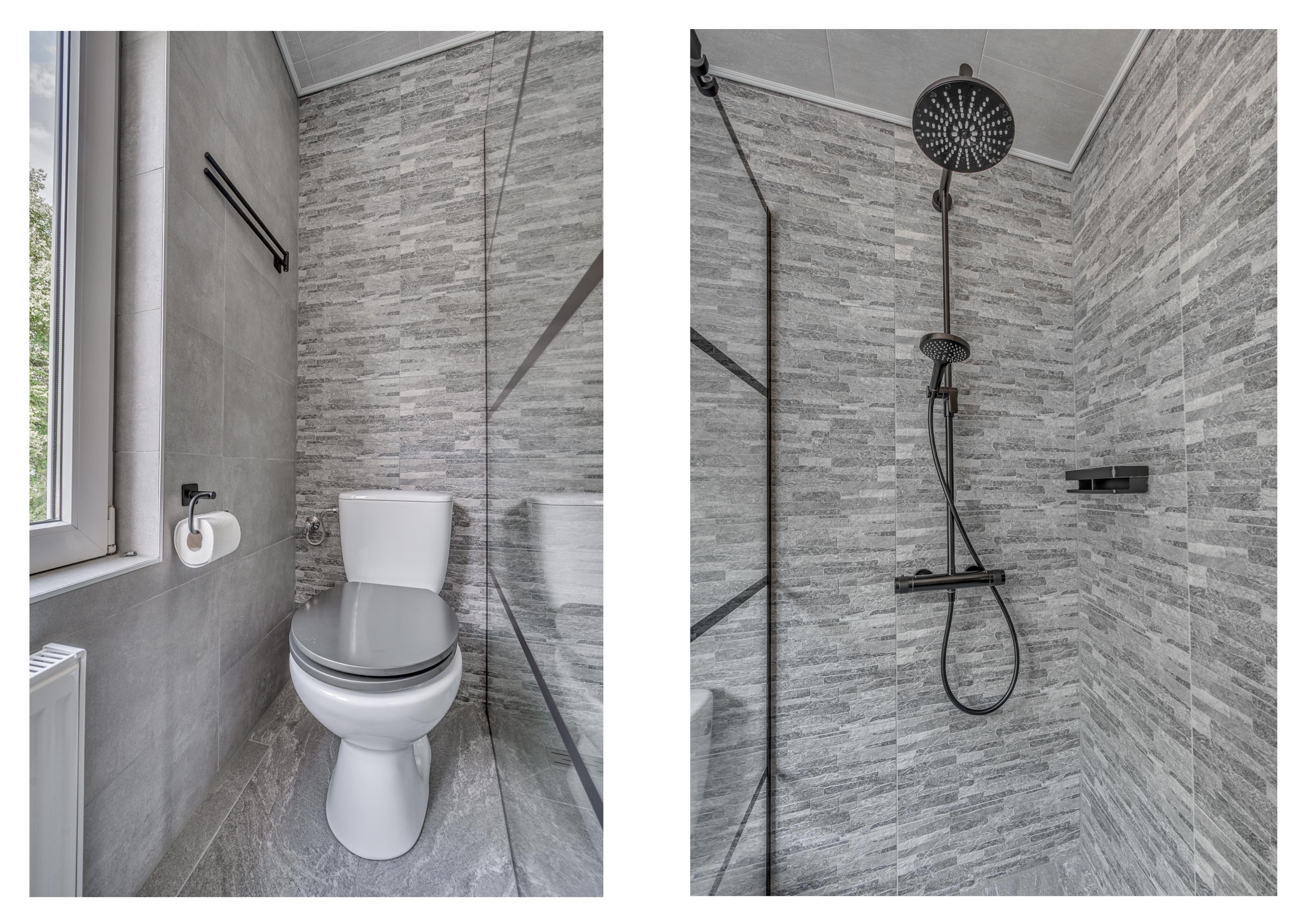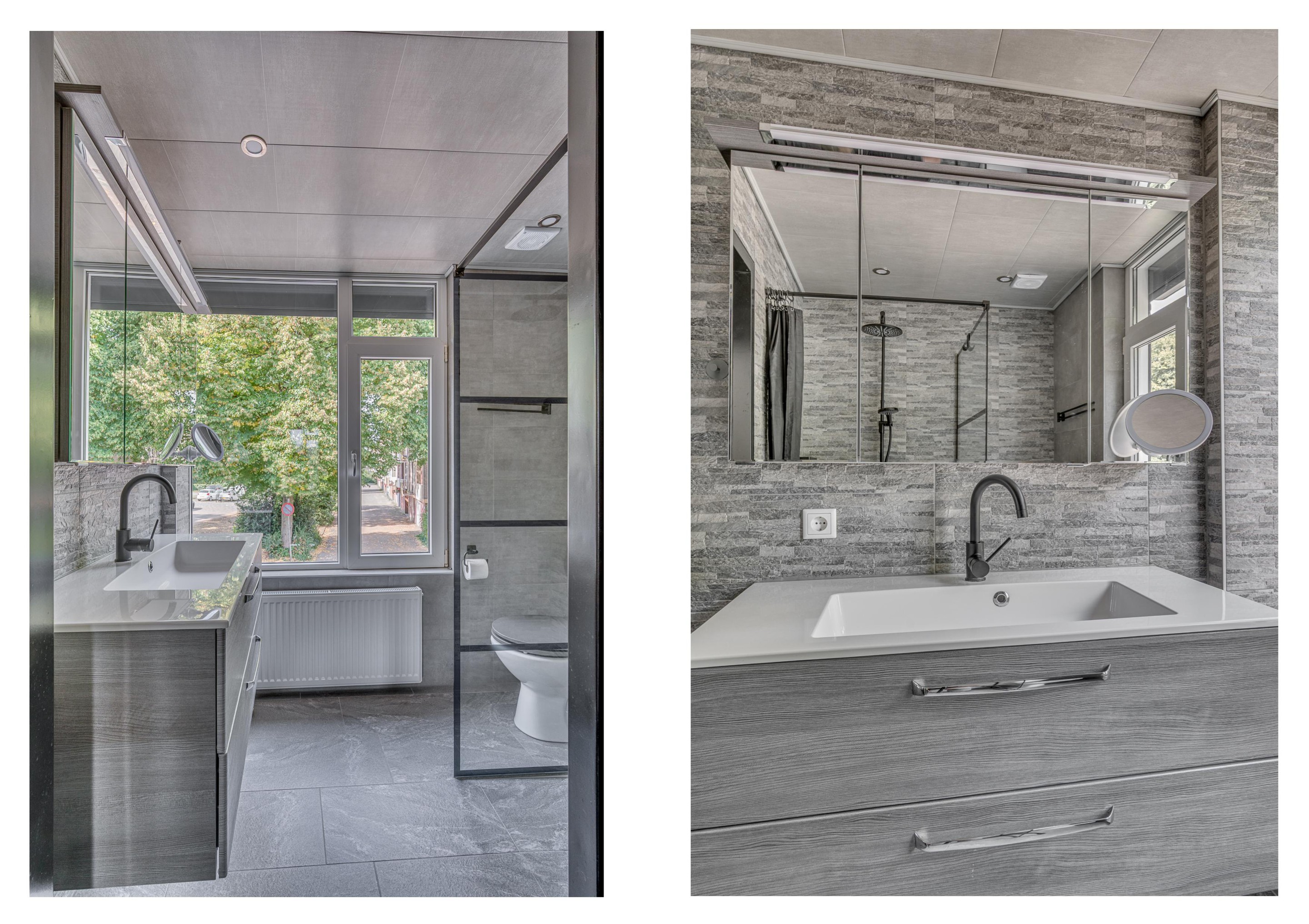 - Zeer fraai afgewerkte badkamer met inloopdouche, toilet en wastafelmeubel; mechanische afzuiging.