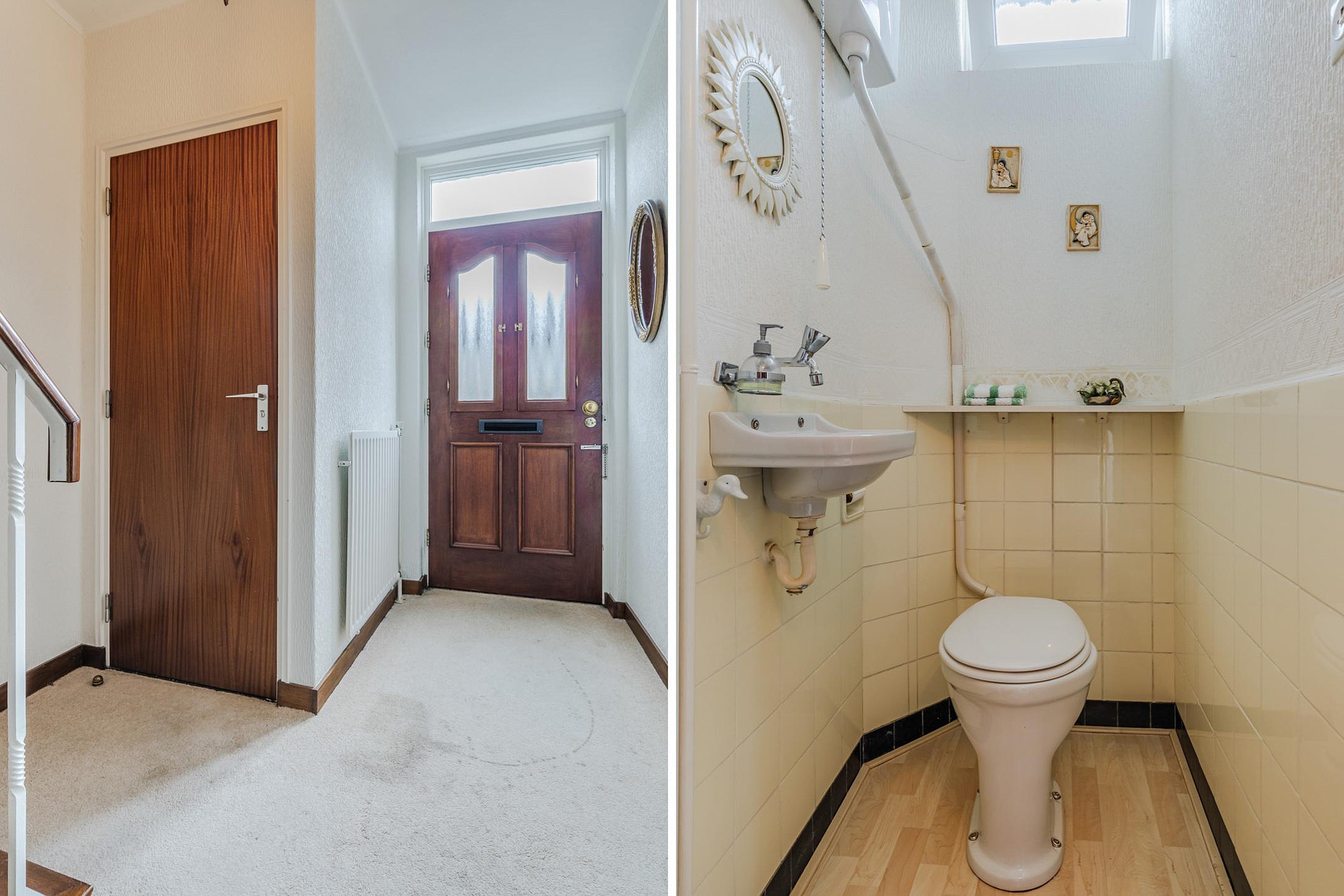 Via het betegeld looppad door de voortuin bereikt men de entree.