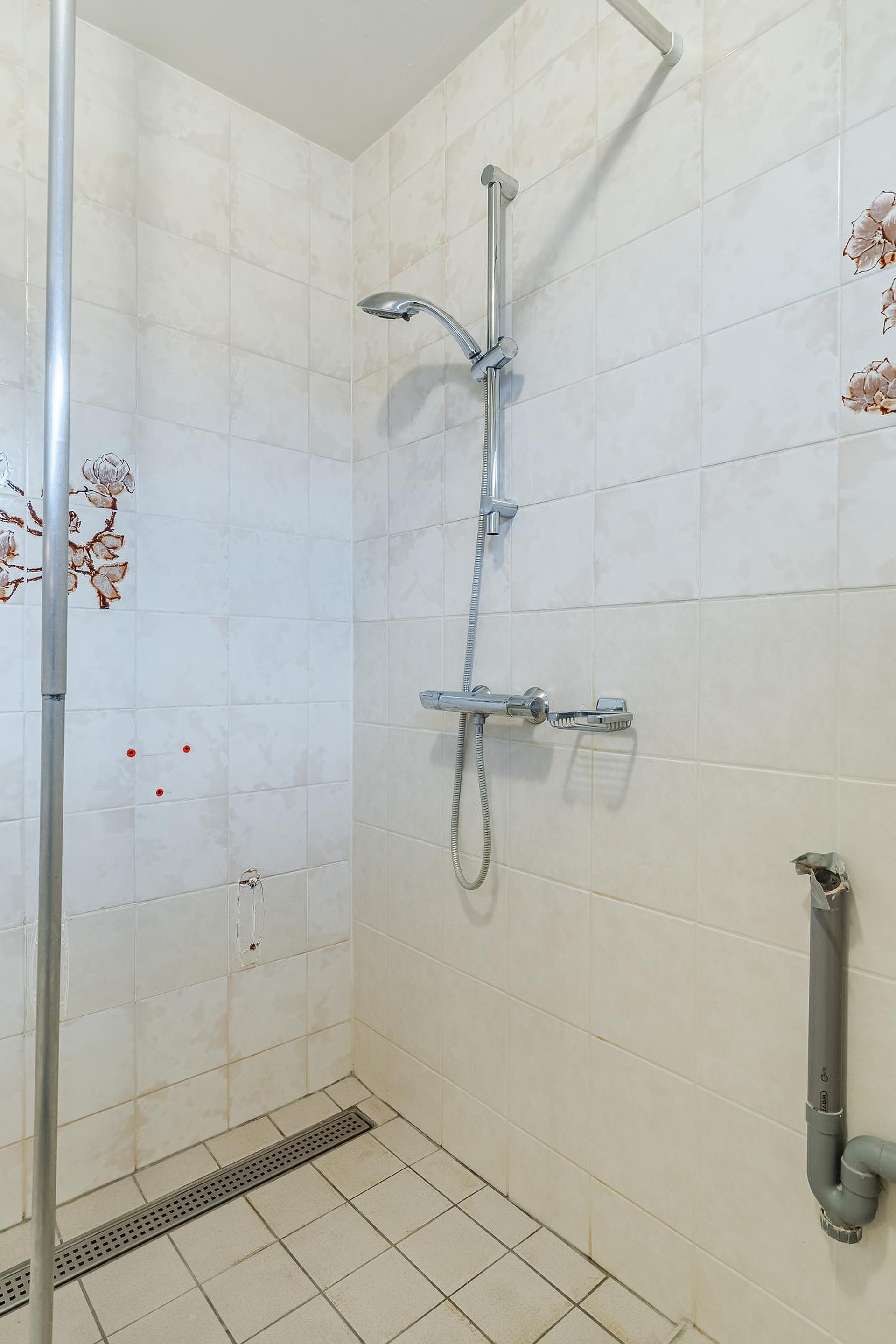 De trapopgang geeft toegang tot de overloop met aangrenzend 3 ruime slaapkamers (ca. 8, 13 en 17m3), een grote bergkast en een ruime badkamer. De masterbedroom heeft een inbouwkast. Alle kamers hebben grote vensters. De grotendeels betegelde badkamer (ca. 5m2)heeft een inloopdouche met thermostaatkraan, een zwevend closet, een grote wastafel met onderkast en handdoekkast, radiator en buitenraam. De hele verdieping is voorzien van vloerbedekking.