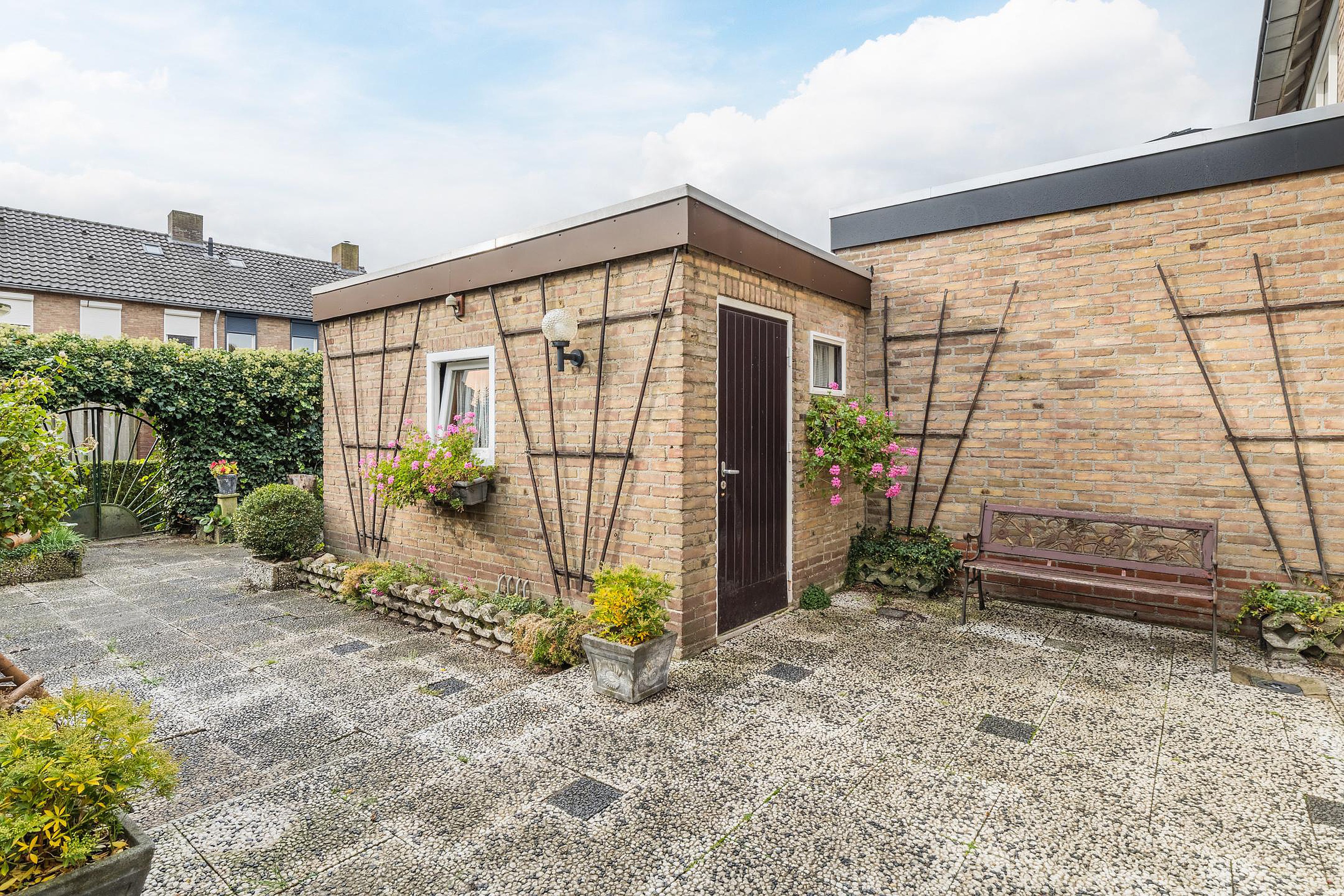 De achtertuin is gelegen op het zuiden en is onderhoudsvriendelijk ingericht. De tuin is grotendeels betegeld, heeft aan de zijkanten kleine borders met beplanting. Het terras aan de woning is voorzien van een zonnescherm. Er is een vrije achterom met dubbele toegangspoort. Een grote stenen berging (ca. 9m2) biedt plaats voor o.a. het stallen van de fietsen en het opbergen van tuingereedschap/meubelen.