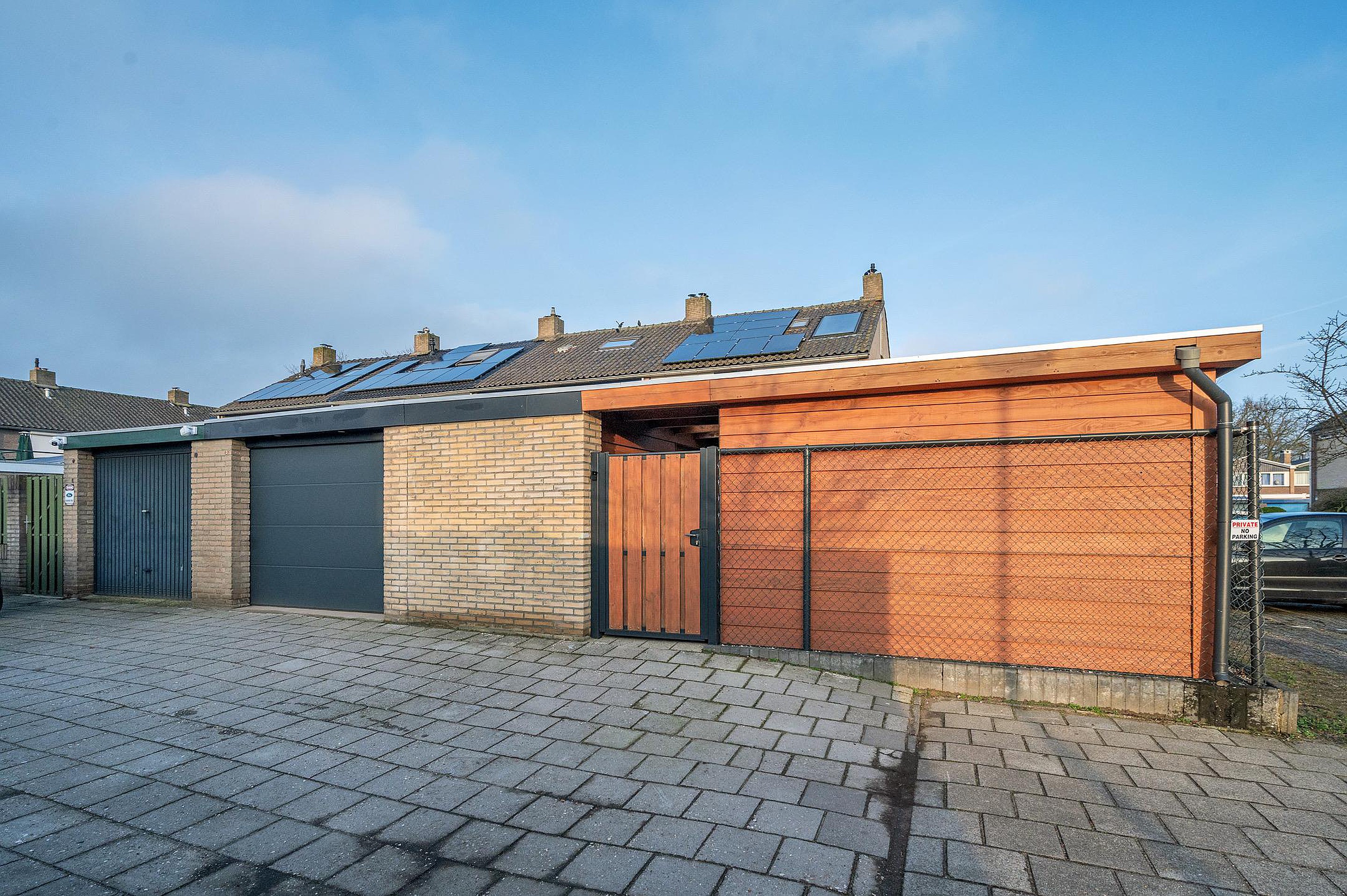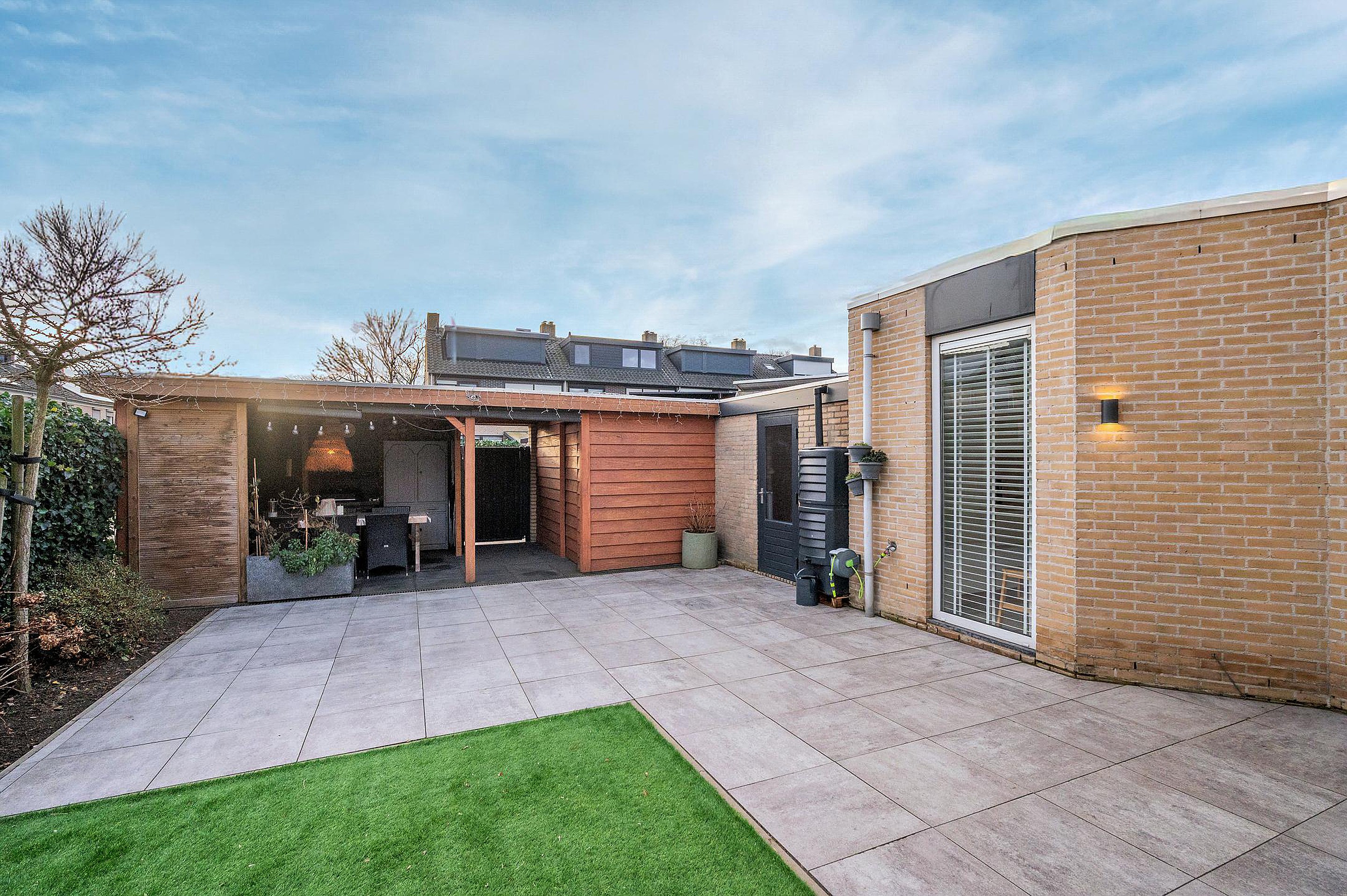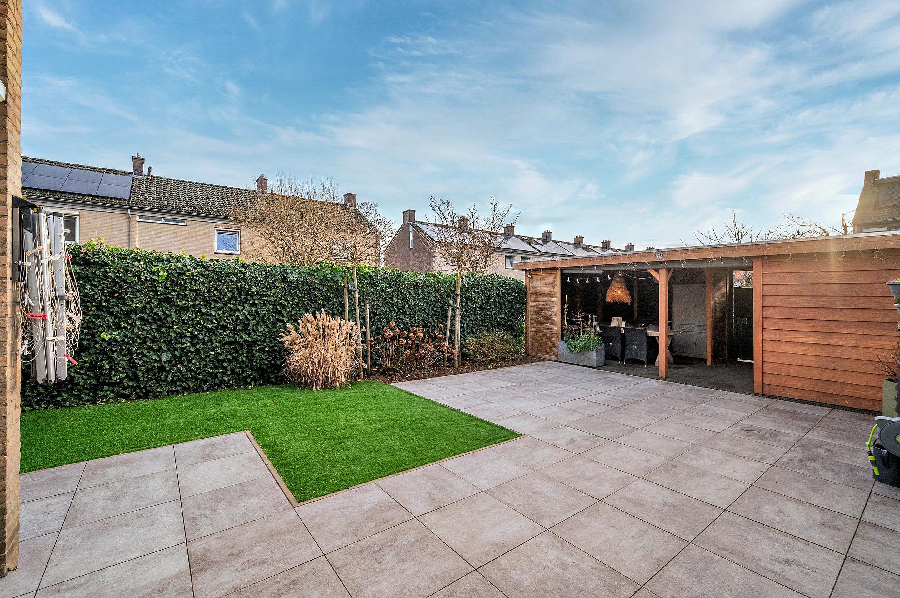 De recent aangelegde achtertuin, gelegen op het zuidoosten, biedt volop zon en privacy. In 2024 is hier een fraaie overkapping geplaatst, waardoor je vrijwel het hele jaar door van het buitenleven kunt genieten. Daarnaast beschikt de woning over een berging en garage met elektrische poort, ideaal voor het stallen van de auto, fietsen of extra opslag.