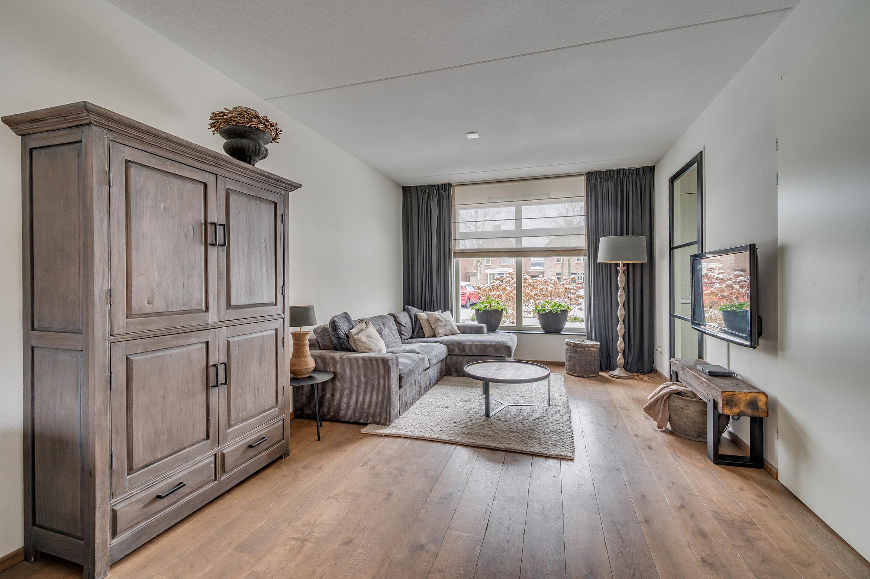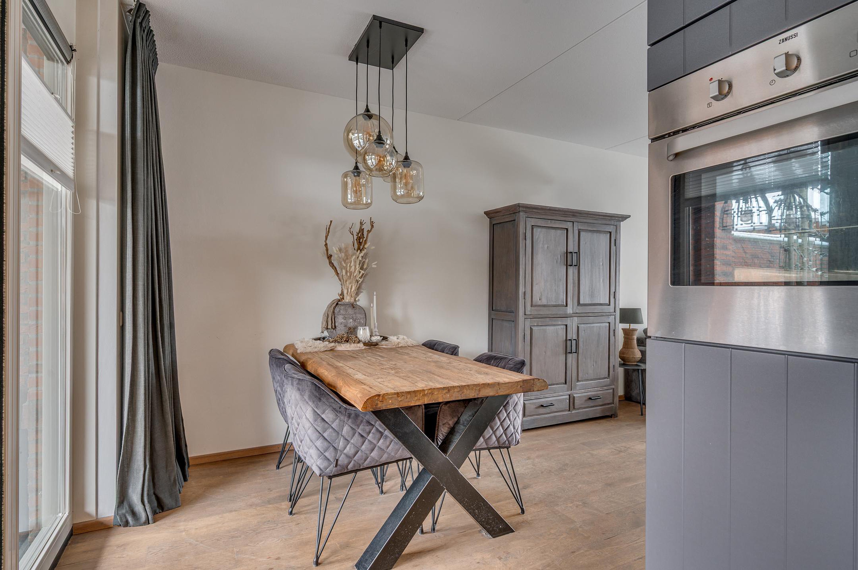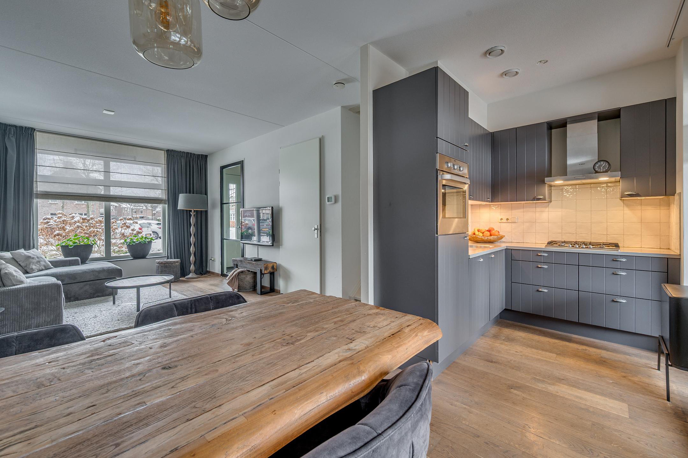Via de entree is de hal bereikbaar met garderobe, meterkast en een modern toilet. Vanuit de hal heb je toegang tot de gezellige woonkamer met grote raampartijen en openslaande deuren maar de tuin. Aan de voorzijde is er vrij uitzicht op de groenvoorziening. In de woonkamer bevindt zich tevens een praktische trap-/bergkast. De halfopen keuken is aan de achterzijde gesitueerd en uitgevoerd in een moderne hoekopstelling. De keuken is voorzien van een gasfornuis, afzuigkap, combi-oven, koelkast en vaatwasser. De gehele begane grond is afgewerkt met een fraaie houten vloer en voorzien van vloerverwarming.