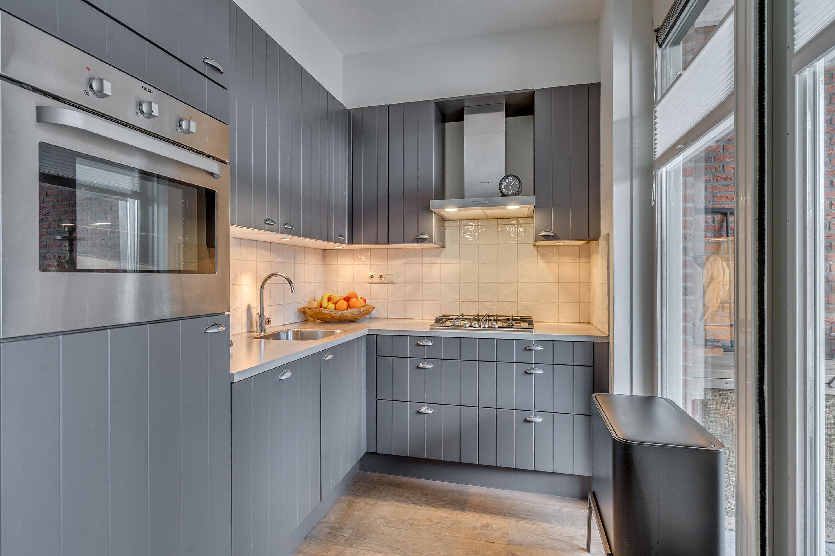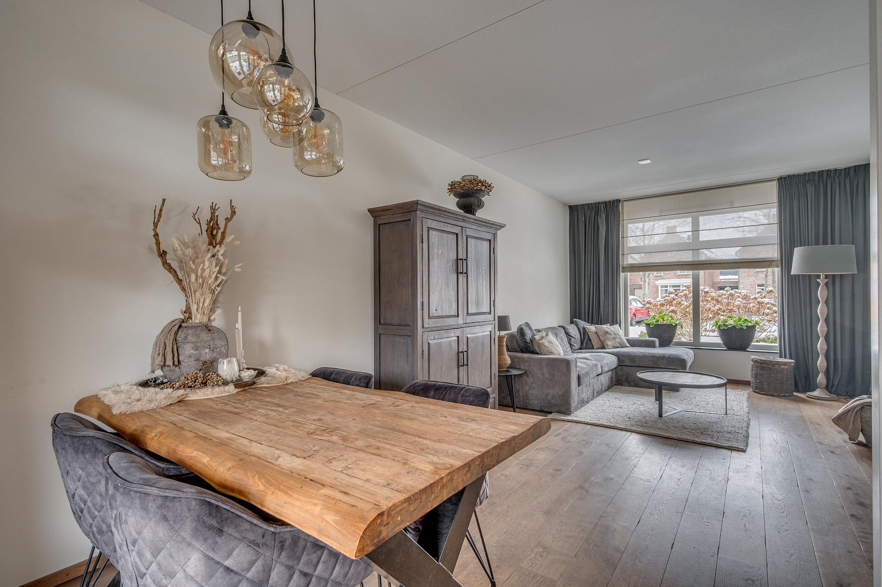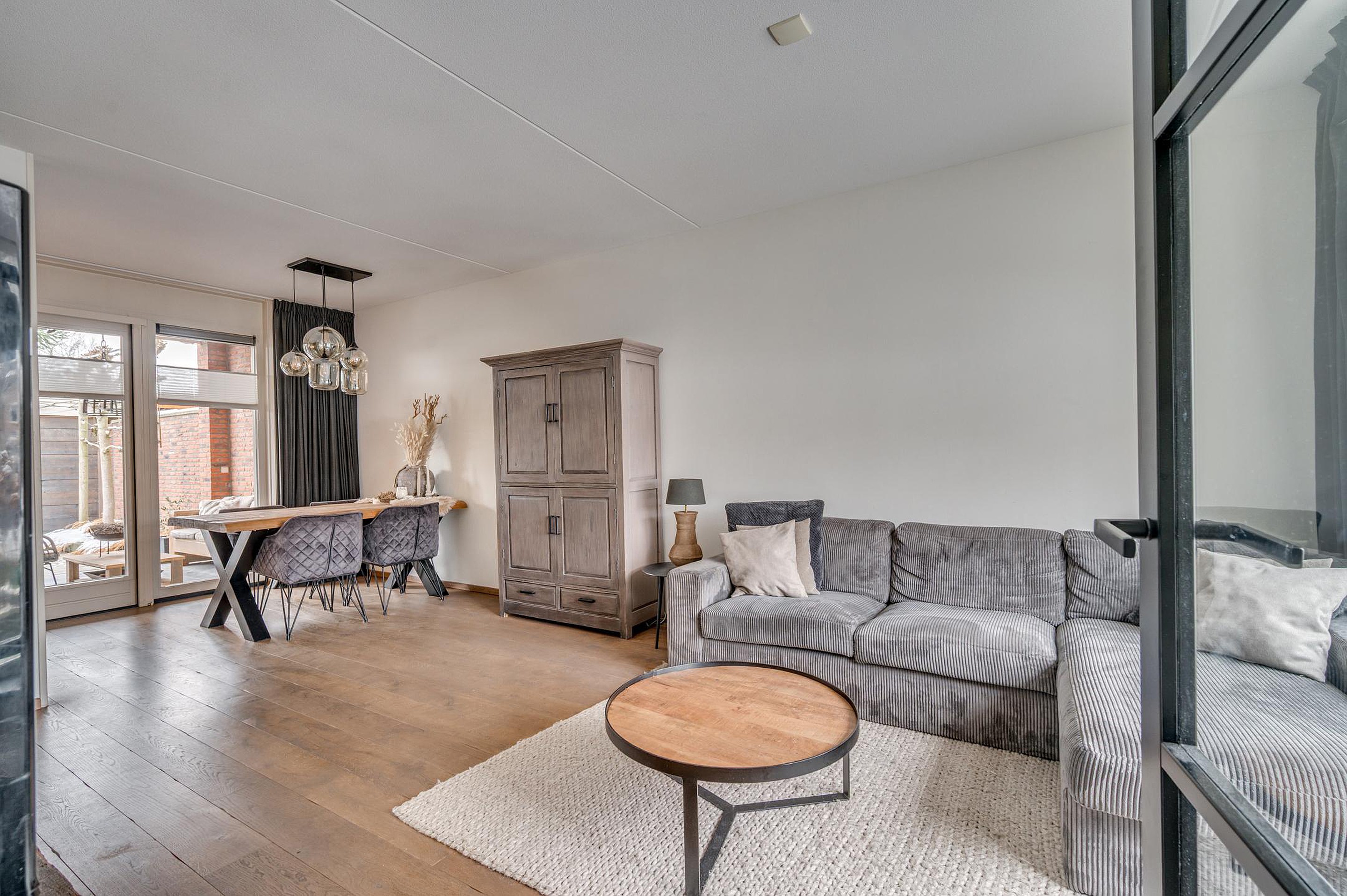 Via de entree is de hal bereikbaar met garderobe, meterkast en een modern toilet. Vanuit de hal heb je toegang tot de gezellige woonkamer met grote raampartijen en openslaande deuren maar de tuin. Aan de voorzijde is er vrij uitzicht op de groenvoorziening. In de woonkamer bevindt zich tevens een praktische trap-/bergkast. De halfopen keuken is aan de achterzijde gesitueerd en uitgevoerd in een moderne hoekopstelling. De keuken is voorzien van een gasfornuis, afzuigkap, combi-oven, koelkast en vaatwasser. De gehele begane grond is afgewerkt met een fraaie houten vloer en voorzien van vloerverwarming.