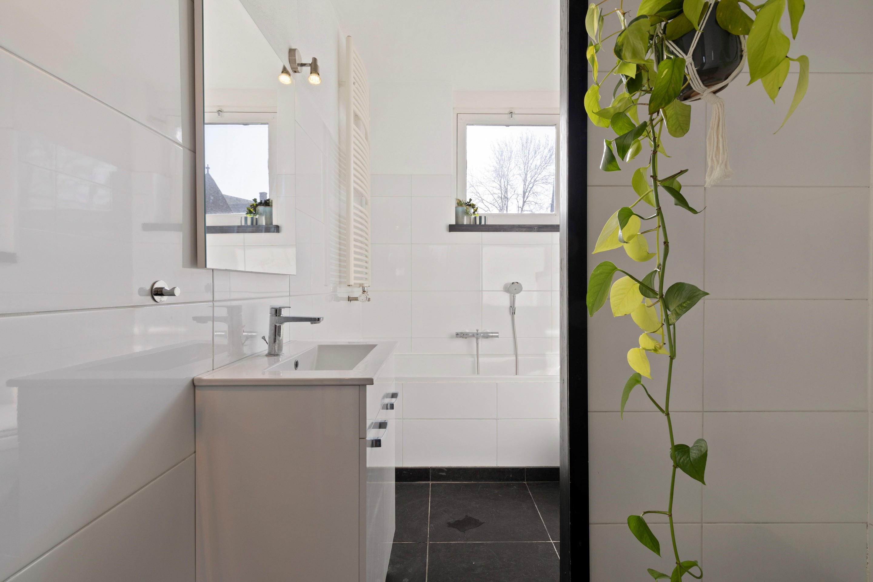De overloop geeft toegang tot 3 slaapkamers, de badkamer en de trapopgang naar de 2e verdieping. De slaapkamers zijn allen voorzien van een laminaatvloer en ca. 5,5m2, 11m2 en 12m2 groot. De slaapkamers aan de achterzijde hebben een wijds uitzicht. Aan de voorzijde heb je een mooi uitzicht op het klooster van Mariadal. De badkamer is ingericht met een ligbad, aparte douchecabine, wastafel met meubel en een zwevend closet.