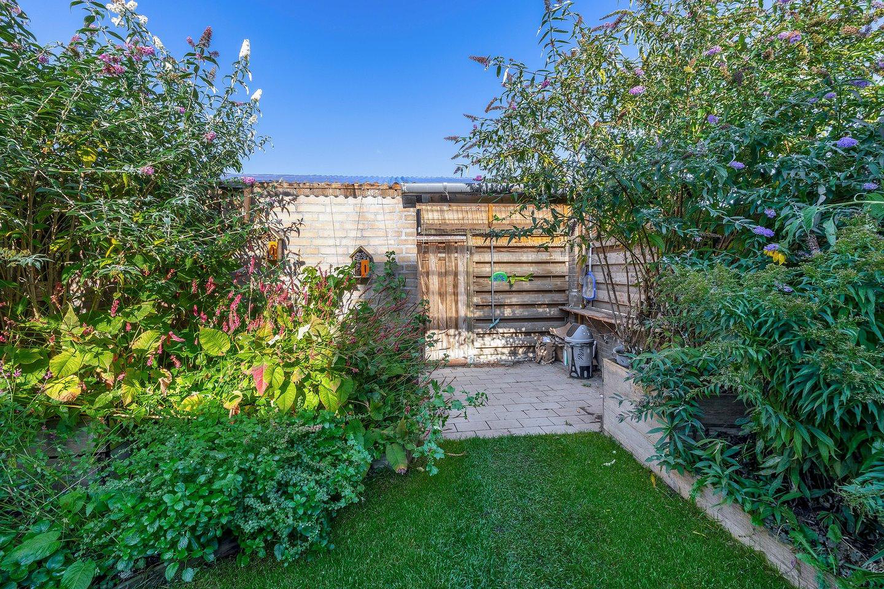 De achtertuin is ca. 16m diep en is gelegen op het noordoosten. De tuin is te bereiken middels een achterom. Aan de woning is een overkapping gerealisserd. Achter in de tuin bevindt zich de stenen berging van ca. 6m2. De tuin biedt veel privacy en rust.
