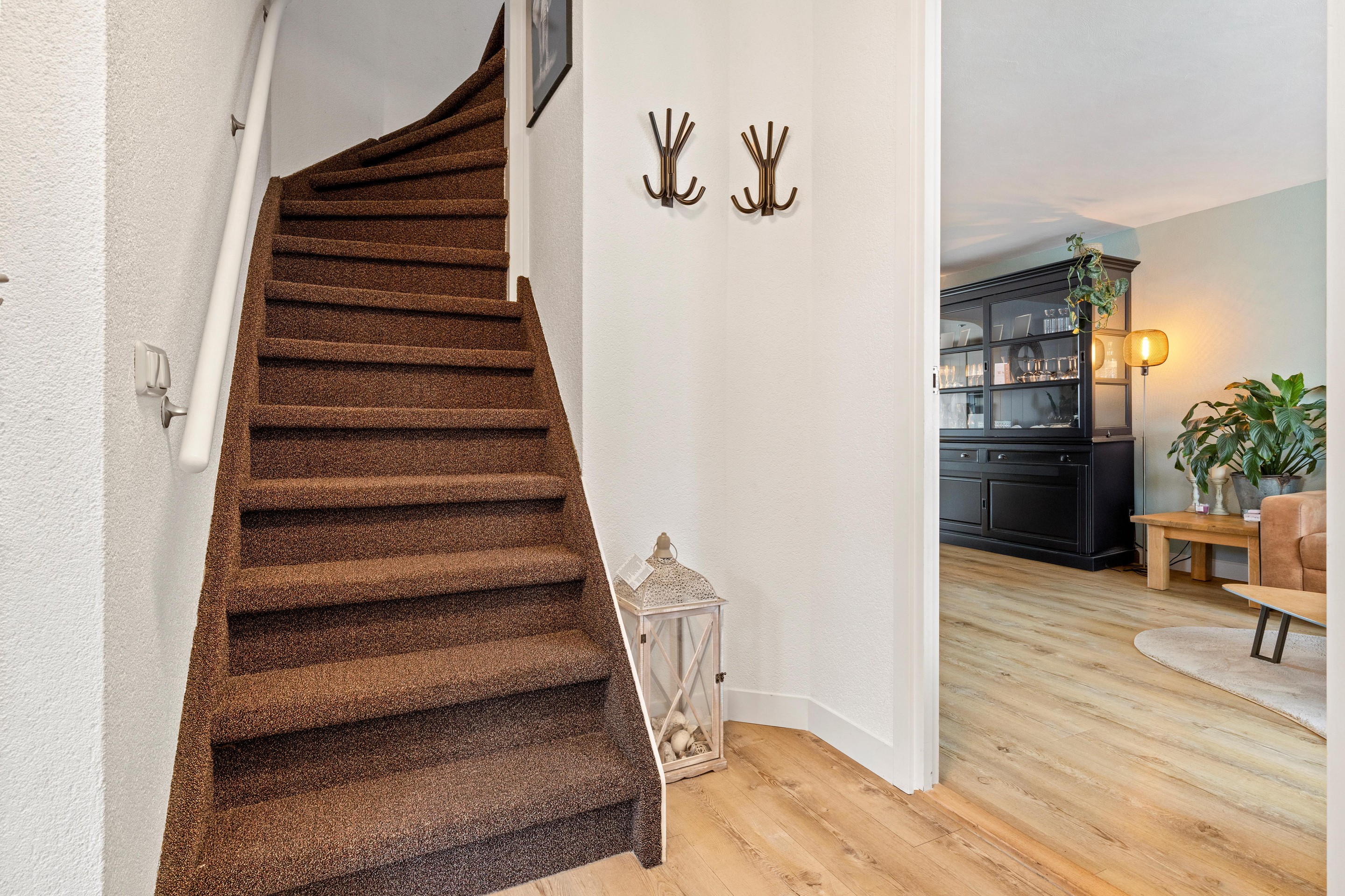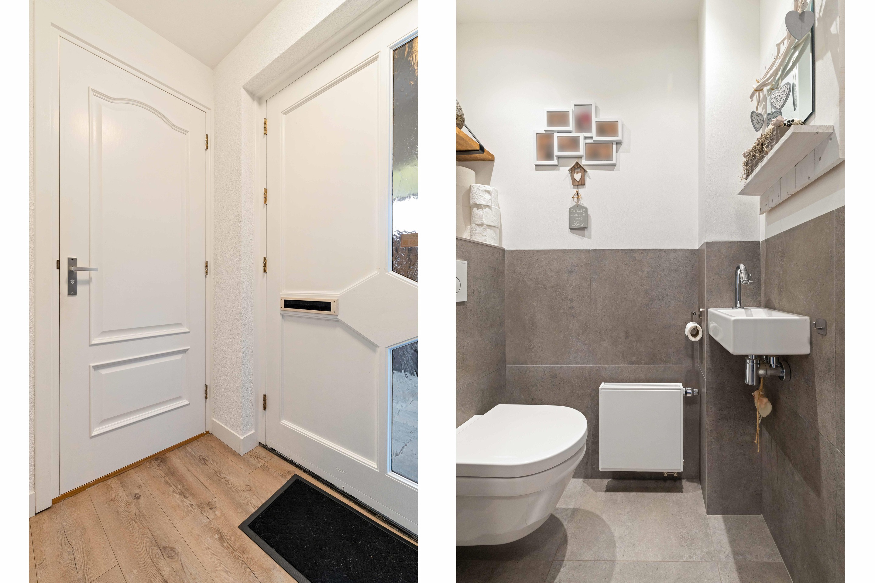 De overdekte entree geeft toegang tot de hal (ca. 6m2) met garderobe, meterkast, trapopgang en de recent vernieuwde toiletruimte. Deze moderne ruimte is deels betegeld en voorzien van een zwevend closet, fontein, radiator en mechanische ventilatie.