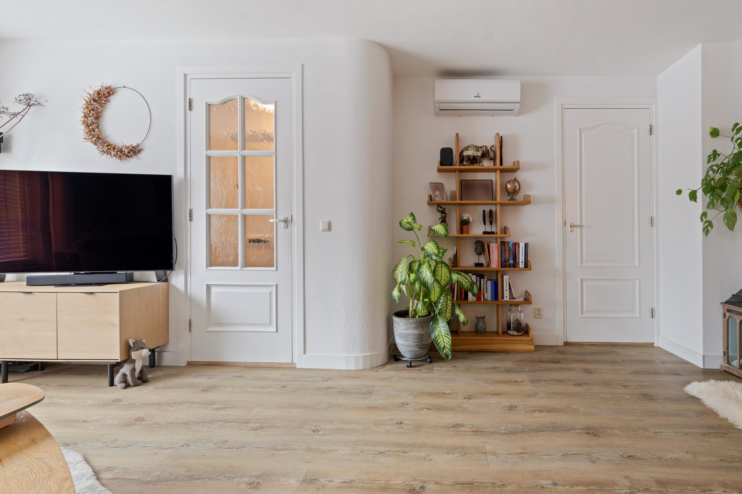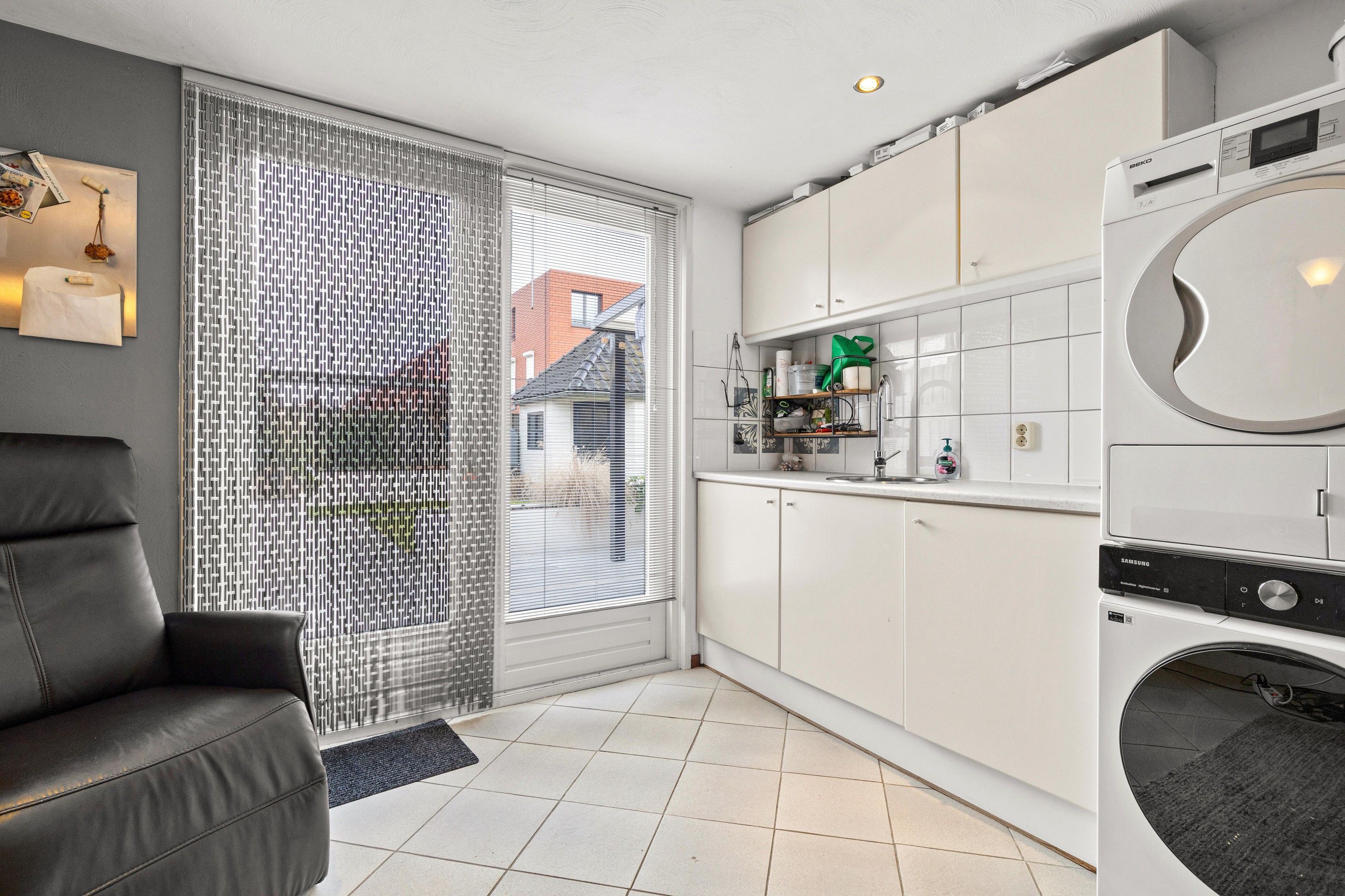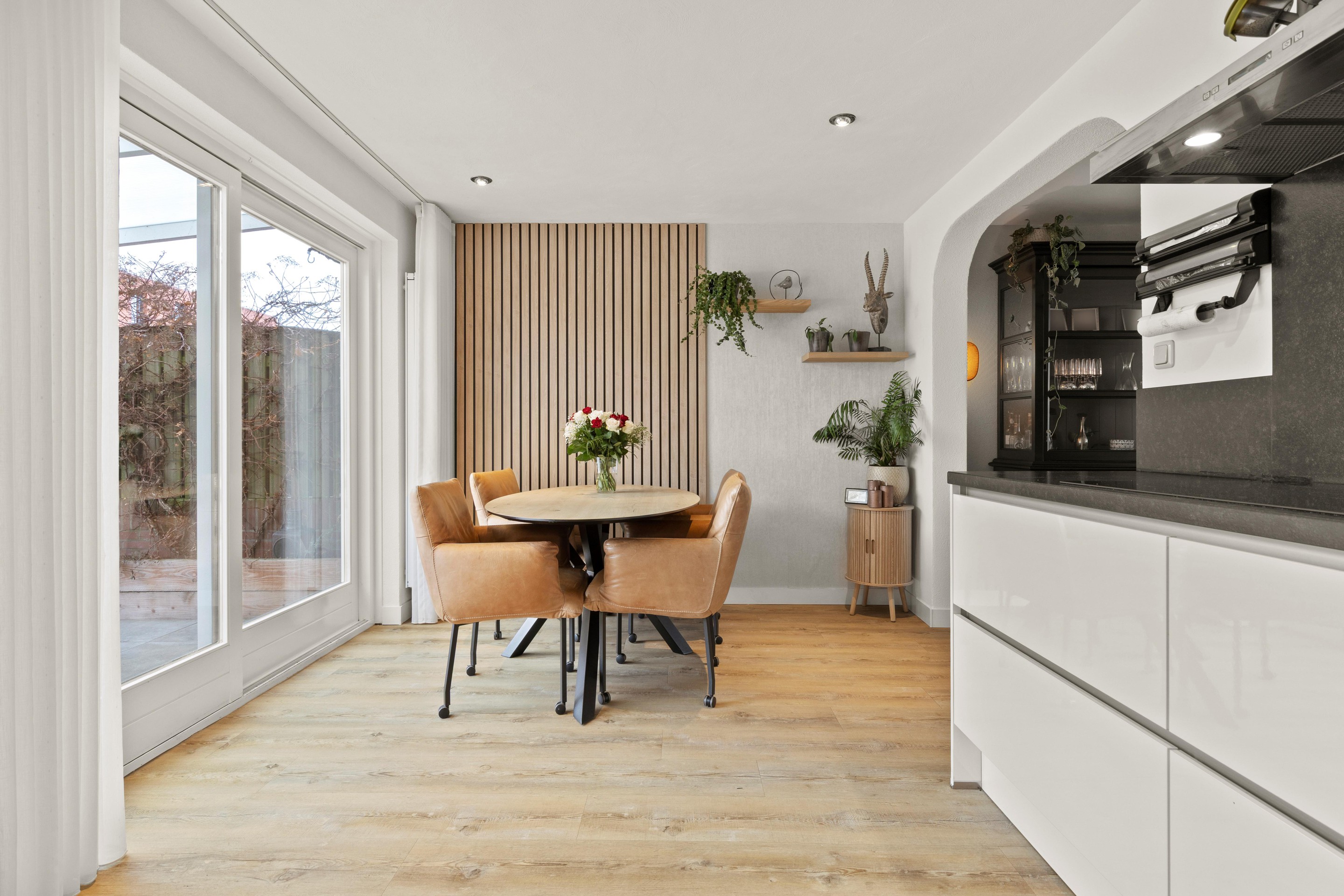 De woonkamer is ruim opgezet (ca. 27m2) met een gezellige zithoek aan de voorzijde en uitzicht op de voortuin. Een airco-unit zorgt hier voor zowel verkoeling als verwarming en het venster is voorzien van een zonnescreen. Aan de achterzijde is de woning over de volledige breedte uitgebouwd, wat resulteert in een royale leefkeuken (ca. 17m2) met veel lichtinval. Grote schuifpuien en een loopdeur verbinden binnen moeiteloos met het overdekte terras.