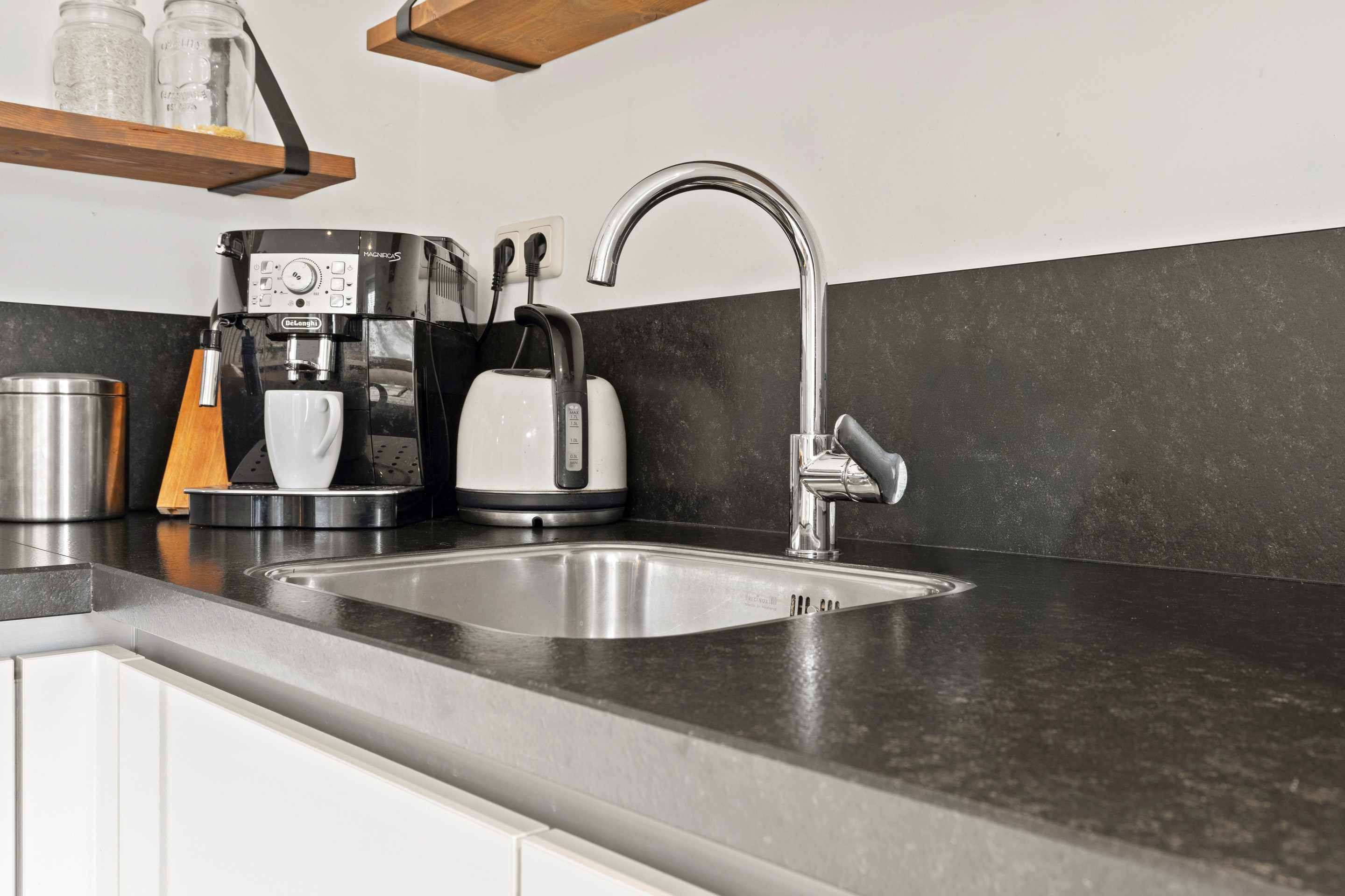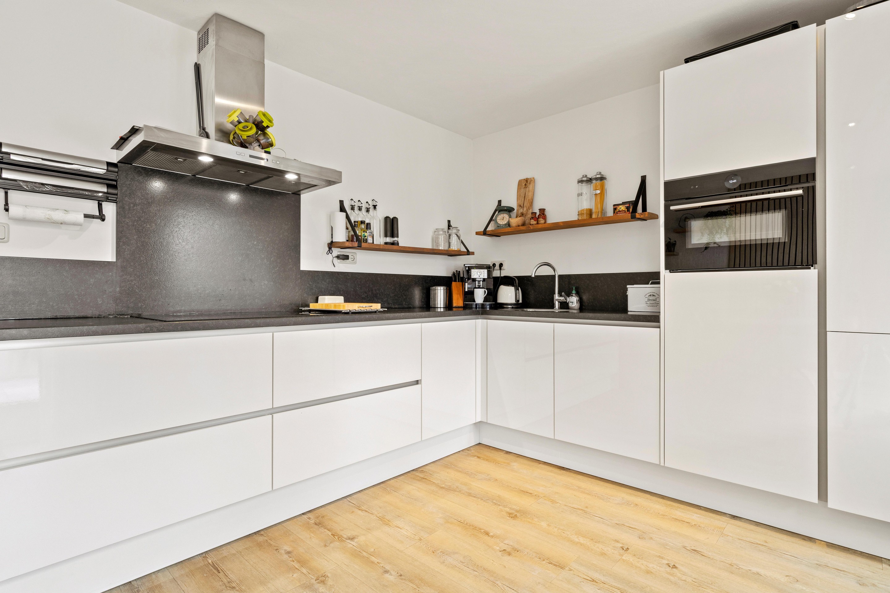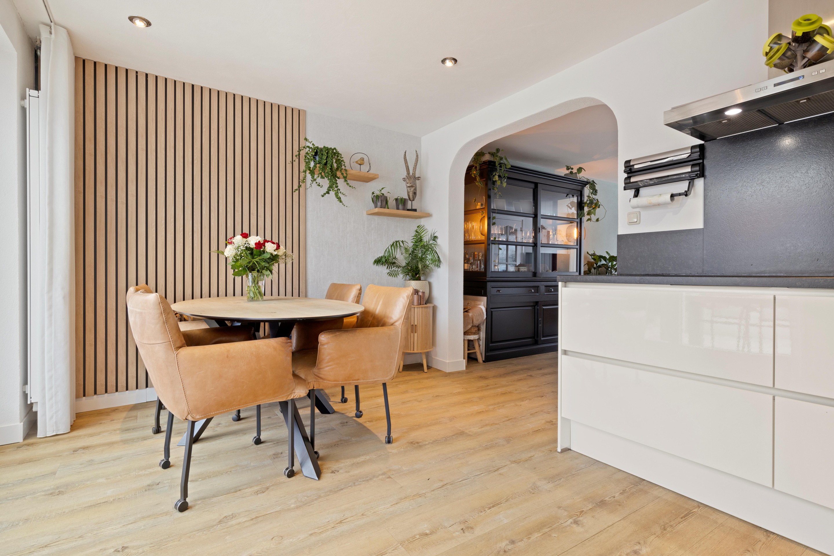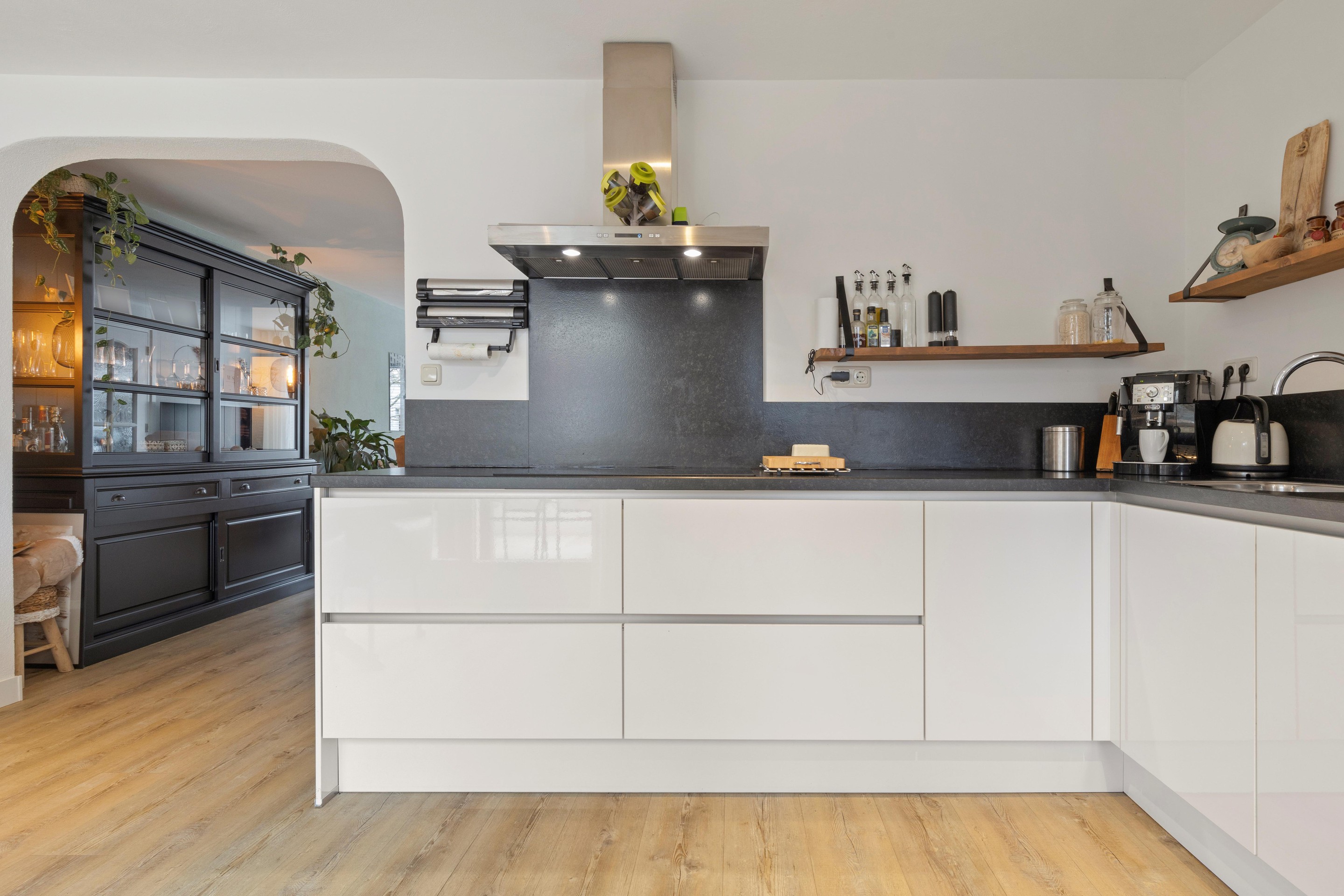 De moderne keuken in hoekopstelling is voorzien van een natuurstenen werkblad en achterwand en beschikt over diverse inbouwapparatuur, waaronder een grote inductiekookplaat (2025), afzuigkap, vaatwasser, hoge koelkast en combi oven-magnetron (2025). Inbouwspots zorgen voor sfeervolle verlichting. De begane grond is afgewerkt met een lichte PVC-vloer in houtlook.