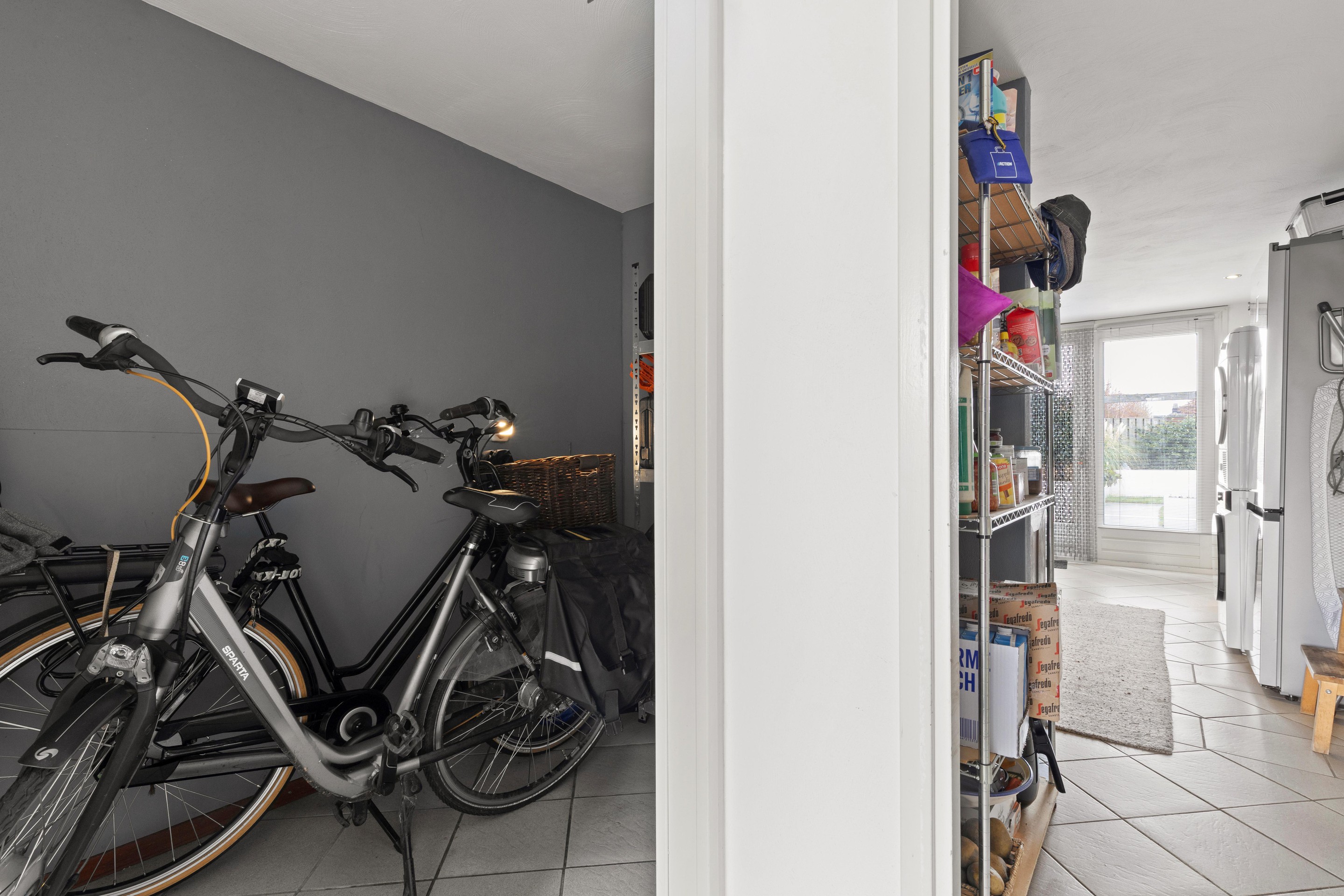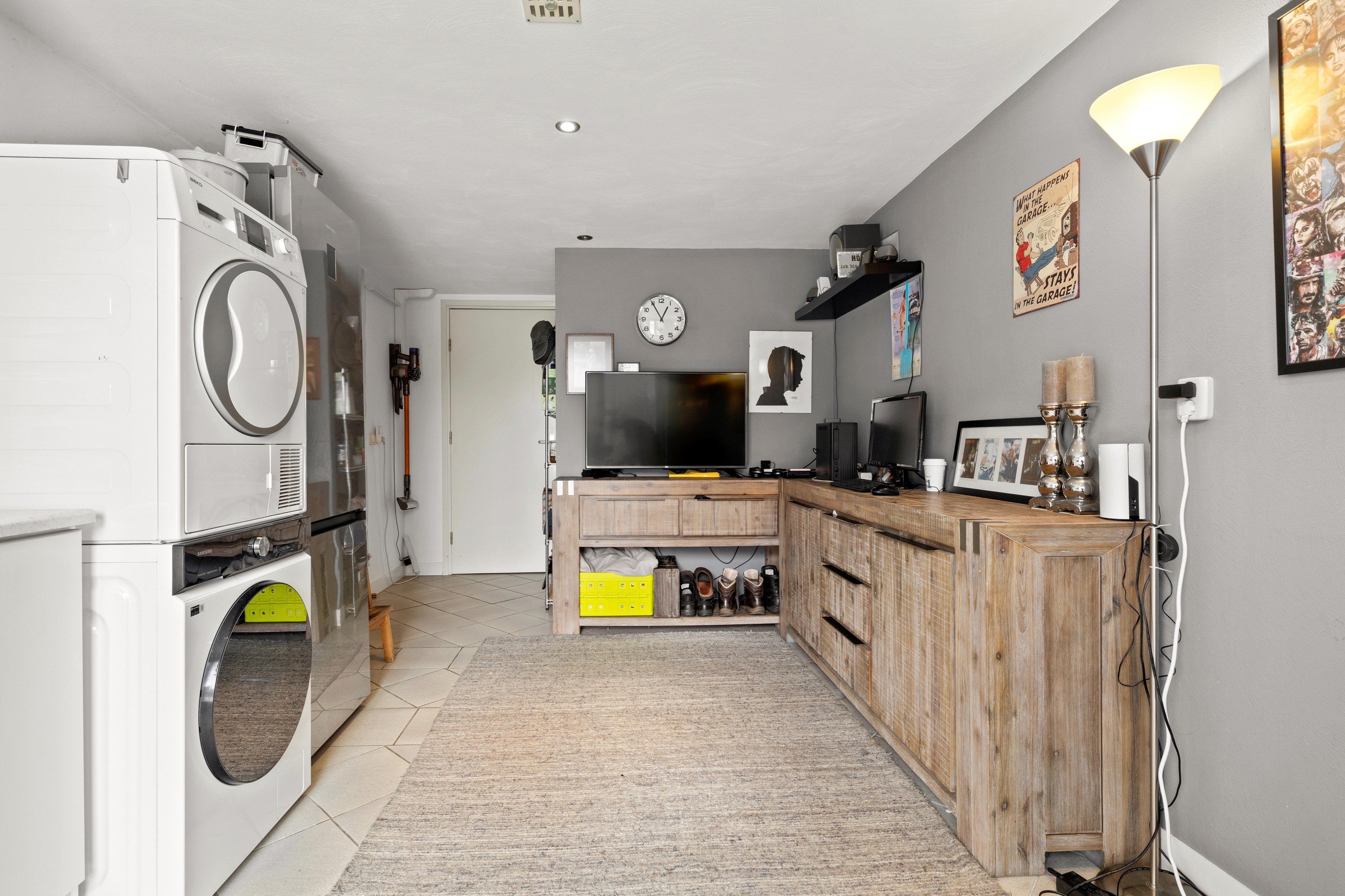 Via een portaal met inbouwkast is de voormalige garage bereikbaar. Deze is opgesplitst in een praktische berging voor fietsen en tuingereedschap (ca. 6m2) met dubbele deuren naar de oprit, en een volledig geïsoleerde en afgewerkte multifunctionele ruimte. Deze ruimte (ca. 16m2) beschikt over openslaande tuindeuren, een pantry met wateraansluiting en kastruimte, aansluitingen voor wasmachine en droger en inbouwspots. Ideaal als praktijkruimte, kantoor aan huis of hobbyruimte.