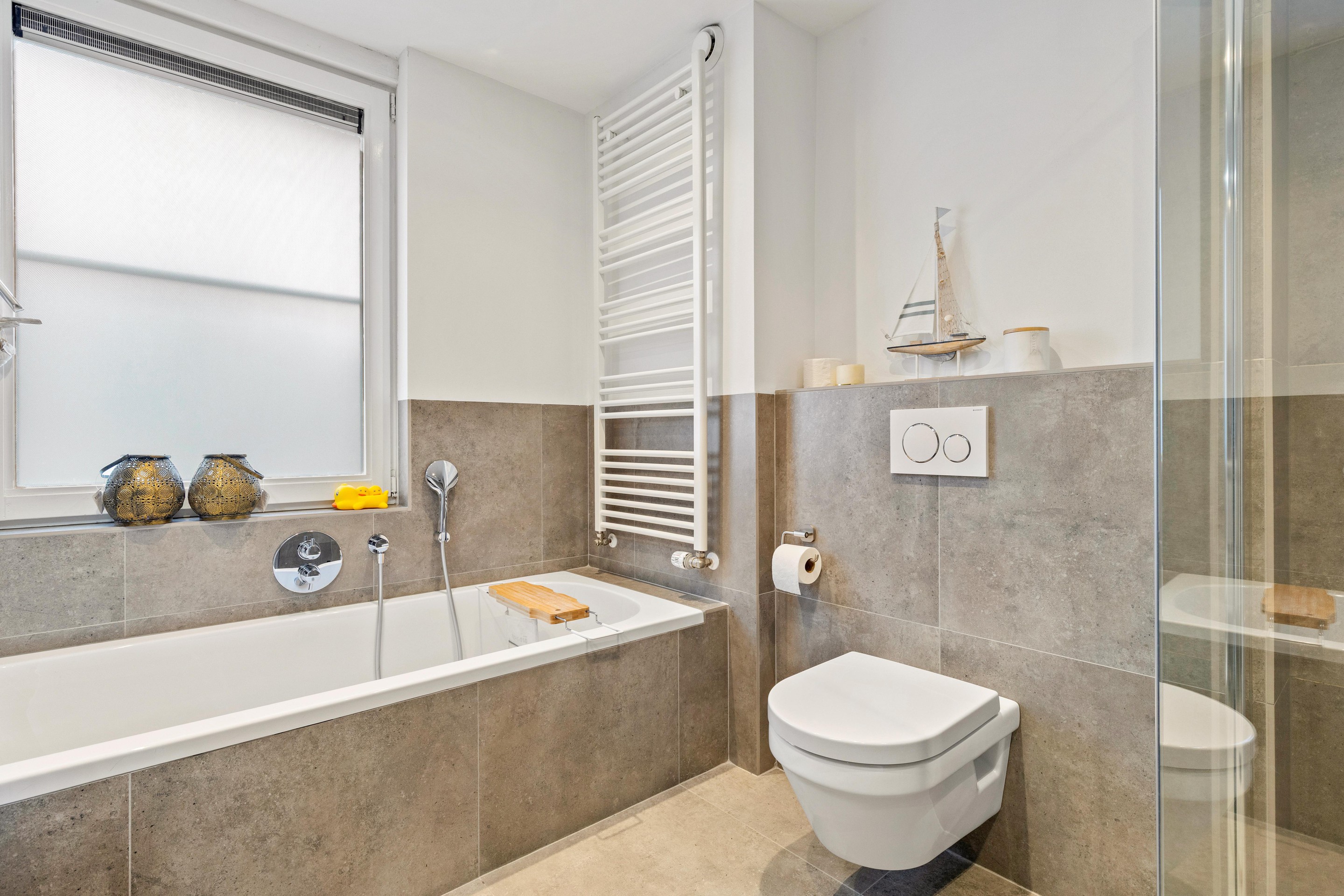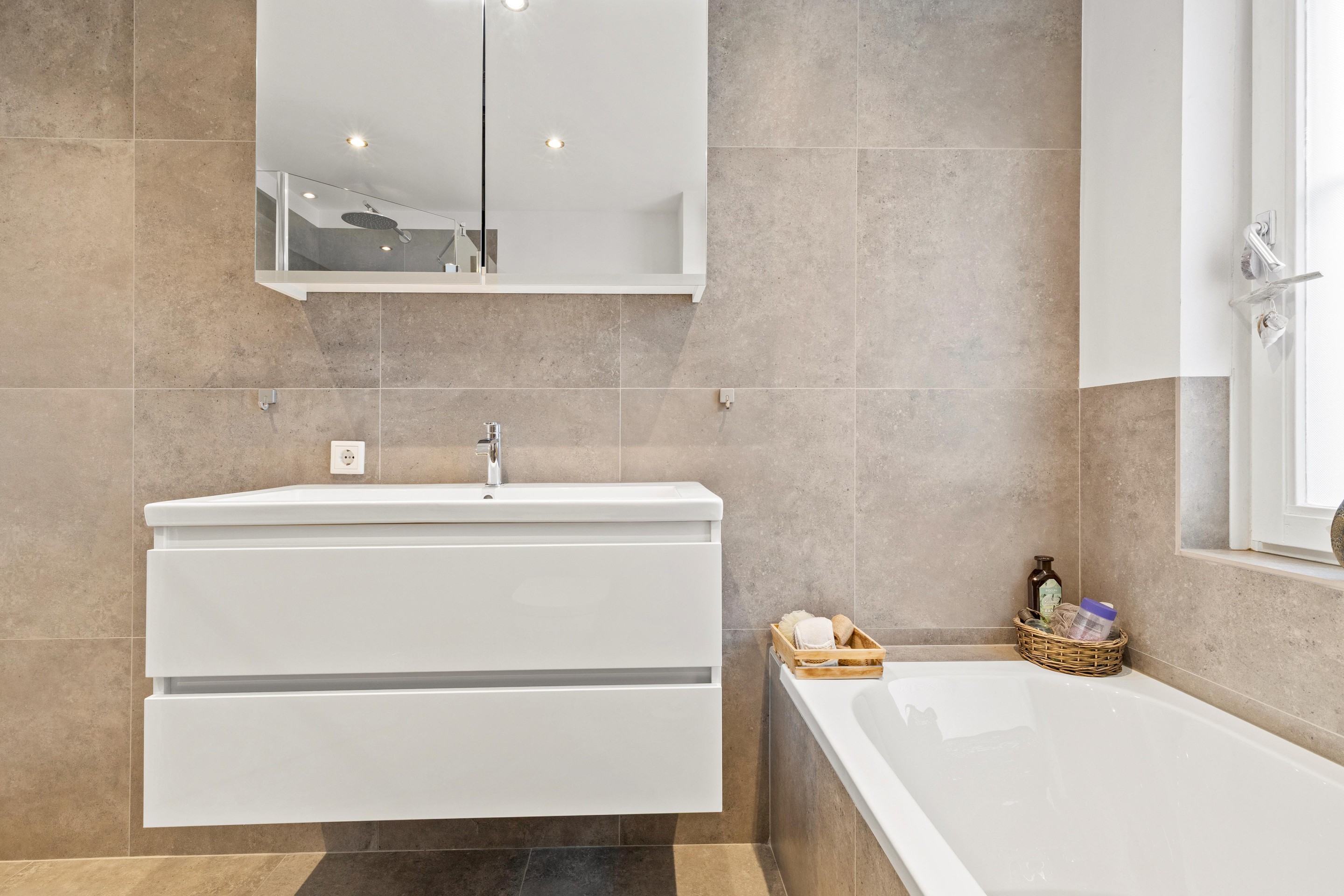 De recent vernieuwde badkamer (ca. 6,5m2) is modern en luxe uitgevoerd met een extra brede wastafel met ladekast en spiegelkast, zwevend toilet, ligbad, inloopdouche met inbouwkraan en regendouche, designradiator, inbouwspots, een groot raam voor daglicht en mechanische ventilatie.