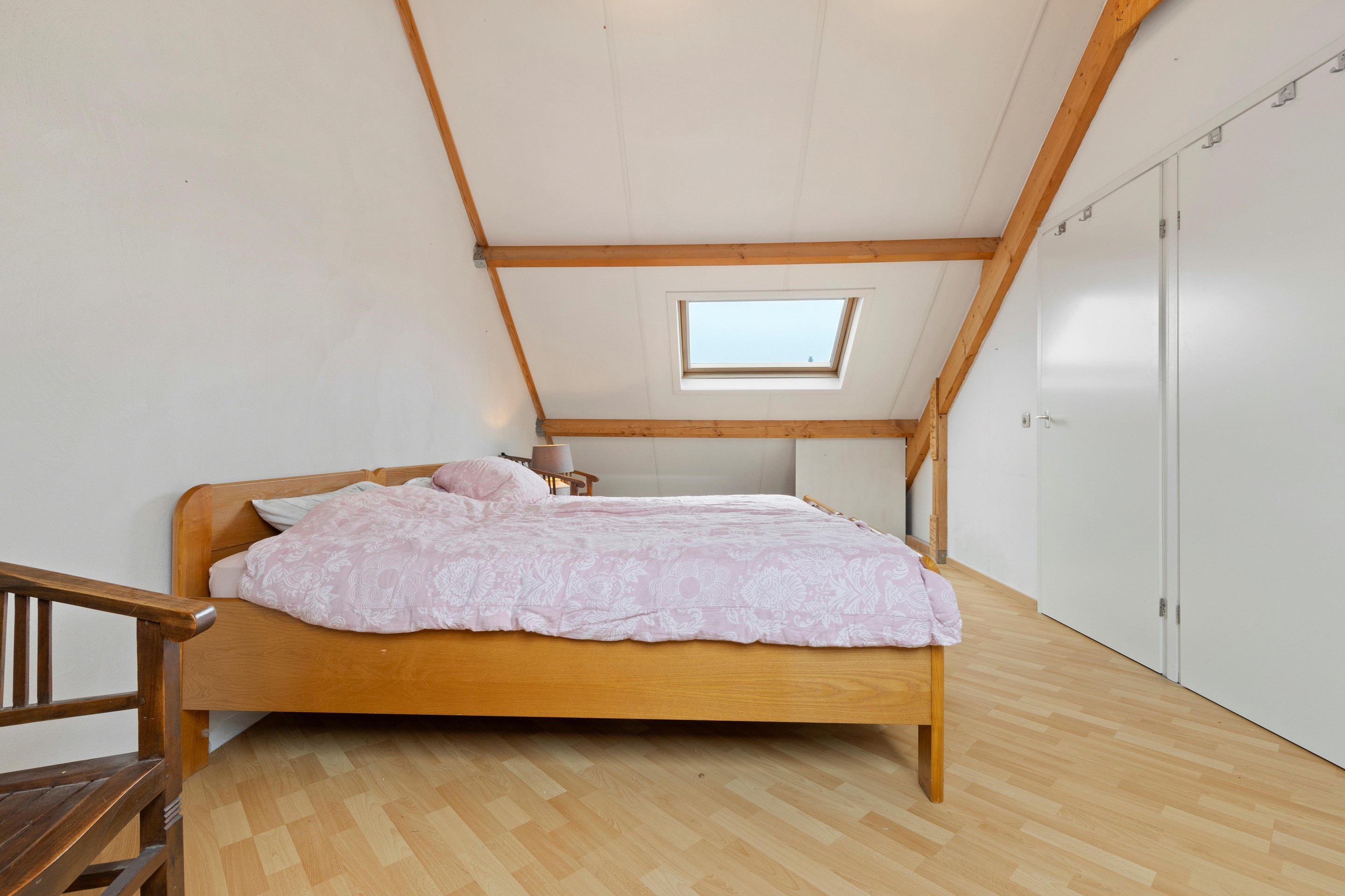 De ruime vierde slaapkamer (ca. 15m2) is voorzien van dakramen aan beide zijden en praktische bergruimte achter de knieschotten. Deze kamer is desgewenst op te splitsen in twee kamers. De gehele verdieping is afgewerkt met een lichte laminaatvloer.