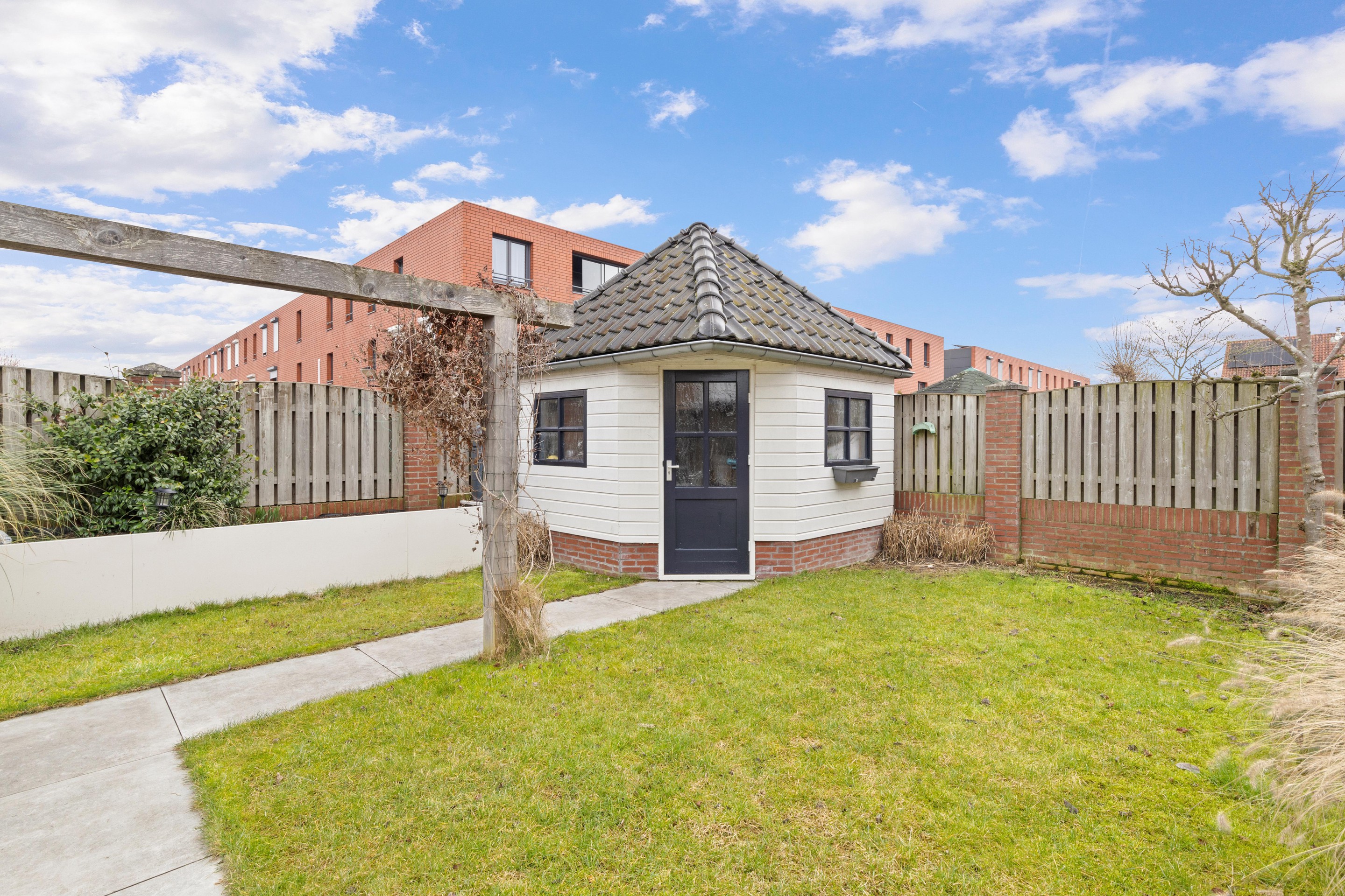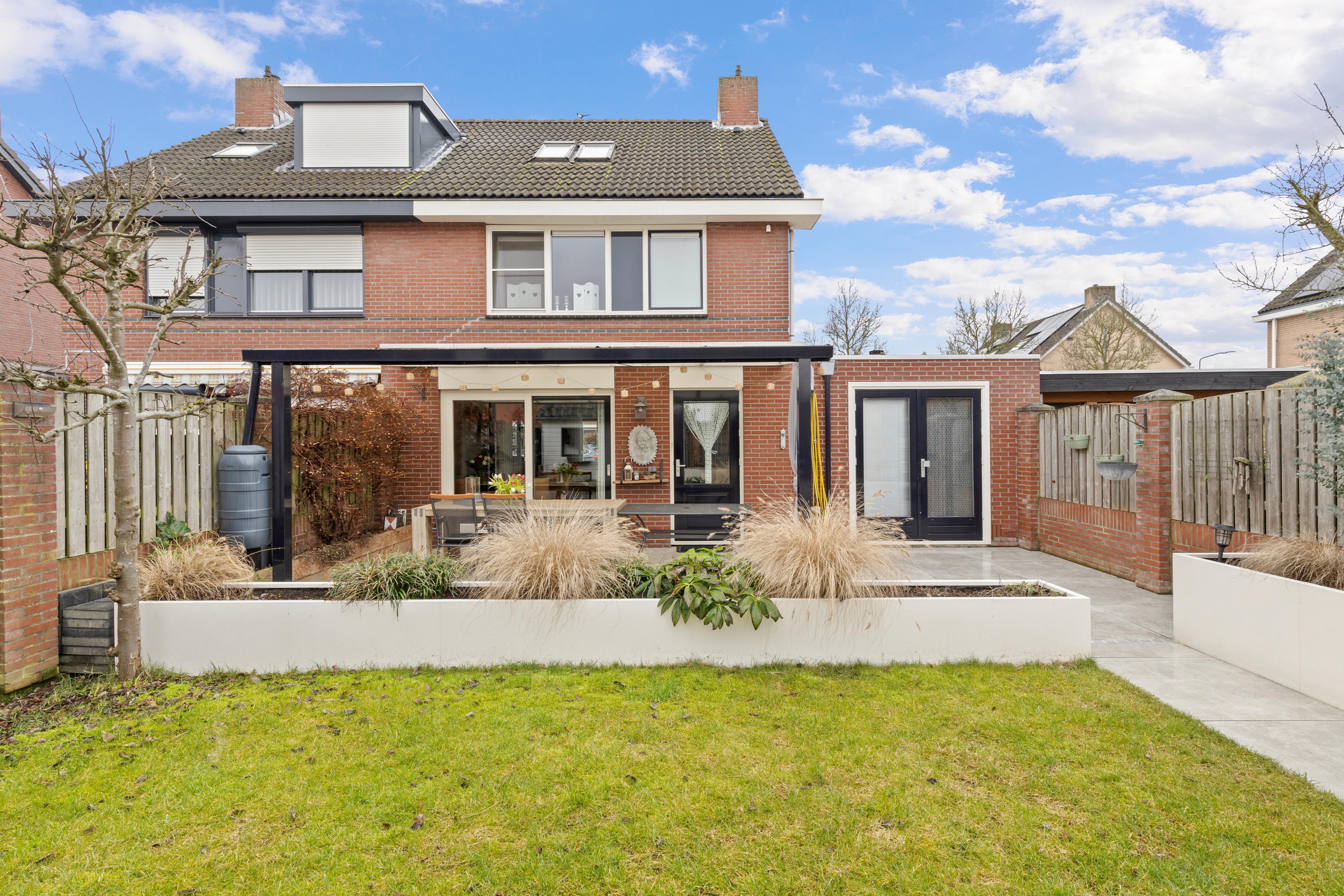 De recent opnieuw aangelegde achtertuin is een heerlijke, onderhoudsvriendelijke buitenruimte. Over de volledige breedte ligt een terras met grote keramische tegels. Witte plantenbakken met siergrassen en diverse beplanting zorgen voor een moderne uitstraling. In de zomer is de tuin rijk begroeid met onder andere een appelboom, druif, eucalyptus en pampasgras. Achterin staat een ruim houten tuinhuis (ca.8m2) met pannendak en vliering, ideaal voor extra opslag. De tuin is professioneel aangelegd door een hoveniersbedrijf.