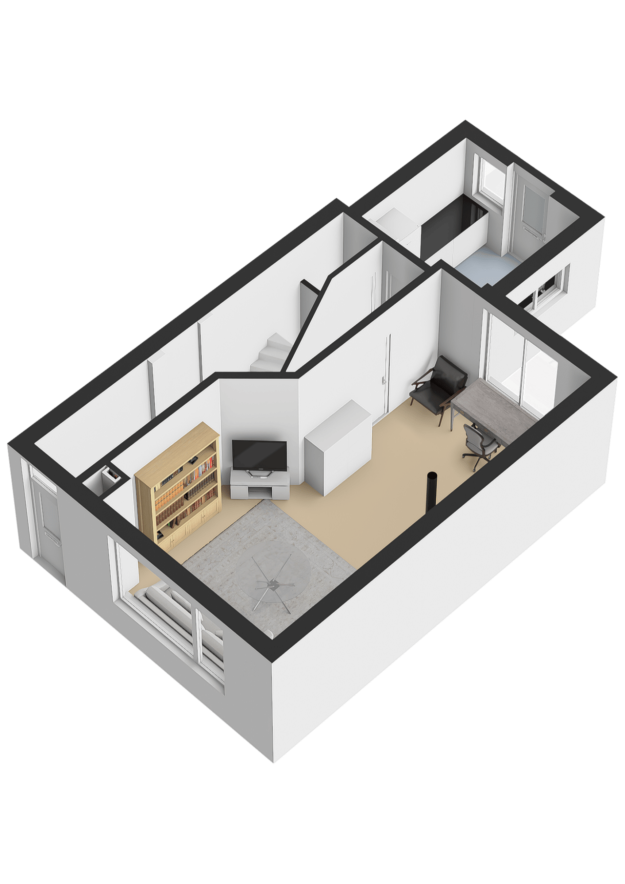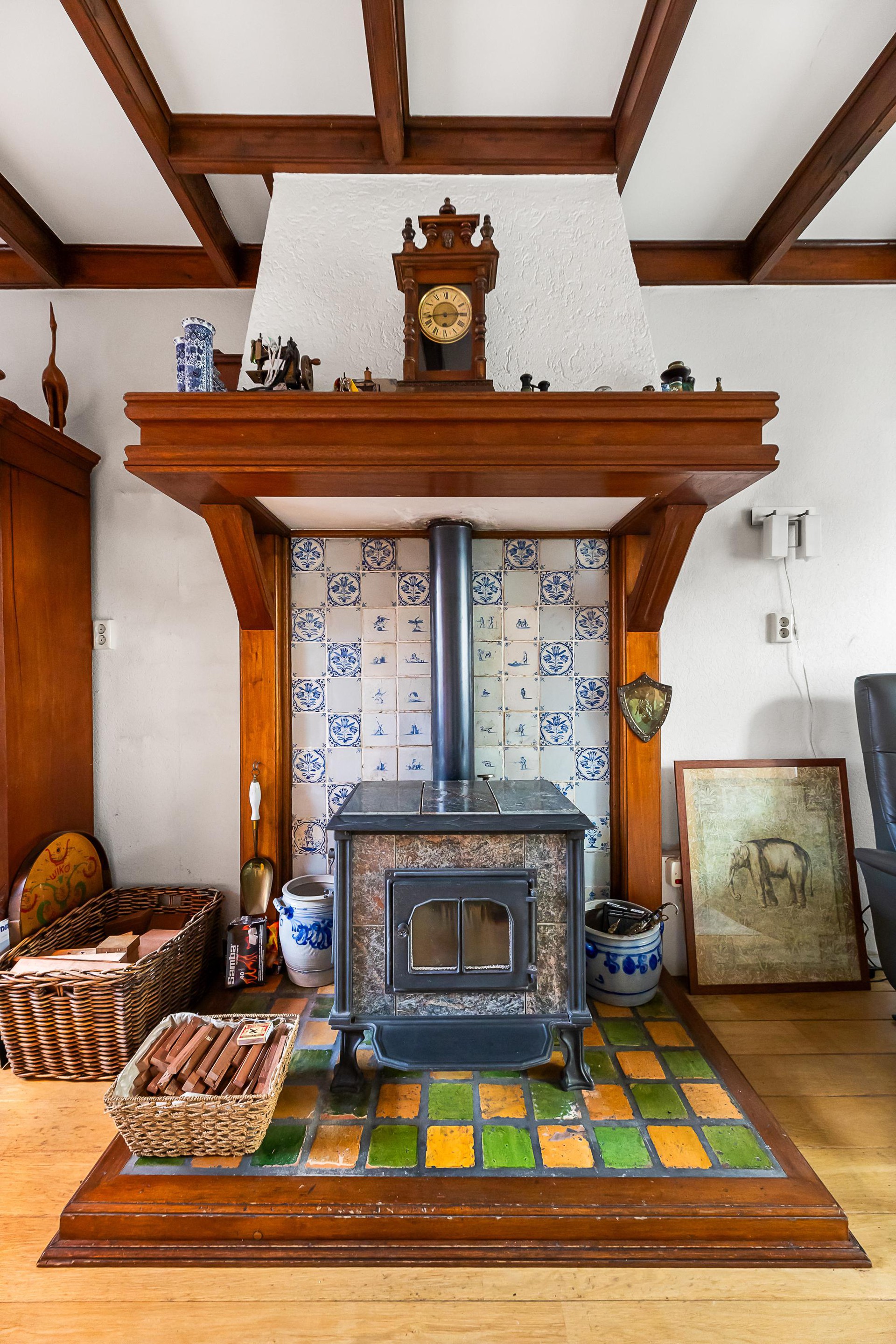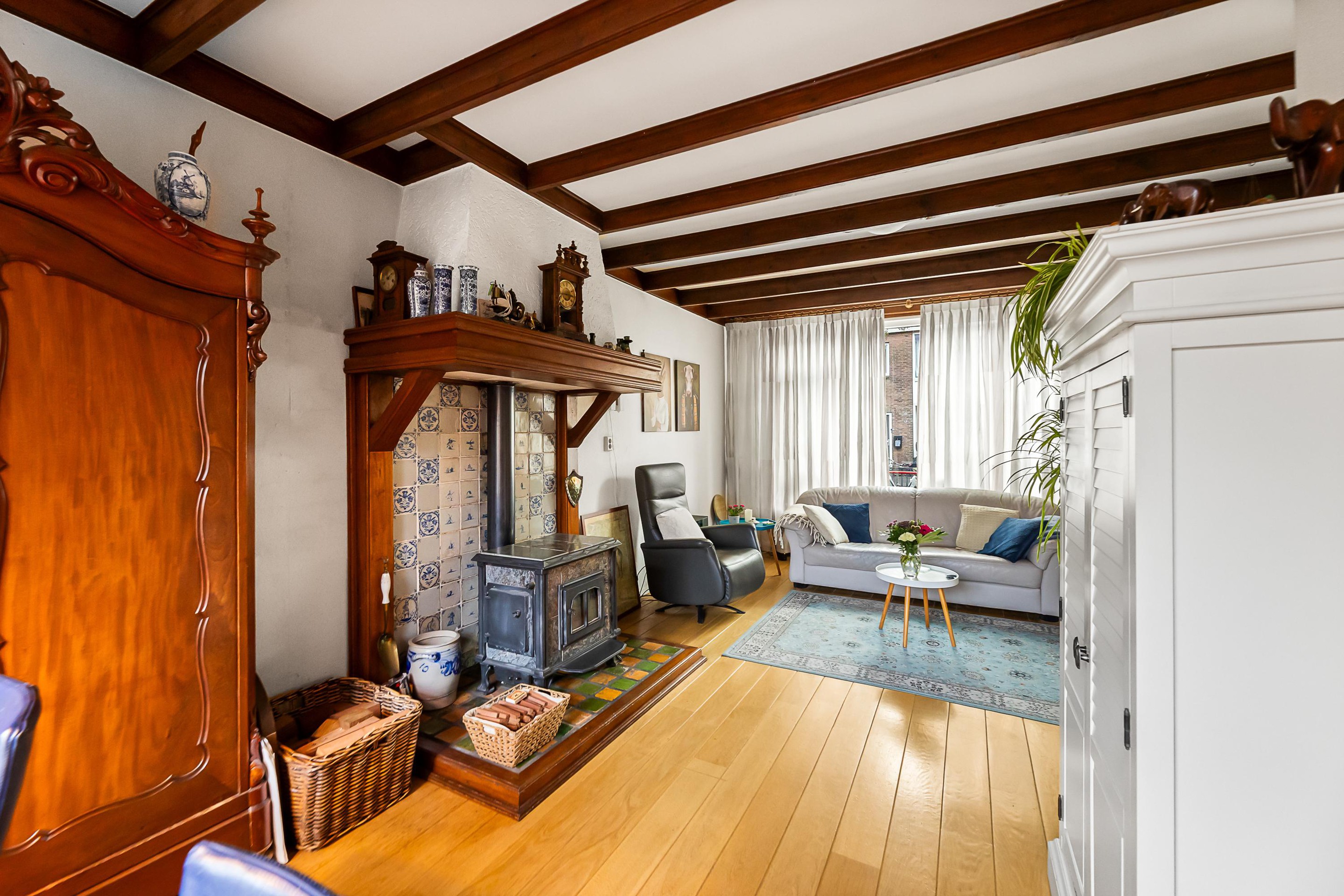 Begane grond Hal met trapopgang en toilet. De woonkamer met houtkachel heeft lekker veel licht door de grote ramen. De dichte keuken, geplaatst in de uitbouw, is eenvoudig van uitvoering en geeft toegang tot de achtertuin.