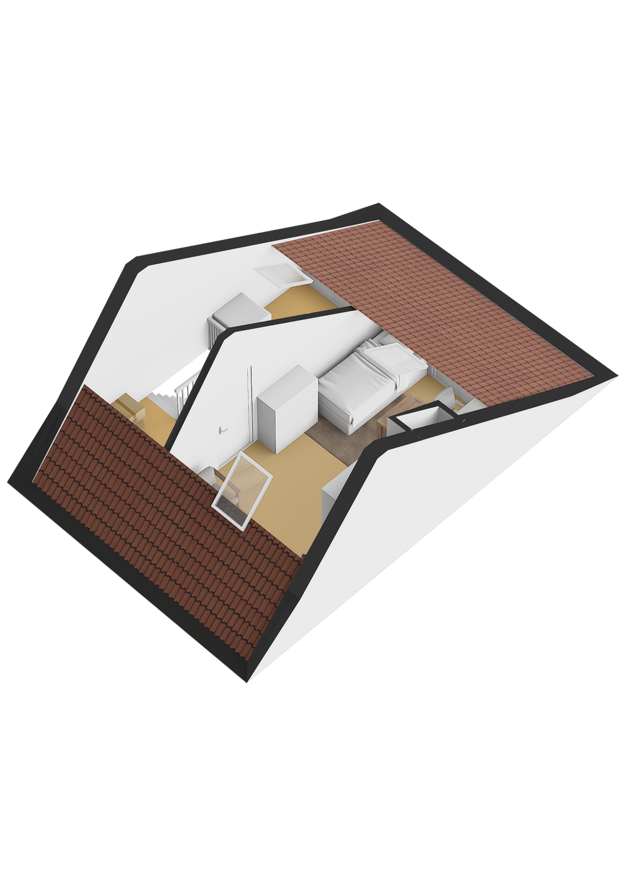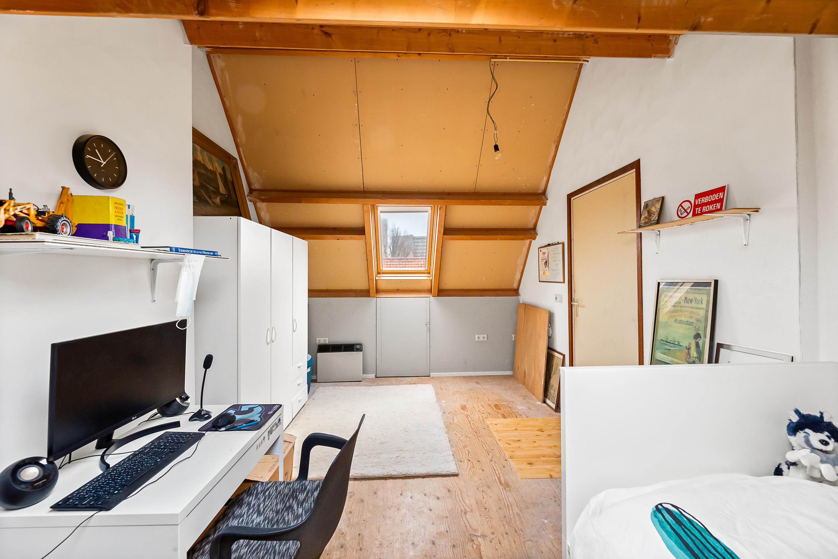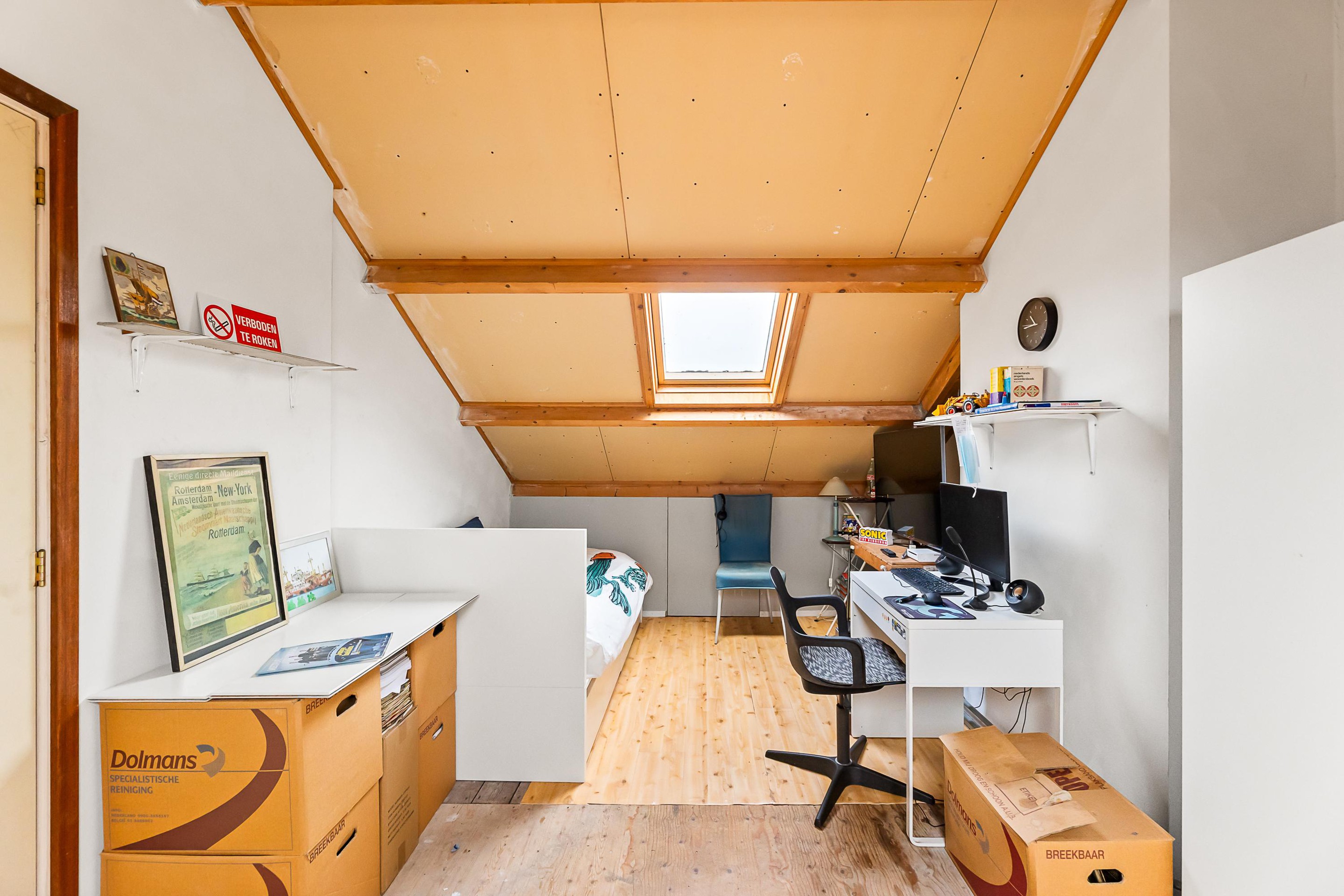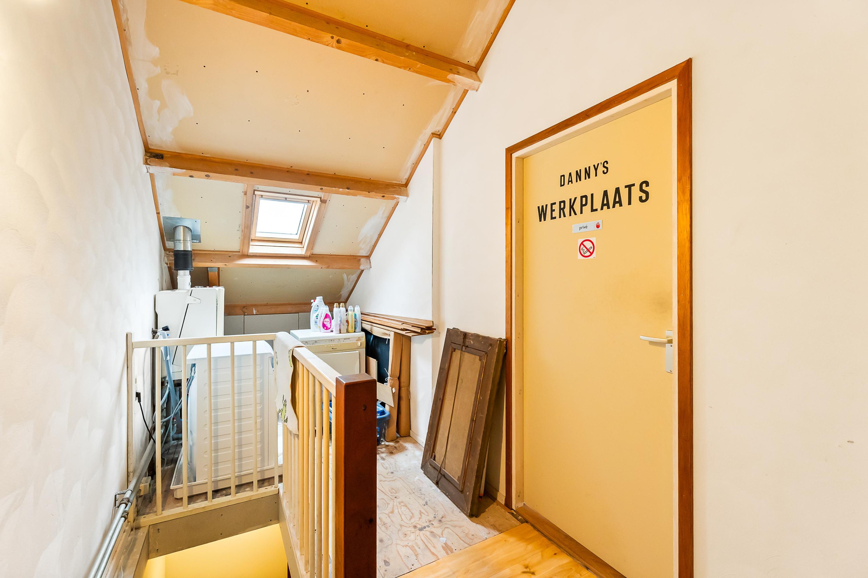 Tweede verdieping Te bereiken met een vaste trap. Overloop met opstelling van de c.v.-installatie en de aansluiting voor het witgoed. Er is een verrassende zolderkamer met twee Veluxramen.
