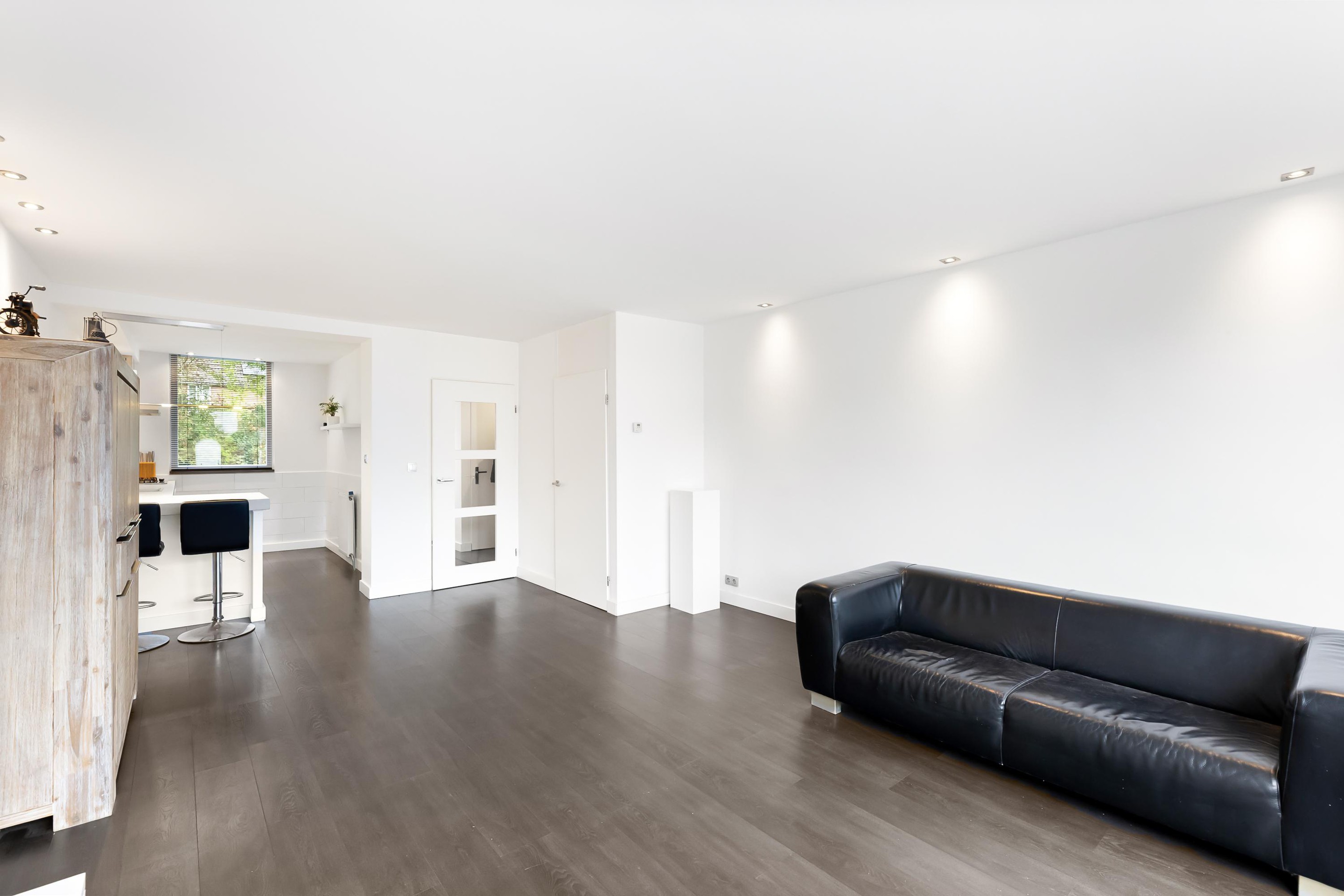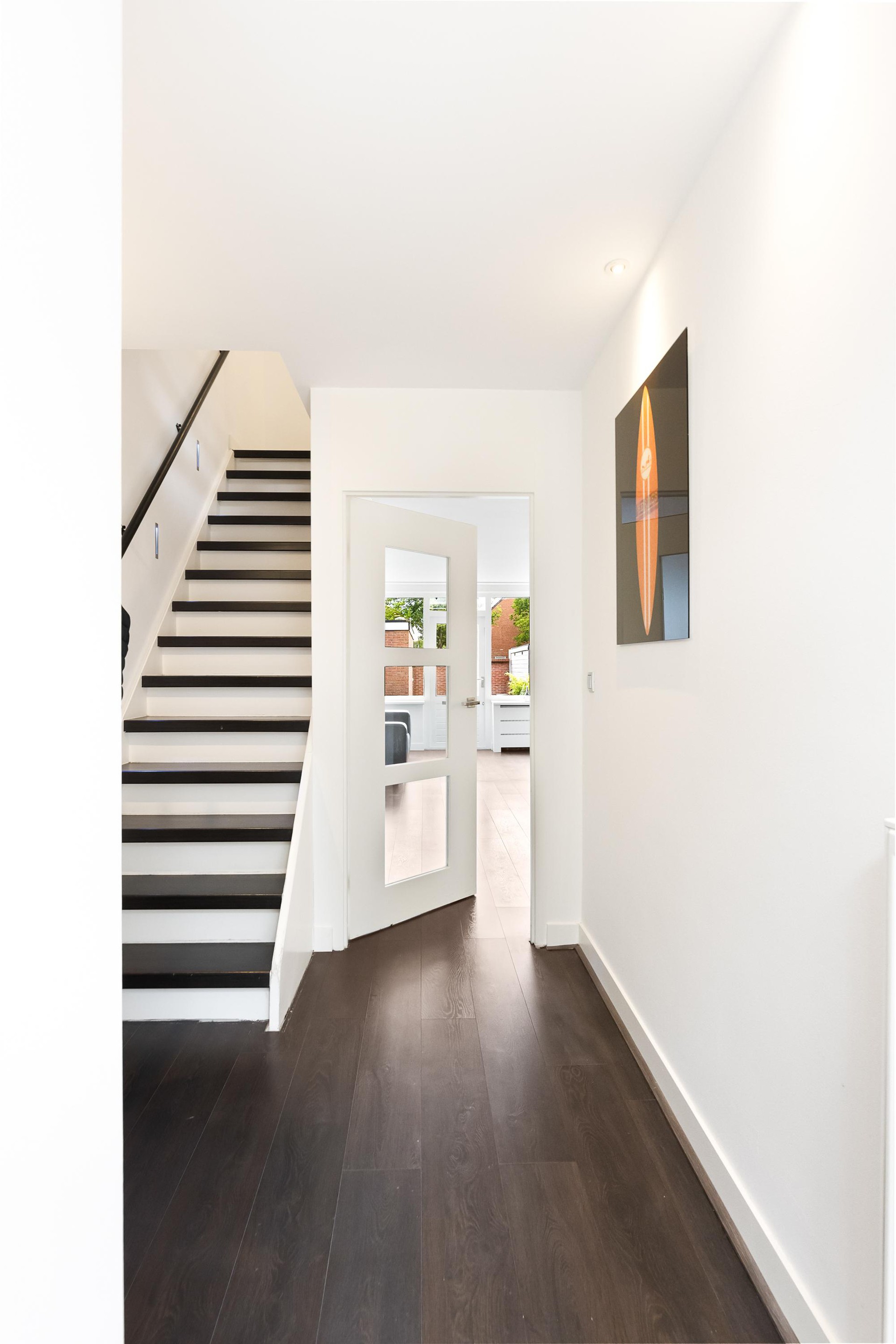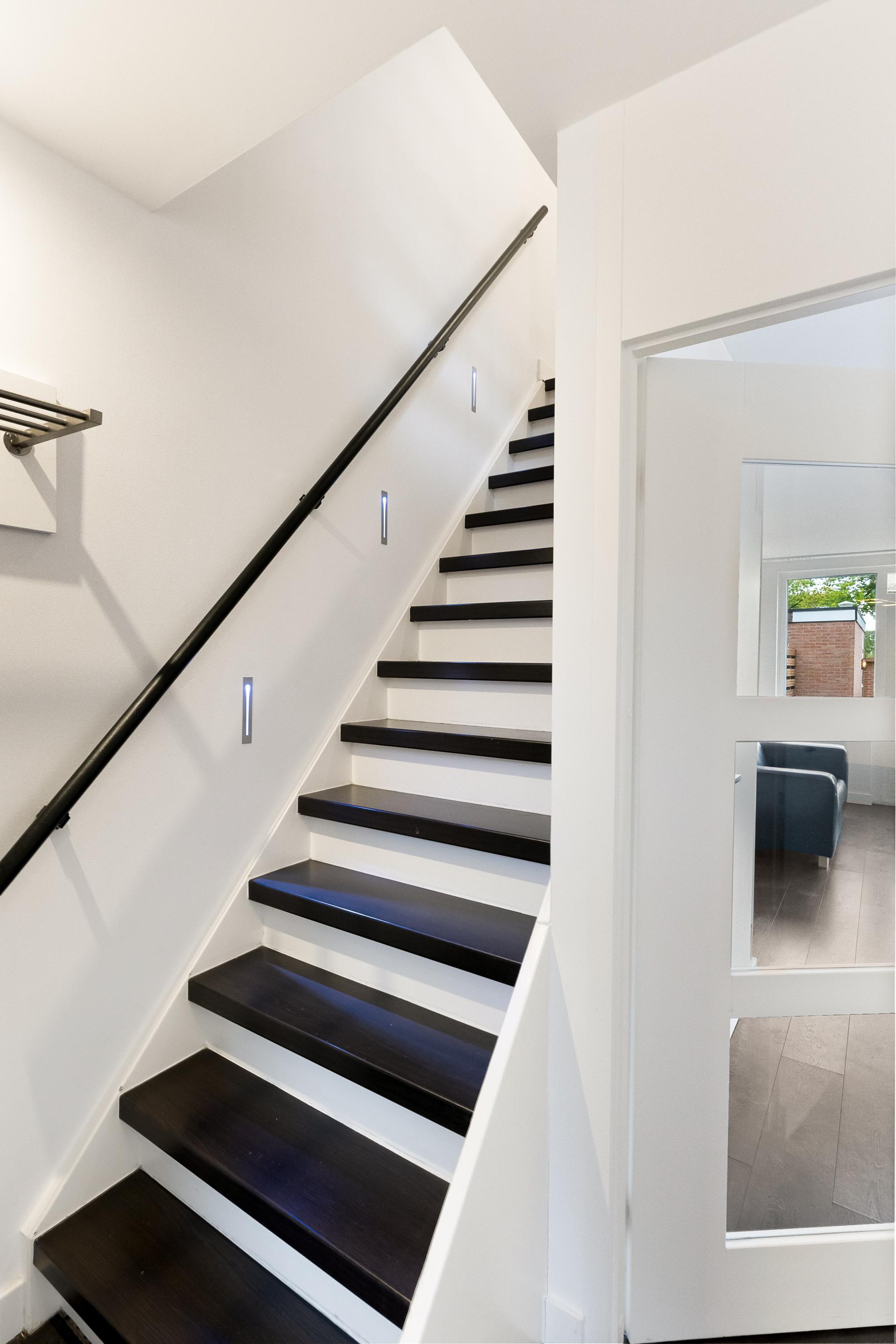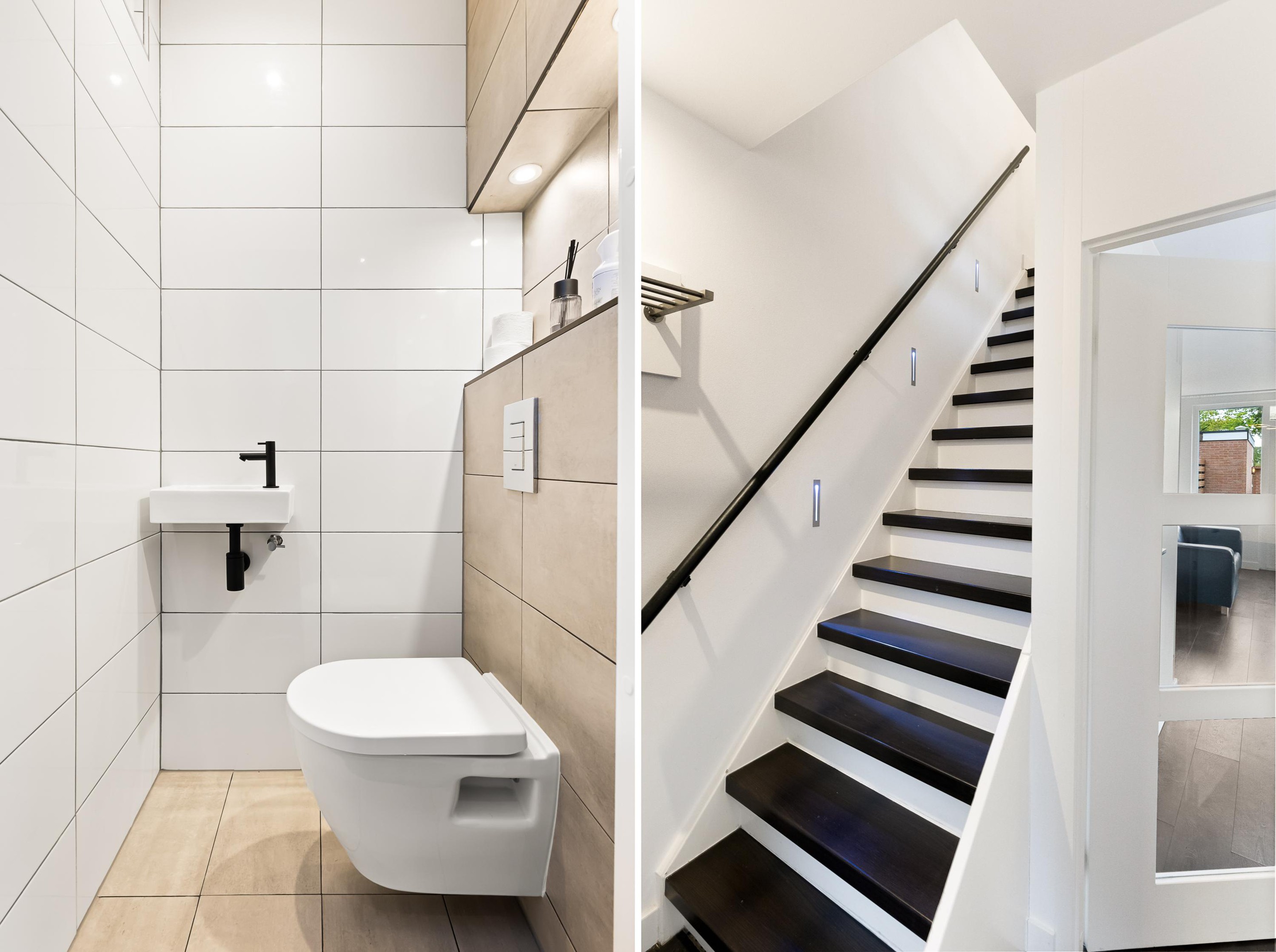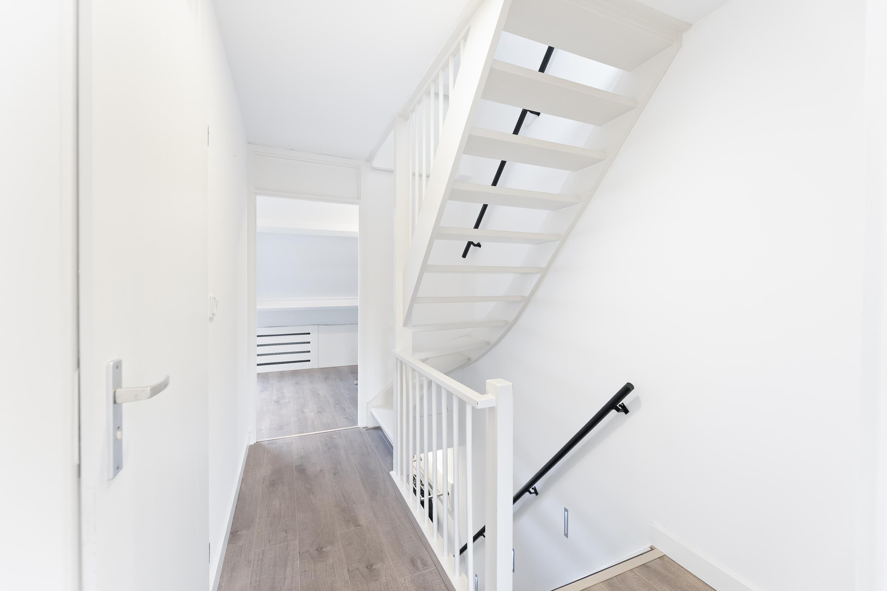 Entree met hal, toilet en de trapopgang naar de eerste verdieping. De lichte woonkamer is tuingericht en voorzien van toegang tot de achtertuin. Teven treft u hier de praktische trapkast. De open keuken met barretje is modern afgewerkt met een gaskookplaat, afzuigkap, koelkast en betonnen werkblad.