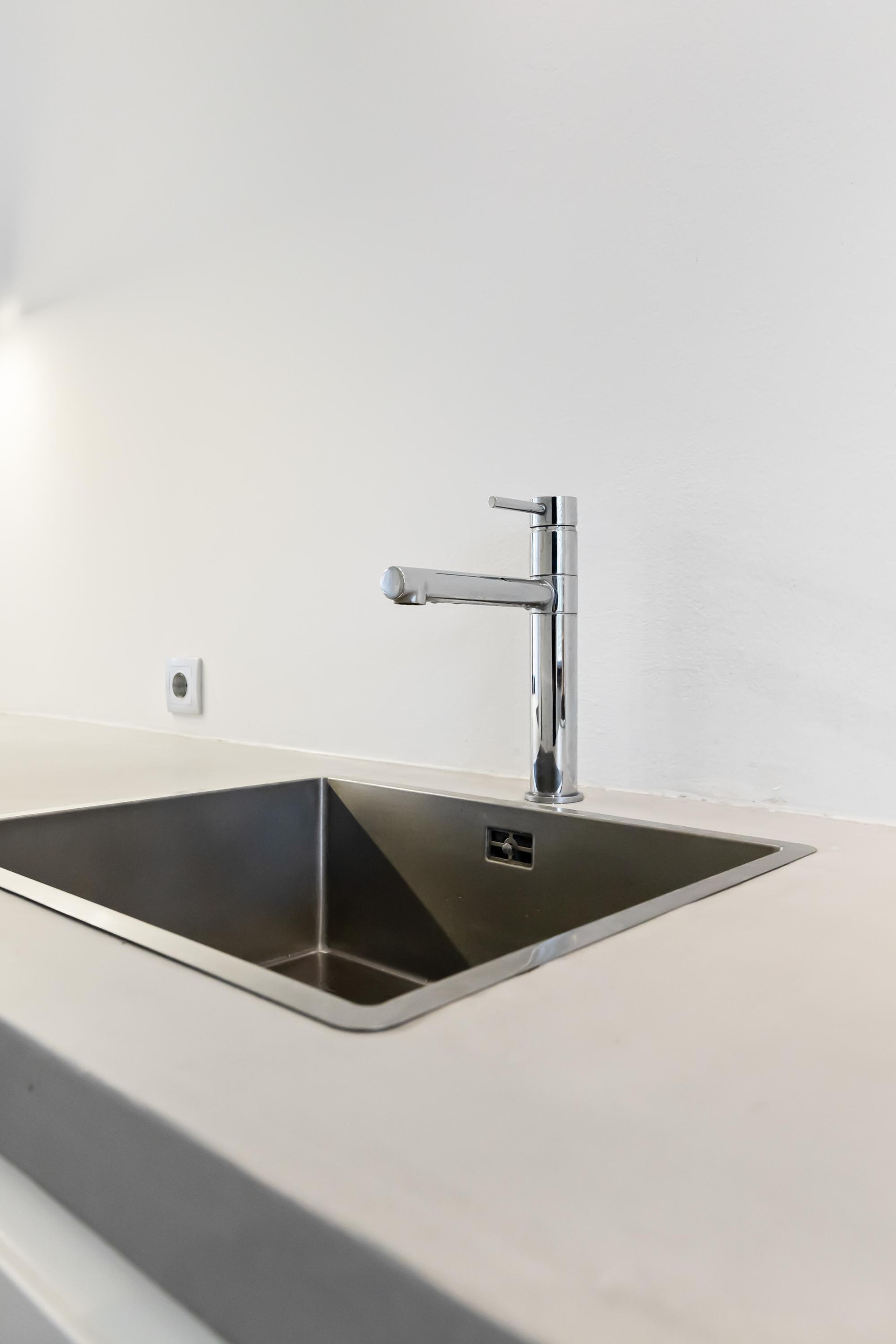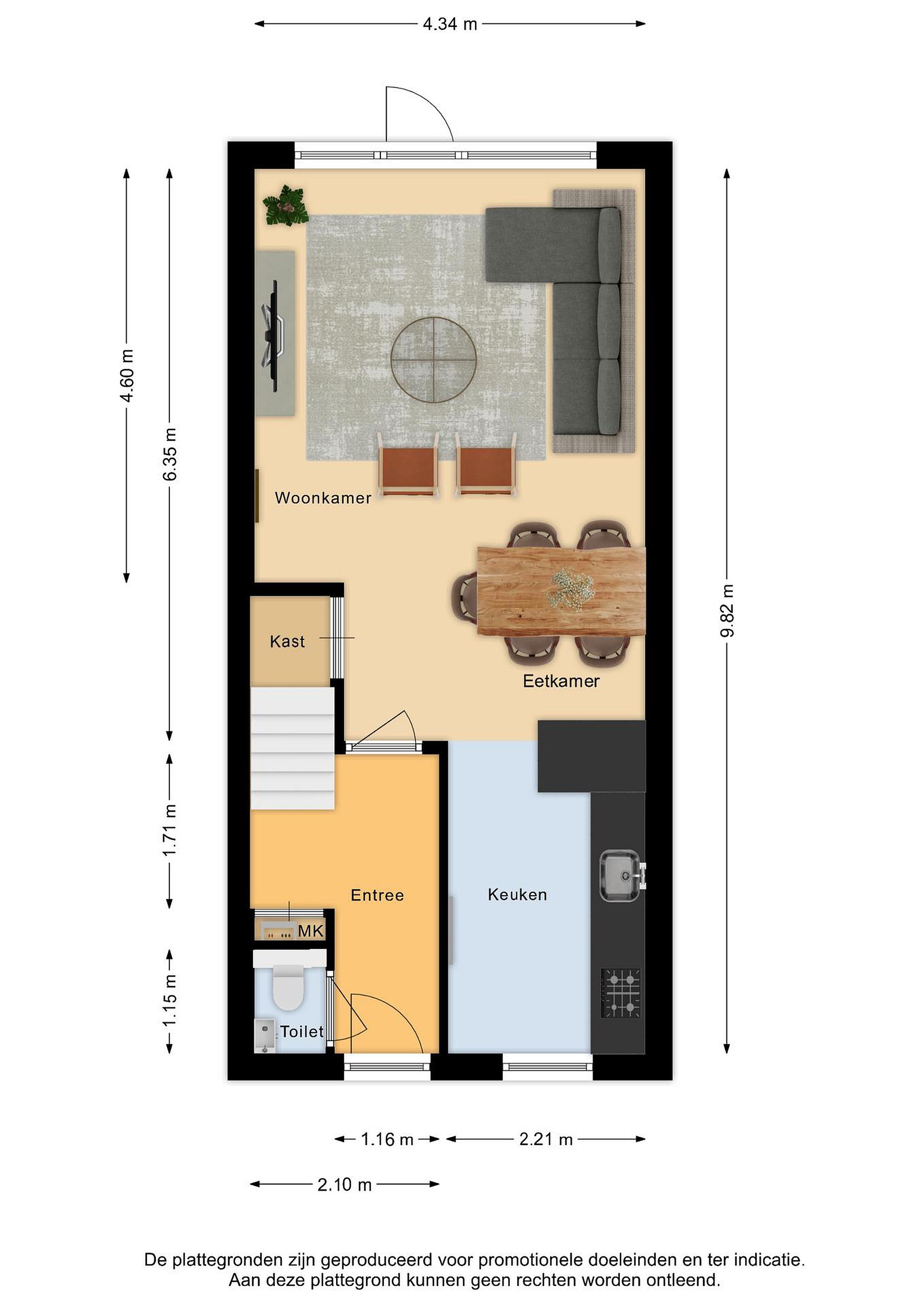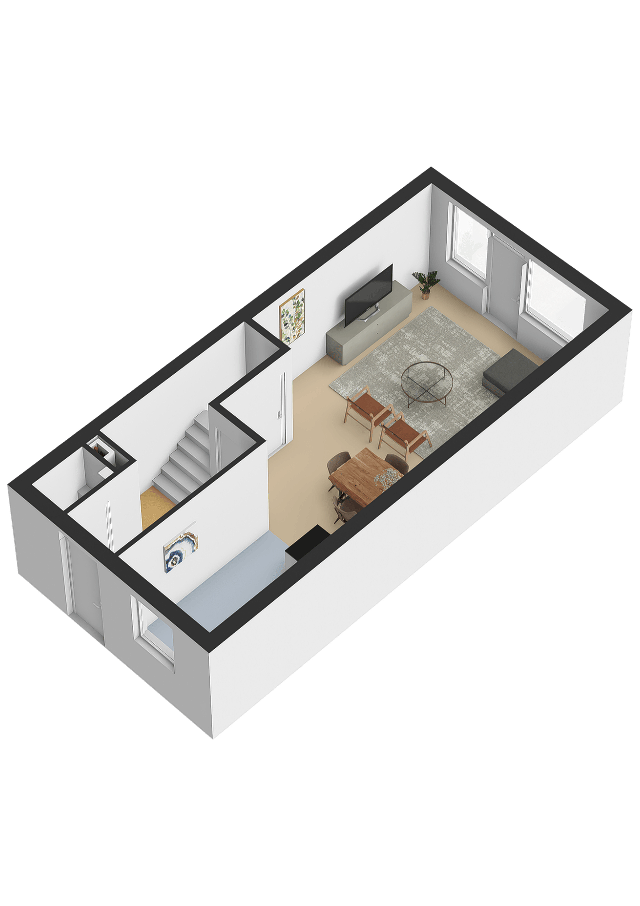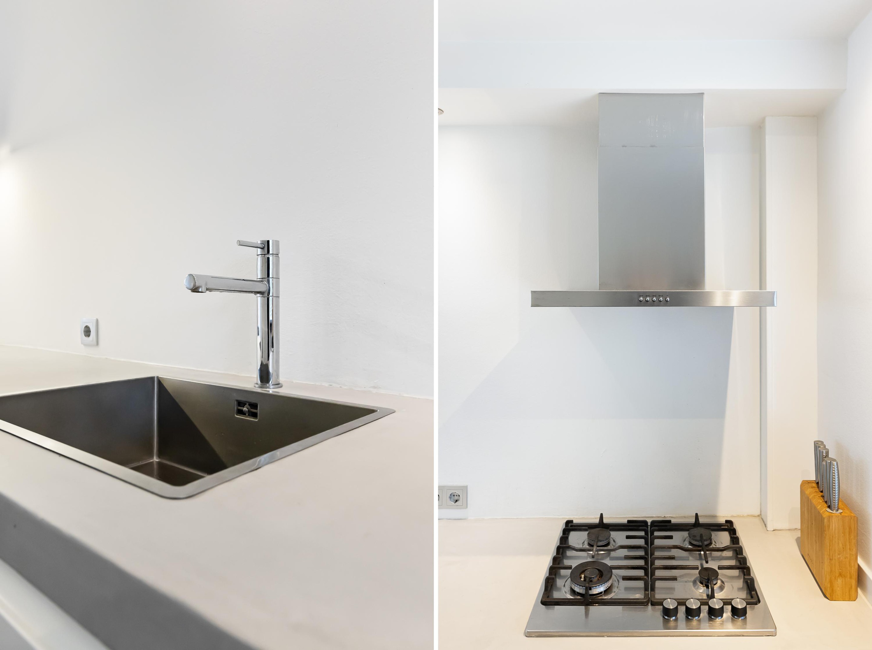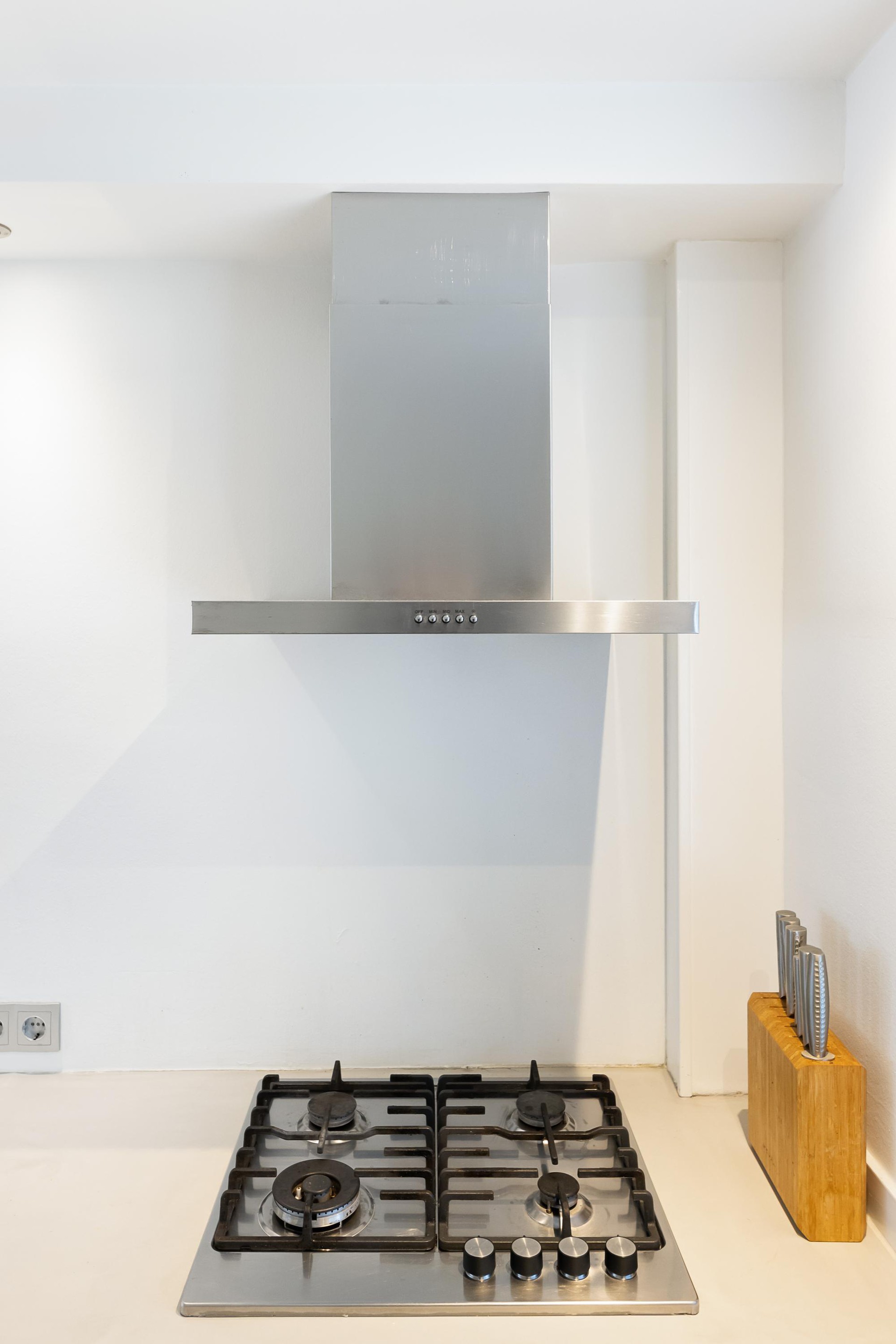Entree met hal, toilet en de trapopgang naar de eerste verdieping. De lichte woonkamer is tuingericht en voorzien van toegang tot de achtertuin. Teven treft u hier de praktische trapkast. De open keuken met barretje is modern afgewerkt met een gaskookplaat, afzuigkap, koelkast en betonnen werkblad.