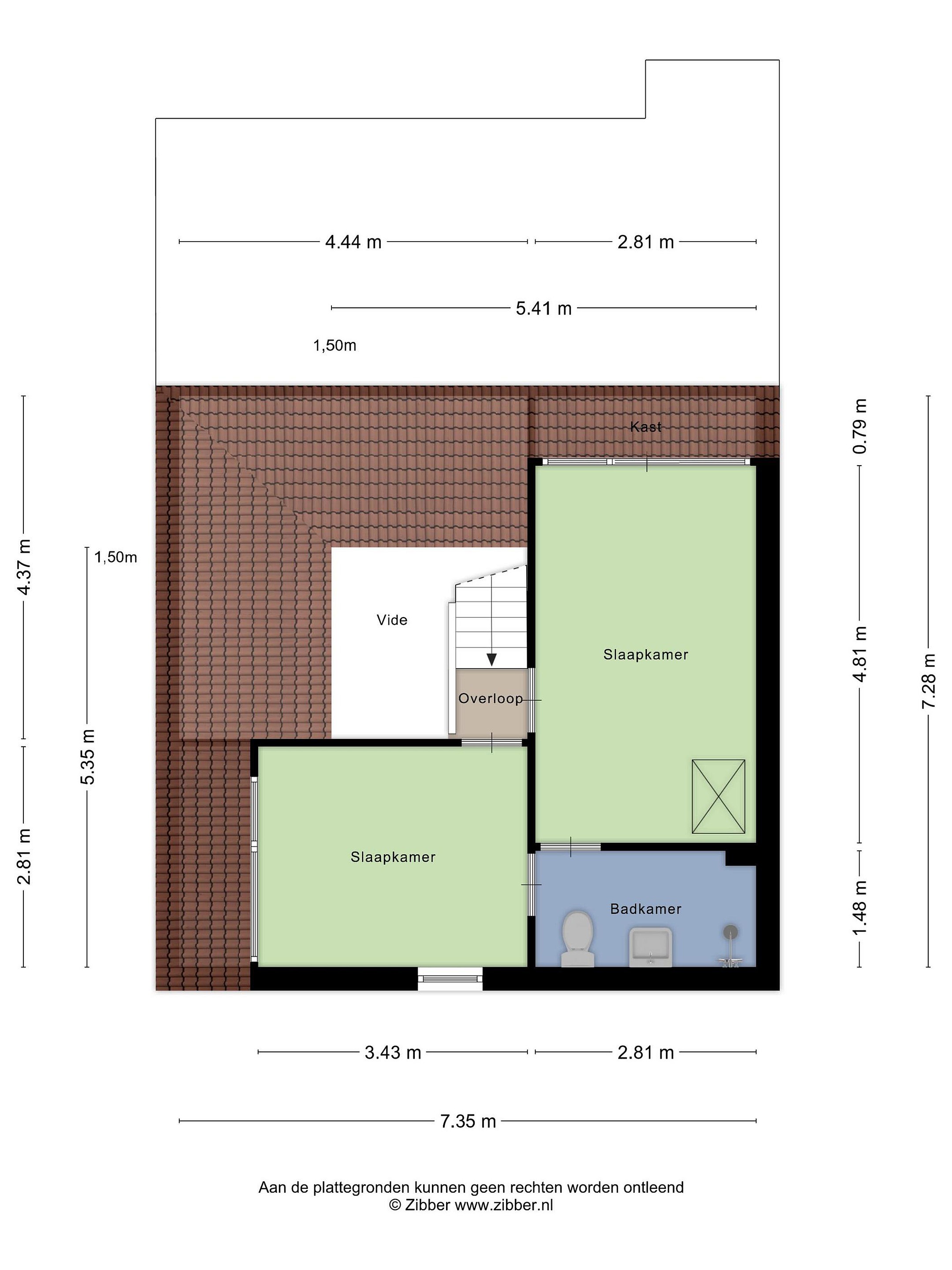 De vide geeft de overloop een open karakter. Hier bevinden zich twee slaapkamers met een oppervlakte van ca. 13,5 m2 en 9,6 m2. Beide slaapkamers zijn voorzien van een dakkapel. De badkamer heeft een oppervlakte van ca. 4 m2 en is uitgerust met een douche, toilet en wastafel.