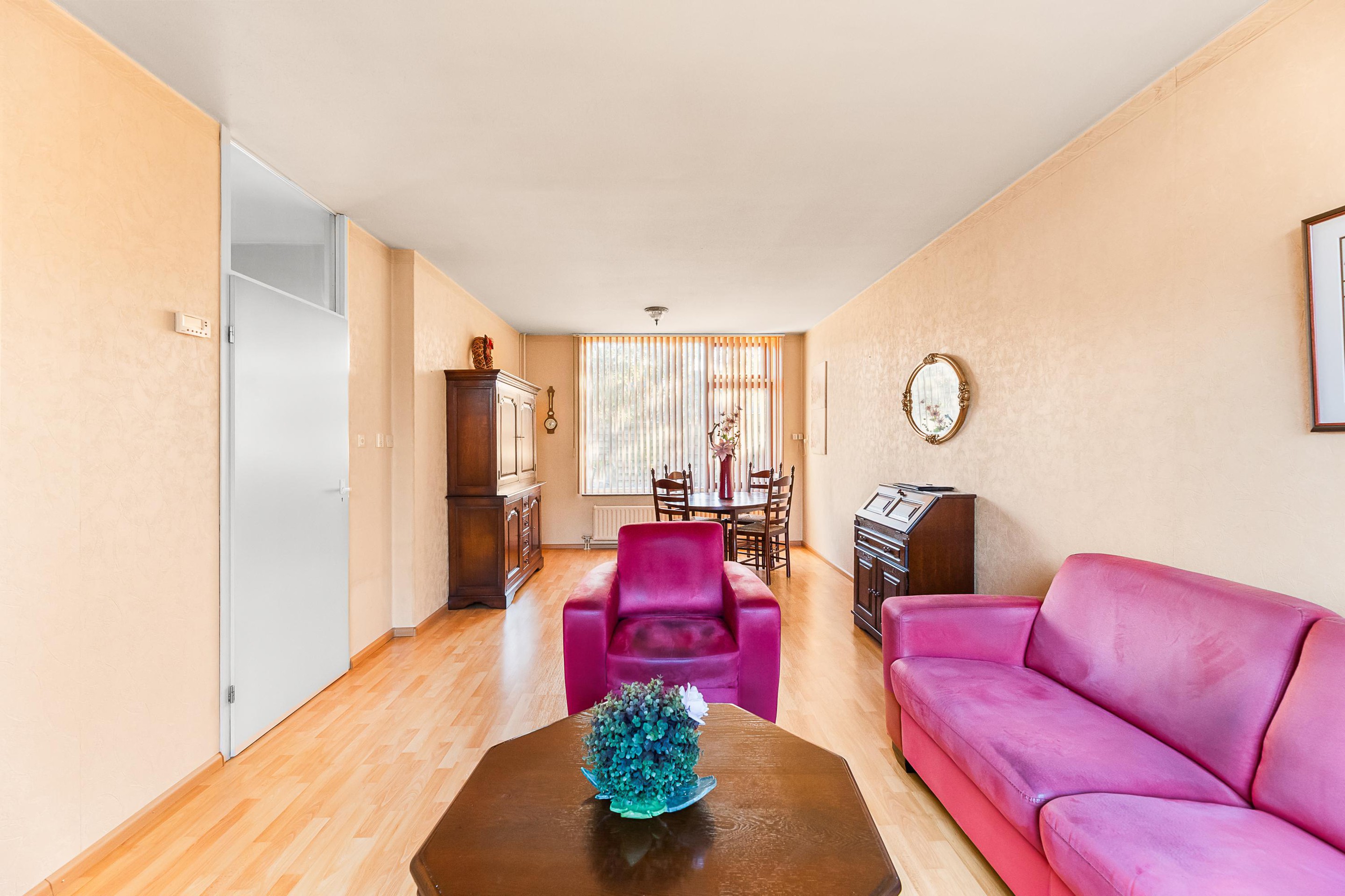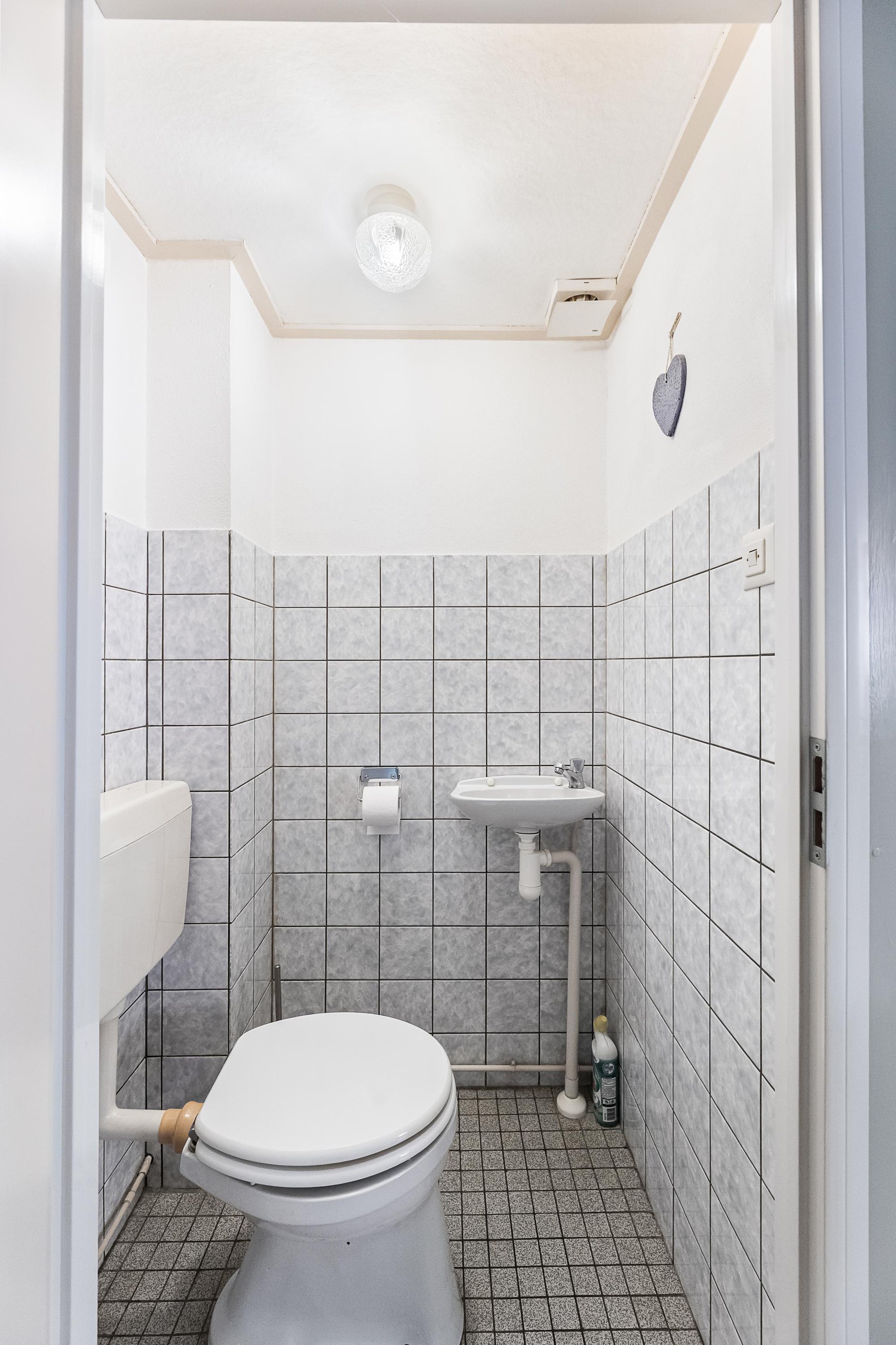 hal met vernieuwde meterkast (v.v. 6 groepen, 2 aardlekschakelaars en slimme meters), eenvoudige toiletruimte met fontein, praktische trapkast. Woonkamer (ca. 27 m2) met veel lichtinval, voorzien van een laminaatvloer. Eenvoudige keuken met onder- en bovenkasten, afzuigkap, wasmachine-aansluiting, wat losse apparatuur en toegang tot tuin.