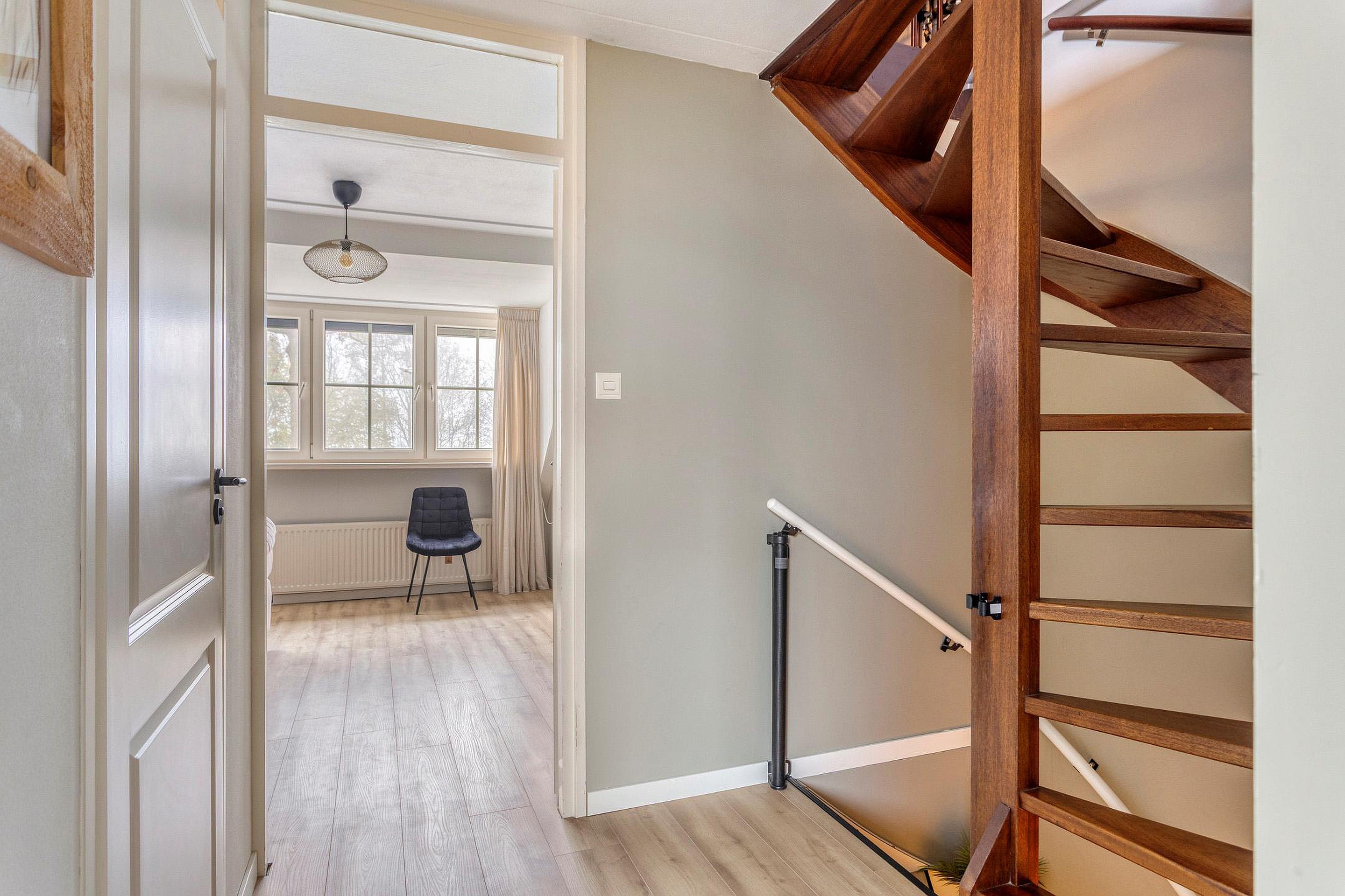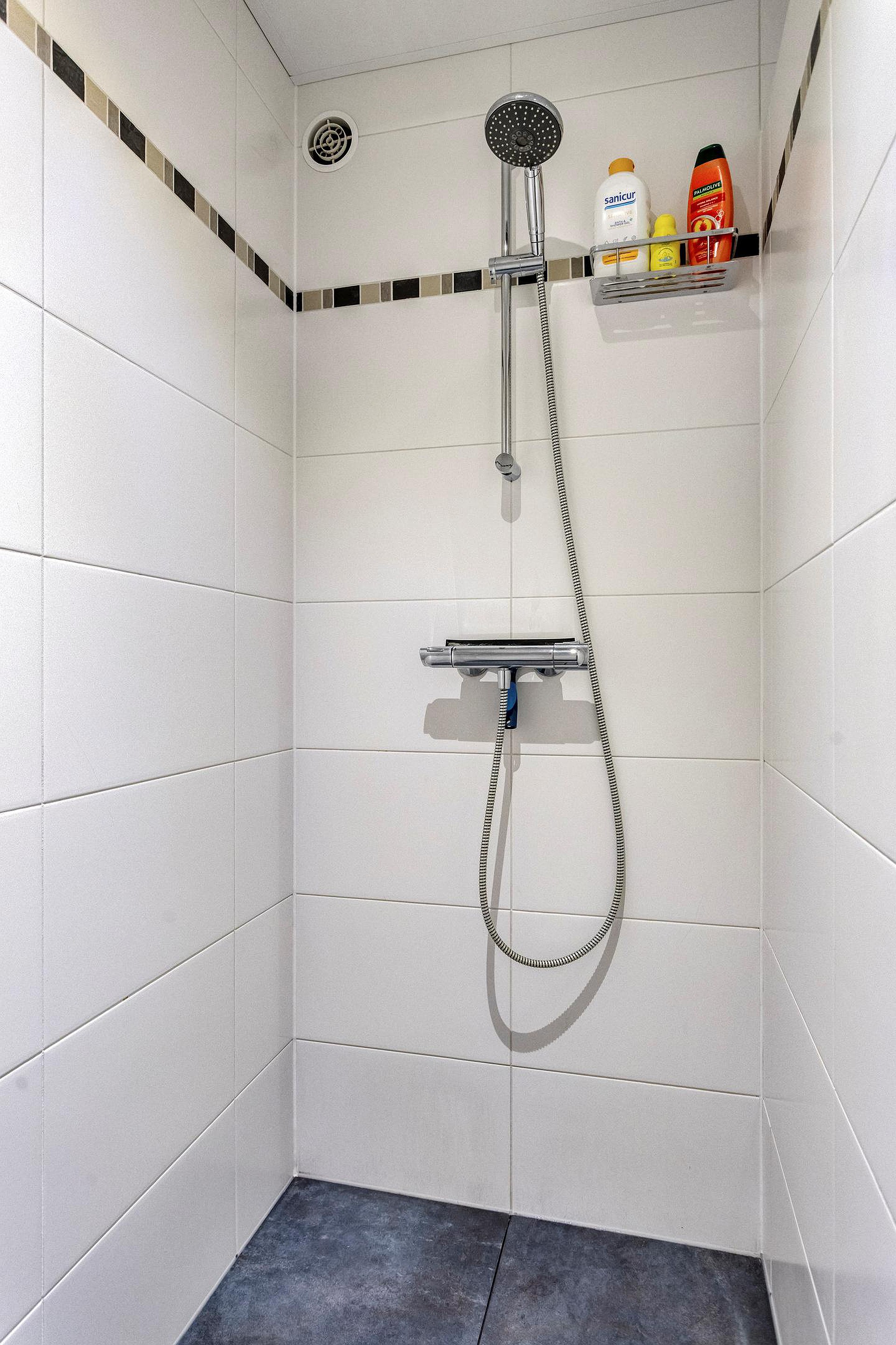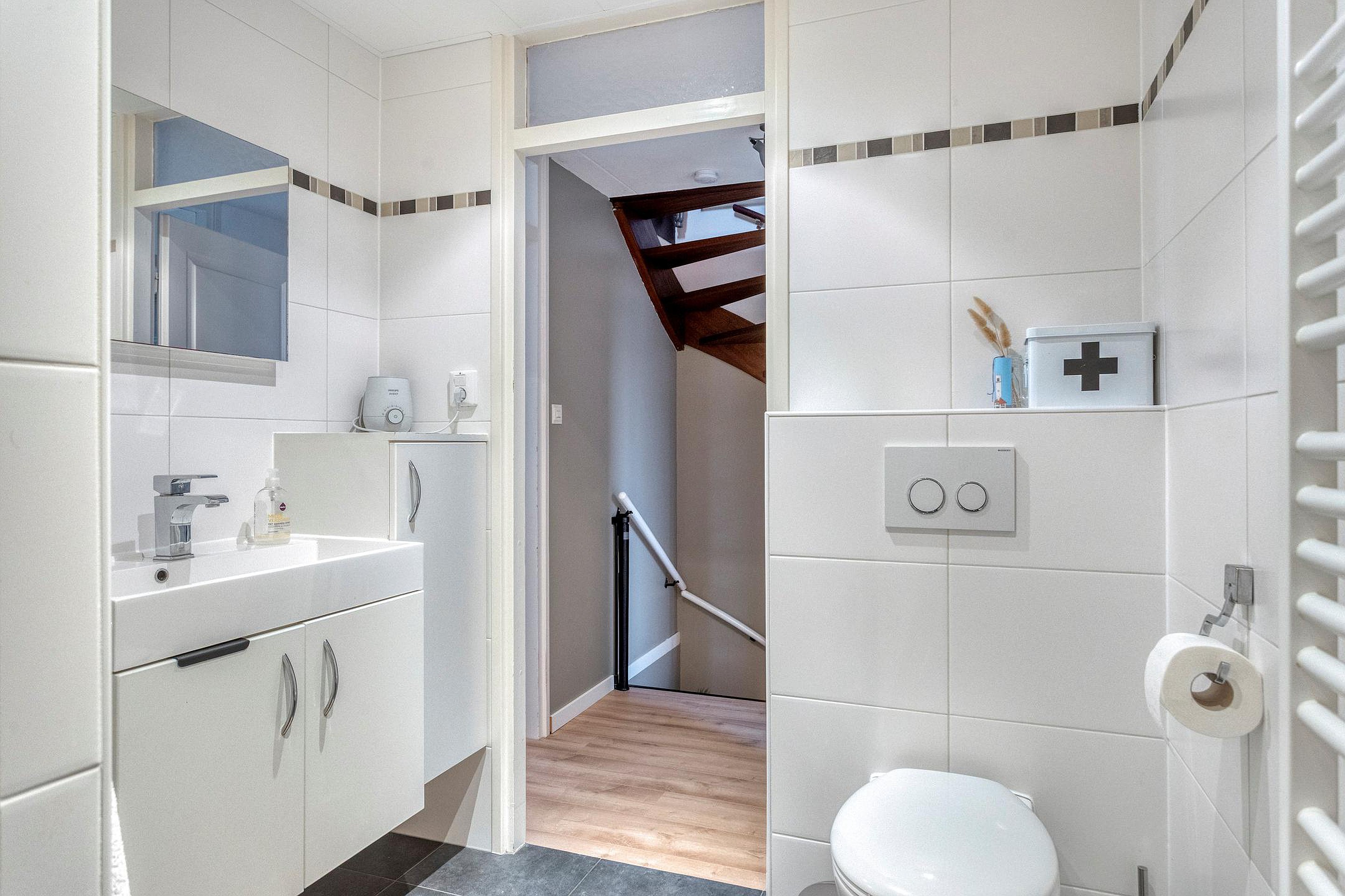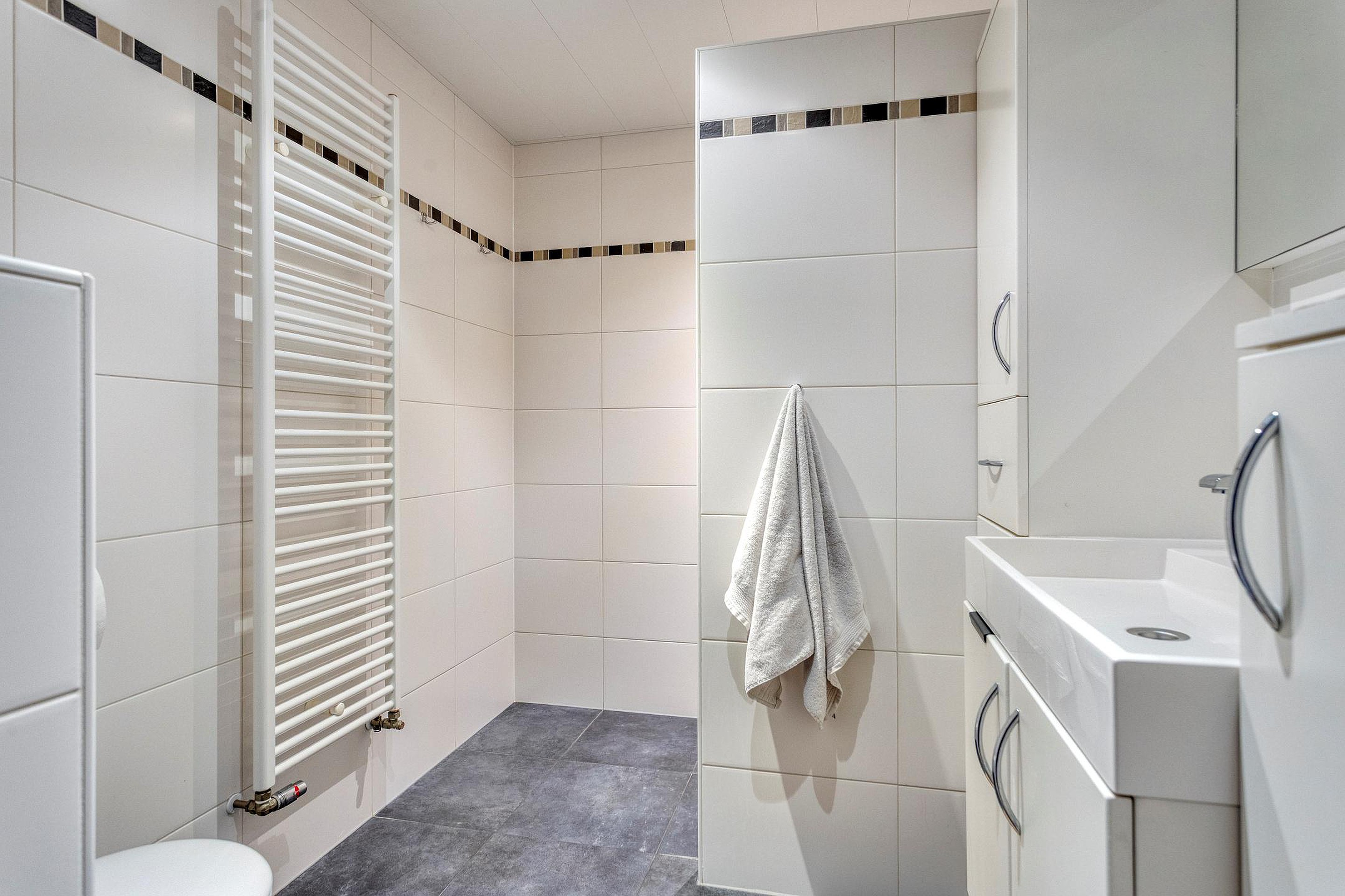 Eerste verdieping Overloop met trapopgang, 3 slaapkamers en de badkamer voorzien van een douchehoek, toilet en een wastafel in meubel.