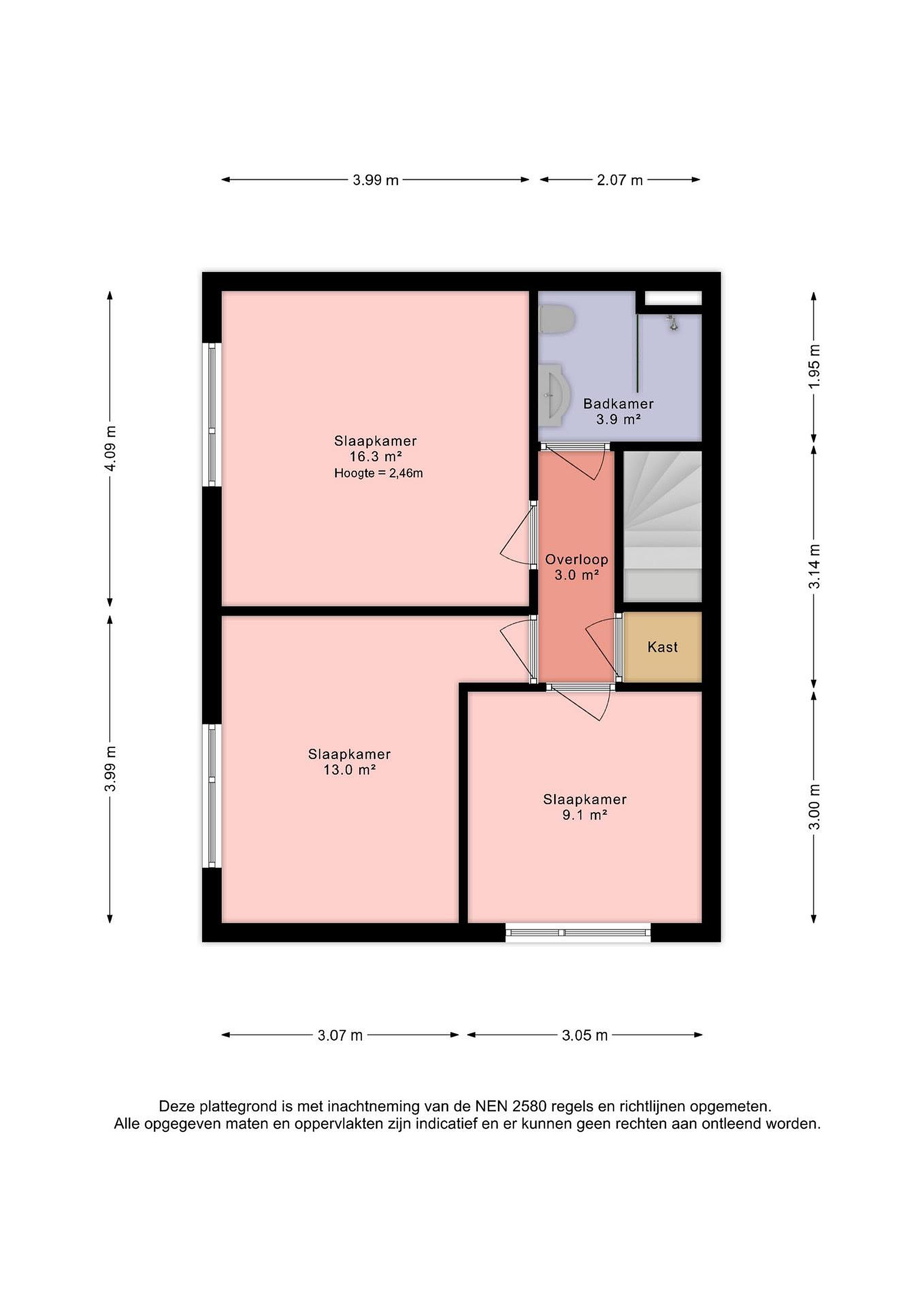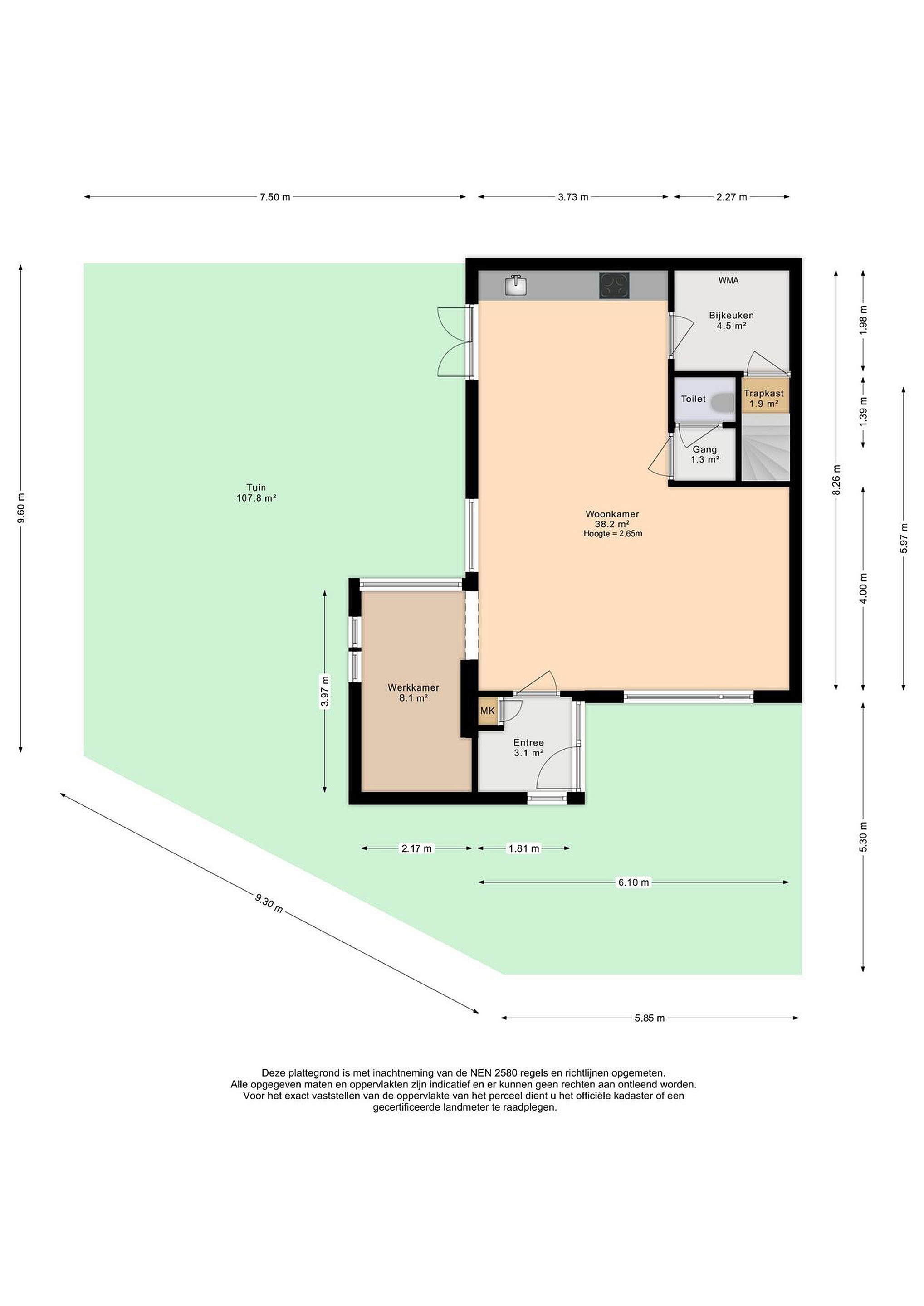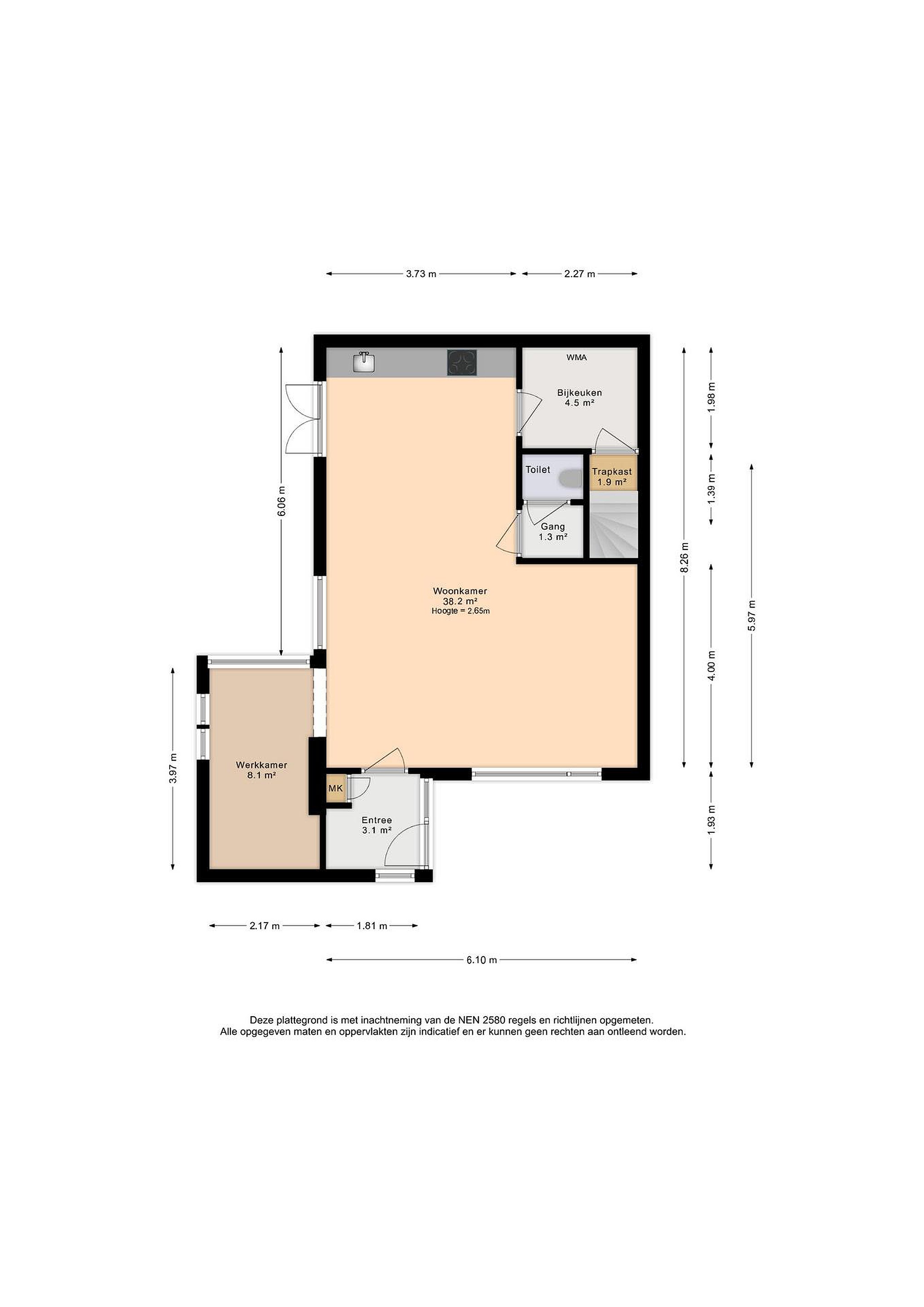 Bovenstaande informatie is door ons met de hoogst nodige zorgvuldigheid samengesteld. Door ons wordt echter geen enkele aansprakelijkheid aanvaard voor enige onvolledigheid, onjuistheid of anderszins, dan wel de gevolgen daarvan. Alle opgegeven maten en oppervlakten zijn indicatief. De woning is gemeten met gebruikmaking van de Meetinstructie, die is gebaseerd op de normen zoals vastgelegd in NEN 2580. De Meetinstructie is bedoeld om een meer eenduidige manier van meten toe te passen voor het geven van een indicatie van gebruiksoppervlakte. De Meetinstructie sluit verschillen in meetuitkomsten niet volledig uit, door bijvoorbeeld interpretatieverschillen, afrondingen of beperkingen bij het uitvoeren van de meting. Hoewel wij de woning zorgvuldig hebben opgemeten, wordt noch door ons kantoor, noch door de verkoper enige aansprakelijkheid aanvaard voor afwijkingen in de opgegeven maten. Koper wordt in de gelegenheid gesteld om de opgegeven maten te (laten) controleren.