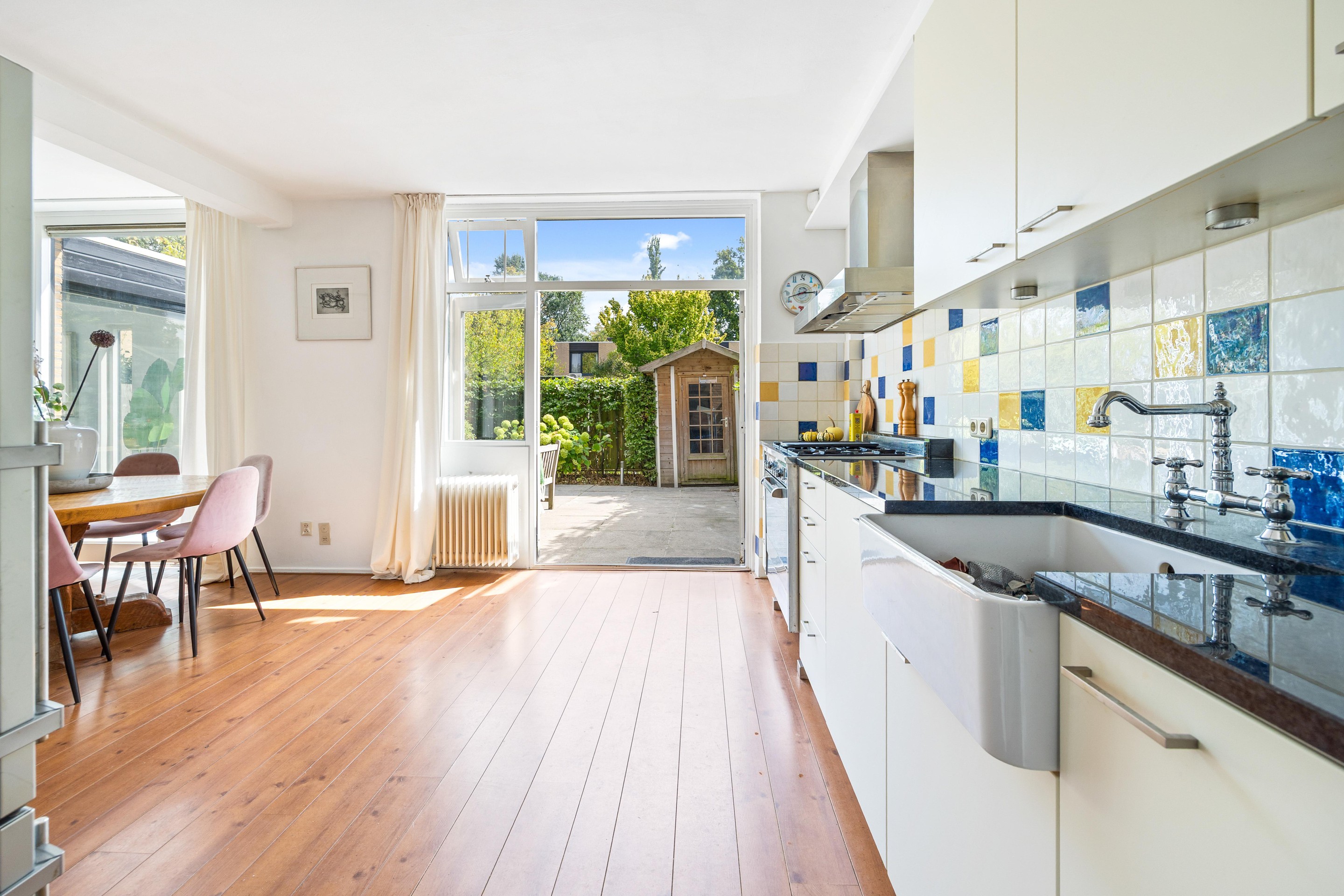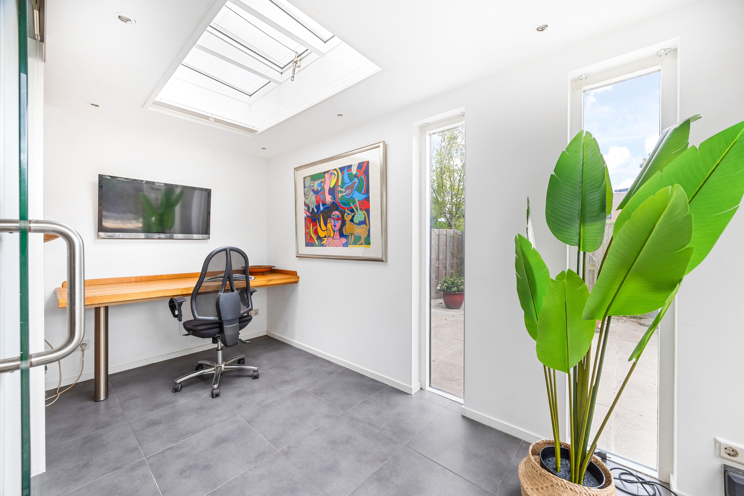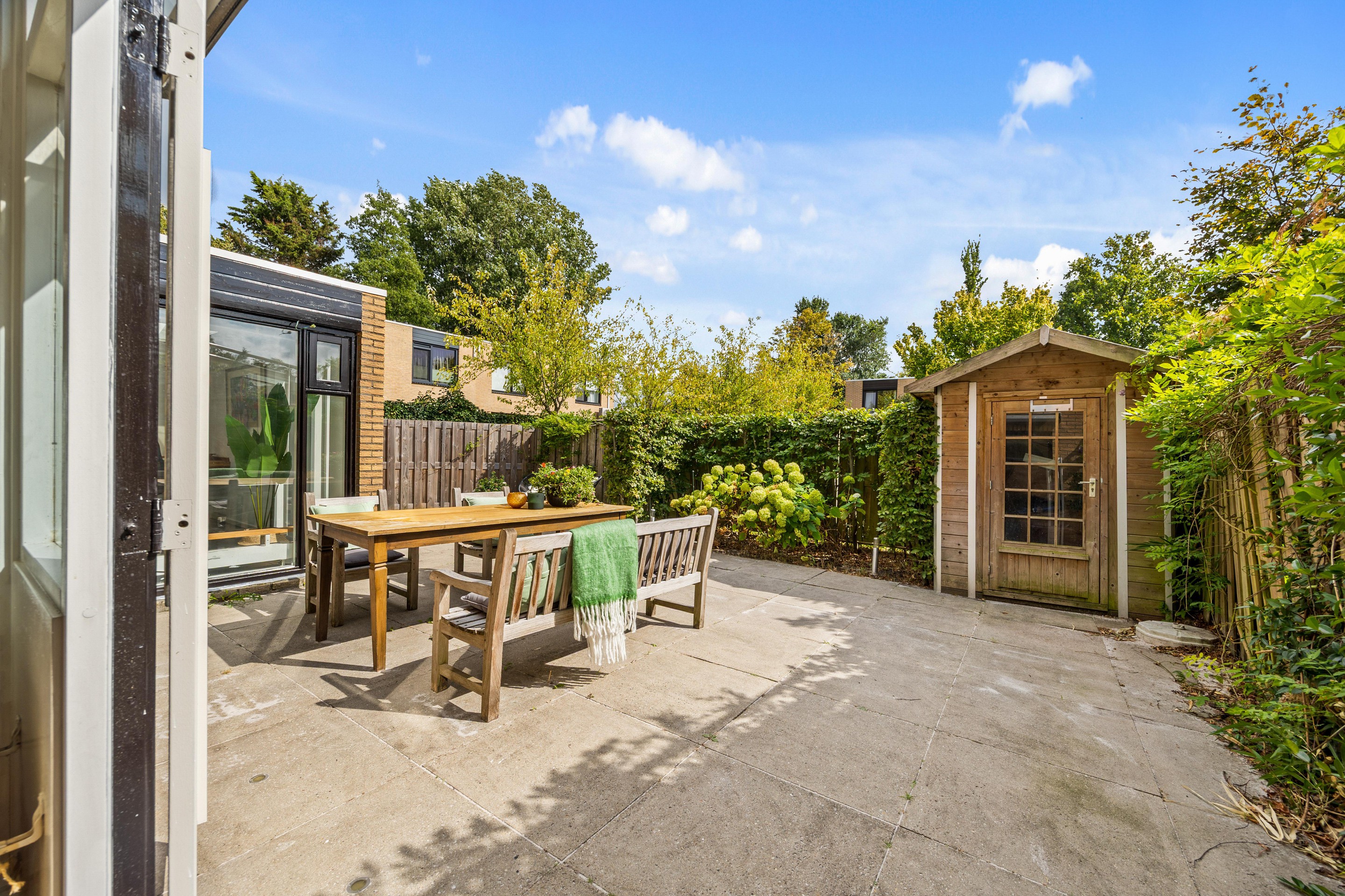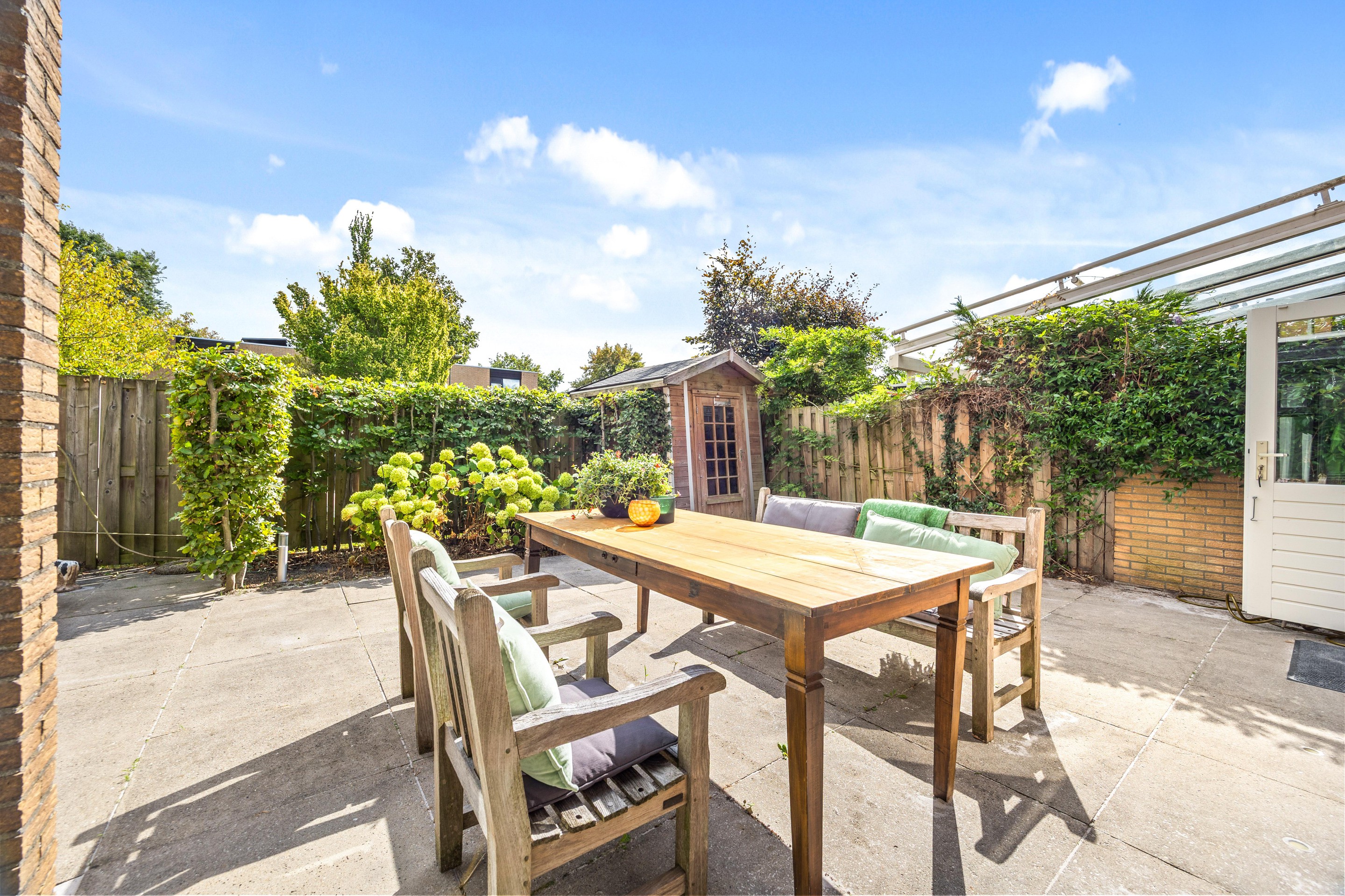 Ruime voortuin; entree in hal met meterkast en toegang tot de royale (ca.40 m2), heerlijk lichte woonkamer/eetkamer en openslaande deur bij de keuken naar de tuin. De open keuken is voorzien van diverse apparatuur. De aangrenzende bijkeuken heeft een opstelplaats voor wasmachine, droger en HR-combiketel en extra bergruimte onder de trap. Aan de woonkamer grenst de kantoor / speelkamer van ca. 9m2. Door de ligging van de tuin geniet u ’s ochtends en ’s middags van de zon. Aan de achterzijde van het huis staat een extra vrijstaande houten fietsenberging van ca. 6 m2.