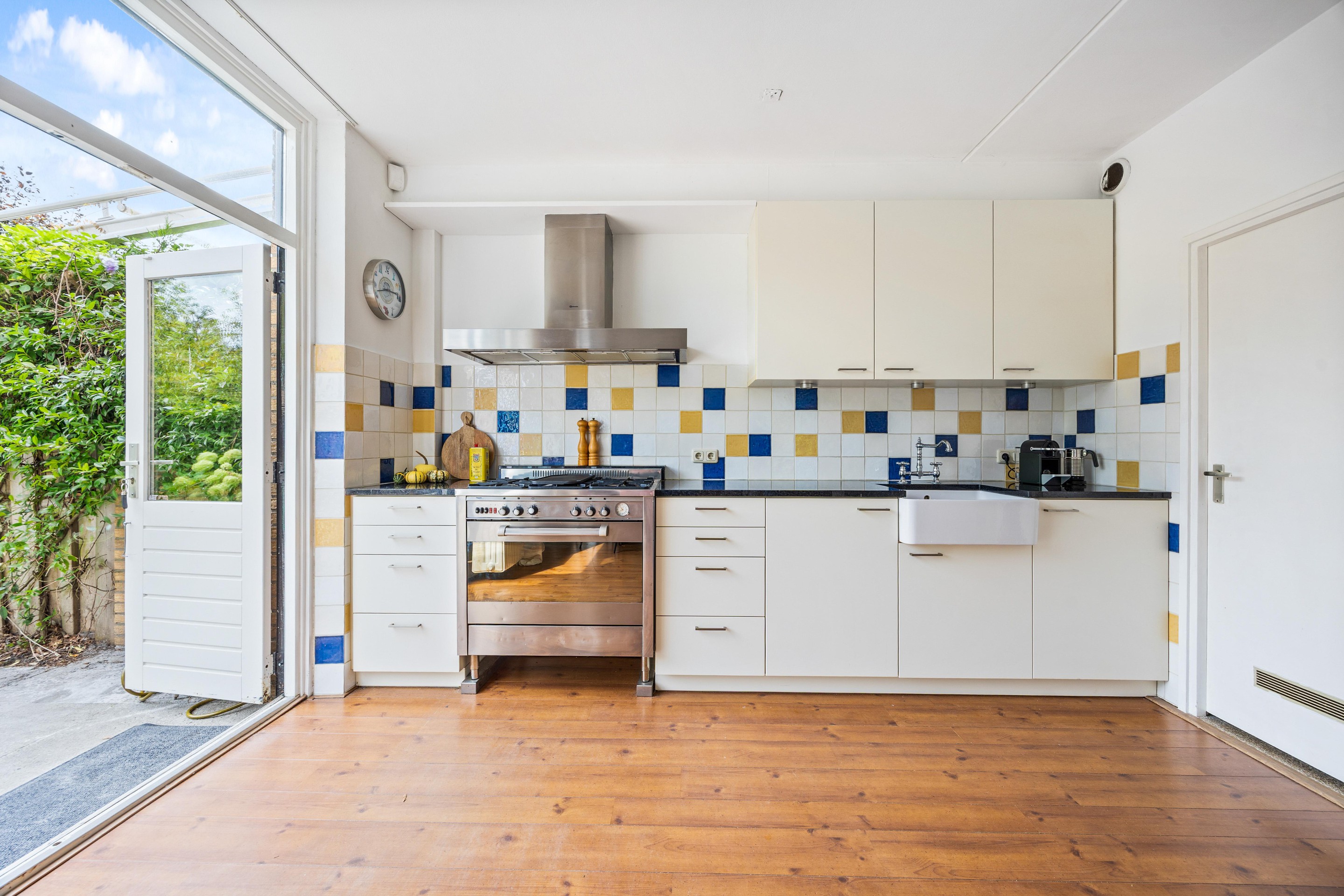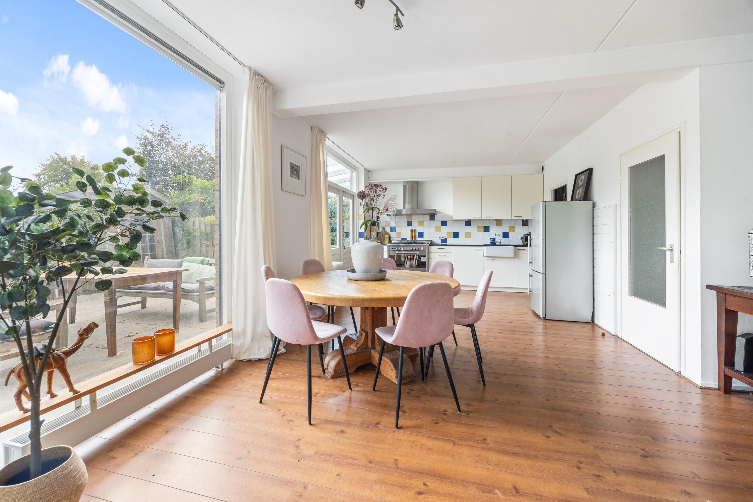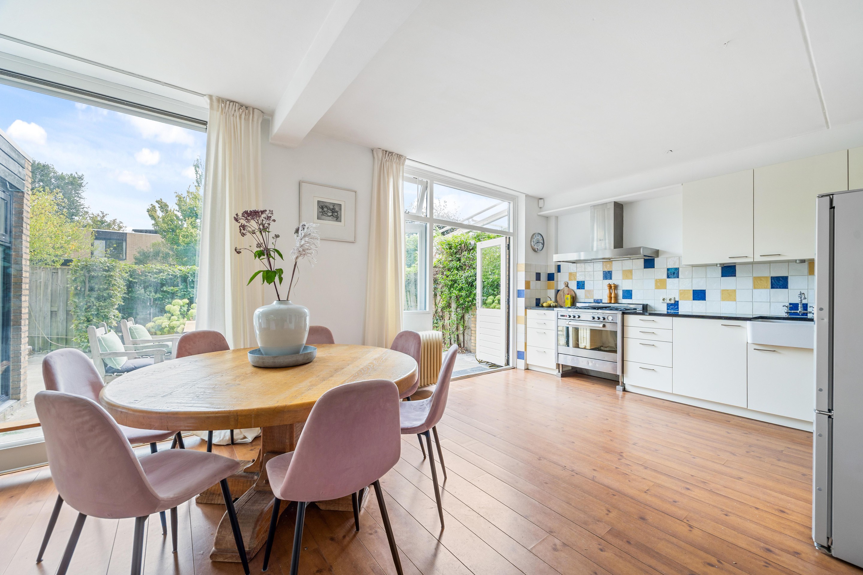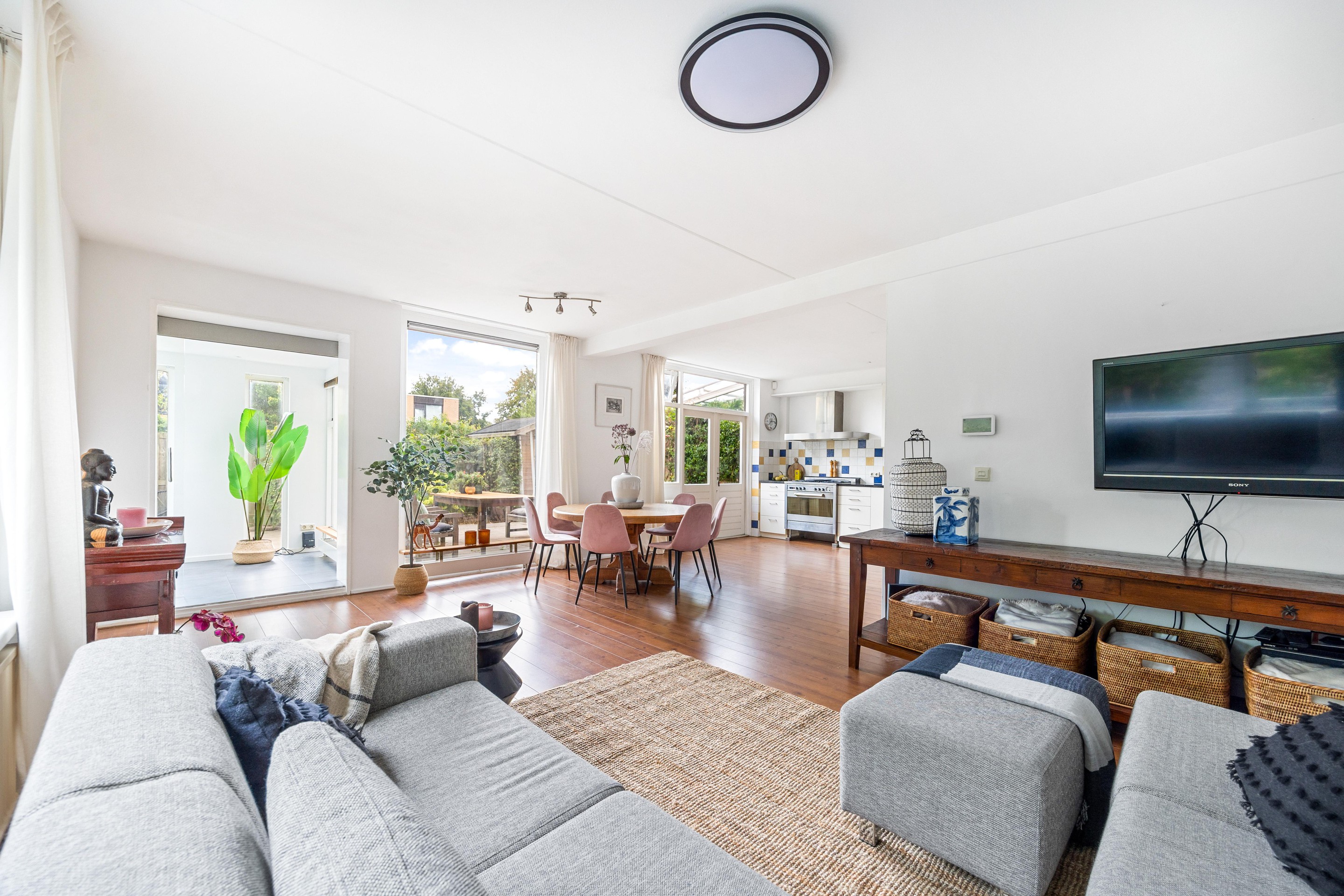 Ruime voortuin; entree in hal met meterkast en toegang tot de royale (ca.40 m2), heerlijk lichte woonkamer/eetkamer en openslaande deur bij de keuken naar de tuin. De open keuken is voorzien van diverse apparatuur. De aangrenzende bijkeuken heeft een opstelplaats voor wasmachine, droger en HR-combiketel en extra bergruimte onder de trap. Aan de woonkamer grenst de kantoor / speelkamer van ca. 9m2. Door de ligging van de tuin geniet u ’s ochtends en ’s middags van de zon. Aan de achterzijde van het huis staat een extra vrijstaande houten fietsenberging van ca. 6 m2.