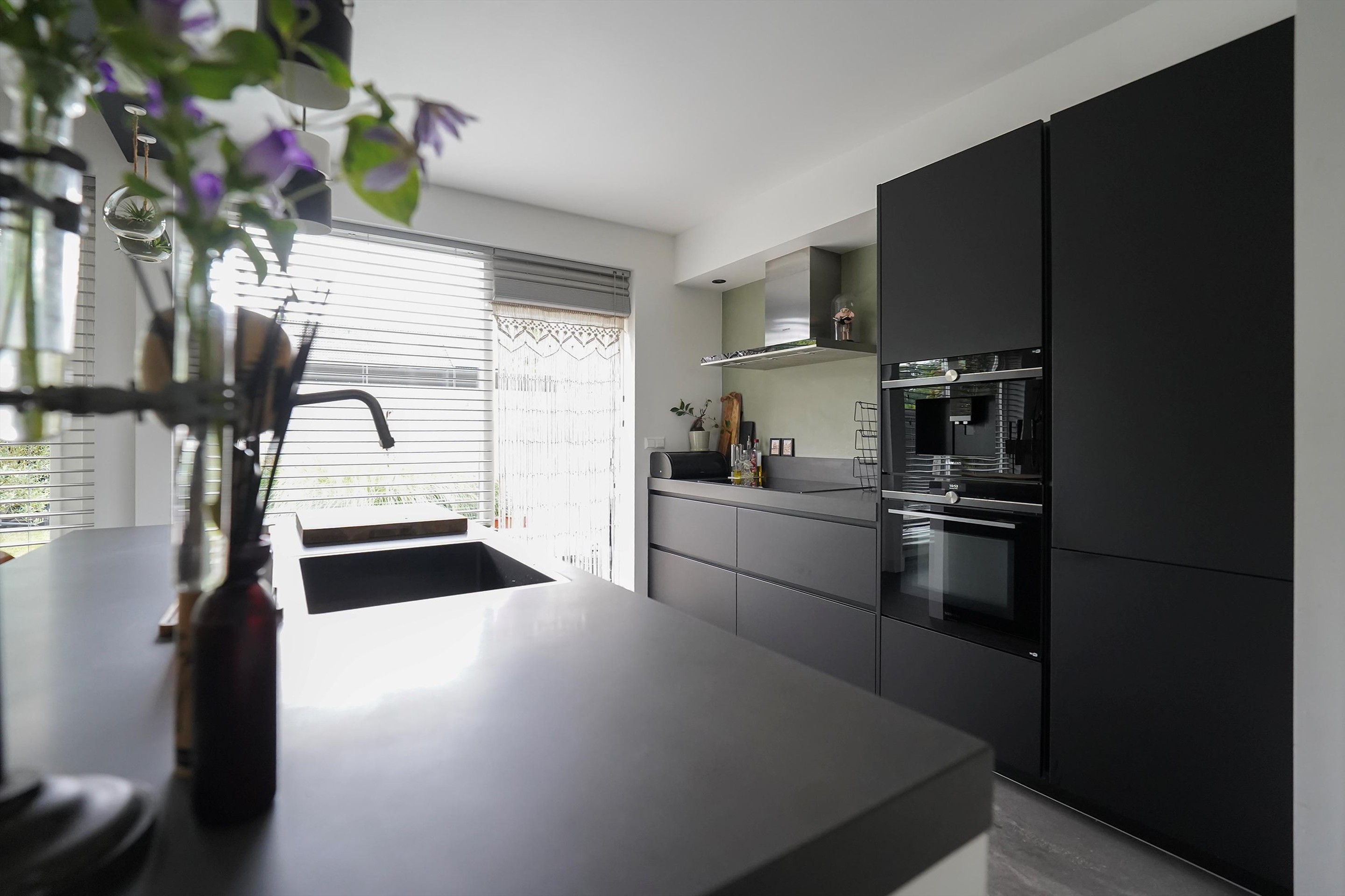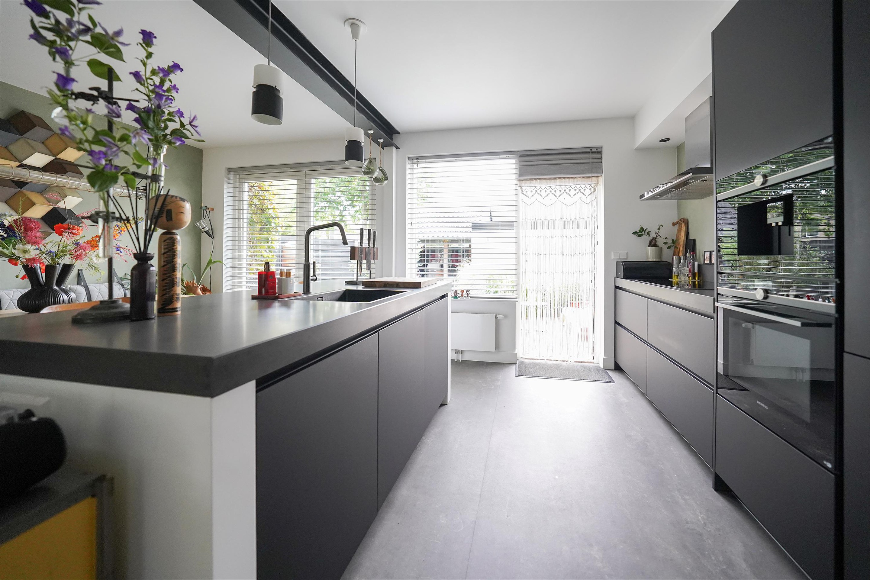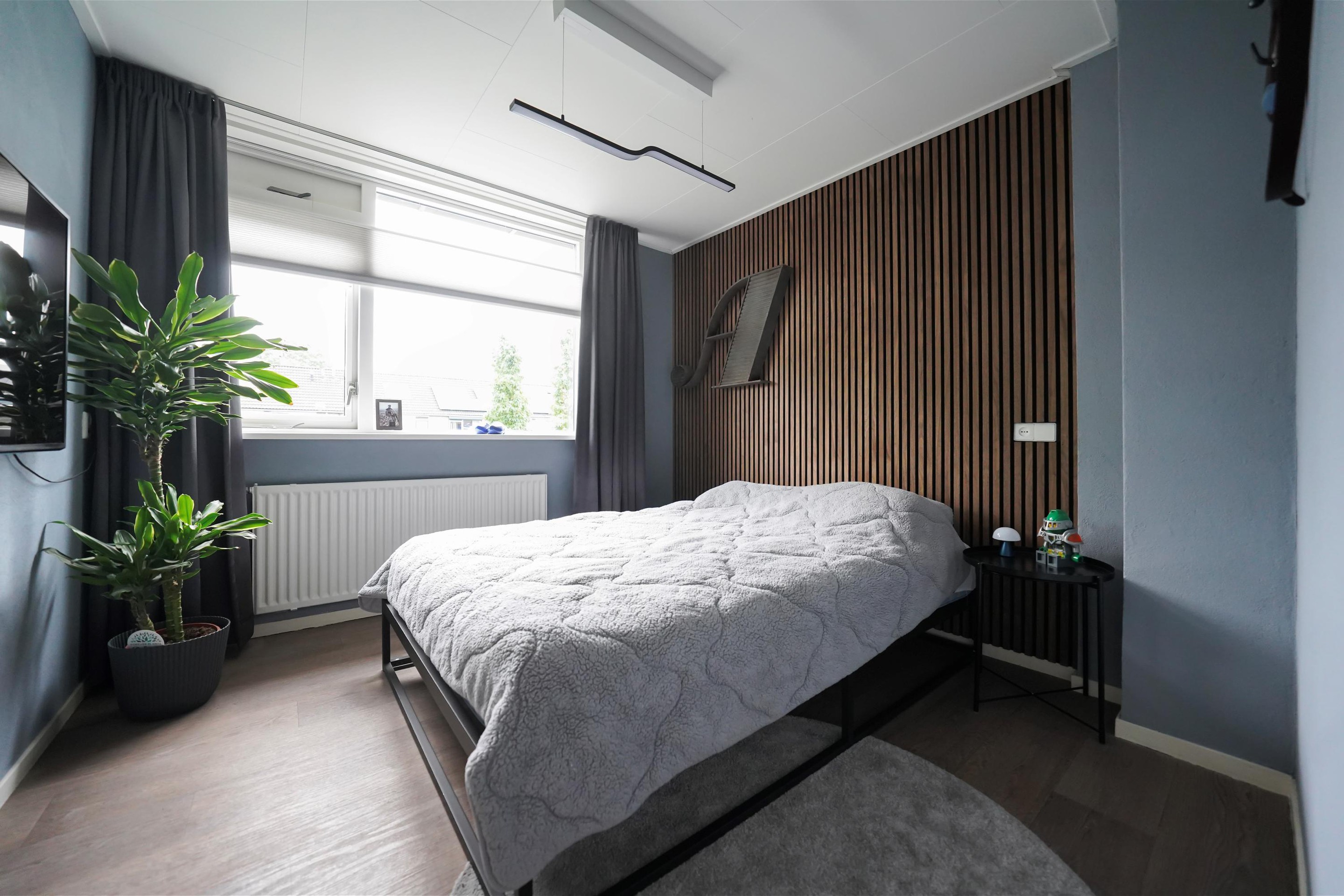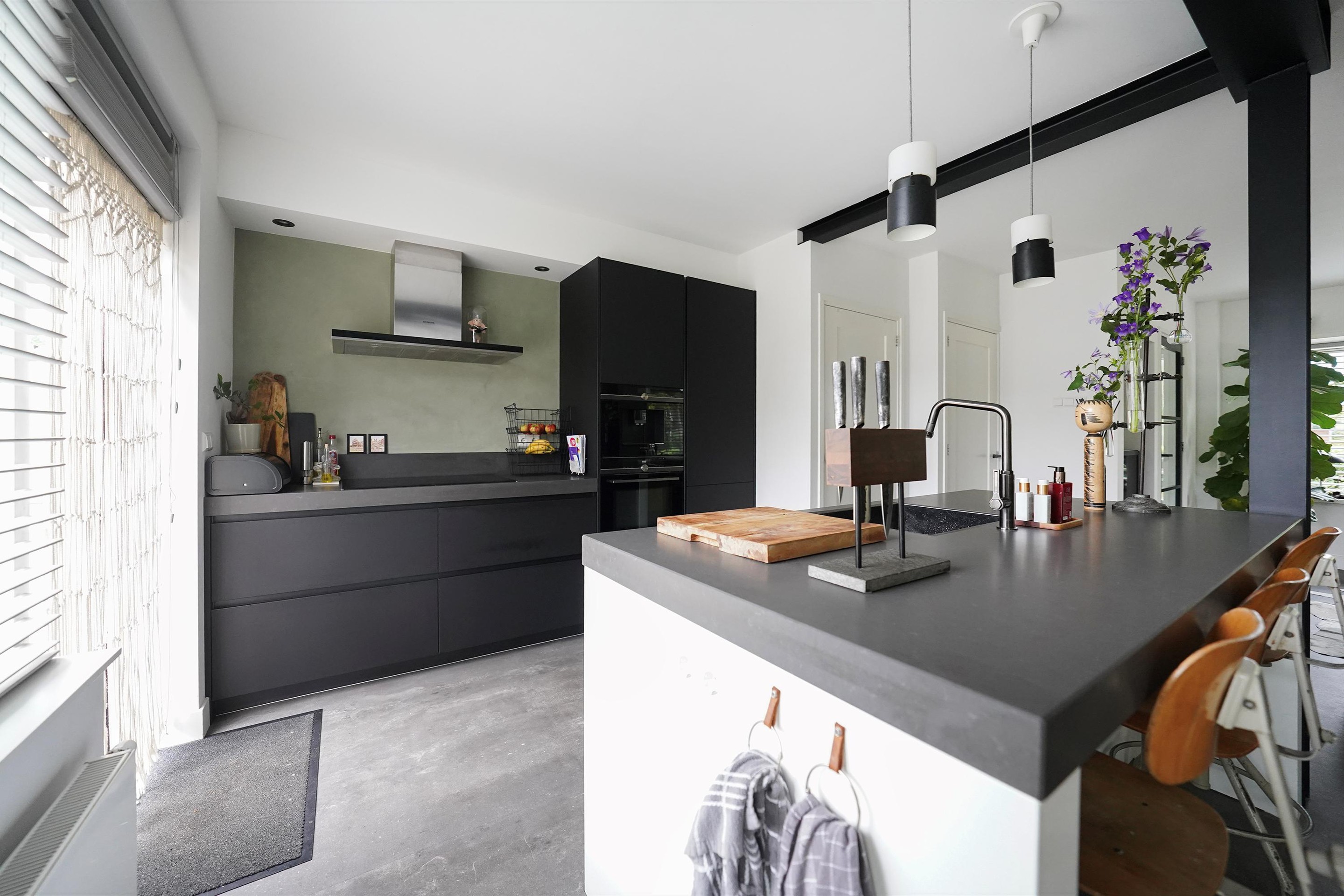 Bij aankomst valt mij meteen de vrije, groene ligging op. Ik kan gemakkelijk parkeren naast de woning en uiteraard heb je ook een eigen parkeergelegenheid in de garage mocht je dat willen. Ik kan de woning gemakkelijk bereiken via de zij-ingang, maar ik loop eerst naar de voordeur aan de voorzijde van de woning. Mij valt meteen de mooie zwarte kozijnen en voordeur op. Het voorraam is ook enigszins verdiept wat de woning een speels karakter geeft. De voortuin is ook ruim en heel verzorgd ingericht. Hier kijk je leuk over de straat! Bij binnenkomst valt mij meteen op dat ik een moderne, frisse woning binnenstap. In de hal is ruimte voor de jassen en schoenen en hier is ook de toegang naar de verzorgde toiletruimte, voorzien van een hangend toilet met fonteintje. Door een mooie zwarte deur met veel glas kom ik in de woonkamer. Een heerlijke lichte ruimte met veel raampartijen en een gezellige inrichting! Het zitgedeelte is aan de voorzijde gesitueerd en is voorzien van een groot zijraam met uitzicht op de mooie boom die aan de zijkant van de woning staat. De woonkamer is voorzien van een open inbouwkast waar de tv ook is geïnstalleerd. Verder is midden in de ruimte een stoere pelletkachel waar je vanuit de keuken en de woonkamer van kan genieten. De keuken is in 2019 ook geheel aangepakt en opengebroken. Zo is er een fijne open ruimte ontstaan! Een leuk detail is dat de stoere stalen balken nog in het zicht zijn gelaten en dat geeft juist karakter aan de ruimte. Bij de eettafel zijn de dubbele tuindeuren naar de achtertuin en deze geven ook weer dat extra fijne daglicht. De keuken zelf is prachtig! Een ruime opstelling met een spoeleiland waar je ook fijn aan kan zitten. Een matzwarte keuken met alle inbouwapparatuur aanwezig. Echt een eyecatcher! Bij de keuken is nog een handige bergkast voor al je provisie. De gehele ruimte is voorzien van vloerverwarming en een mooie pvc-vloer. Naast de bergkast is een deur naar de trapopgang, deze is dus mooi afgesloten en niet zichtbaar vanuit de woonkamer en de keuken.