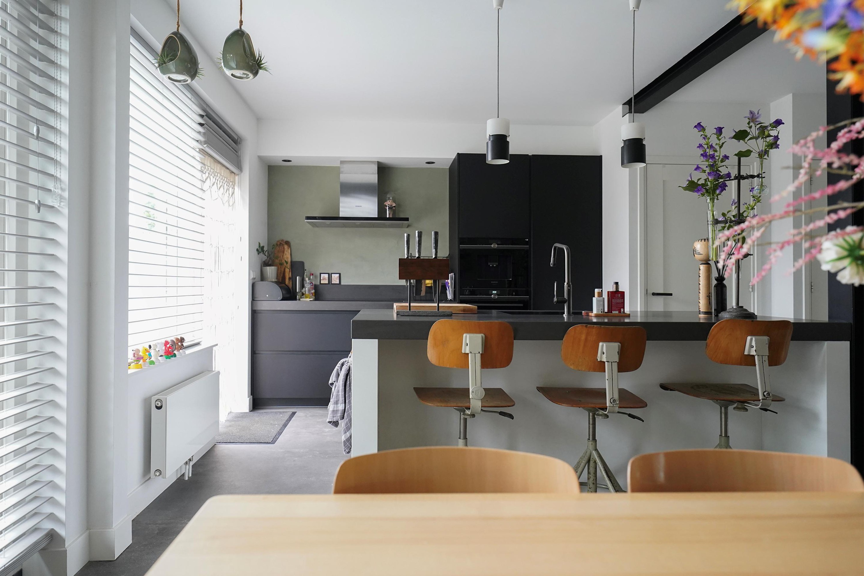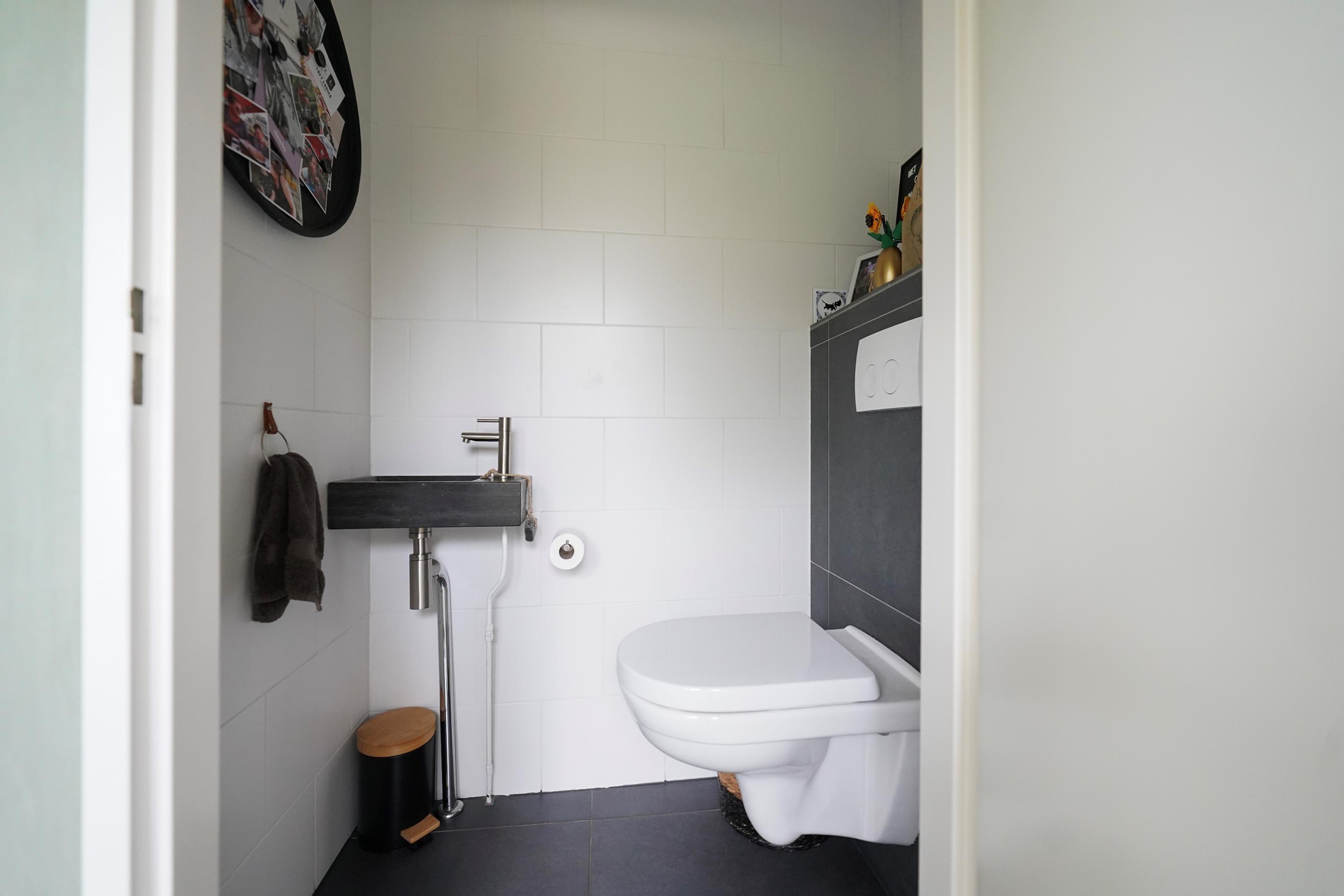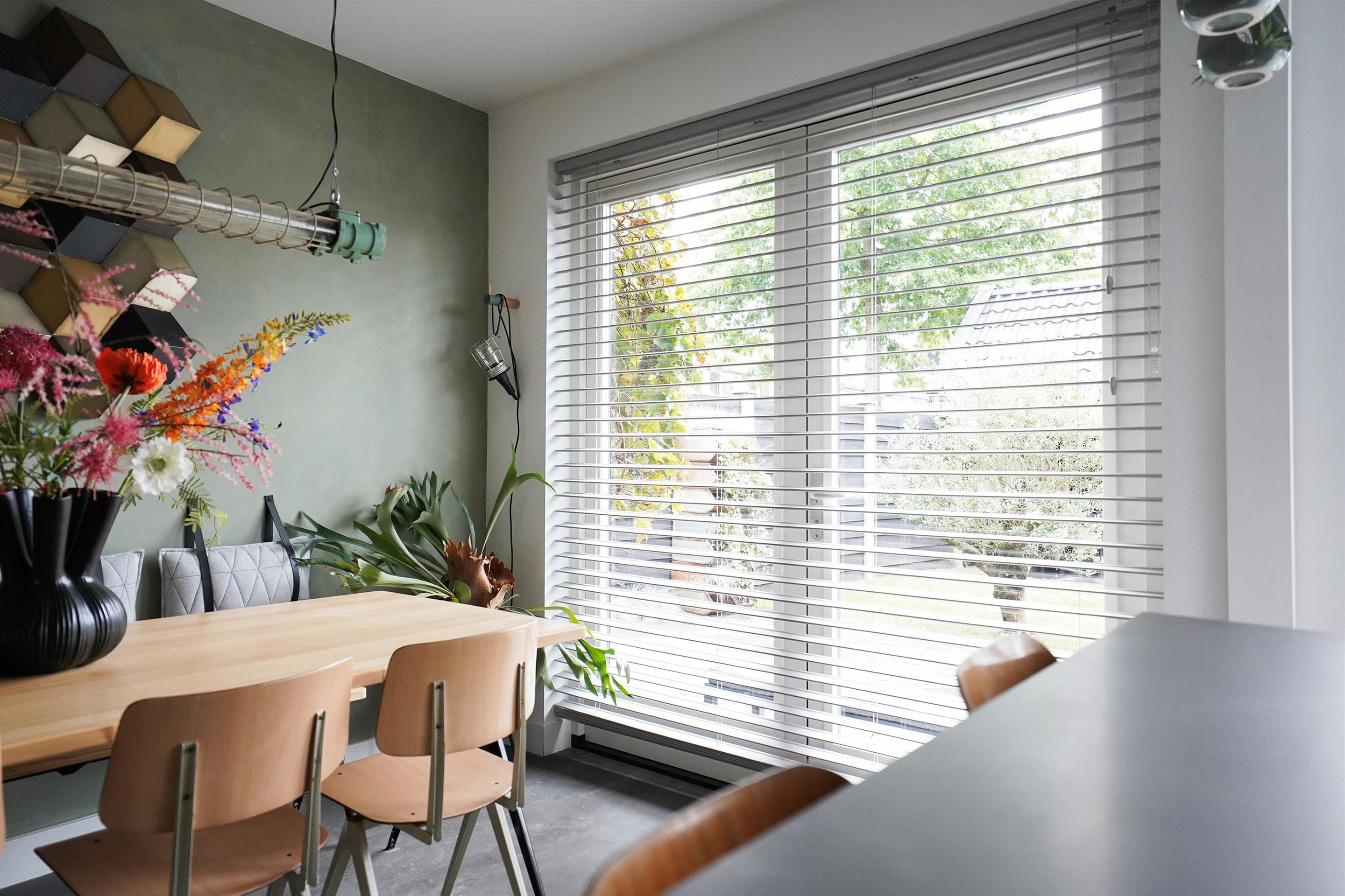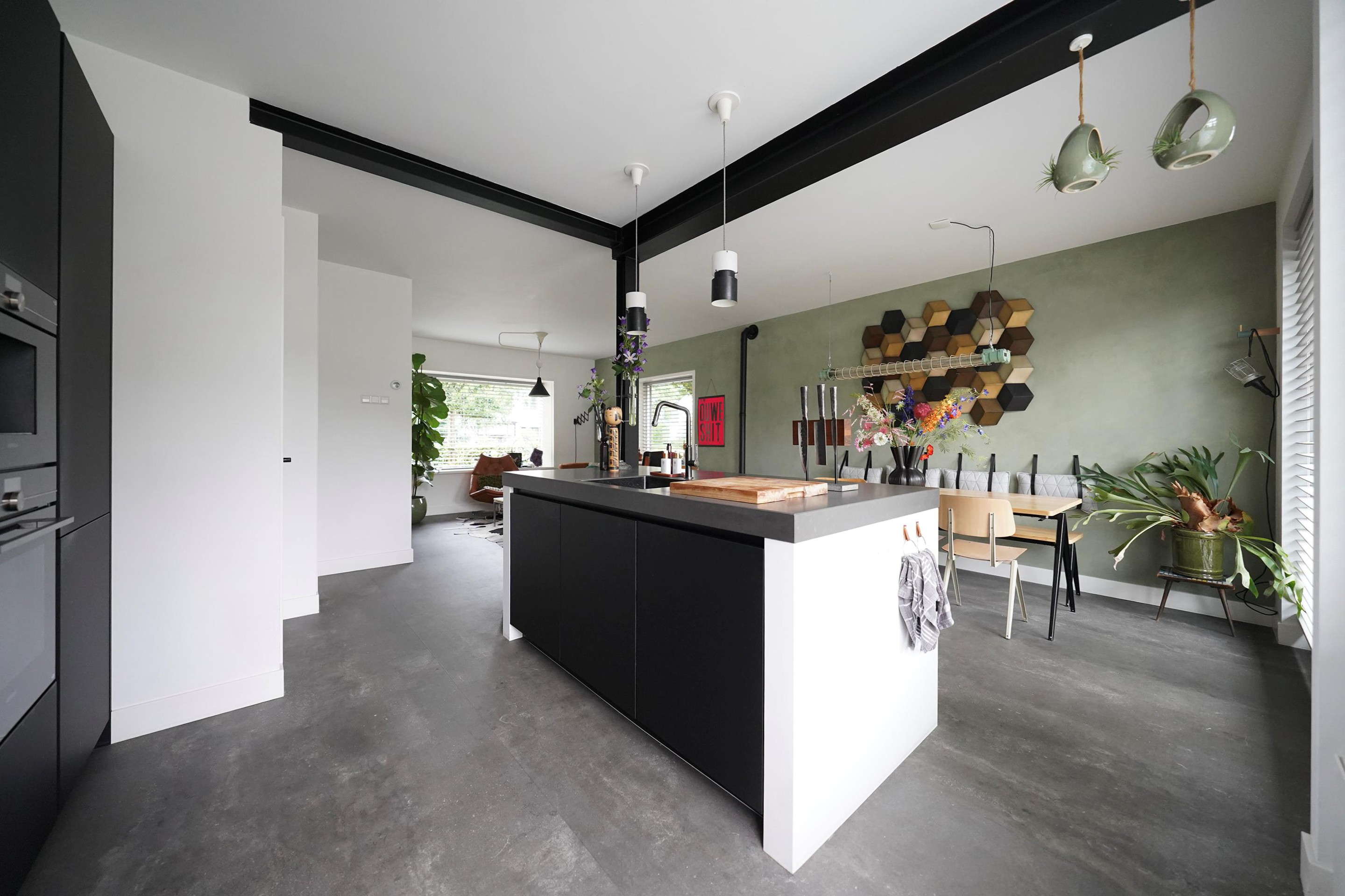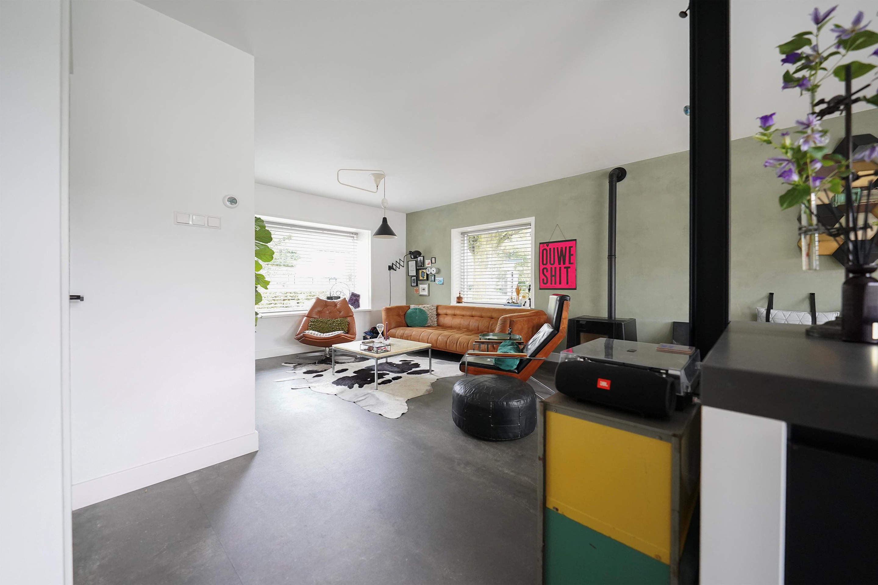 Bij aankomst valt mij meteen de vrije, groene ligging op. Ik kan gemakkelijk parkeren naast de woning en uiteraard heb je ook een eigen parkeergelegenheid in de garage mocht je dat willen. Ik kan de woning gemakkelijk bereiken via de zij-ingang, maar ik loop eerst naar de voordeur aan de voorzijde van de woning. Mij valt meteen de mooie zwarte kozijnen en voordeur op. Het voorraam is ook enigszins verdiept wat de woning een speels karakter geeft. De voortuin is ook ruim en heel verzorgd ingericht. Hier kijk je leuk over de straat! Bij binnenkomst valt mij meteen op dat ik een moderne, frisse woning binnenstap. In de hal is ruimte voor de jassen en schoenen en hier is ook de toegang naar de verzorgde toiletruimte, voorzien van een hangend toilet met fonteintje. Door een mooie zwarte deur met veel glas kom ik in de woonkamer. Een heerlijke lichte ruimte met veel raampartijen en een gezellige inrichting! Het zitgedeelte is aan de voorzijde gesitueerd en is voorzien van een groot zijraam met uitzicht op de mooie boom die aan de zijkant van de woning staat. De woonkamer is voorzien van een open inbouwkast waar de tv ook is geïnstalleerd. Verder is midden in de ruimte een stoere pelletkachel waar je vanuit de keuken en de woonkamer van kan genieten. De keuken is in 2019 ook geheel aangepakt en opengebroken. Zo is er een fijne open ruimte ontstaan! Een leuk detail is dat de stoere stalen balken nog in het zicht zijn gelaten en dat geeft juist karakter aan de ruimte. Bij de eettafel zijn de dubbele tuindeuren naar de achtertuin en deze geven ook weer dat extra fijne daglicht. De keuken zelf is prachtig! Een ruime opstelling met een spoeleiland waar je ook fijn aan kan zitten. Een matzwarte keuken met alle inbouwapparatuur aanwezig. Echt een eyecatcher! Bij de keuken is nog een handige bergkast voor al je provisie. De gehele ruimte is voorzien van vloerverwarming en een mooie pvc-vloer. Naast de bergkast is een deur naar de trapopgang, deze is dus mooi afgesloten en niet zichtbaar vanuit de woonkamer en de keuken.