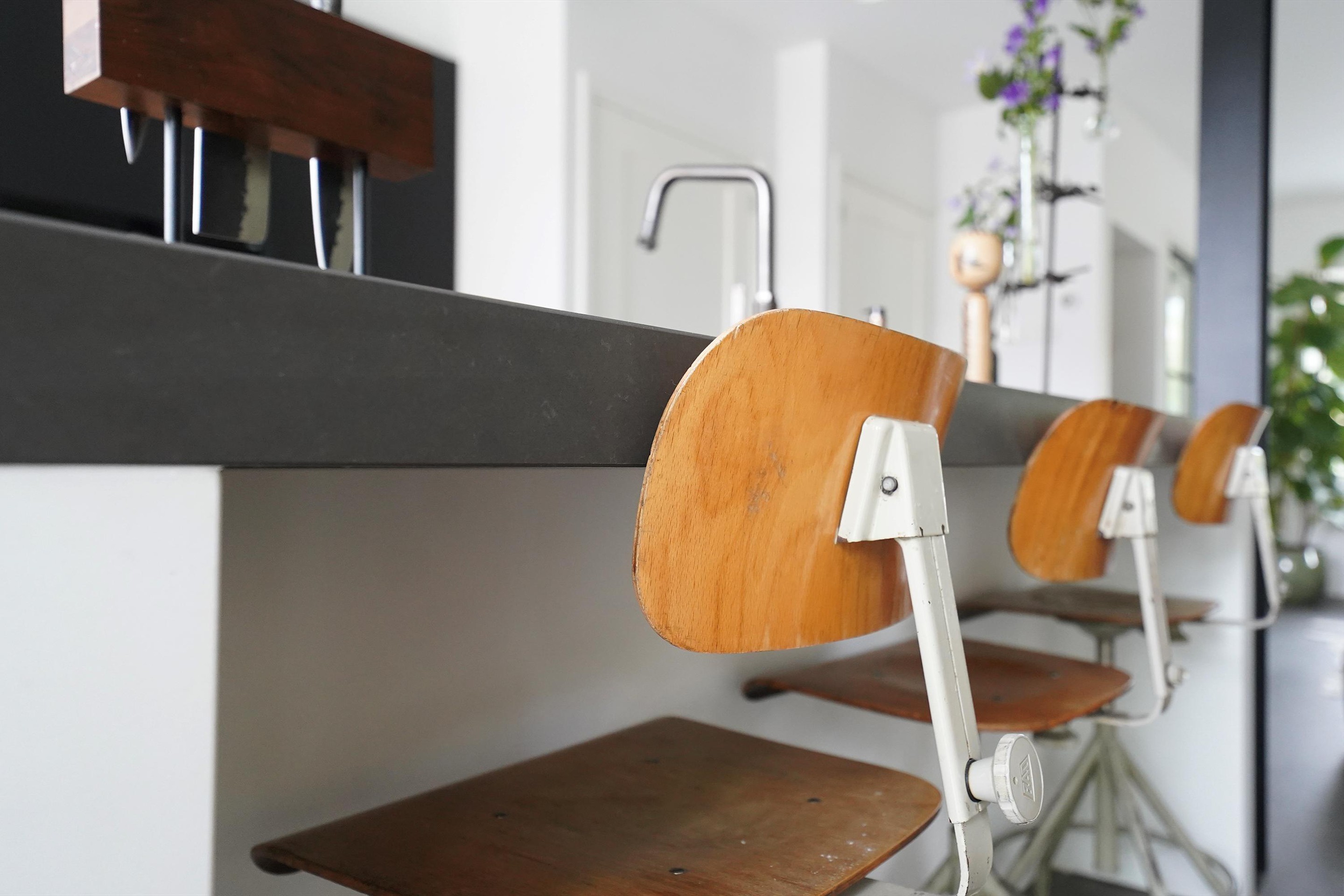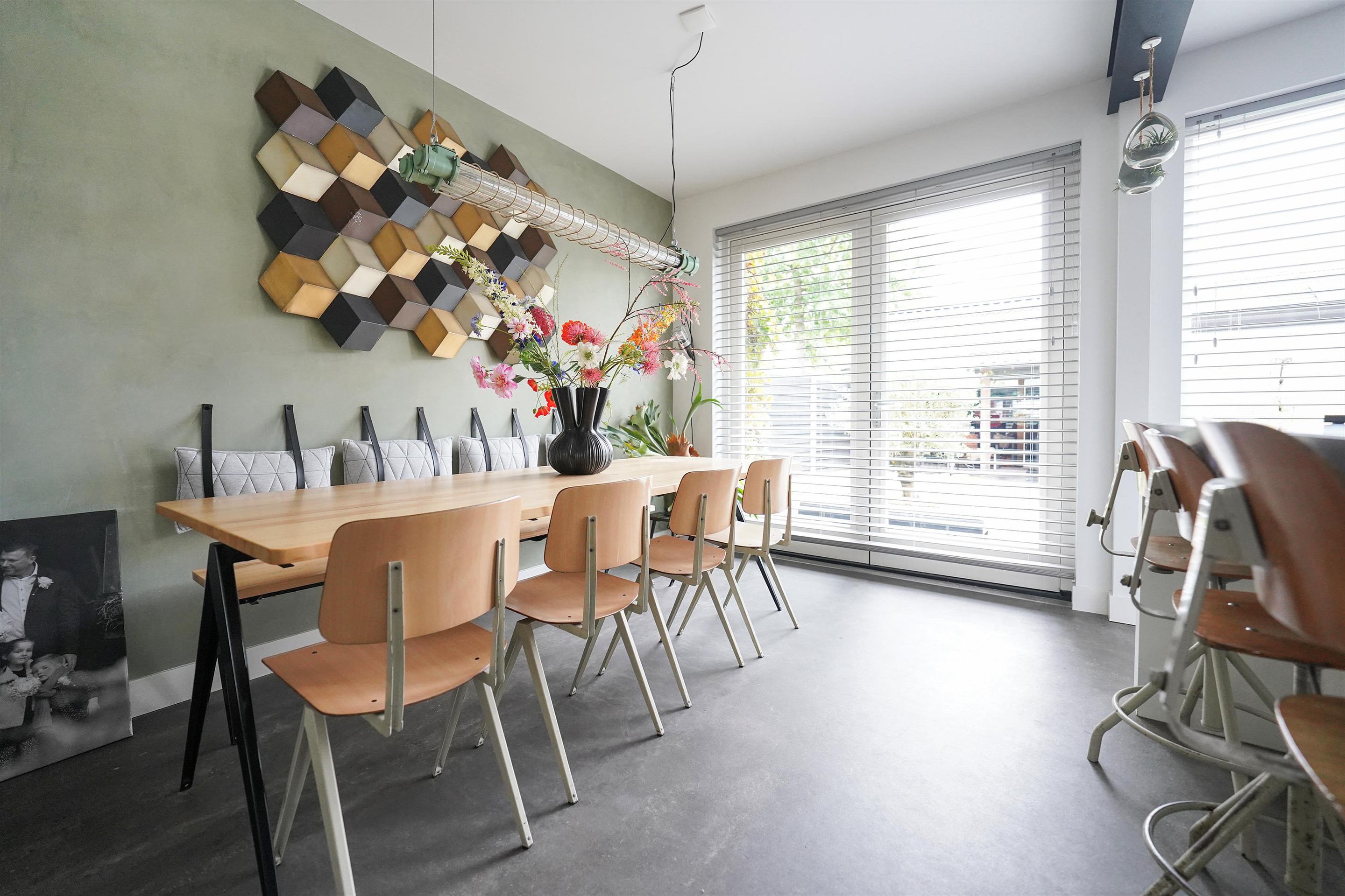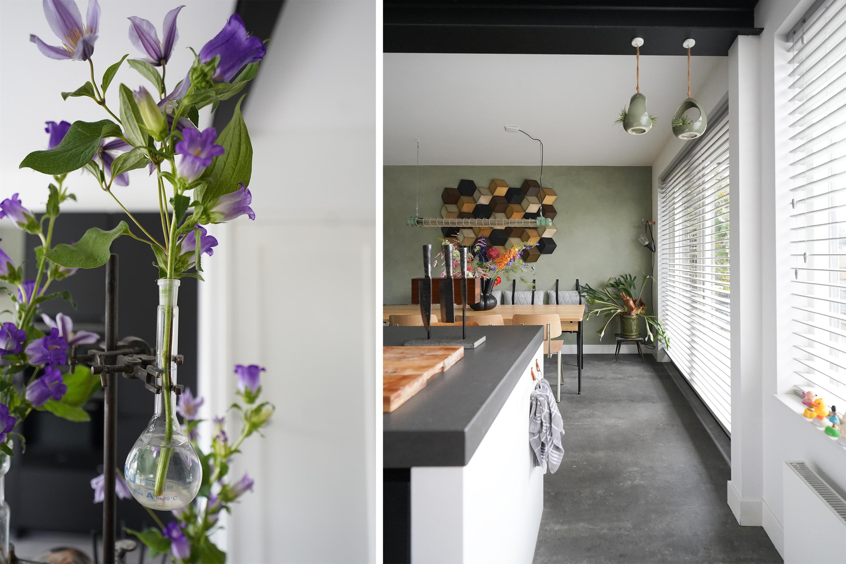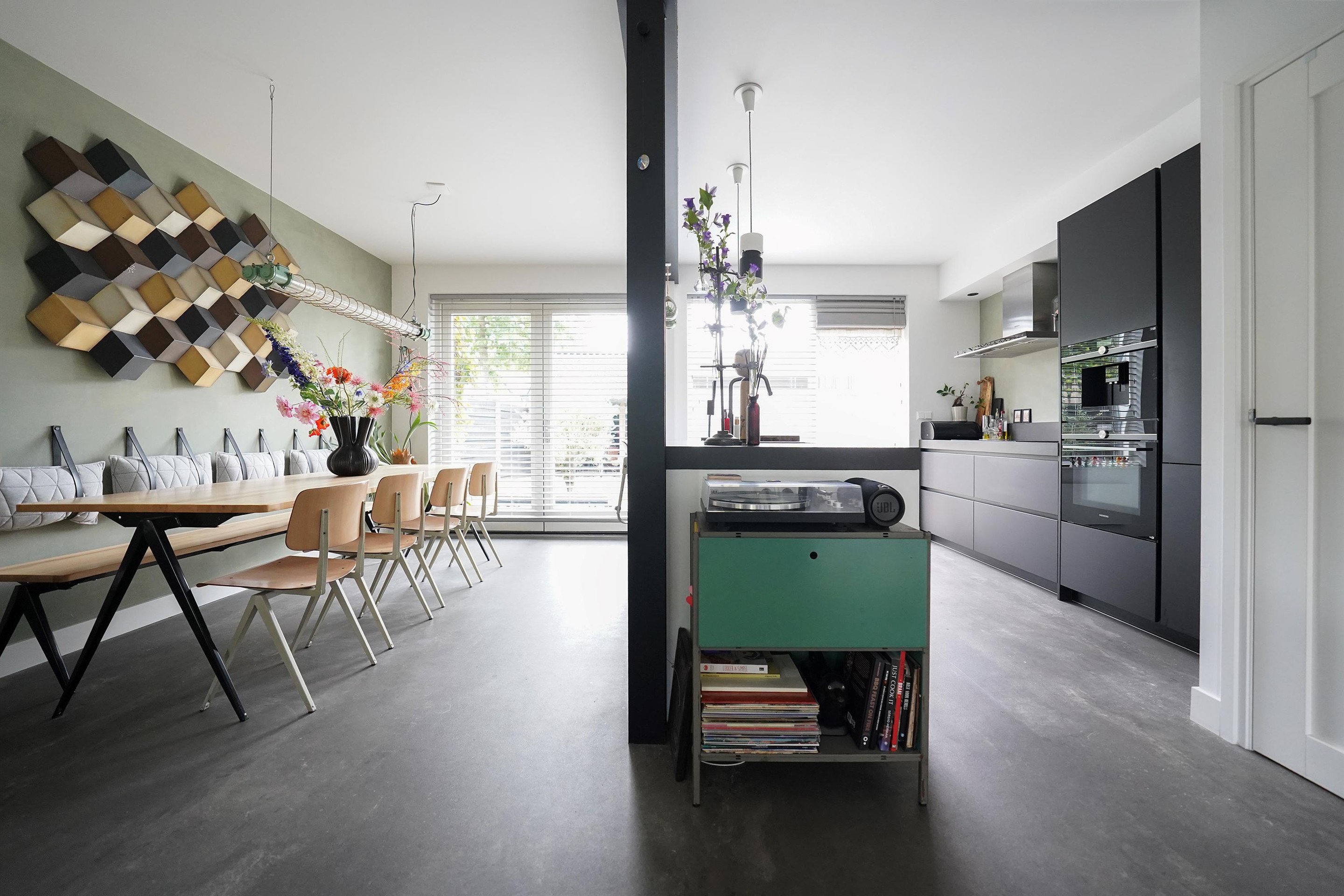 Bij aankomst valt mij meteen de vrije, groene ligging op. Ik kan gemakkelijk parkeren naast de woning en uiteraard heb je ook een eigen parkeergelegenheid in de garage mocht je dat willen. Ik kan de woning gemakkelijk bereiken via de zij-ingang, maar ik loop eerst naar de voordeur aan de voorzijde van de woning. Mij valt meteen de mooie zwarte kozijnen en voordeur op. Het voorraam is ook enigszins verdiept wat de woning een speels karakter geeft. De voortuin is ook ruim en heel verzorgd ingericht. Hier kijk je leuk over de straat! Bij binnenkomst valt mij meteen op dat ik een moderne, frisse woning binnenstap. In de hal is ruimte voor de jassen en schoenen en hier is ook de toegang naar de verzorgde toiletruimte, voorzien van een hangend toilet met fonteintje. Door een mooie zwarte deur met veel glas kom ik in de woonkamer. Een heerlijke lichte ruimte met veel raampartijen en een gezellige inrichting! Het zitgedeelte is aan de voorzijde gesitueerd en is voorzien van een groot zijraam met uitzicht op de mooie boom die aan de zijkant van de woning staat. De woonkamer is voorzien van een open inbouwkast waar de tv ook is geïnstalleerd. Verder is midden in de ruimte een stoere pelletkachel waar je vanuit de keuken en de woonkamer van kan genieten. De keuken is in 2019 ook geheel aangepakt en opengebroken. Zo is er een fijne open ruimte ontstaan! Een leuk detail is dat de stoere stalen balken nog in het zicht zijn gelaten en dat geeft juist karakter aan de ruimte. Bij de eettafel zijn de dubbele tuindeuren naar de achtertuin en deze geven ook weer dat extra fijne daglicht. De keuken zelf is prachtig! Een ruime opstelling met een spoeleiland waar je ook fijn aan kan zitten. Een matzwarte keuken met alle inbouwapparatuur aanwezig. Echt een eyecatcher! Bij de keuken is nog een handige bergkast voor al je provisie. De gehele ruimte is voorzien van vloerverwarming en een mooie pvc-vloer. Naast de bergkast is een deur naar de trapopgang, deze is dus mooi afgesloten en niet zichtbaar vanuit de woonkamer en de keuken.