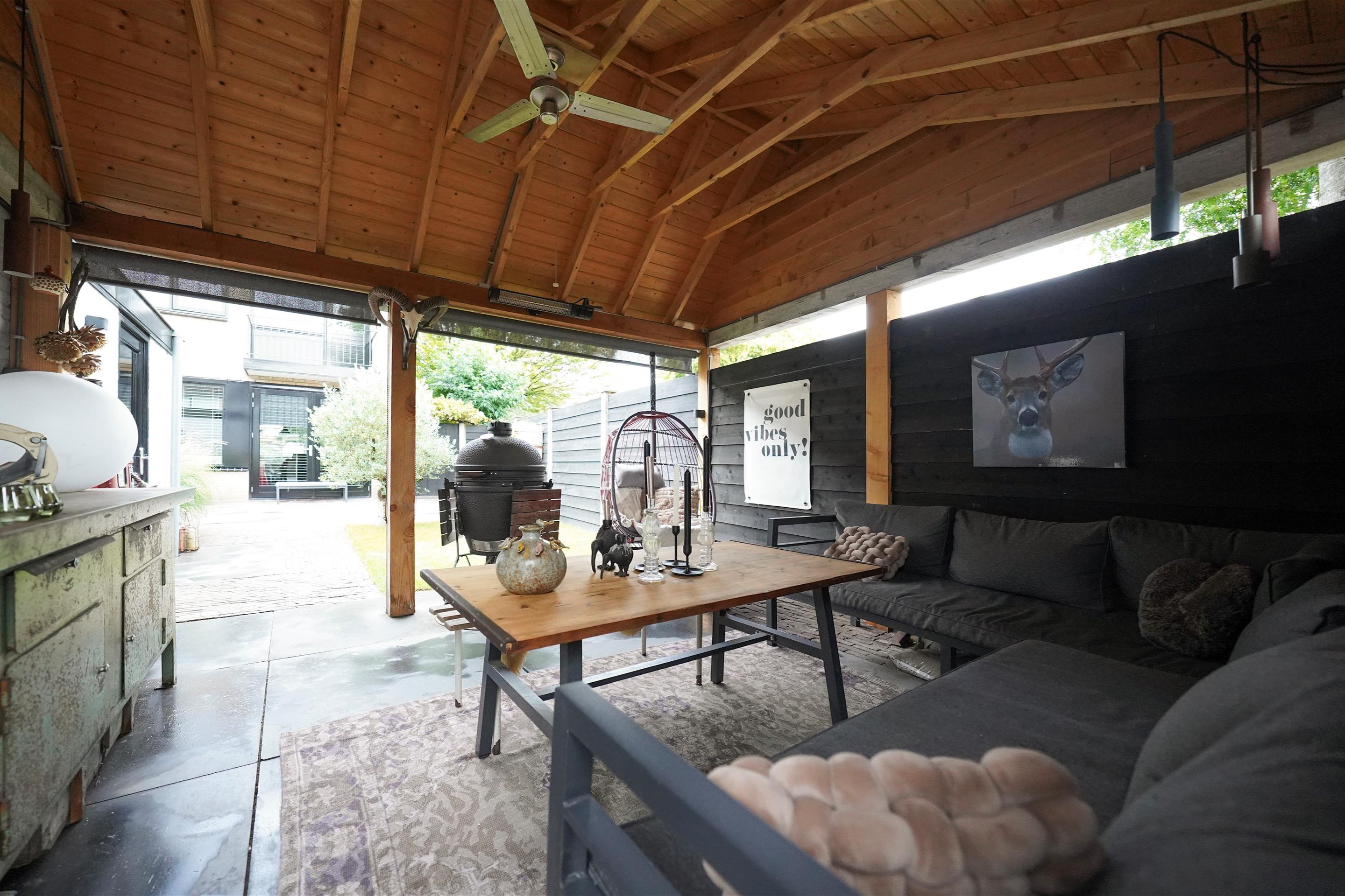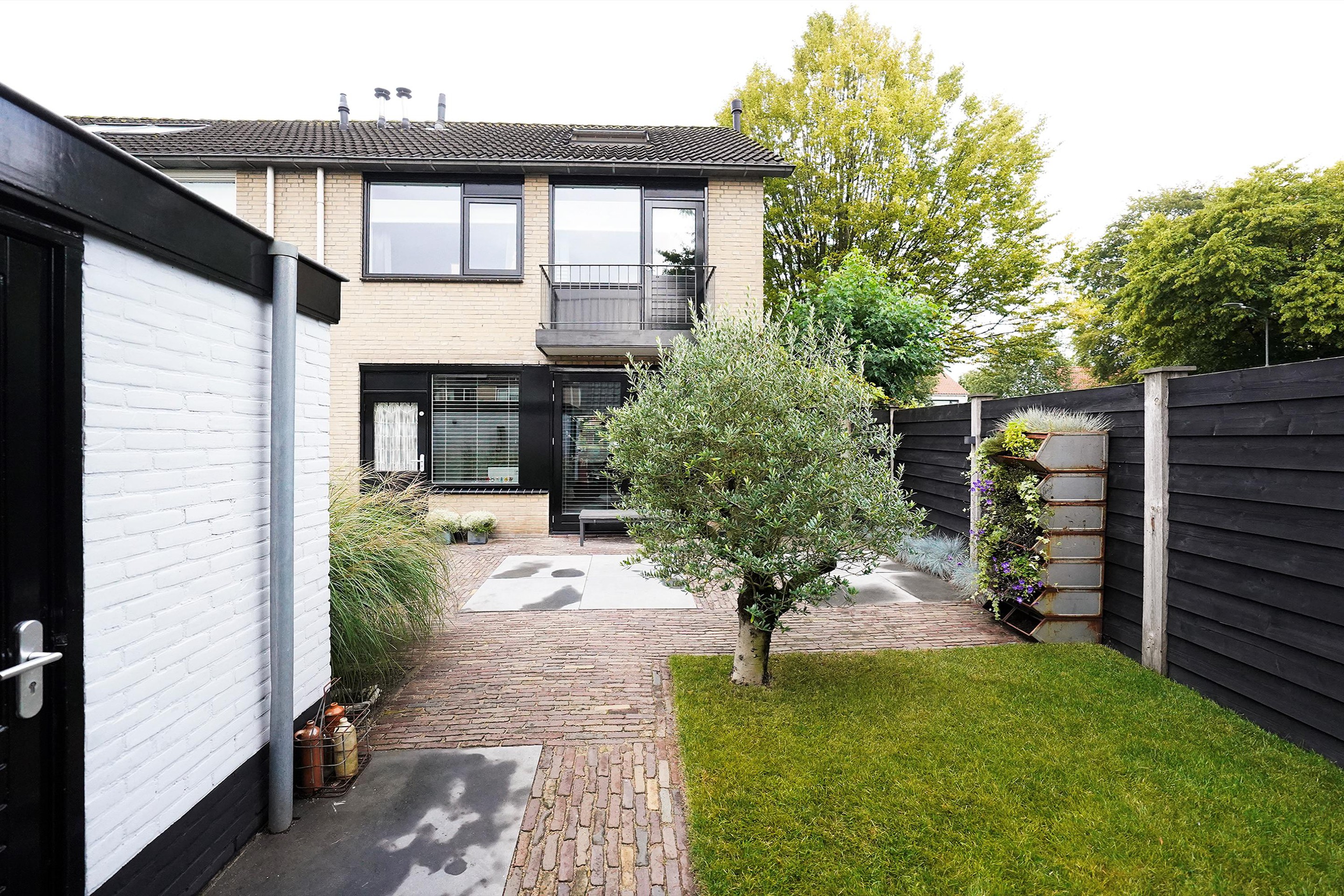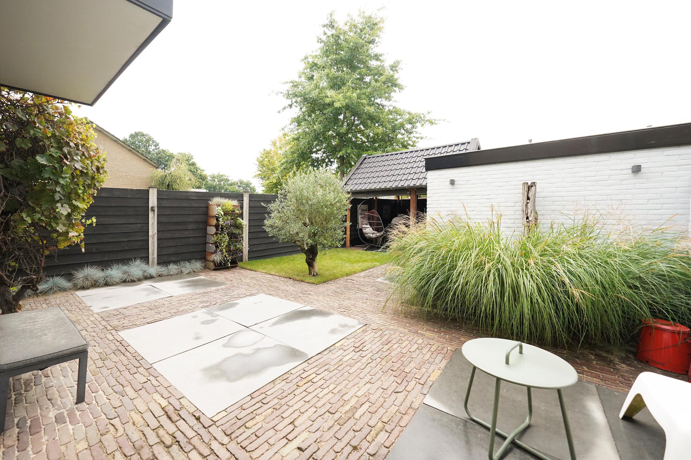Op naar buiten waar ik een gezellige, goed ingerichte tuin in loop. Ook hier hoef je eigenlijk niets meer te doen! De tuin is voorzien van een mooie grasmat, goede schuttingen en fijne bestrating. Het valt me op hoe vrij je hier in de tuin kan zitten. Aan de achterzijde, naast de garage, is een mooie overkapping met kap gerealiseerd. Ook is hier een extra deur naar de achterzijde geplaatst. Een heerlijke plek om te loungen lijkt me zo. Vanuit de tuin is uiteraard ook de garage te bereiken. Als ik naar de achtergevel kijkt, valt me hier ook weer de mooi zwart geschilderde kozijnen mij op. Deze woning is van binnen- en van buiten echt een plaatje en daarbij ook nog eens echt goed ingedeeld.