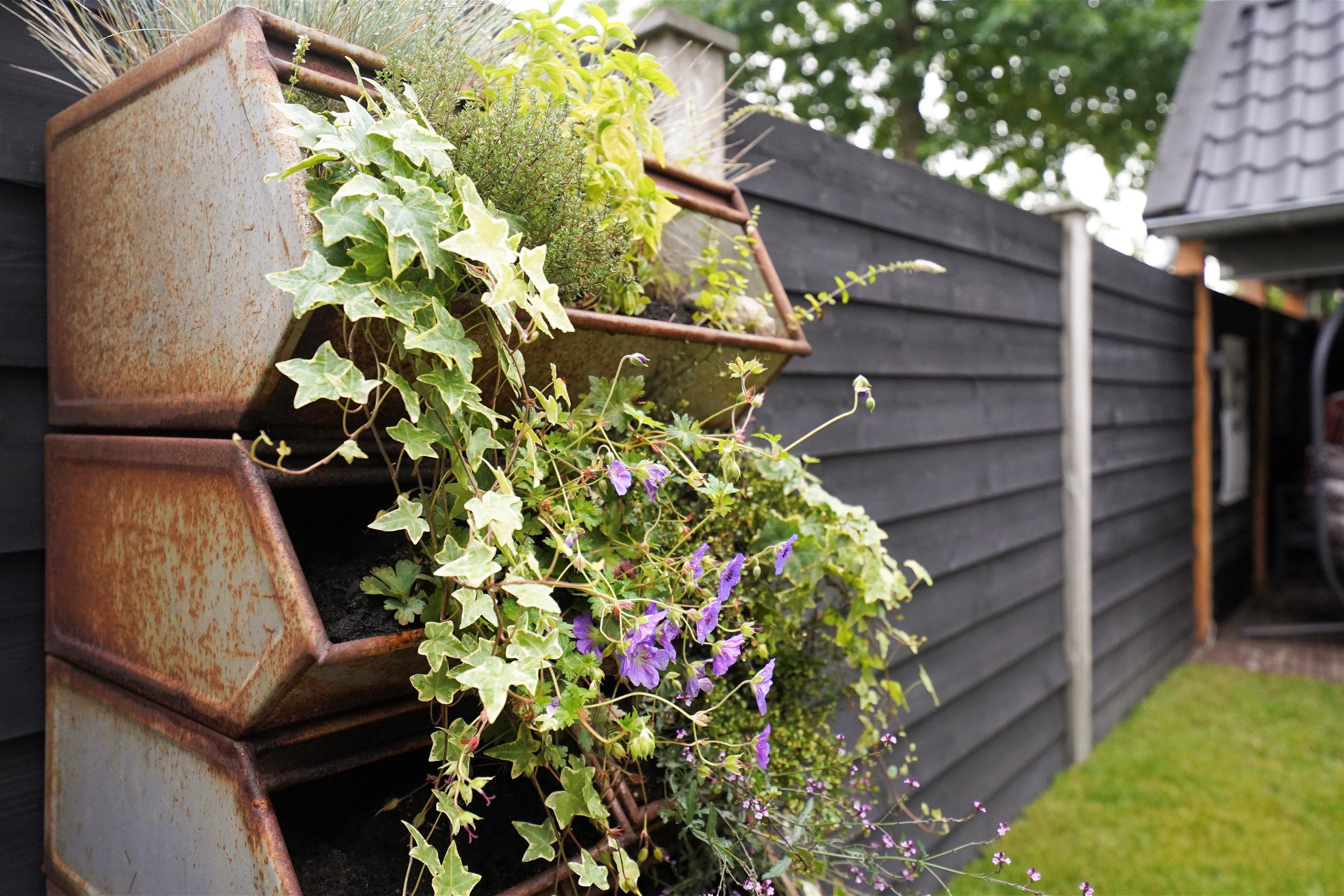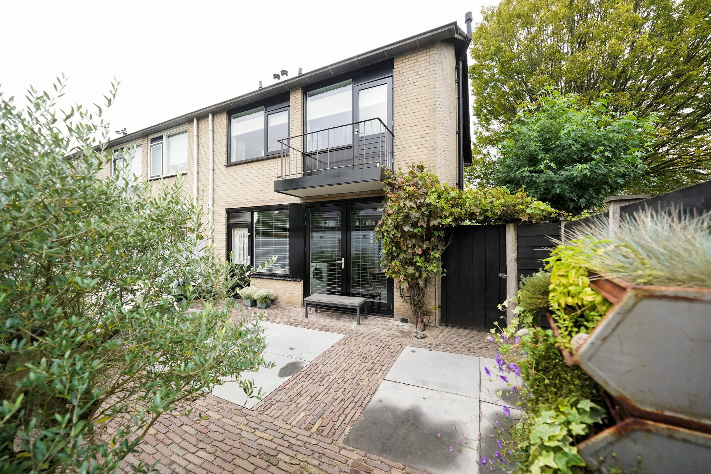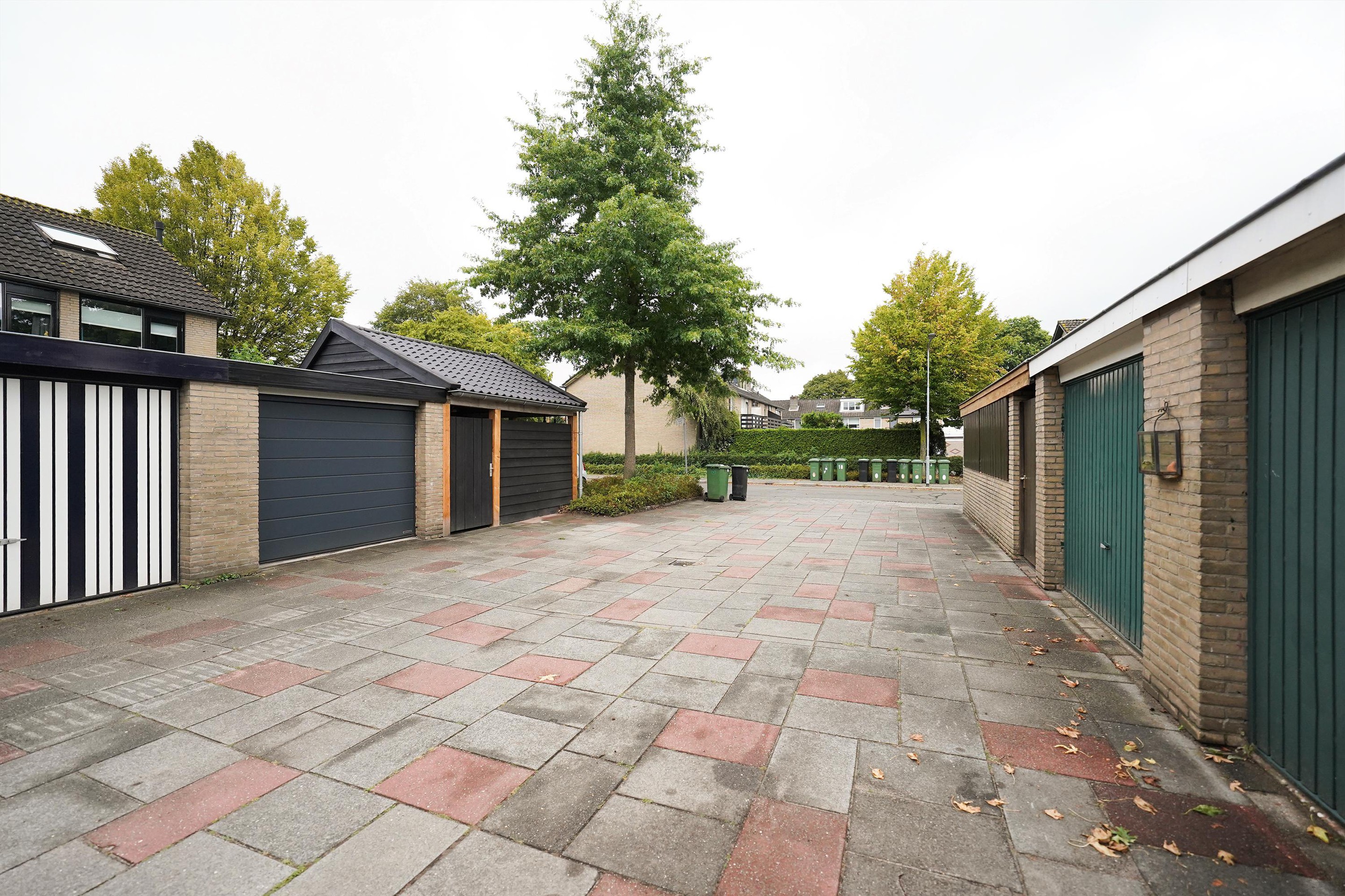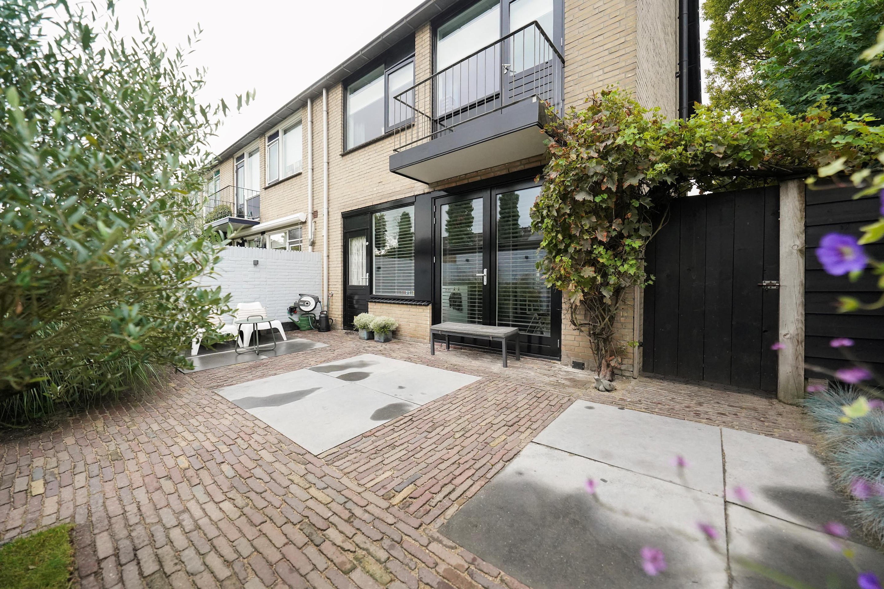 Op naar buiten waar ik een gezellige, goed ingerichte tuin in loop. Ook hier hoef je eigenlijk niets meer te doen! De tuin is voorzien van een mooie grasmat, goede schuttingen en fijne bestrating. Het valt me op hoe vrij je hier in de tuin kan zitten. Aan de achterzijde, naast de garage, is een mooie overkapping met kap gerealiseerd. Ook is hier een extra deur naar de achterzijde geplaatst. Een heerlijke plek om te loungen lijkt me zo. Vanuit de tuin is uiteraard ook de garage te bereiken. Als ik naar de achtergevel kijkt, valt me hier ook weer de mooi zwart geschilderde kozijnen mij op. Deze woning is van binnen- en van buiten echt een plaatje en daarbij ook nog eens echt goed ingedeeld.