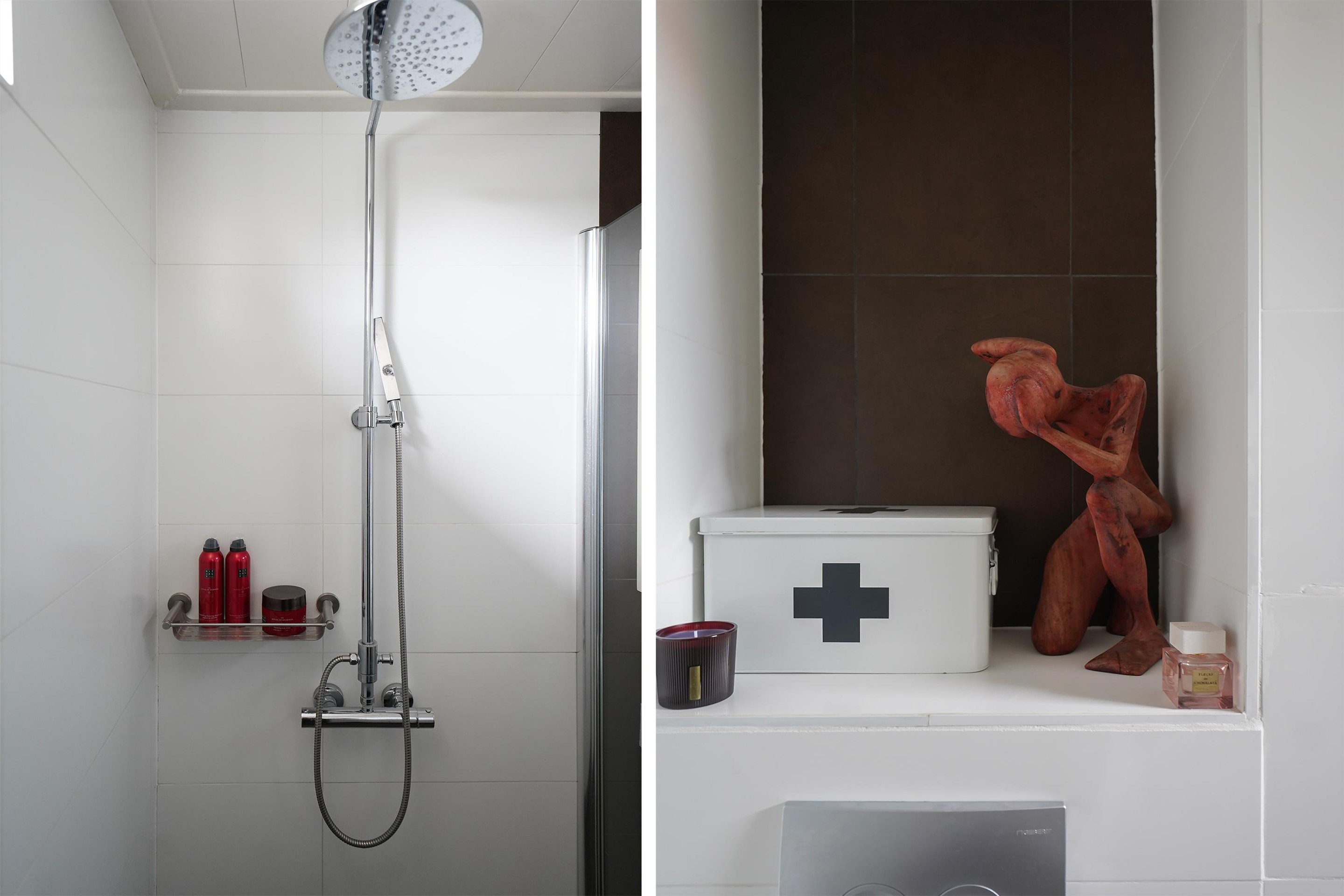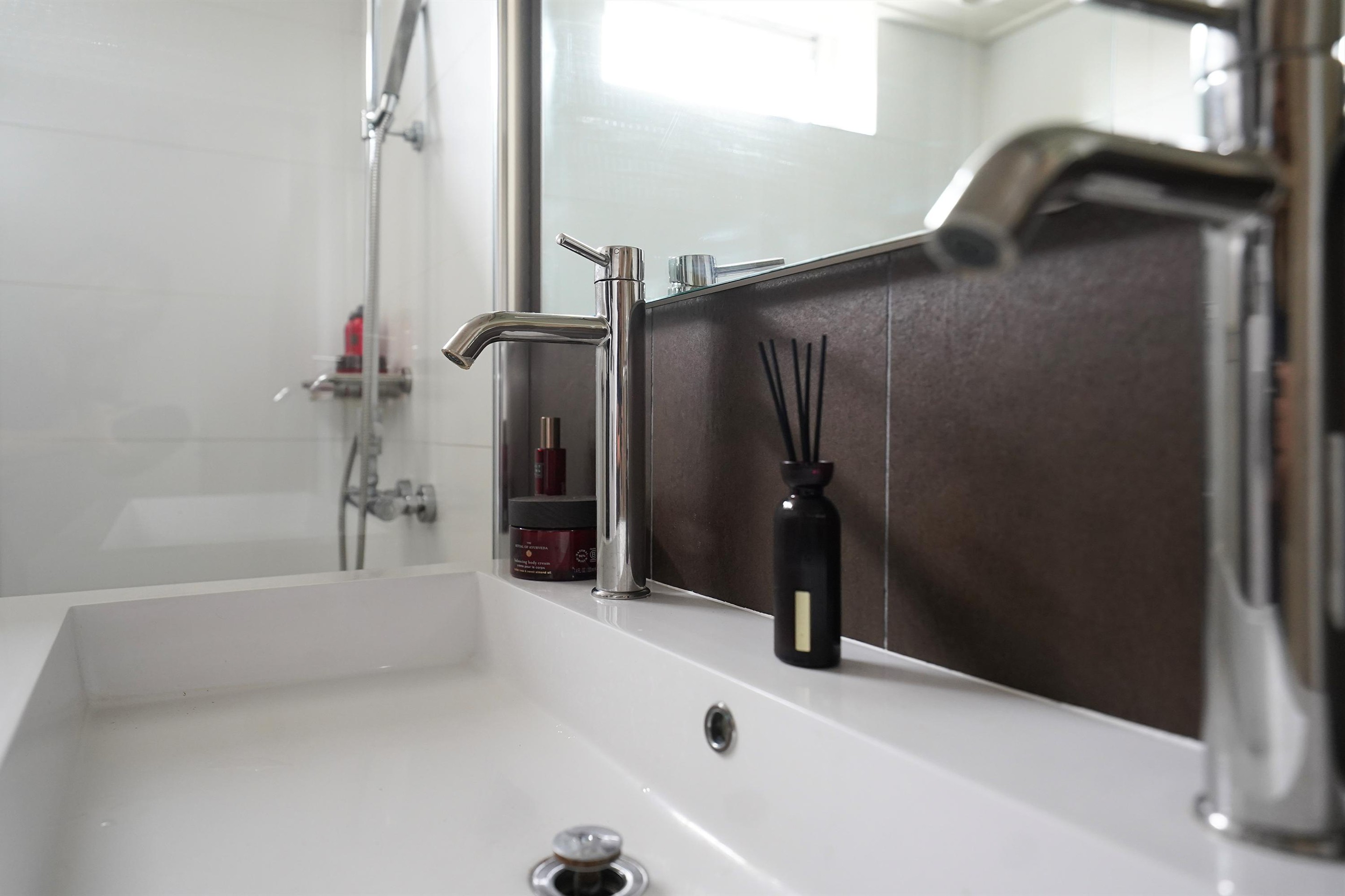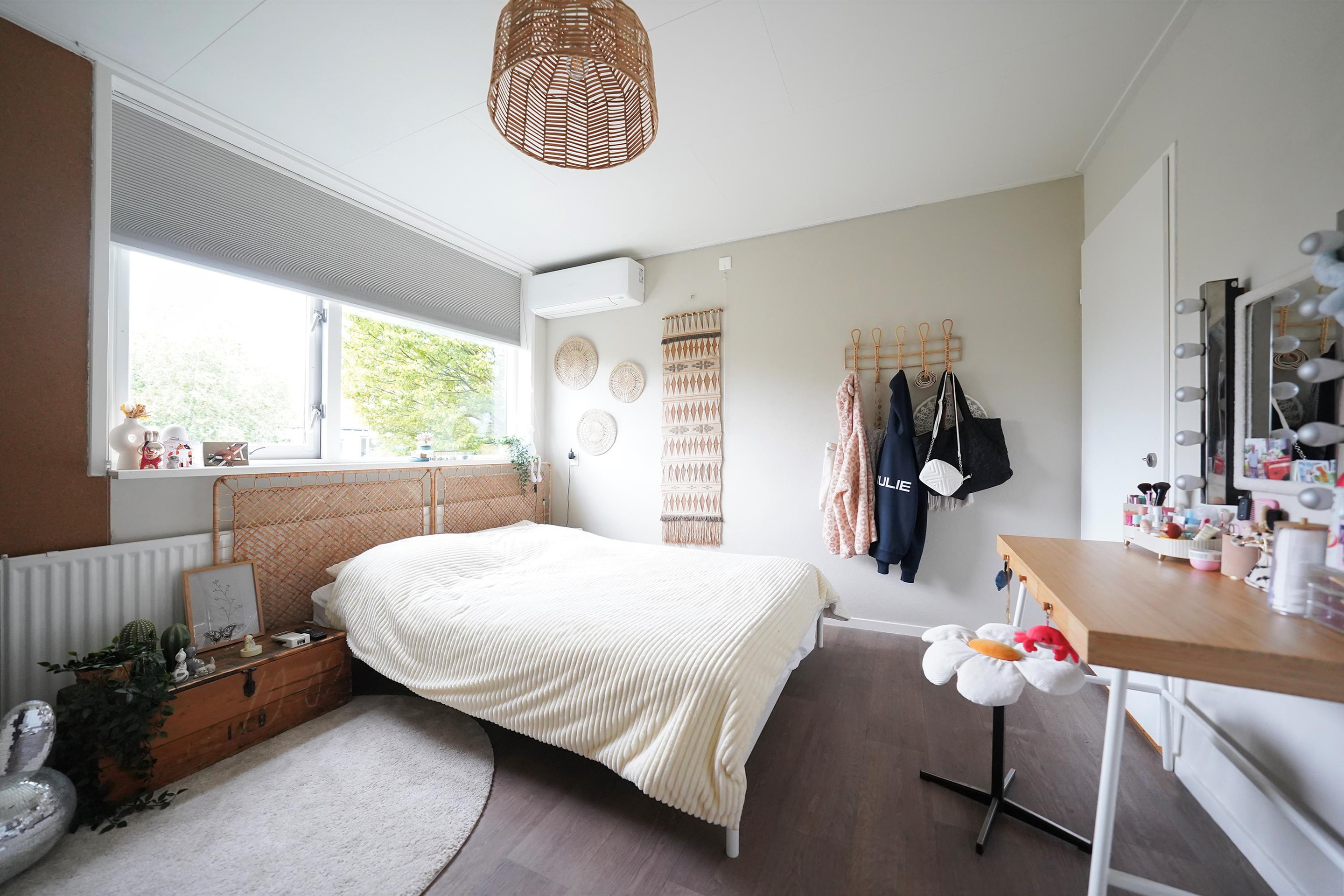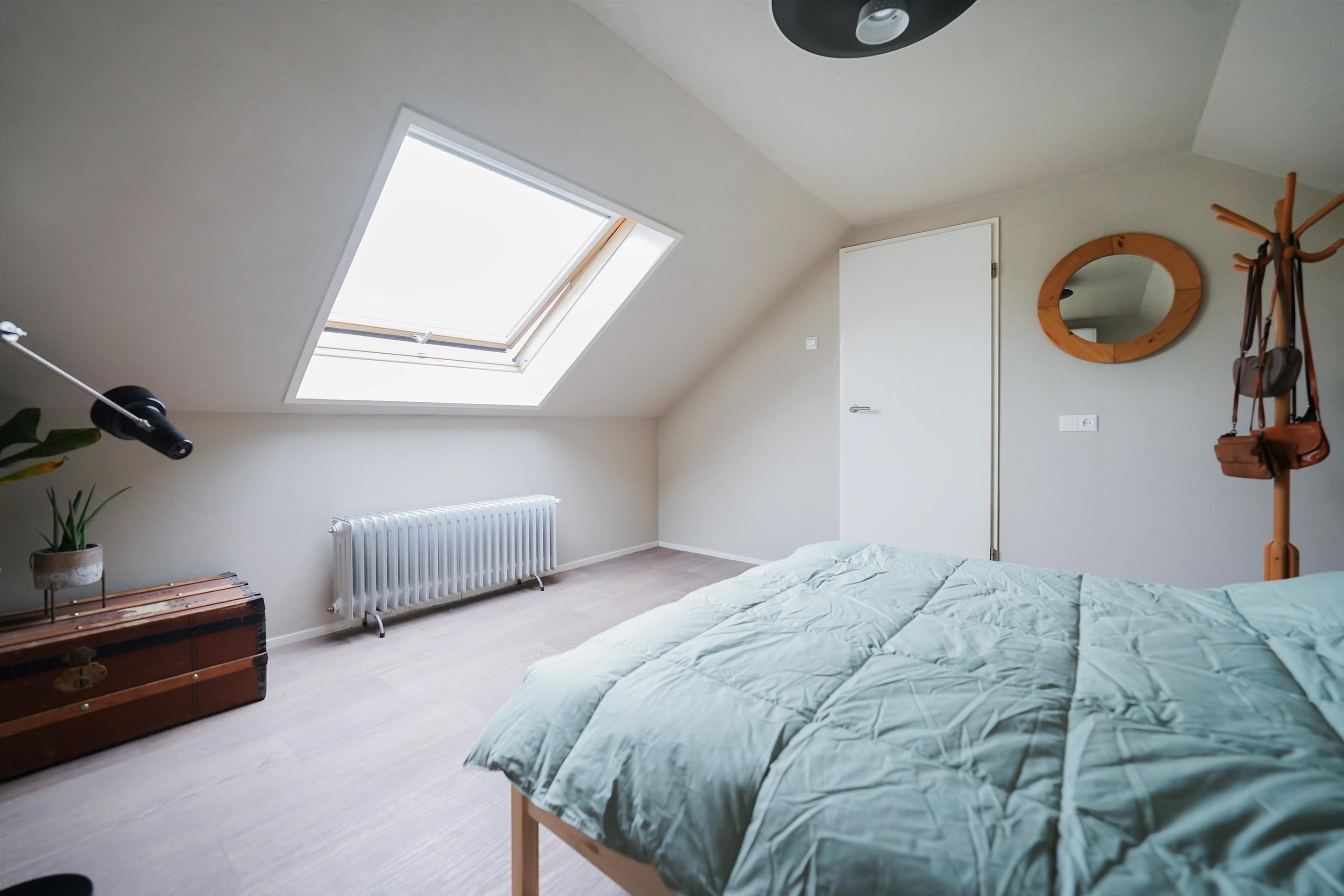 Via een open vaste trap komen we op de eerste verdieping. Via een overloop waar ook de wasmachine en droger gesitueerd zijn komen we in de 4e ruime slaapkamer. Ook hier kan met gemak een tweepersoonsbed staan en deze kamer is voorzien van een groot dakraam. Op zowel de eerste en tweede verdieping zijn airco’s aanwezig. Fijn!