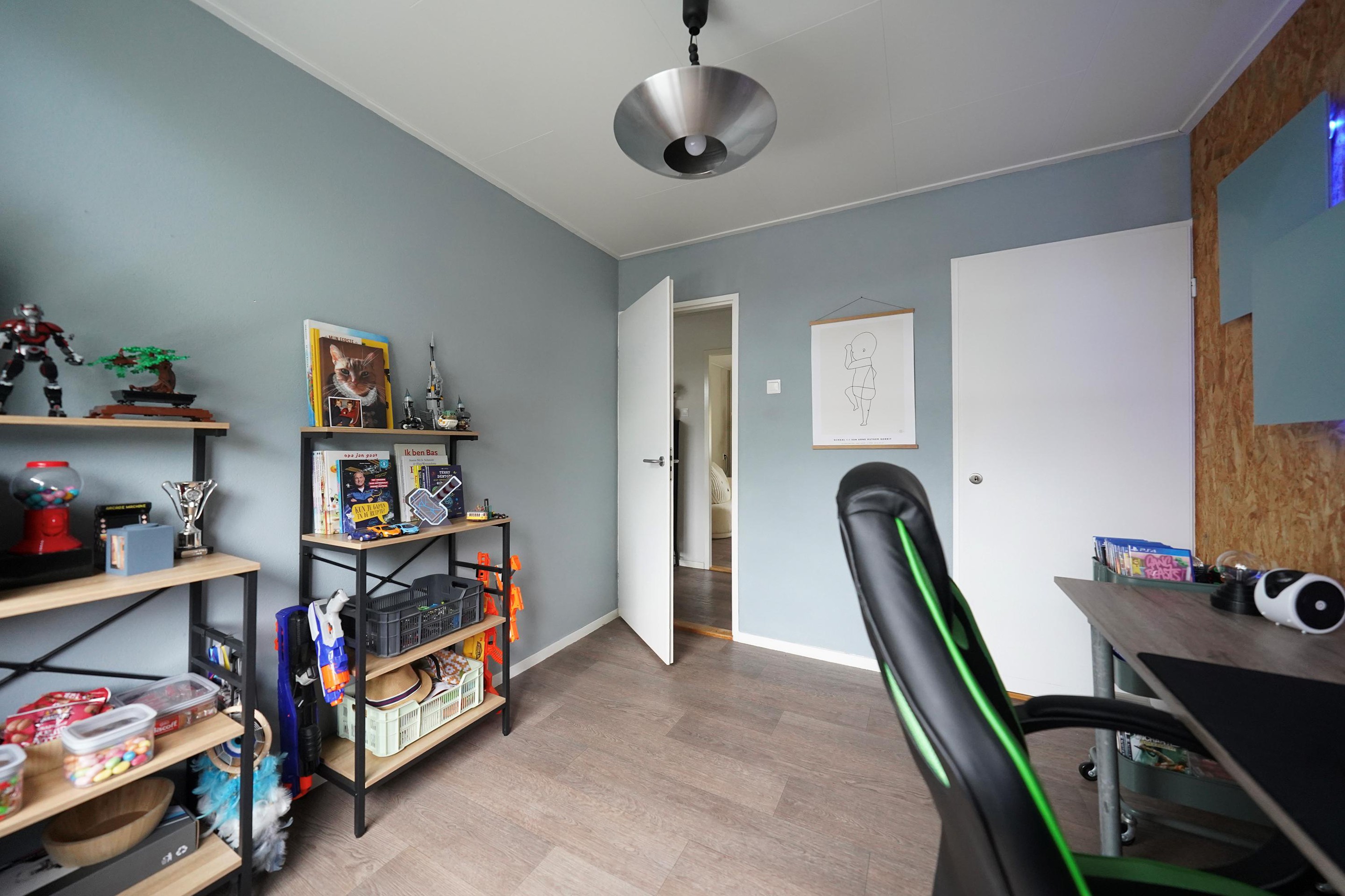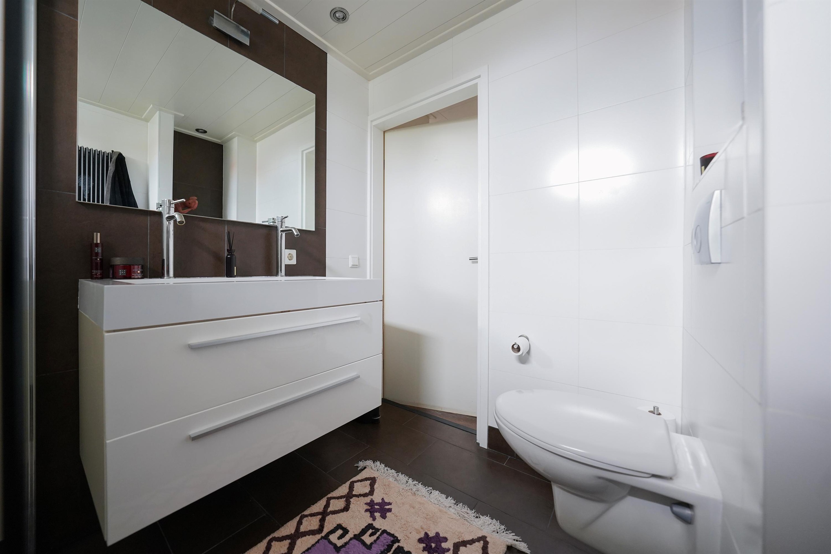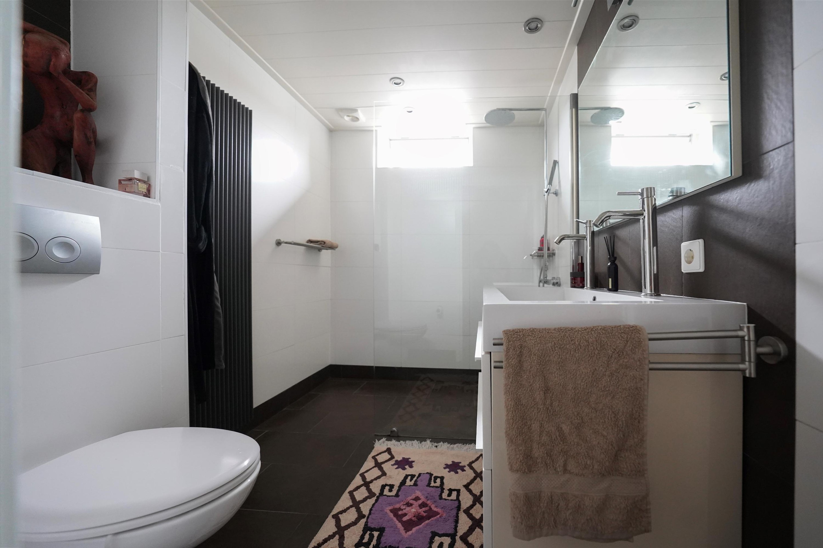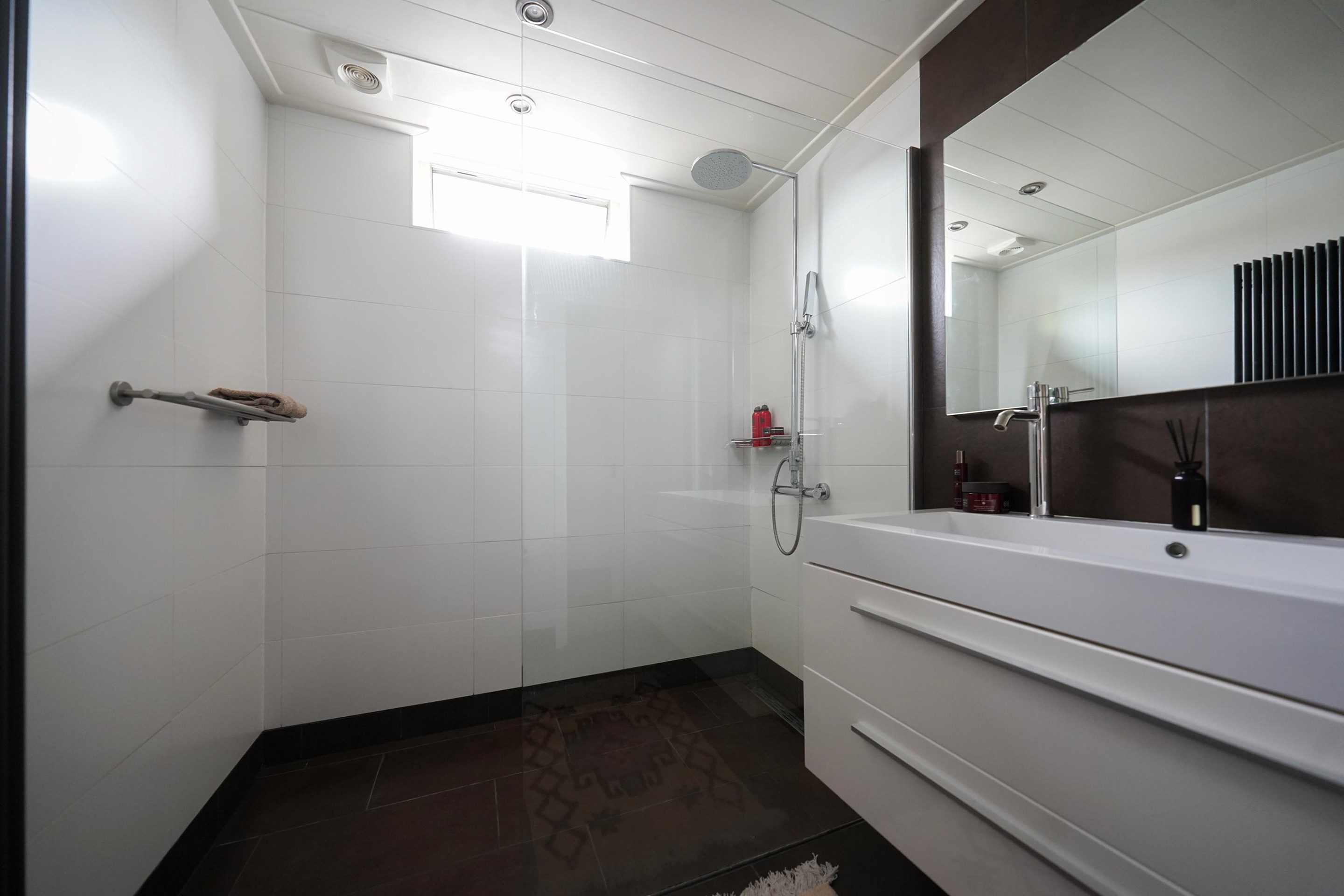 Op de eerste verdieping is een ruime overloop met 3 goede slaapkamers, deels ook voorzien van inbouwkasten. De “game-kamer” is nog extra voorzien van een deur naar het balkon. Er is ook nog een aparte ruime bergkast aanwezig, vanuit de overloop te bereiken. Zoals je wel op de foto kunt zien kan op de 2 grootste kamers gemakkelijk een tweepersoonsbed staan. De badkamer is aan de voorzijde van de woning gelegen en deze is voorzien van een grote inloopdouche met glazen wand. Ook is er een grote wastafelmeubel met 2 kranen, een designradiator en een 2e toilet aanwezig. Een goede ruimte!
