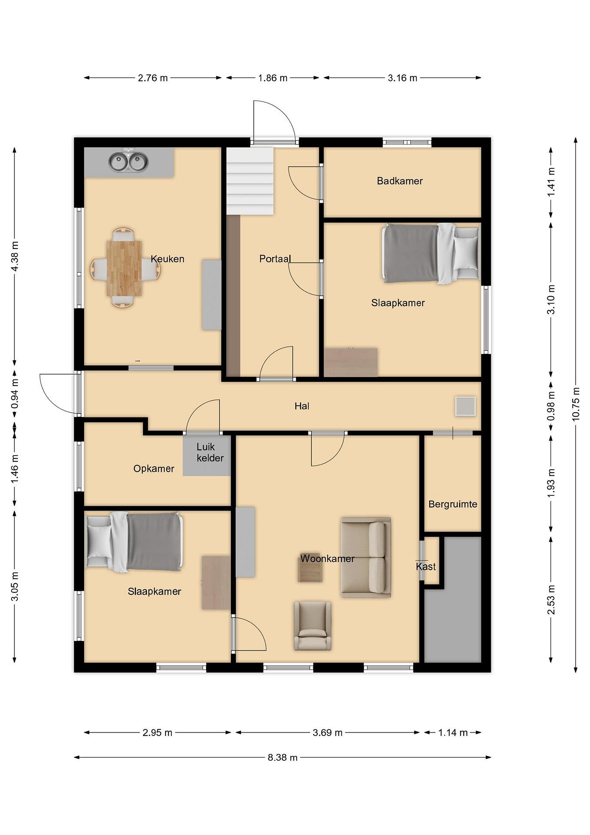 De begane grond beschikt over een woonkamer met schouw, meerdere slaapkamers, een eenvoudige keuken zonder inbouwapparatuur en een eenvoudige badkamer met douche en toilet. Er zijn droge kelders aanwezig en een achteringang. De verdieping bestaat uit een overloop met een deels bevloerde, beperkt beloopbare open ruimte.